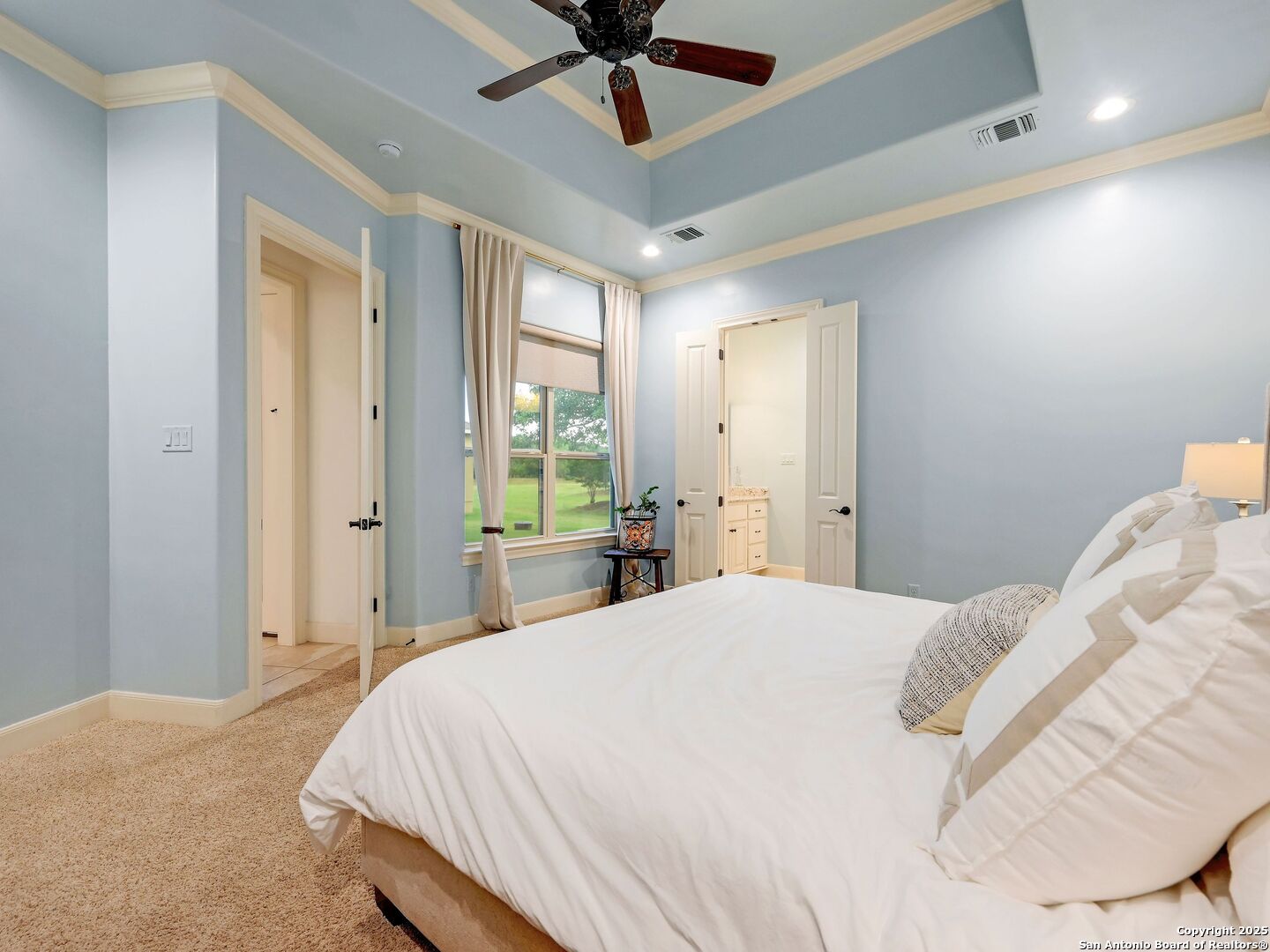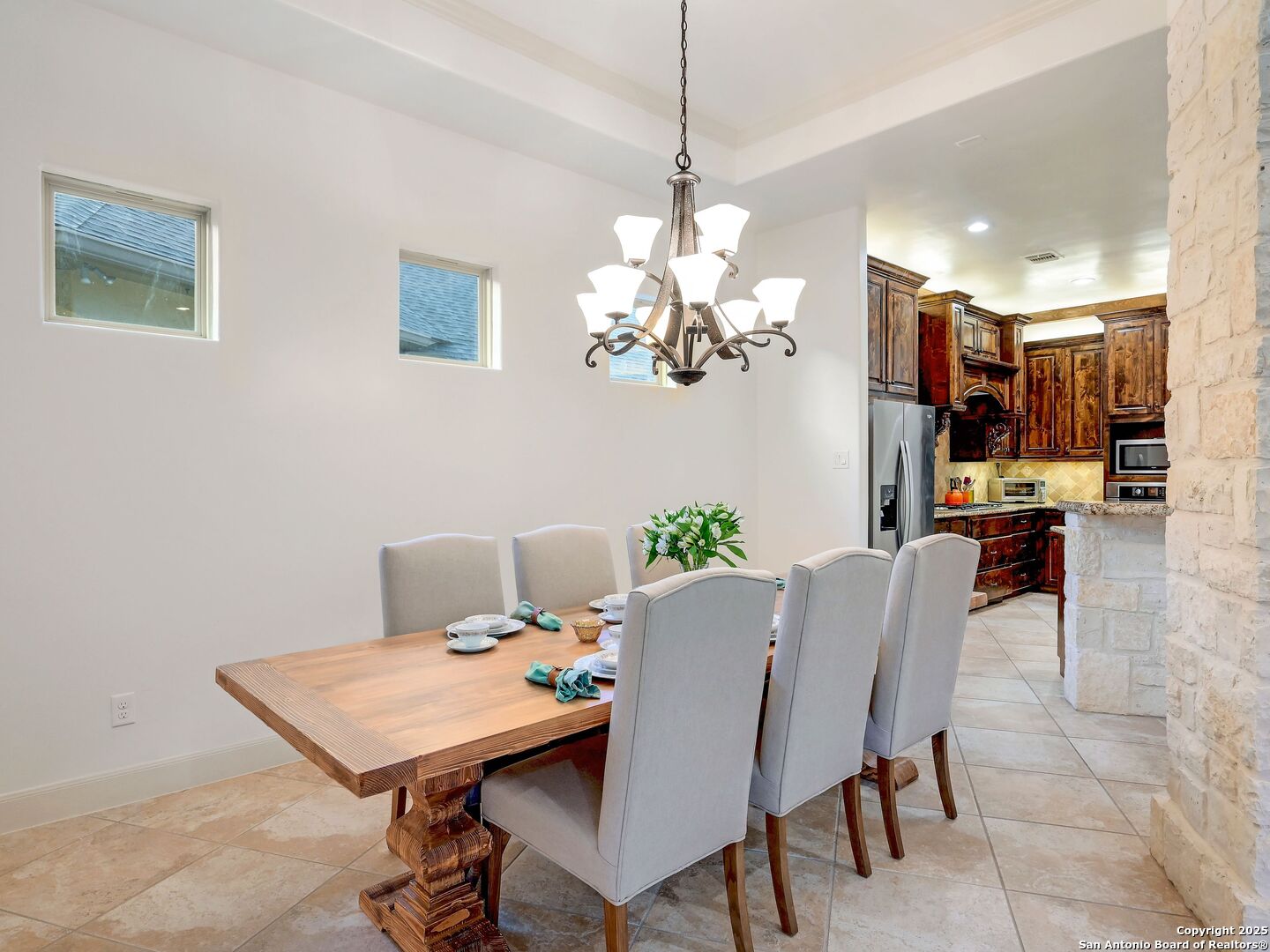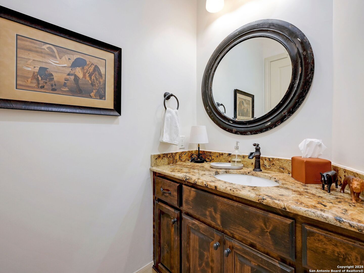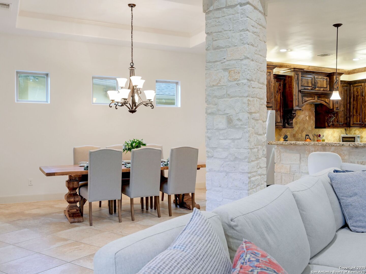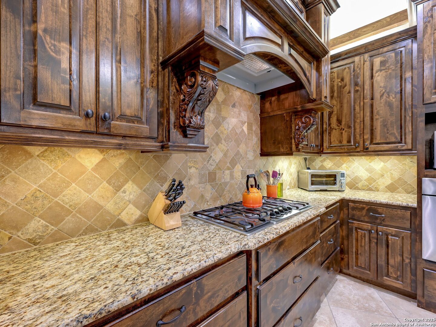 This beautifully updated one-story home offers a thoughtfully designed floor plan that perfectly balances comfort, functionality, and style. Freshly painted and equipped with brand-new solar panels, it's both energy-efficient and move-in ready. Enjoy tranquil greenbelt views from the spacious backyard, where a large covered patio and built-in fire pit provide the perfect space for relaxing or entertaining under the open sky. Inside, the open-concept kitchen and living area are filled with natural light from expansive picture windows, creating a bright and inviting atmosphere. The kitchen features custom cabinetry, elegant granite countertops, a statement vent hood, and an eat-in bar that's ideal for casual meals or gathering with guests. Additional highlights include a separate office, an eat-in dining area, and three generously sized bedrooms, offering flexibility for both work and leisure. Set in a well-maintained neighborhood known for its lush landscaping and beautiful homes, the property offers a sense of privacy and peaceful living, often accompanied by deer sightings just beyond your backyard. Perfectly situated just off Fair Oaks Ranch Blvd near the golf course, this home is ideally located between the vibrant city of San Antonio and the charm of Boerne, and is part of the highly rated Boerne ISD. Schedule your showing today!