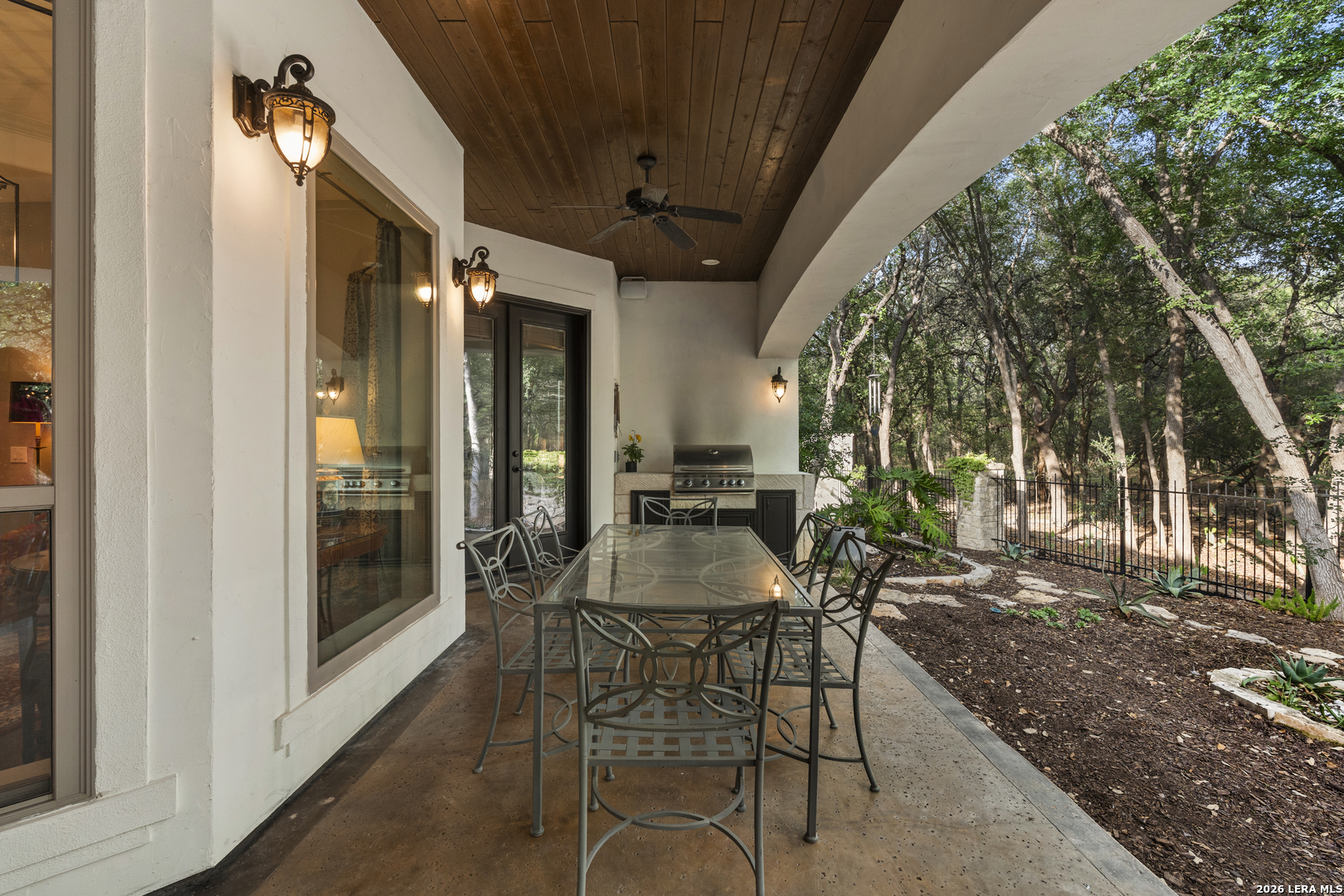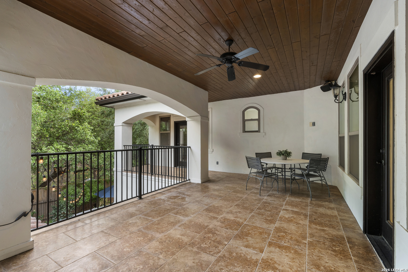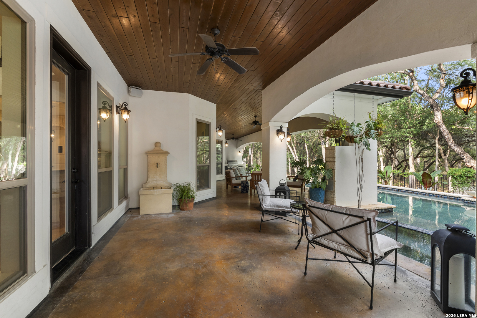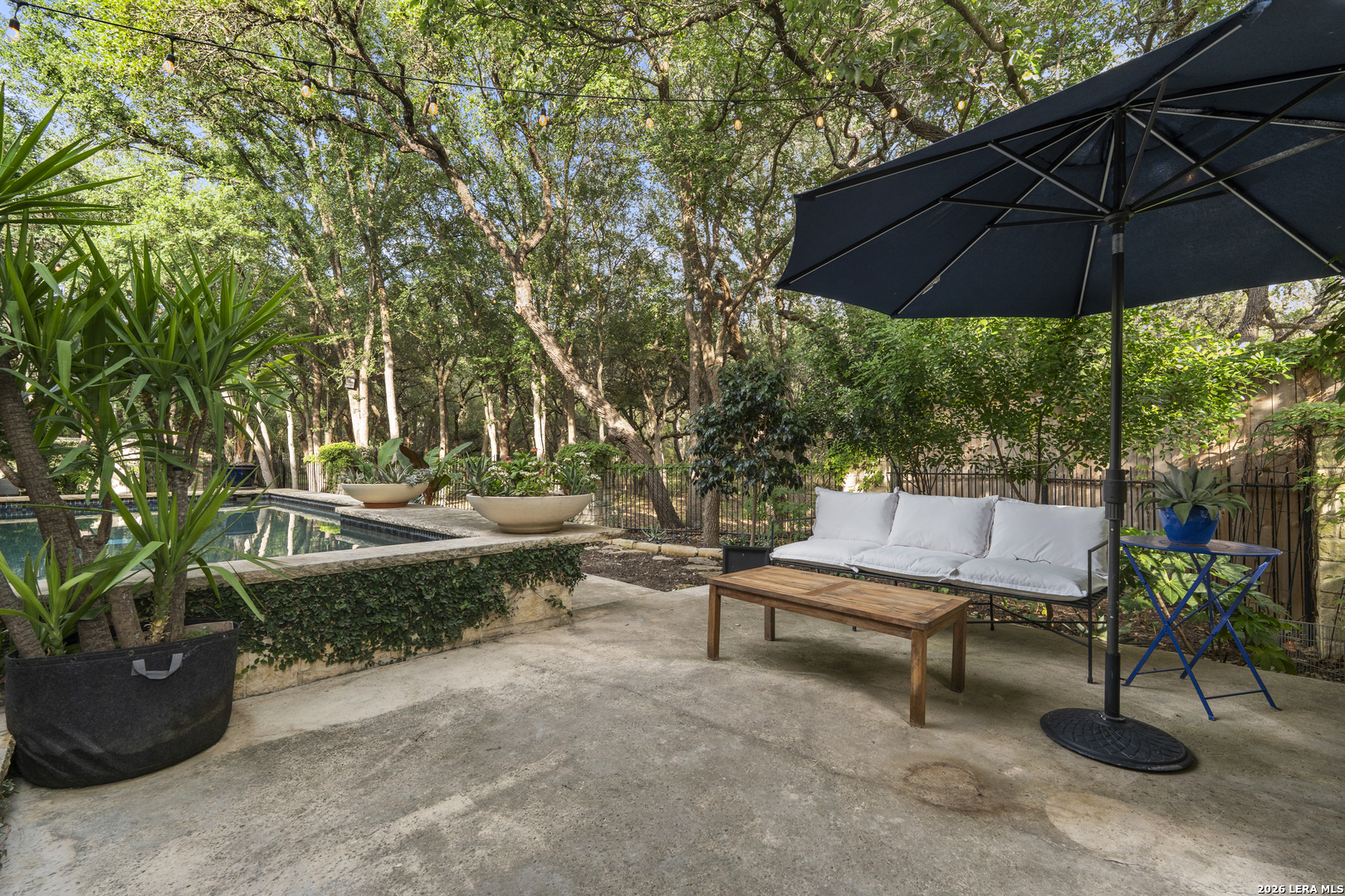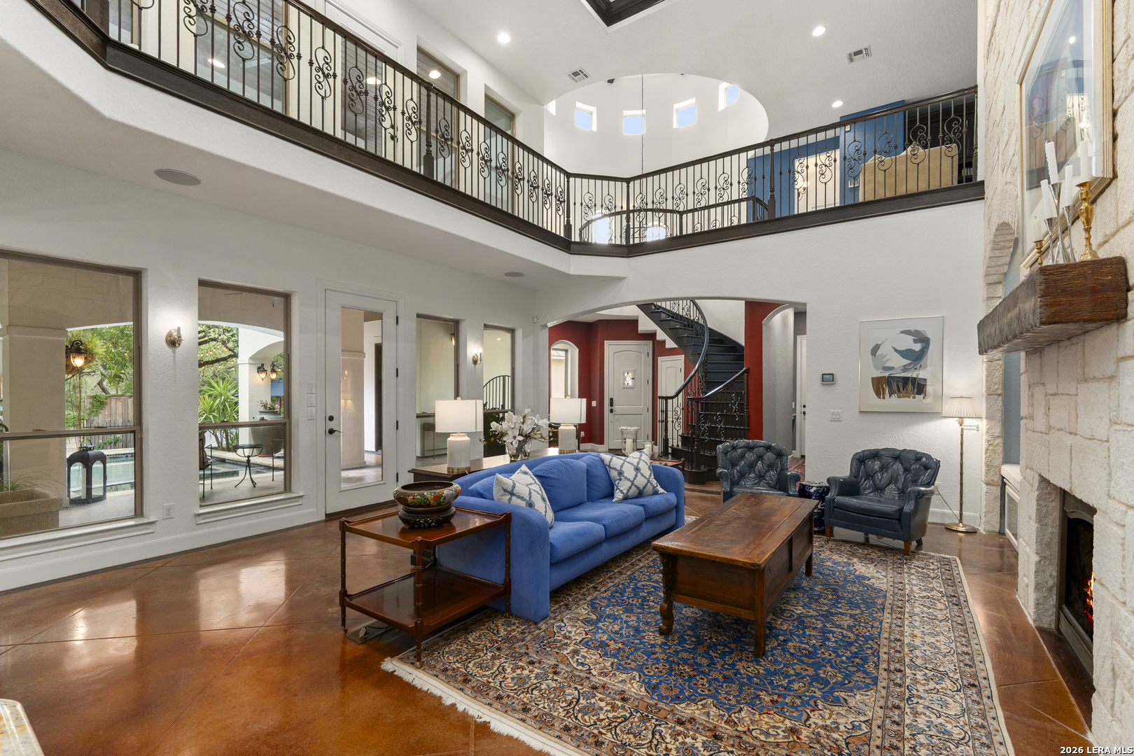 Set behind a long private drive on a rare .48 acre greenbelt lot, this Italian inspired villa offers a level of privacy, scale, and resort style living seldom found in San Antonio. From the moment you arrive, the home makes a lasting impression. Exceptional curb appeal is framed by over $250,000 in thoughtfully designed, drought tolerant, cold hardy landscaping that blends beautifully with the natural surroundings. Designed for both everyday living and exceptional entertaining, the outdoor spaces are a true highlight. The recently resurfaced heated pool and spa are perfectly positioned to overlook the lush greenbelt, while multiple covered patios create seamless indoor/outdoor living. A casita offers flexibility for guests or a private office. Inside, the home combines warmth and scale with a highly functional layout. The kitchen is well appointed with a builtin refrigerator, gas cooktop, and double ovens. The primary suite features a sitting area, direct patio access to the pool, and a spacious walk in closet. Upstairs, a secondary primary suite offers its own private laundry-perfect for multi-generational living or extended guests. New carpet throughout the upper level adds a move in ready touch. Behind the scenes, the home is equipped with a suite of high performance features designed for comfort and efficiency, including solar panels, spray foam insulation and radiant barrier, delivering a quieter, more comfortable living environment with the added benefit of long term energy savings. Modern convenience meets timeless design with whole home automation controlling lighting, climate, and sound. Tucked within a small, gated enclave yet just minutes from 1604, I10 and 410, close to the medical center area, and premier shopping and dining, this is a property that offers both privacy and accessibility, an increasingly rare combination. Homes of this caliber, on lots of this size and setting, rarely come to market.