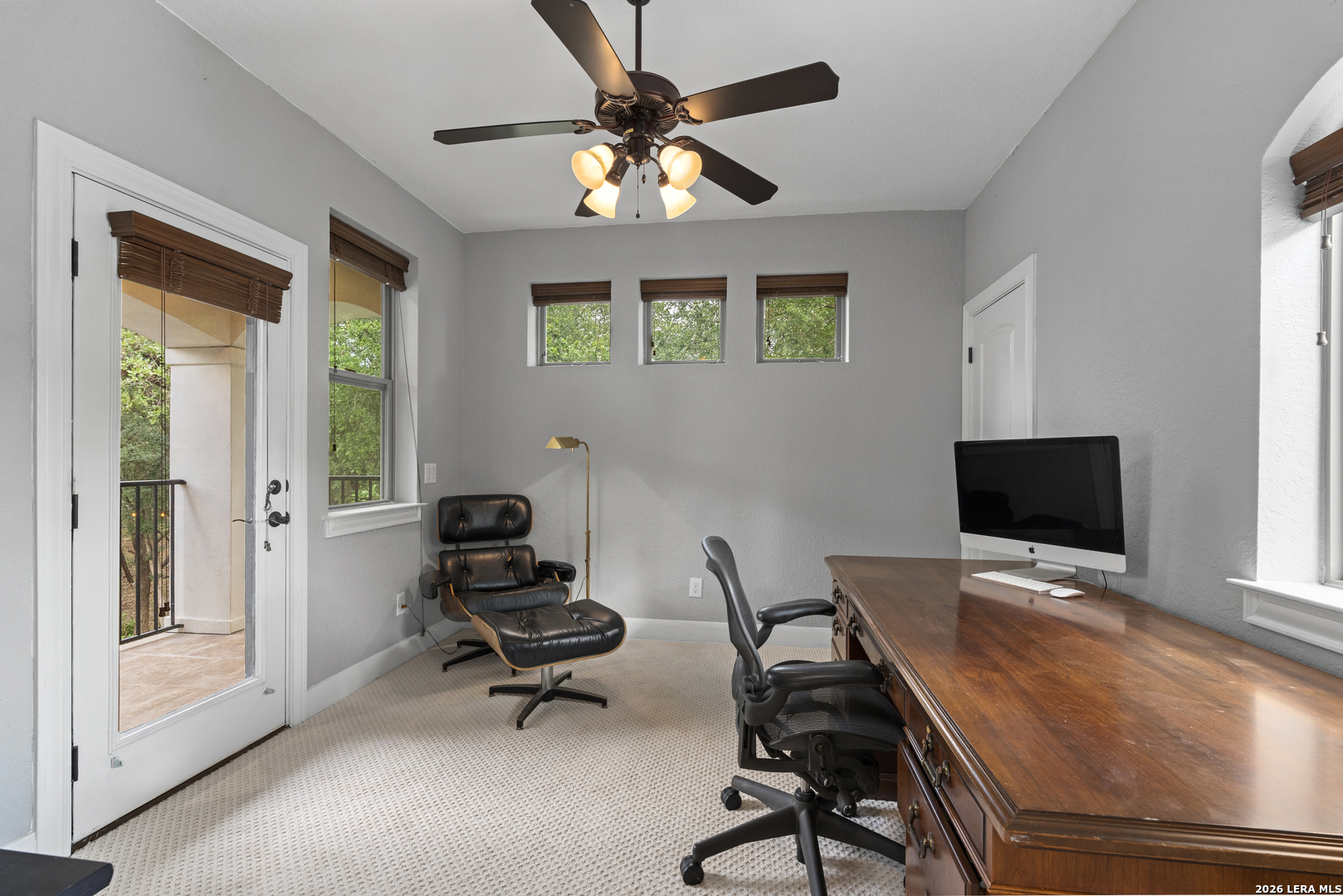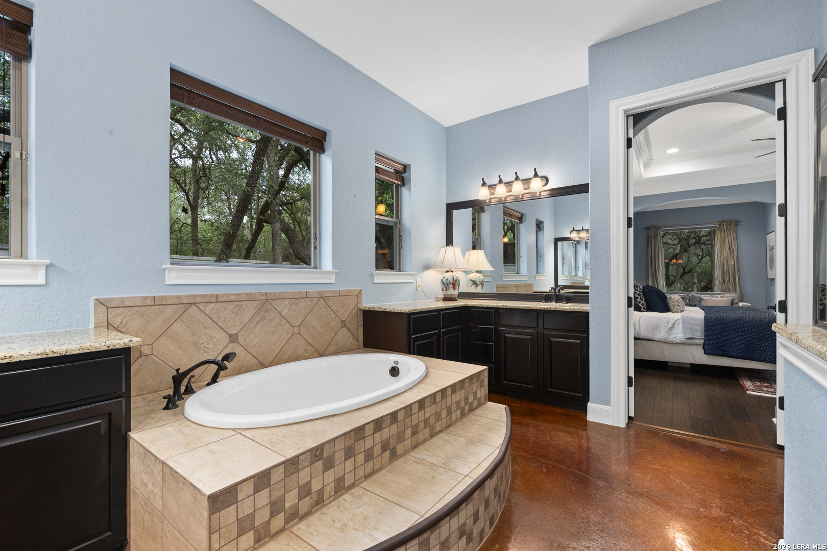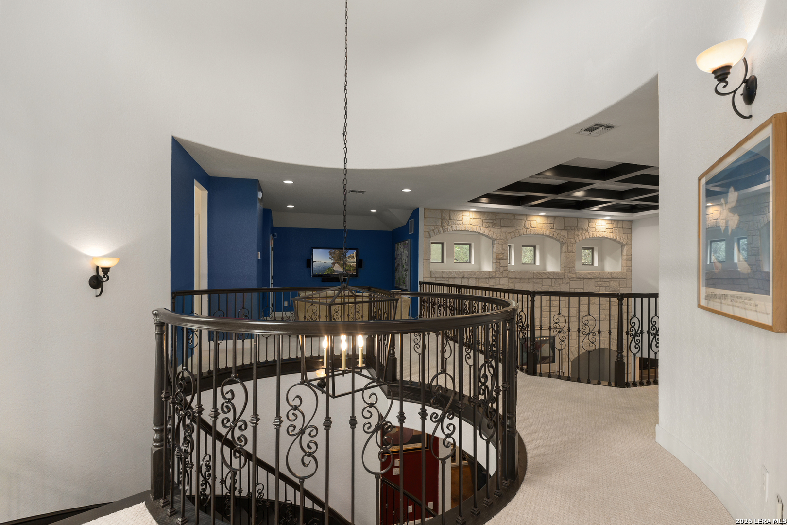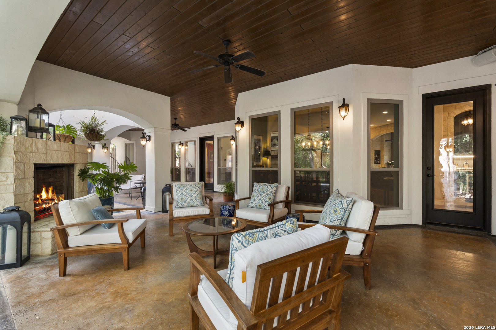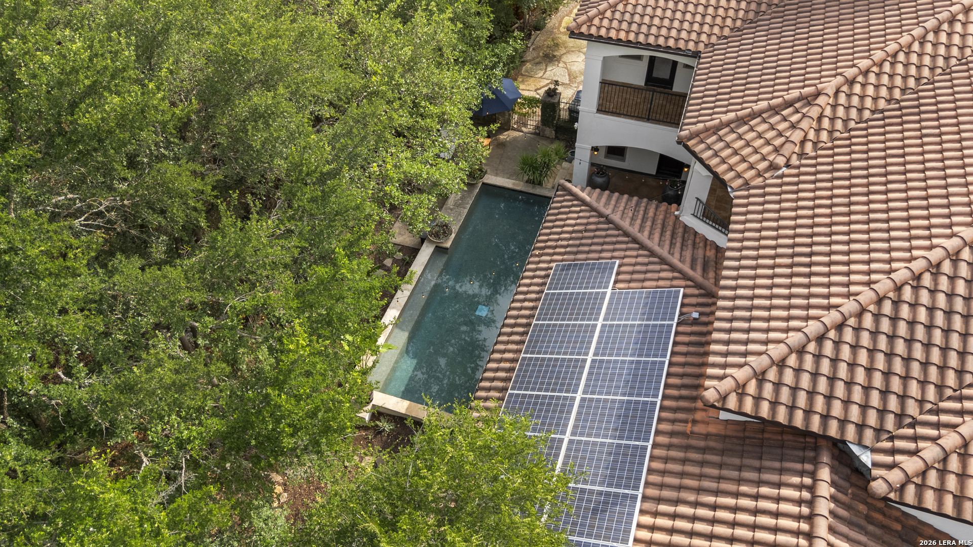 Set behind a long private drive on a rare .48 acre greenbelt lot, this Italian inspired villa offers a level of privacy, scale, and resort style living seldom found in San Antonio. From the moment you arrive, the home makes a lasting impression. Exceptional curb appeal is framed by over $250,000 in thoughtfully designed, drought tolerant, cold hardy landscaping that blends beautifully with the natural surroundings. Designed for both everyday living and exceptional entertaining, the outdoor spaces are a true highlight. The recently resurfaced heated pool and spa are perfectly positioned to overlook the lush greenbelt, while multiple covered patios create seamless indoor/outdoor living. A casita offers flexibility for guests or a private office. Inside, the home combines warmth and scale with a highly functional layout. The kitchen is well appointed with a builtin refrigerator, gas cooktop, and double ovens. The primary suite features a sitting area, direct patio access to the pool, and a spacious walk in closet. Upstairs, a secondary primary suite offers its own private laundry-perfect for multi-generational living or extended guests. New carpet throughout the upper level adds a move in ready touch. Behind the scenes, the home is equipped with a suite of high performance features designed for comfort and efficiency, including solar panels, spray foam insulation and radiant barrier, delivering a quieter, more comfortable living environment with the added benefit of long term energy savings. Modern convenience meets timeless design with whole home automation controlling lighting, climate, and sound. Tucked within a small, gated enclave yet just minutes from 1604, I10 and 410, close to the medical center area, and premier shopping and dining, this is a property that offers both privacy and accessibility, an increasingly rare combination. Homes of this caliber, on lots of this size and setting, rarely come to market.