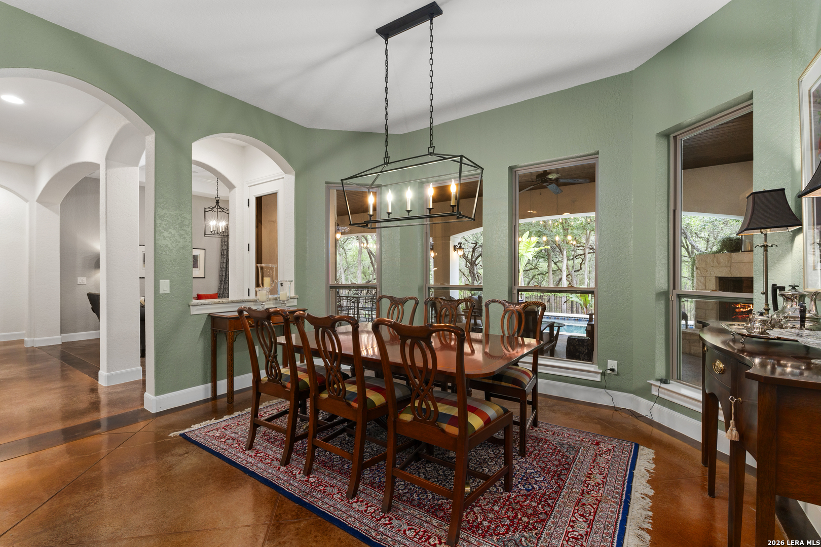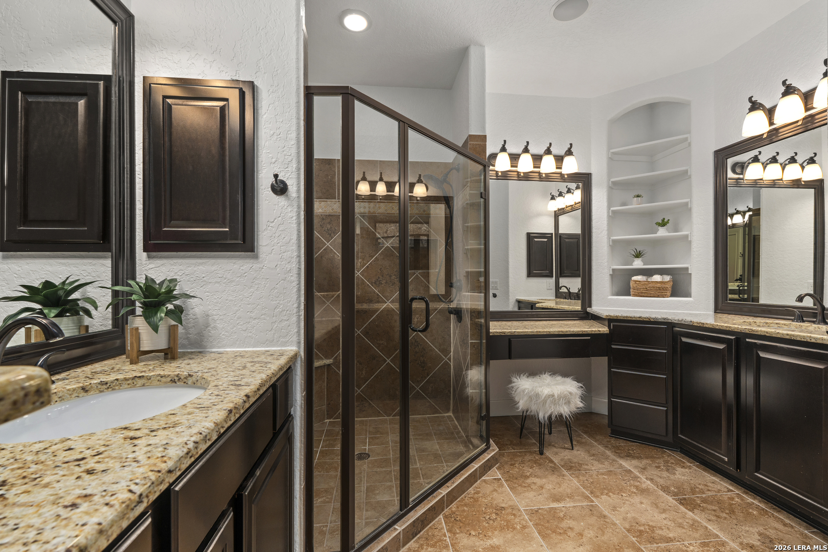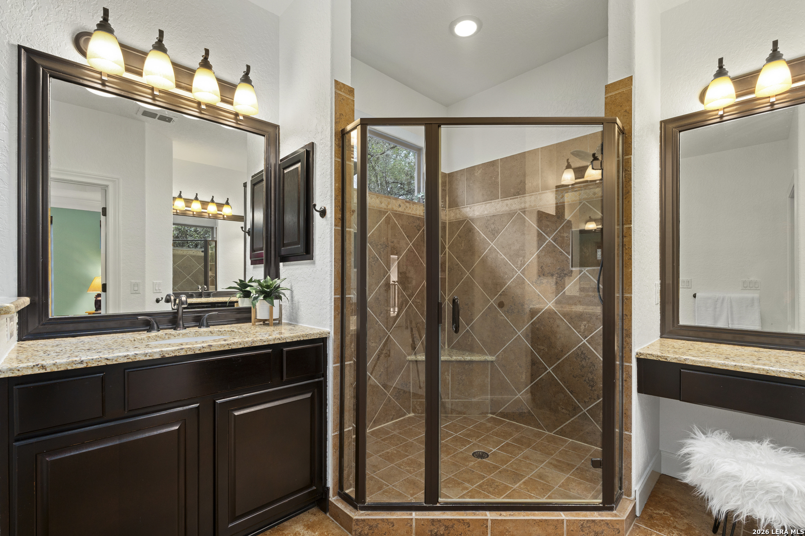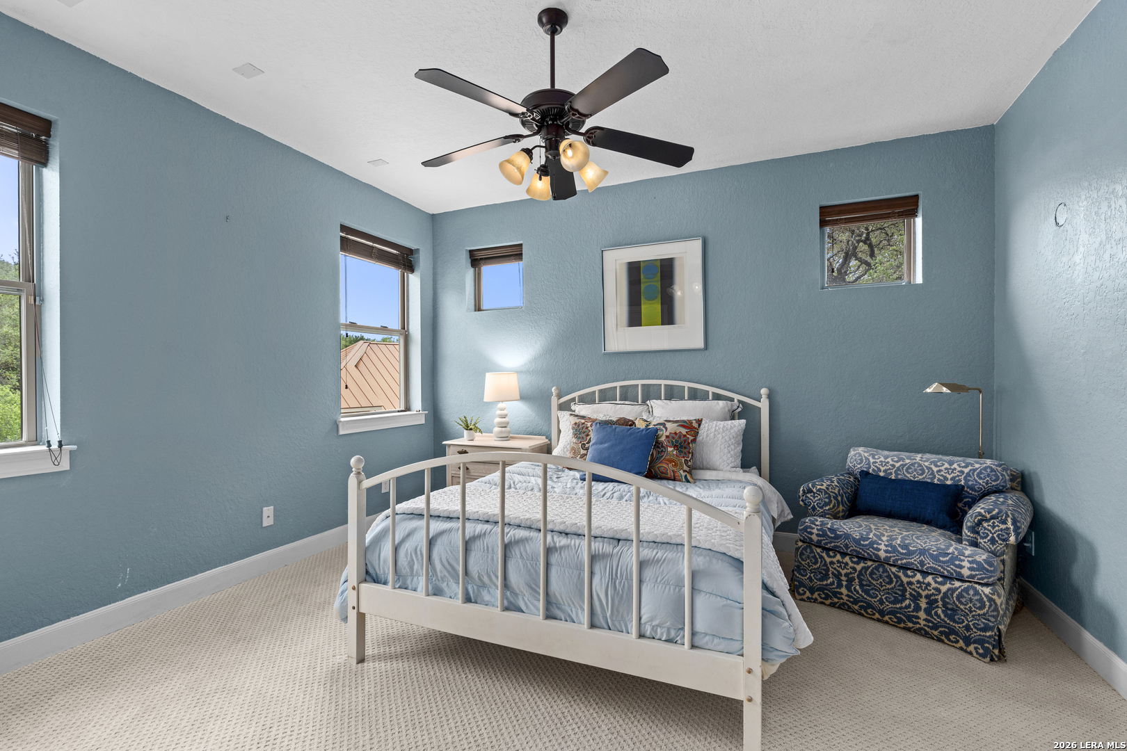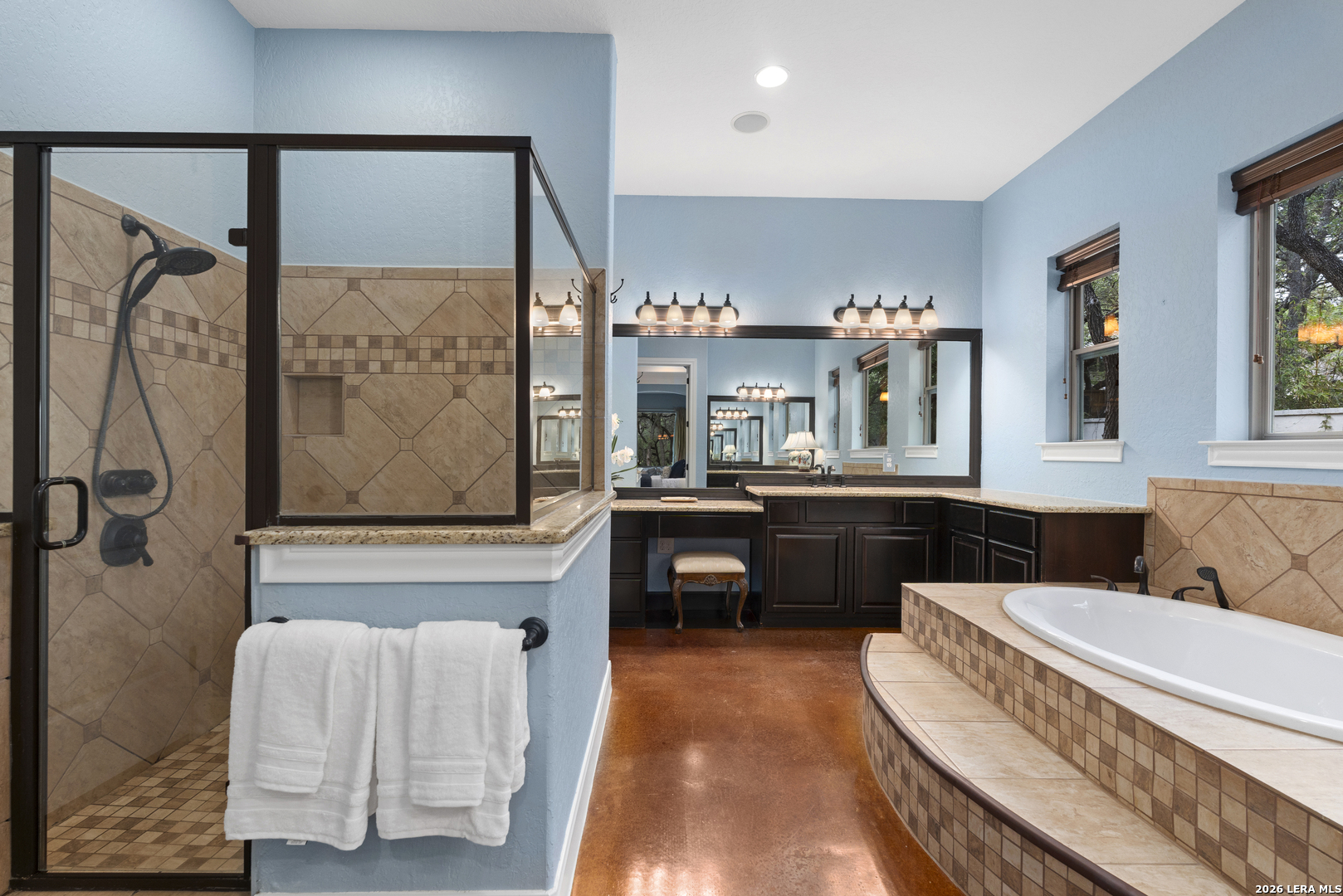 Set behind a long private drive on a rare .48 acre greenbelt lot, this Italian inspired villa offers a level of privacy, scale, and resort style living seldom found in San Antonio. From the moment you arrive, the home makes a lasting impression. Exceptional curb appeal is framed by over $250,000 in thoughtfully designed, drought tolerant, cold hardy landscaping that blends beautifully with the natural surroundings. Designed for both everyday living and exceptional entertaining, the outdoor spaces are a true highlight. The recently resurfaced heated pool and spa are perfectly positioned to overlook the lush greenbelt, while multiple covered patios create seamless indoor/outdoor living. A casita offers flexibility for guests or a private office. Inside, the home combines warmth and scale with a highly functional layout. The kitchen is well appointed with a builtin refrigerator, gas cooktop, and double ovens. The primary suite features a sitting area, direct patio access to the pool, and a spacious walk in closet. Upstairs, a secondary primary suite offers its own private laundry-perfect for multi-generational living or extended guests. New carpet throughout the upper level adds a move in ready touch. Behind the scenes, the home is equipped with a suite of high performance features designed for comfort and efficiency, including solar panels, spray foam insulation and radiant barrier, delivering a quieter, more comfortable living environment with the added benefit of long term energy savings. Modern convenience meets timeless design with whole home automation controlling lighting, climate, and sound. Tucked within a small, gated enclave yet just minutes from 1604, I10 and 410, close to the medical center area, and premier shopping and dining, this is a property that offers both privacy and accessibility, an increasingly rare combination. Homes of this caliber, on lots of this size and setting, rarely come to market.