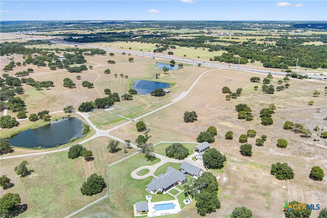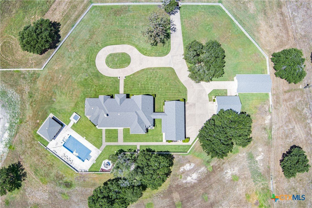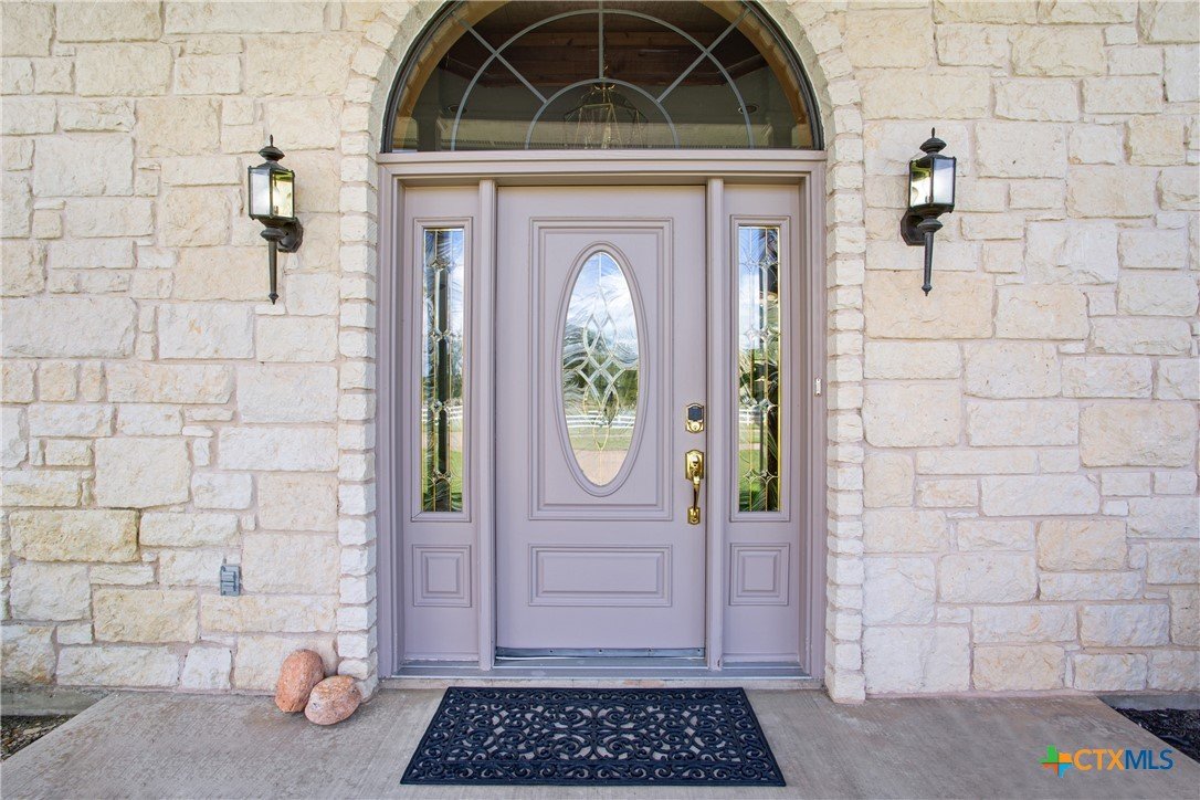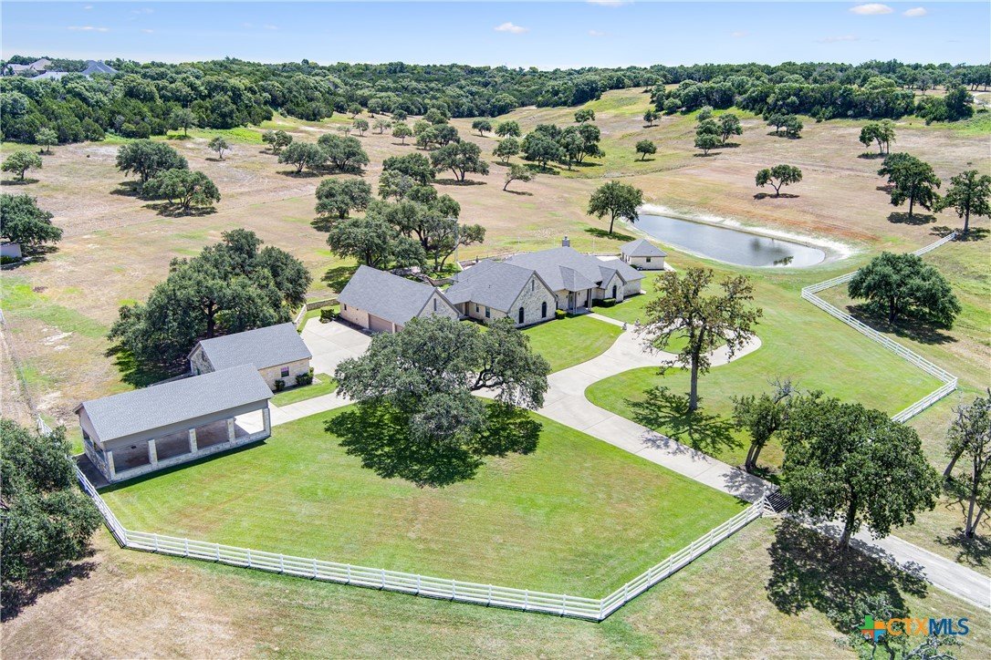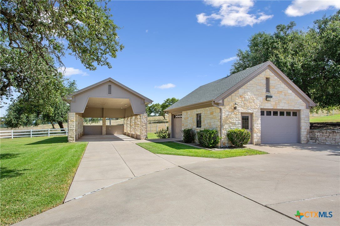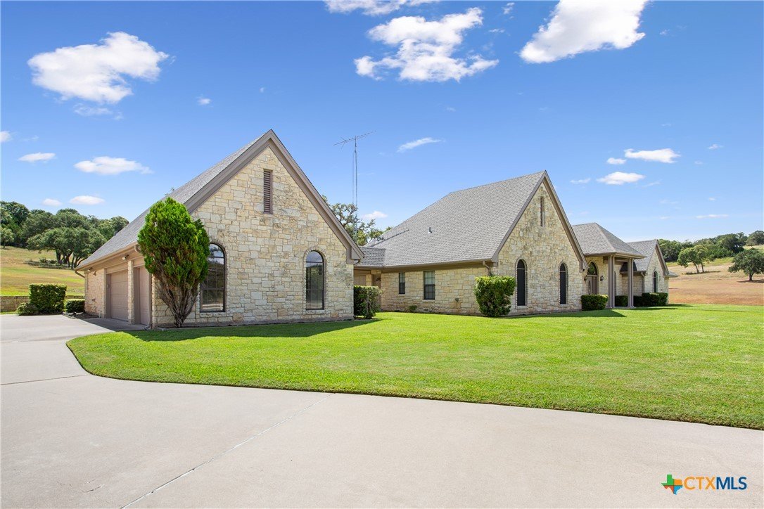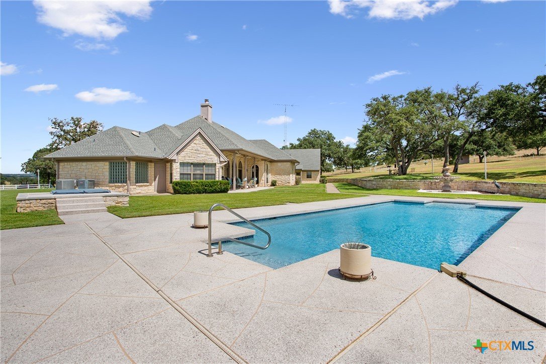 Situated on 191 acres in Nolanville, Texas, this substantial custom stone residence boasts a circular driveway, fenced premises, a spacious carport, and a garage for over 5 cars. The property also includes a pool with a pool/guest house, along with a covered patio. With 4 bedrooms and 2 bathrooms, the residence spans over 5300 square feet and features office space, beamed ceilings, a wood-burning fireplace, a wet bar, and a formal dining room. The expansive master bedroom offers a double vanity, a garden tub, and ample natural light. Additionally, the property includes a large stock tank.
