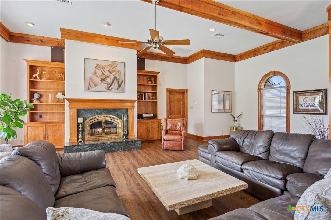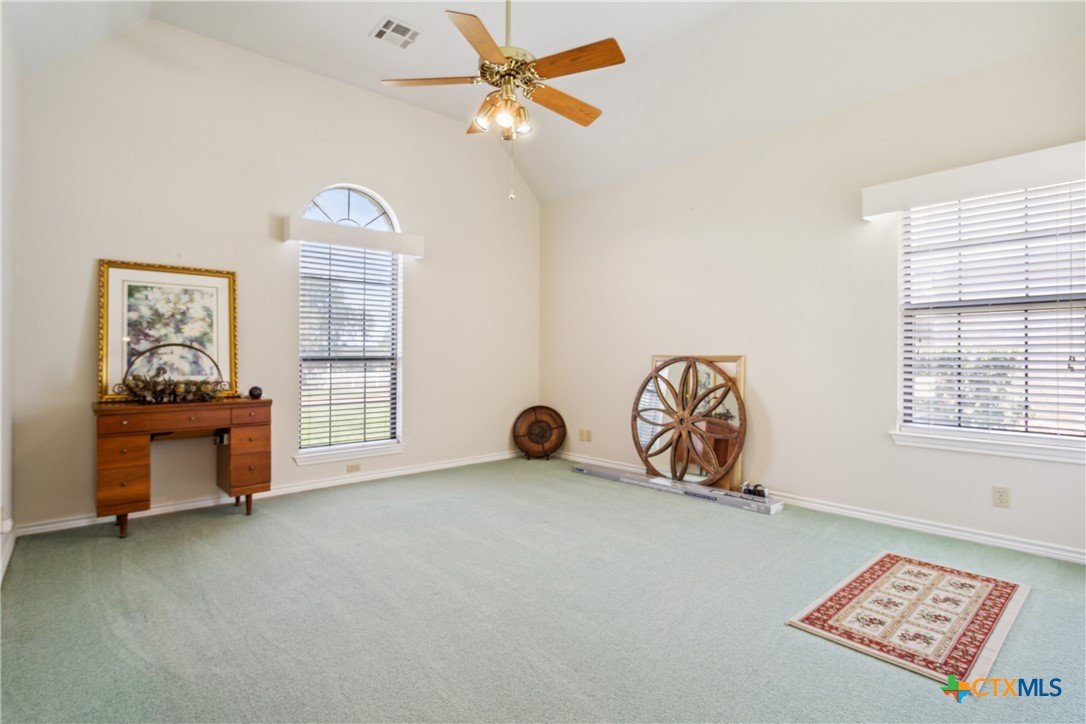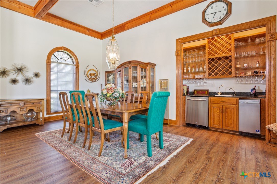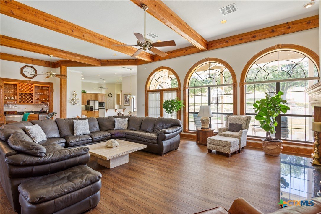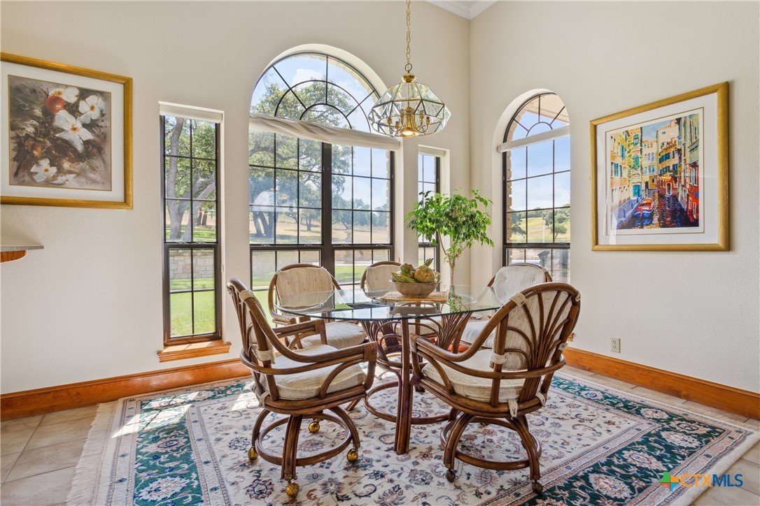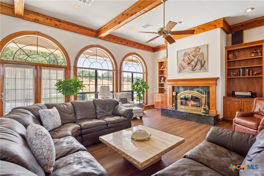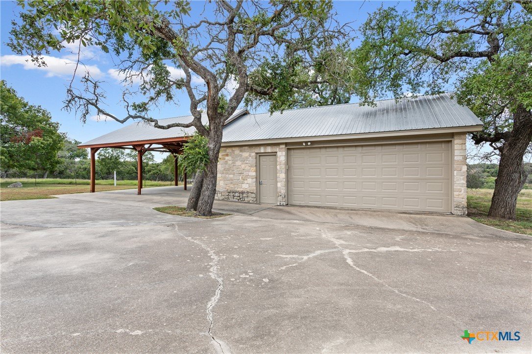 Situated on 191 acres in Nolanville, Texas, this substantial custom stone residence boasts a circular driveway, fenced premises, a spacious carport, and a garage for over 5 cars. The property also includes a pool with a pool/guest house, along with a covered patio. With 4 bedrooms and 2 bathrooms, the residence spans over 5300 square feet and features office space, beamed ceilings, a wood-burning fireplace, a wet bar, and a formal dining room. The expansive master bedroom offers a double vanity, a garden tub, and ample natural light. Additionally, the property includes a large stock tank.