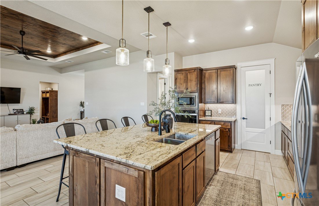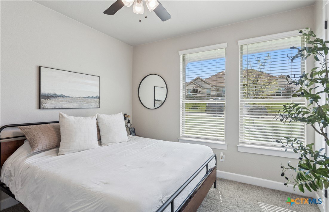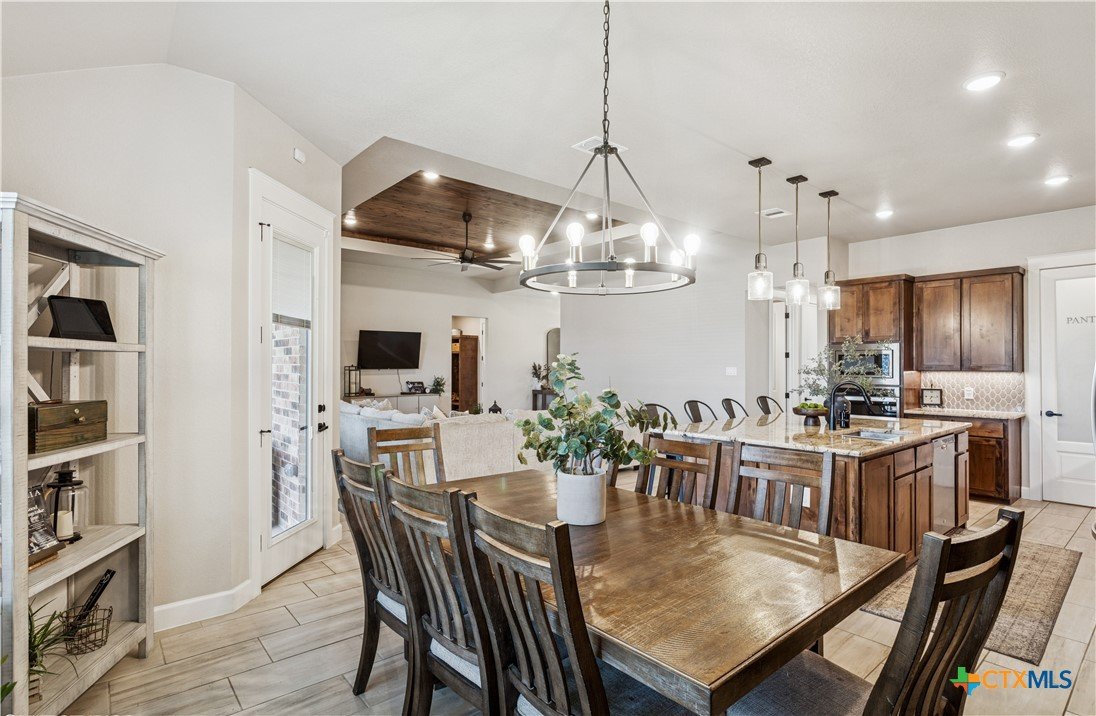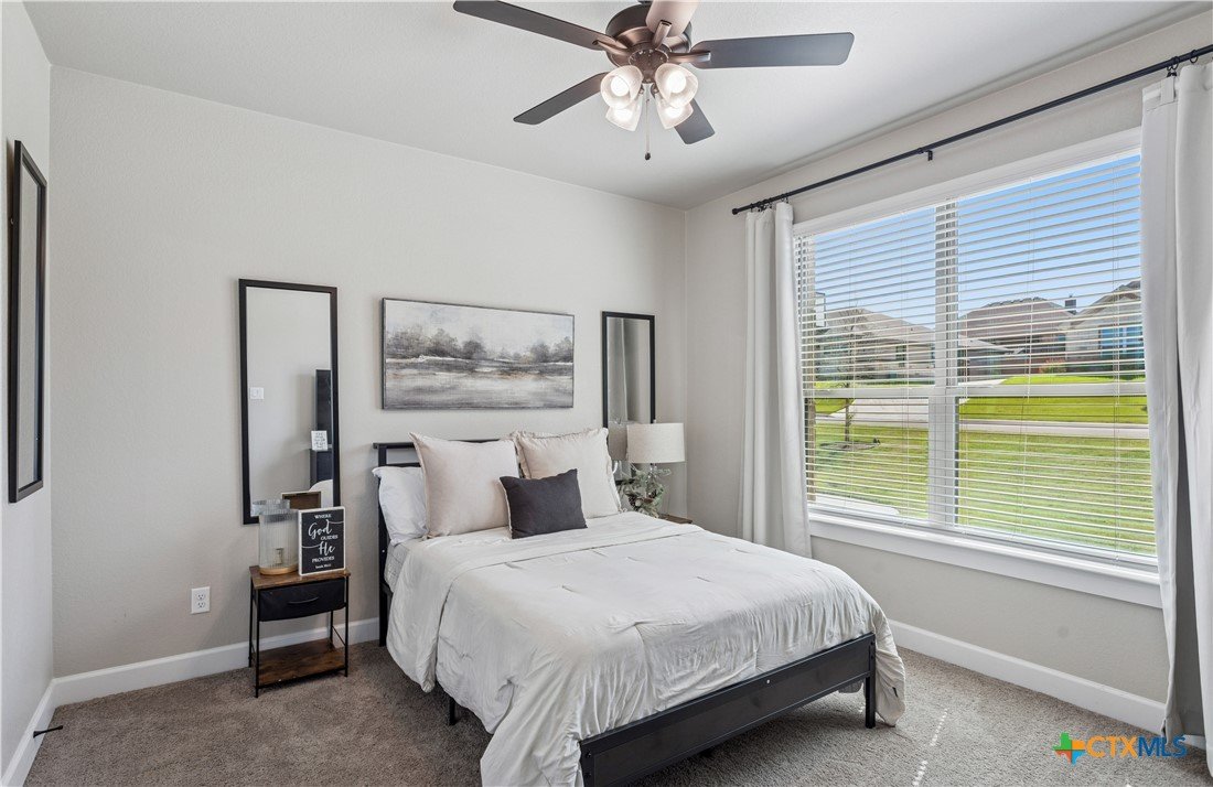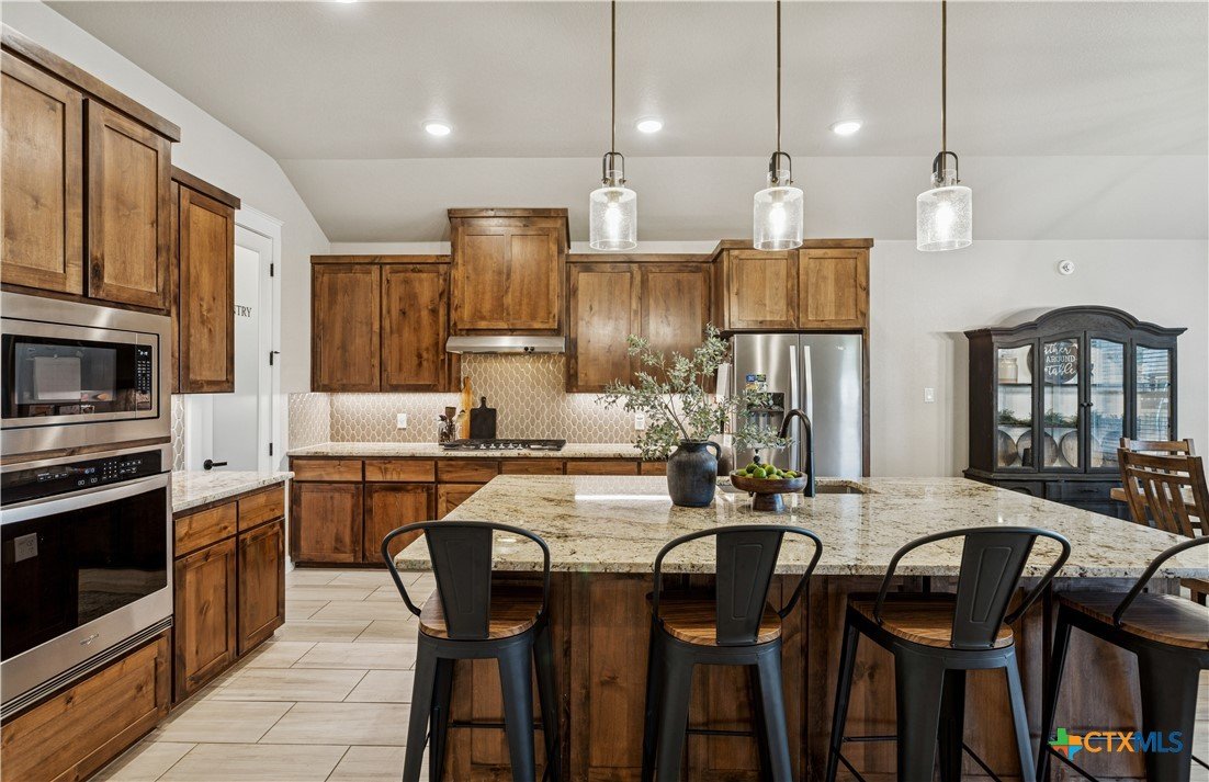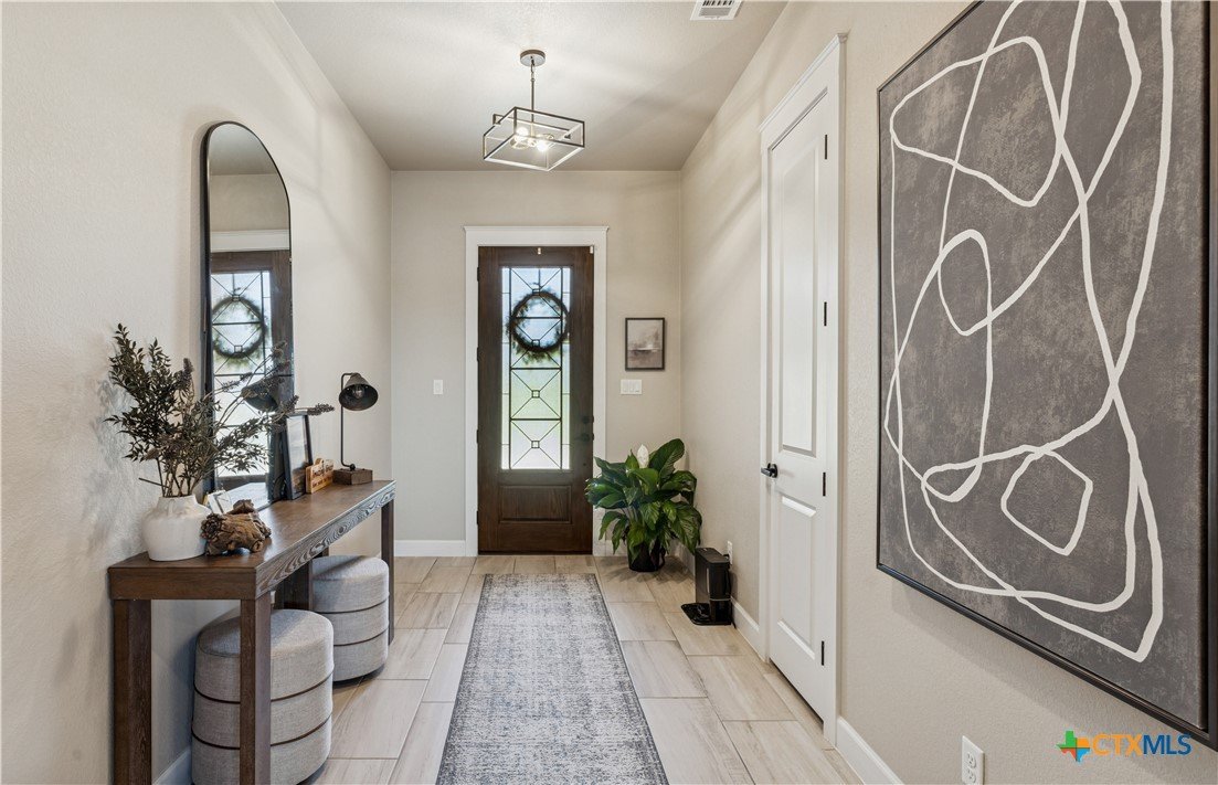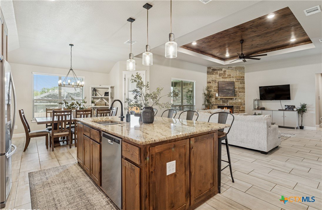 Welcome to refined living in the prestigious Bella Charca community. This exceptional Ben Atkinson home offers 2,625 square feet of thoughtfully curated space where elegance meets everyday comfort. From the moment you enter, soaring 18-foot ceilings and soft recessed lighting create a grand yet inviting ambiance. The living area, anchored by a striking brick fireplace, seamlessly connects to a beautifully appointed kitchen designed to inspire—featuring a central island, built-in oven, gas cooktop, and generous pantry. The primary suite is a true sanctuary, offering a spa-inspired bath with a garden tub, separate shower, dual granite vanities, and an expansive walk-in closet. Each secondary bedroom is equally well-designed, filled with natural light and enhanced by walk-in closets and custom storage. Step outside to your private retreat, complete with a covered patio, porch, and extended fencing for added privacy—perfect for quiet evenings or effortless entertaining. Just steps away, the neighborhood pond provides a serene backdrop for morning strolls and peaceful moments. This is more than a home—it’s a lifestyle of comfort, sophistication, and tranquility in one of the area’s most sought-after communities.