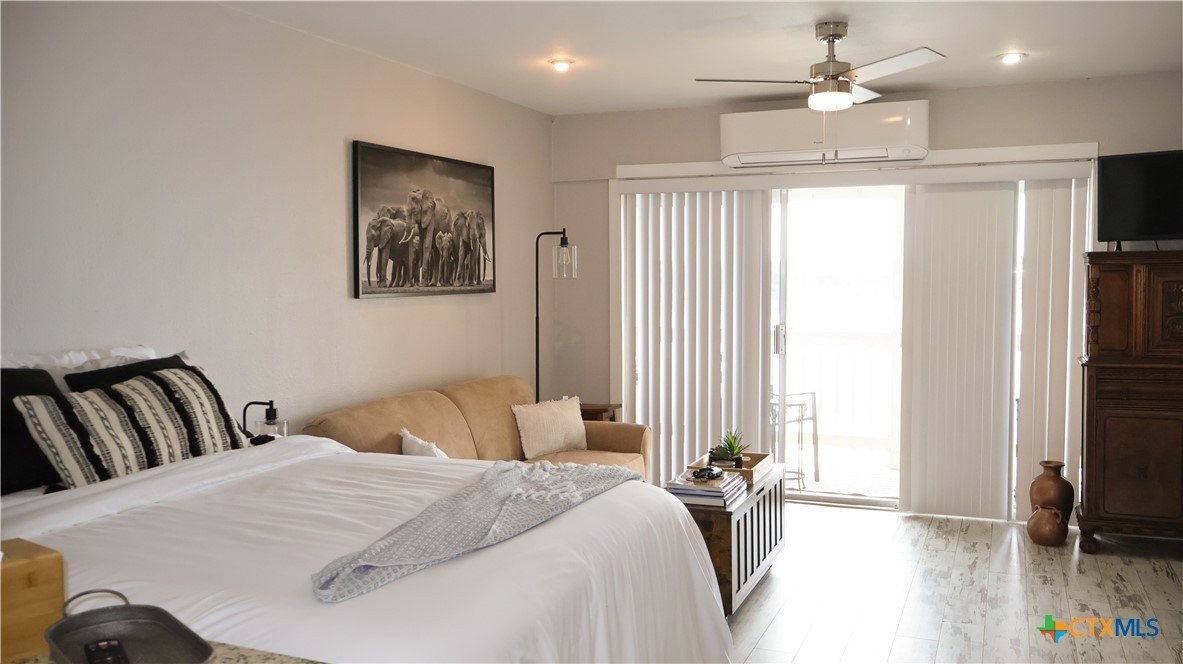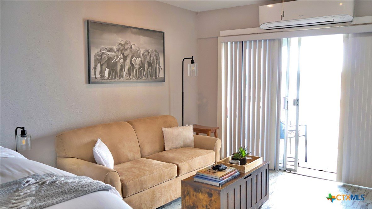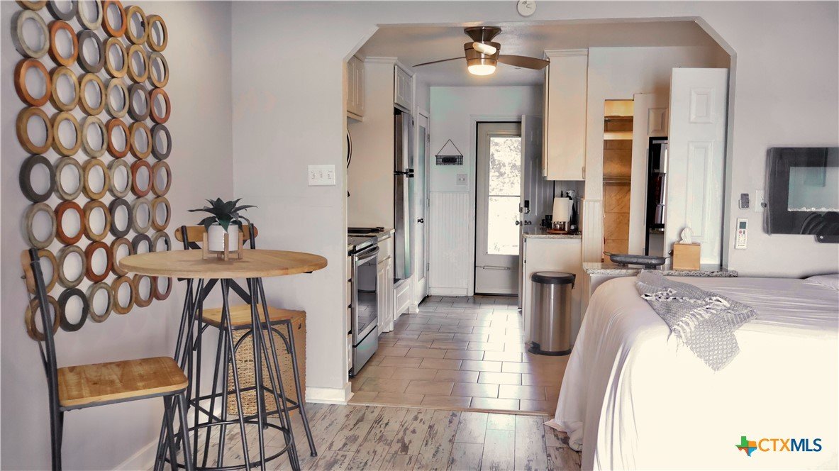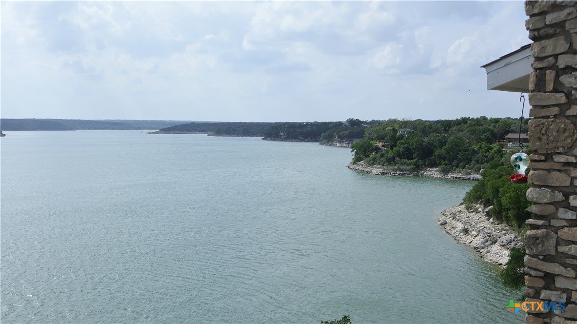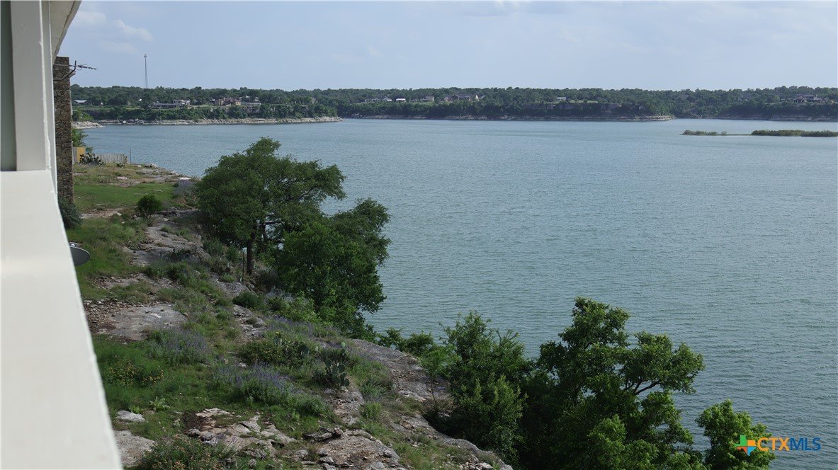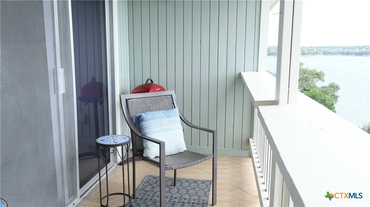 LAKEFRONT STUDIO CONDO on LAKE BELTON with a private balcony and panoramic views. The open layout is easy to love, with German made white washed oak laminate flooring in the living space and porcelain tile in the kitchen, hallway, and bathroom for low maintenance. The kitchen is fully set up with custom cabinetry, plenty of storage, granite countertops, a tile backsplash, and a deep sink, plus stainless appliances including a convection oven range, microwave, and refrigerator. Big upgrades are already done, including a mini split AC unit installed in 2023, a programmable electric fireplace that also heats the unit, a tankless hot water heater, and a reverse osmosis system for drinking water. The bathroom includes a large walk in tiled shower and extra storage. Step out to the lakefront balcony in the evening and enjoy the view! Plus, there is a modern, updated guest house available on site for visitors at an affordable daily rate, approximately $50 per day.