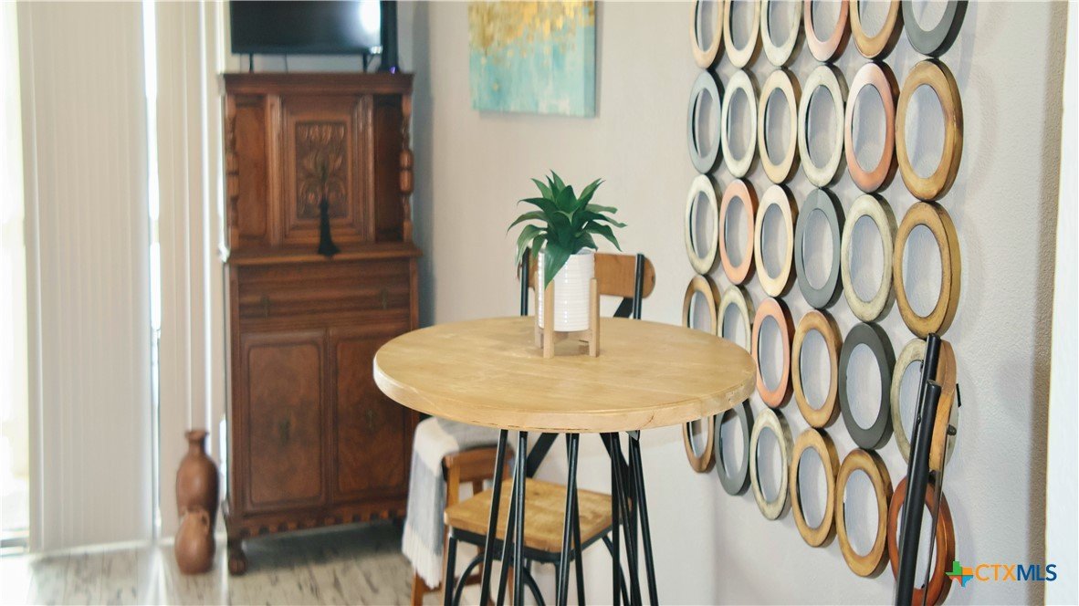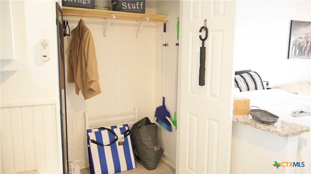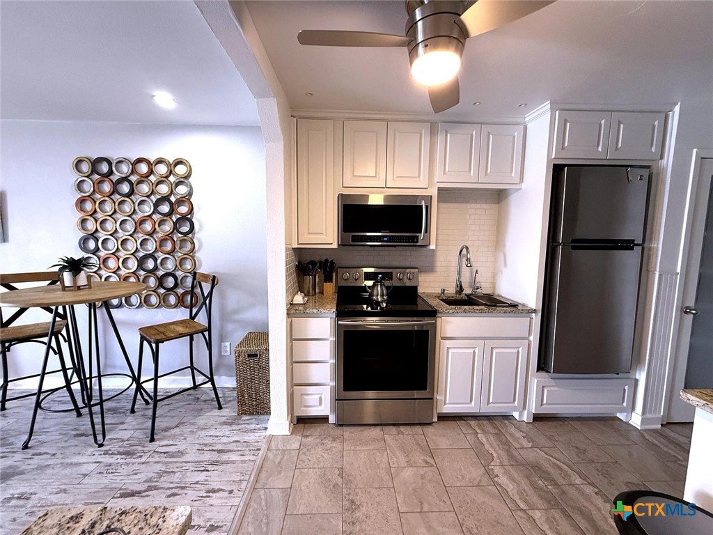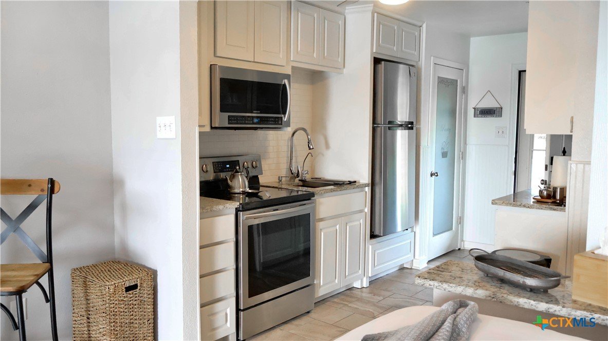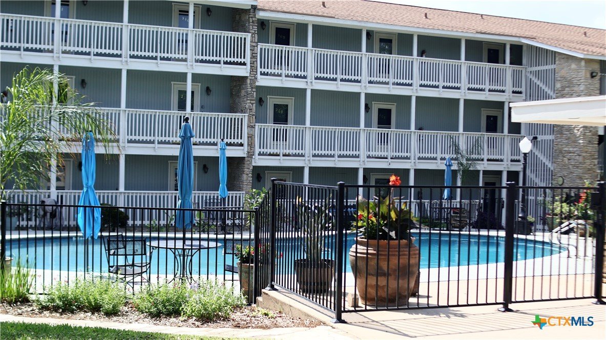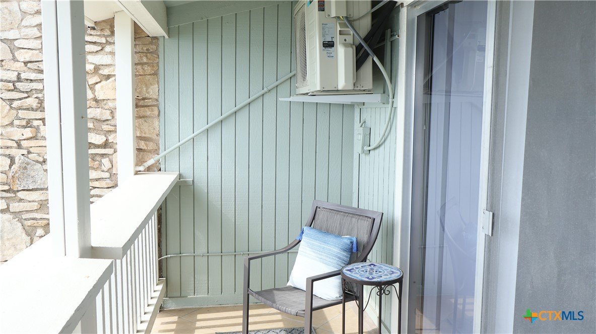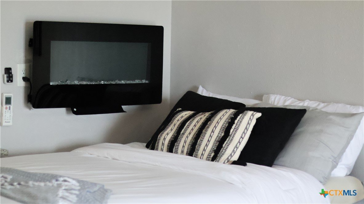 LAKEFRONT STUDIO CONDO on LAKE BELTON with a private balcony and panoramic views. The open layout is easy to love, with German made white washed oak laminate flooring in the living space and porcelain tile in the kitchen, hallway, and bathroom for low maintenance. The kitchen is fully set up with custom cabinetry, plenty of storage, granite countertops, a tile backsplash, and a deep sink, plus stainless appliances including a convection oven range, microwave, and refrigerator. Big upgrades are already done, including a mini split AC unit installed in 2023, a programmable electric fireplace that also heats the unit, a tankless hot water heater, and a reverse osmosis system for drinking water. The bathroom includes a large walk in tiled shower and extra storage. Step out to the lakefront balcony in the evening and enjoy the view! Plus, there is a modern, updated guest house available on site for visitors at an affordable daily rate, approximately $50 per day.
