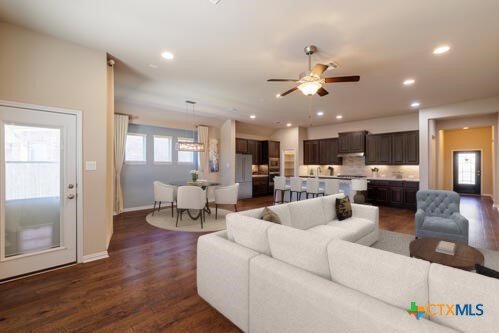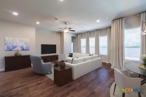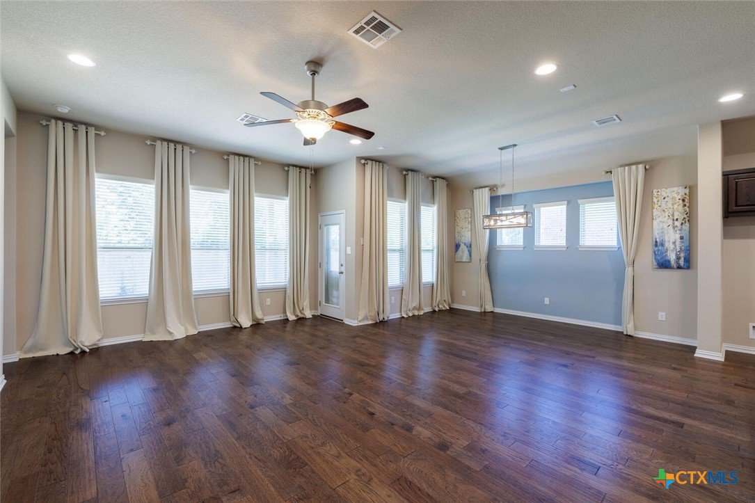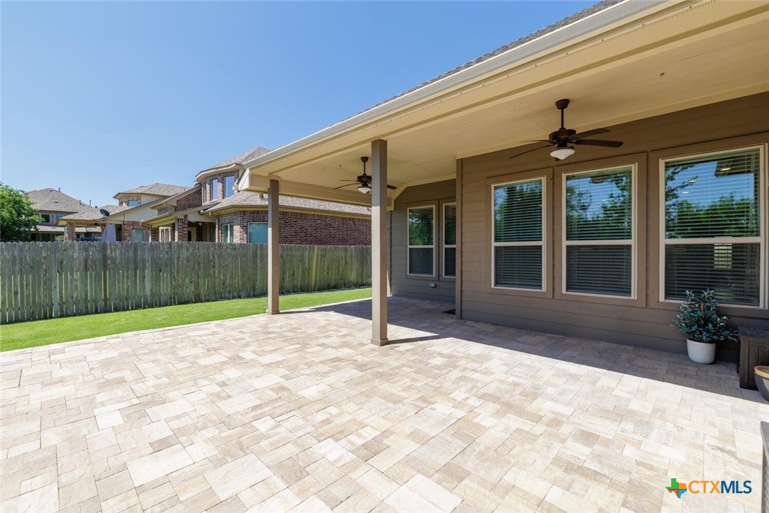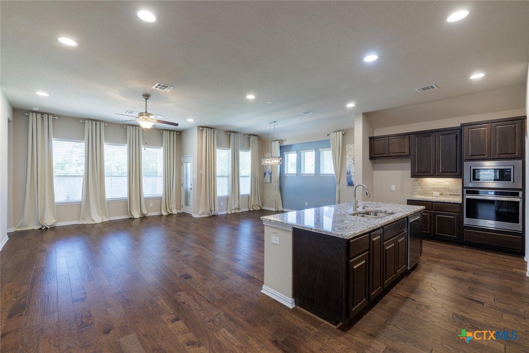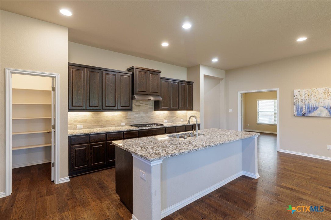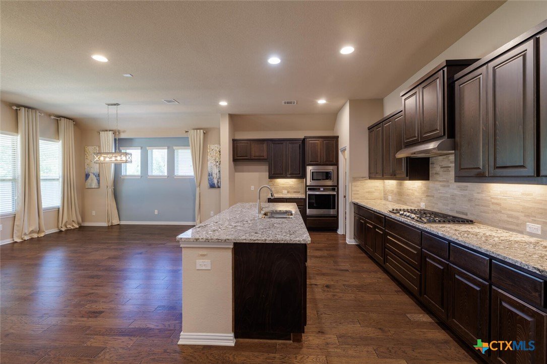 Nestled in the rolling hills of Liberty Hill, this beautifully maintained home offers the perfect blend of style, function, and comfort. Built in 2019, this one-story residence showcases contemporary design and thoughtful upgrades, all in a peaceful setting within one of Central Texas’s fastest-growing areas. Step inside to discover an open-concept floor plan that effortlessly connects the living, dining, and kitchen areas—ideal for both relaxed living and entertaining. Beautiful hardwood floors flow through out the kitchen, living, dining room, and office. The heart of the home is a stunning kitchen featuring a large center island, gleaming granite countertops, and a decorative tile backsplash that adds a modern touch. You'll love the stainless steel appliances, including a gas stovetop and oven. Large pantry with built in shelving. The spacious primary suite offers a private retreat, complete with an ensuite bathroom boasting a walk-in tiled shower, dual vanity, and a generous walk-in closet. Two additional bedrooms and a separate office provide flexible space for guests, a home office, or growing households. Enjoy Texas evenings on the extended covered back patio or host gatherings in your private fenced backyard—an outdoor sanctuary for relaxing, gardening, or playing. Backs to green space. An oversized three-car garage offers ample storage, hobby space, or room for your vehicles and gear. Additional highlights include: * Dedicated laundry room * Permanent holiday lighting system – celebrate every season without the hassle of hanging lights! * Energy-efficient features * Great Santa Rita Ranch community amenities and Liberty Hill ISD schools Located just a short drive from Georgetown, Leander, and Austin, this home combines small-town charm with easy access to shopping, dining, and major employers. Whether you're looking for a peaceful place to call home or a modern property with room to grow.