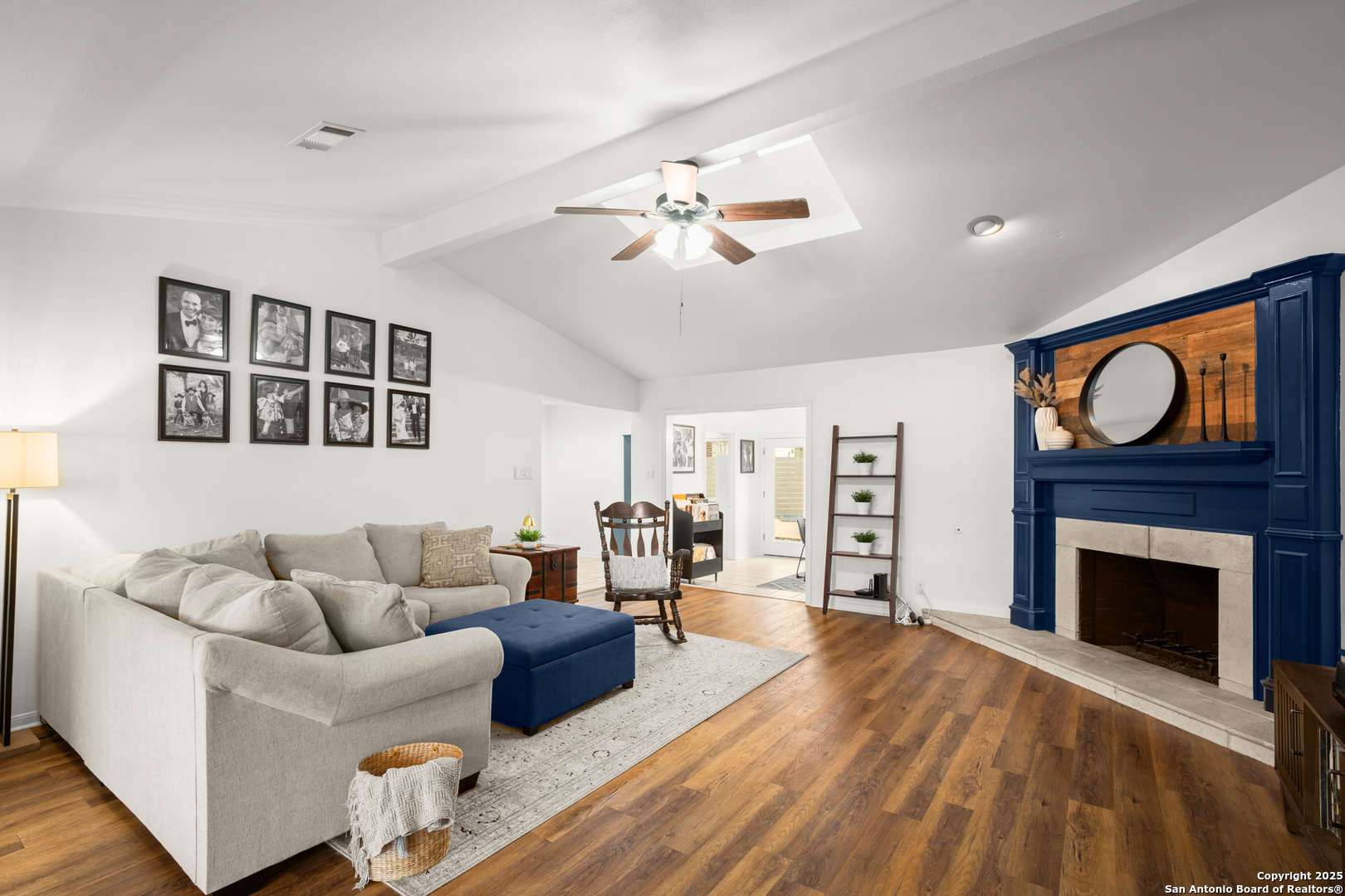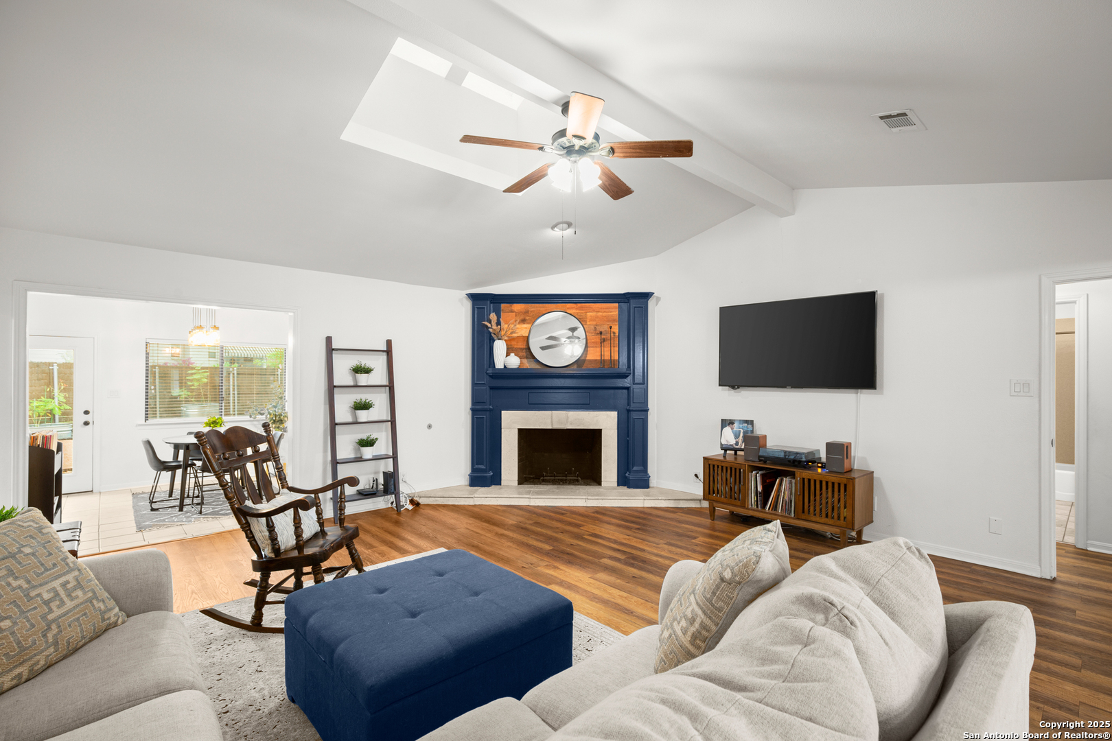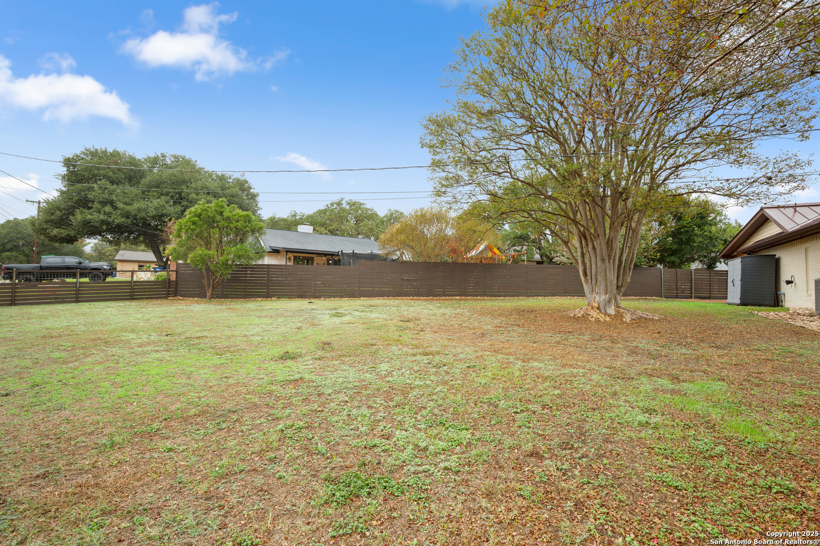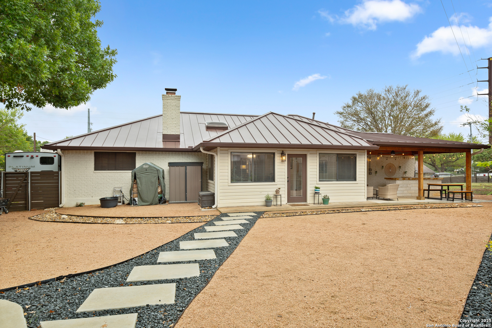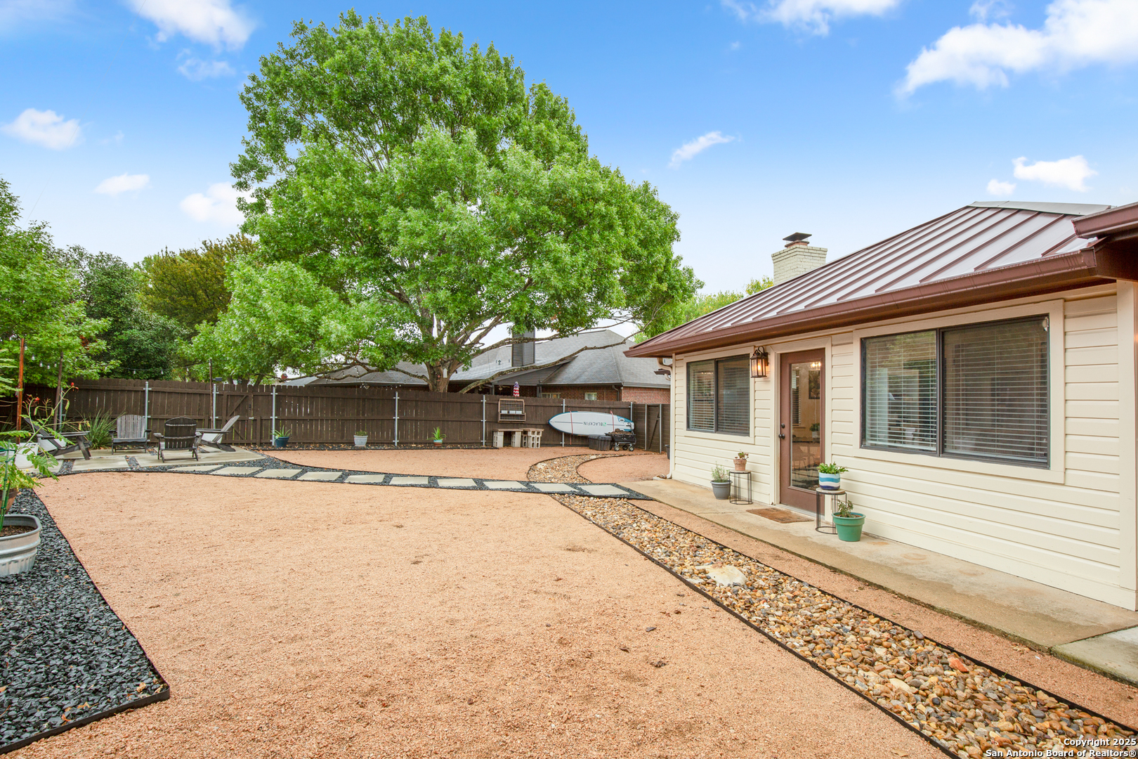Beautifully maintained and thoughtfully updated, this single-story home sits on a spacious 0.287-acre lot in the highly desirable Oakwood Estates-just minutes to Loop 337, HEB, restaurants, shopping, and everyday essentials. With an updated HVAC system and numerous improvements, the home blends comfort, function, and modern style in an established neighborhood with no HOA and a low tax rate. A circular and extended driveway plus a 2-car garage create abundant parking and a welcoming first impression. The property offers a perfect balance of usable space: a large grassy side yard for play and pets, plus xeriscaped areas with custom concrete features, a rock riverbed, and a French drain system for low-maintenance living. Extended fencing enhances privacy and maximizes the yard. Inside, the open-concept layout features a bright living room with a vaulted ceiling, skylight, and cozy fireplace. Plank wood-faux flooring runs throughout-no carpet anywhere-creating a clean, cohesive look. The eat-in kitchen includes granite countertops, abundant cabinetry, a gas range, and upgraded Bosch appliances. A flex room off the living area works beautifully as a playroom, office, or hobby space, while the formal dining room is ideal for gatherings. The primary suite offers patio access, a walk-in closet, and an updated en-suite bath with a granite dual vanity and walk-in shower. Outdoor living impresses with an expansive covered patio featuring a tongue-and-groove ceiling and a built-in wet bar with sink and beverage refrigerator. The large fenced backyard is perfect for entertaining, relaxing, or gardening. And throughout Oakwood Estates, golf-cart living is a popular and convenient part of the lifestyle. This thoughtfully upgraded home delivers modern comfort, an enhanced lot, and unbeatable convenience in a prime New Braunfels location. Schedule a showing today!