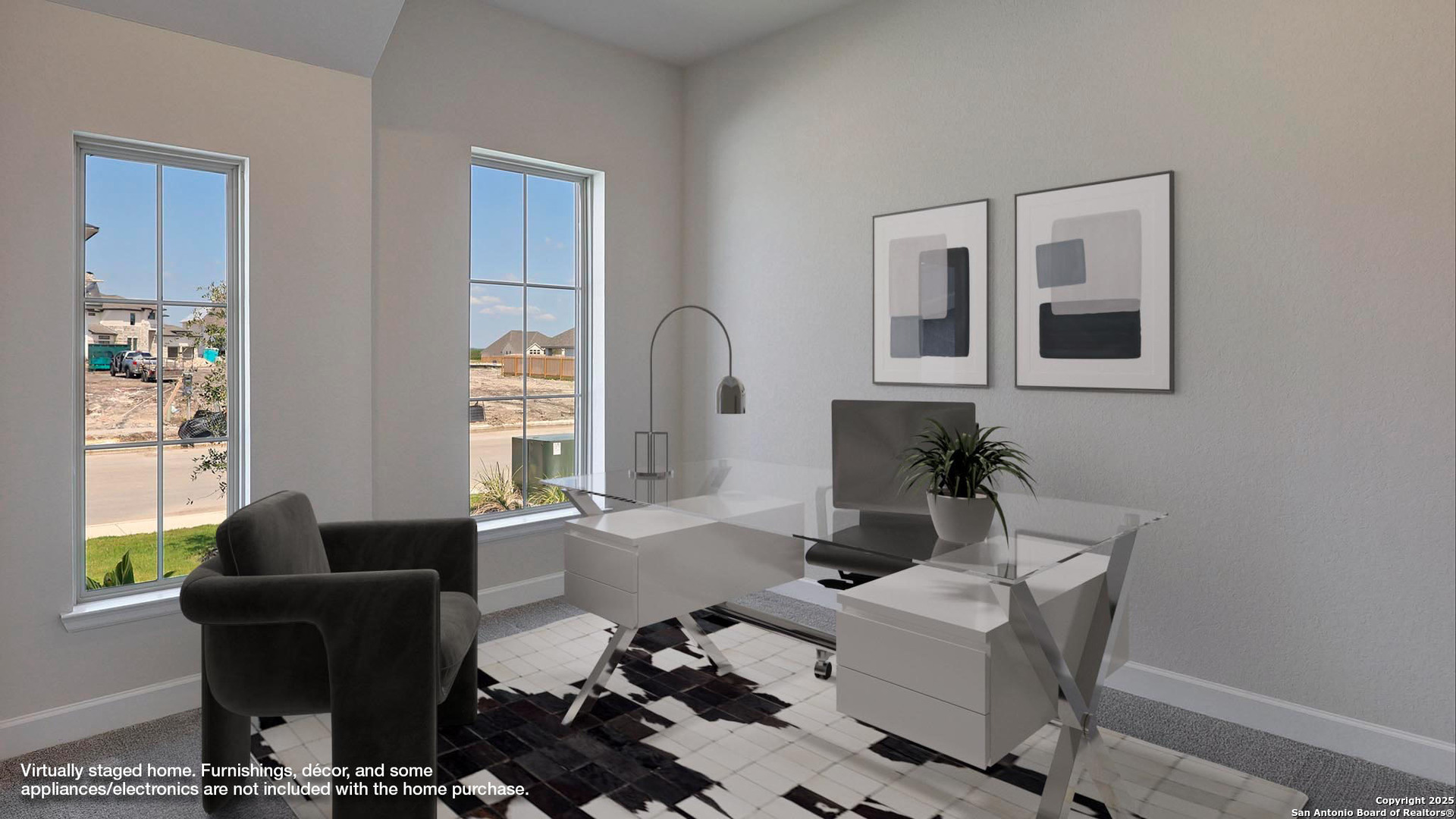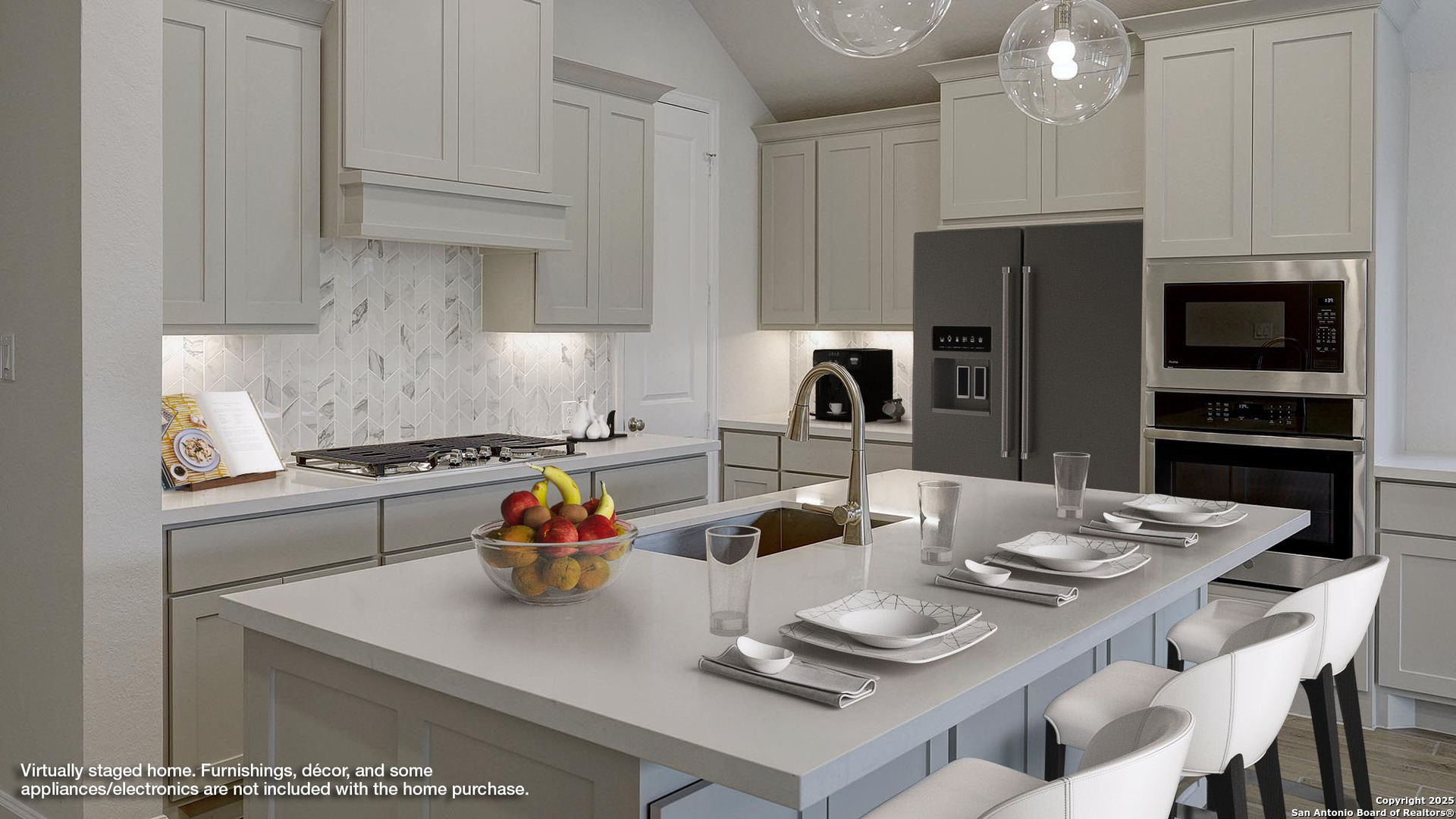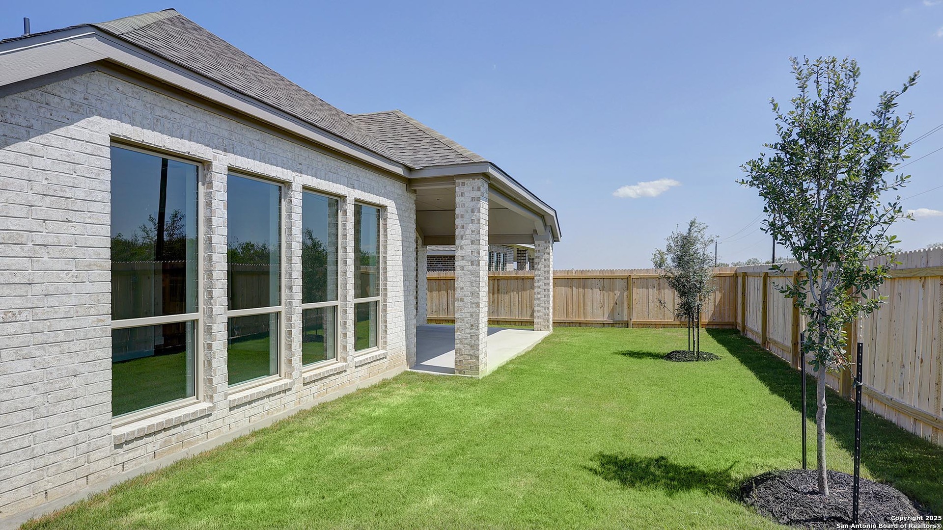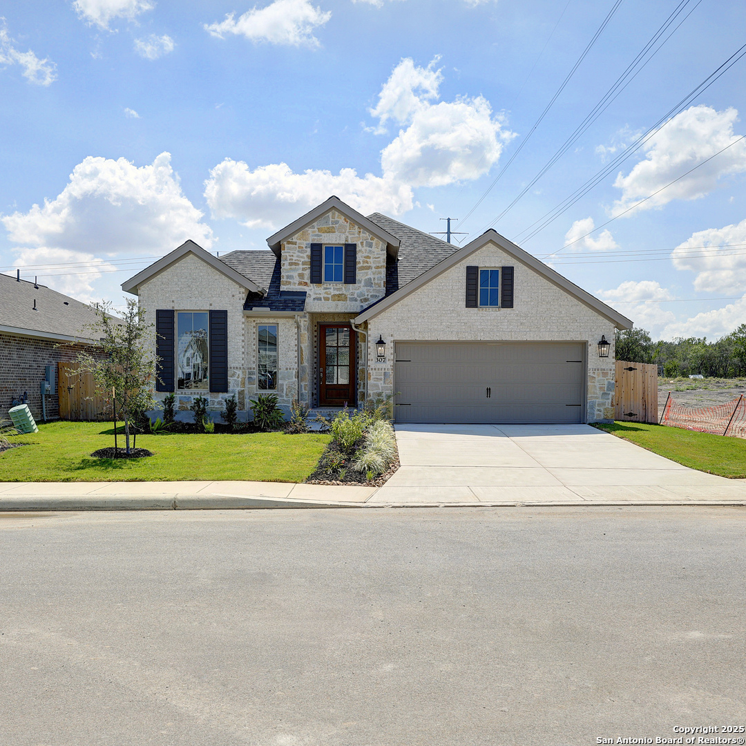 Extended entryway with 12-foot ceilings. Game room with French doors frame the entry. Spacious family room with a wall of windows. Open kitchen offers an island with built-in seating space, 5-burner gas cooktop and a corner walk-in pantry. Primary suite with a wall of windows. Dual vanities, garden tub, separate glass enclosed shower and two walk-in closets in the primary bath. Guest suite just off the extended entry with a full bathroom and walk-in closet. Secondary bedrooms with walk-in closets. Utility room with private access to the primary bathroom. Extended covered backyard patio and 5-zone sprinkler system. Mud room just off the two-car garage.