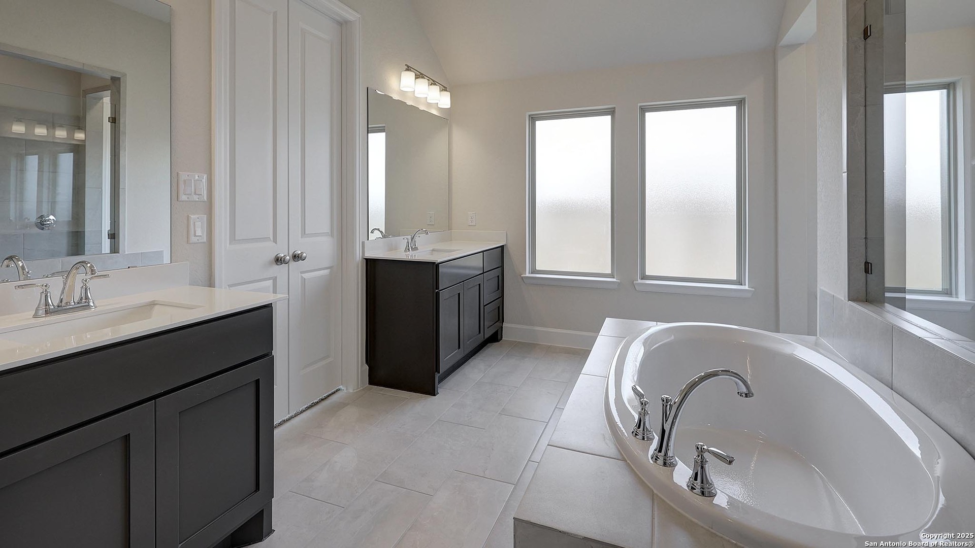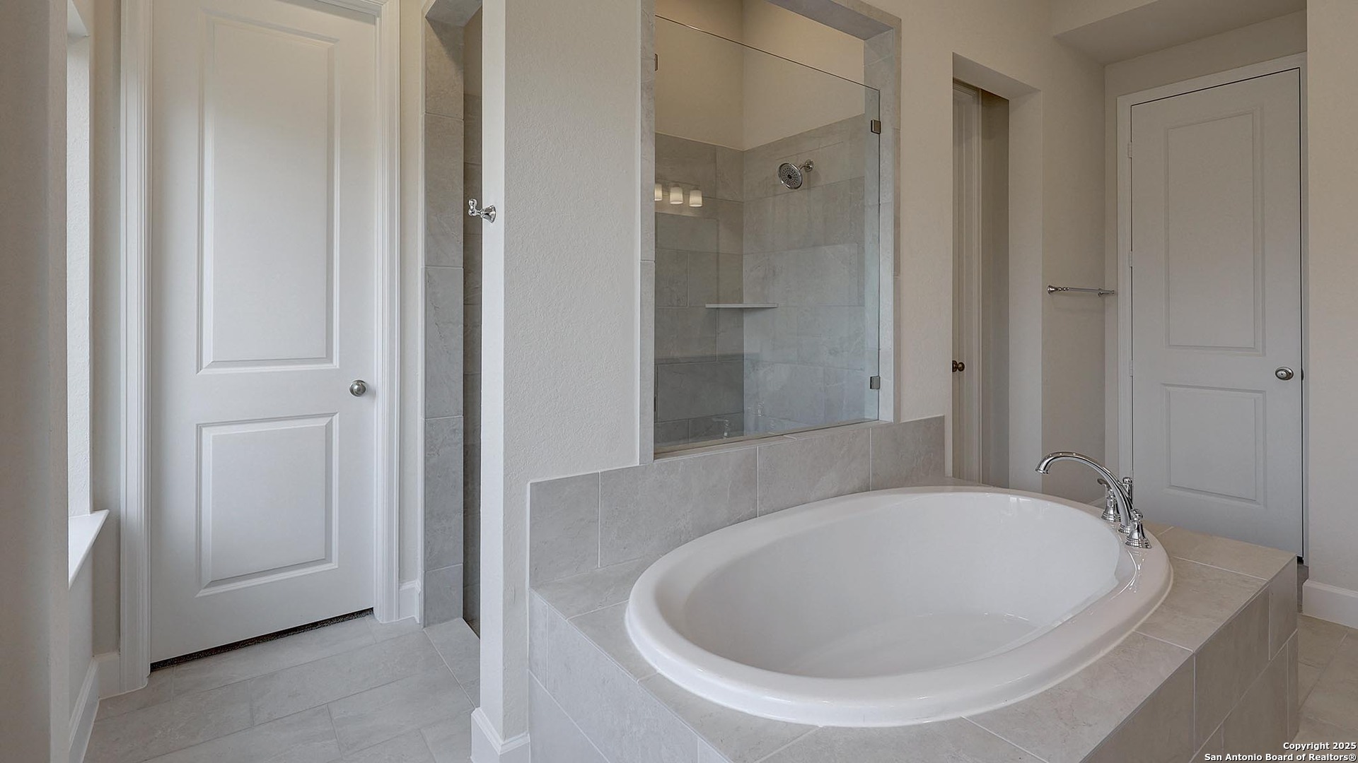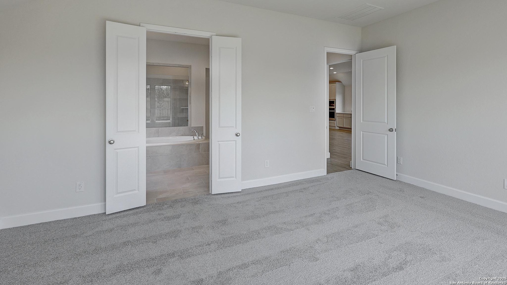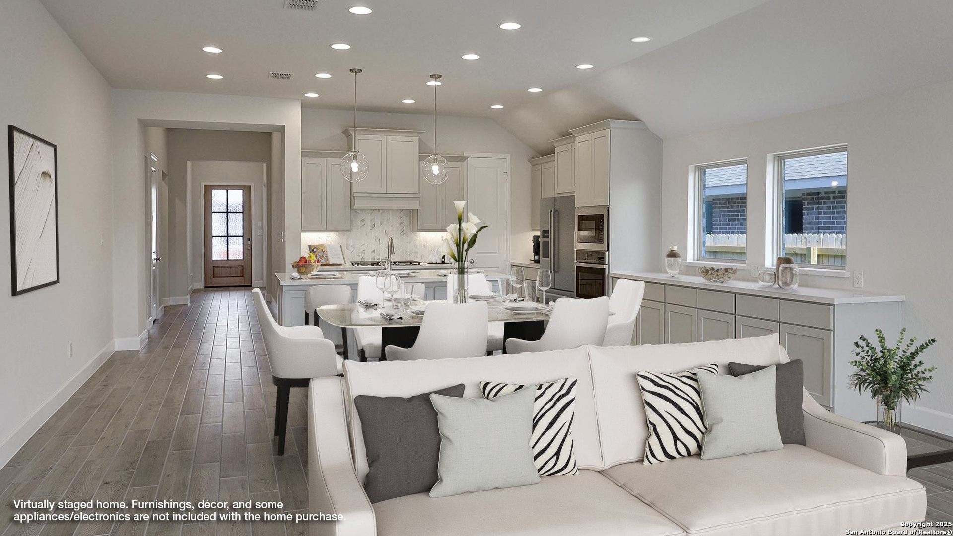 Extended entryway with 12-foot ceilings. Game room with French doors frame the entry. Spacious family room with a wall of windows. Open kitchen offers an island with built-in seating space, 5-burner gas cooktop and a corner walk-in pantry. Primary suite with a wall of windows. Dual vanities, garden tub, separate glass enclosed shower and two walk-in closets in the primary bath. Guest suite just off the extended entry with a full bathroom and walk-in closet. Secondary bedrooms with walk-in closets. Utility room with private access to the primary bathroom. Extended covered backyard patio and 5-zone sprinkler system. Mud room just off the two-car garage.