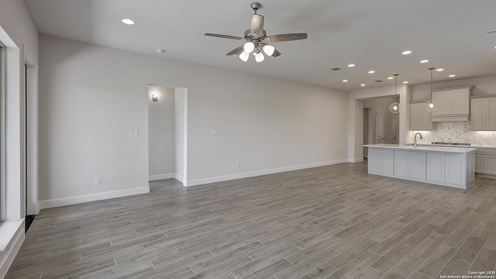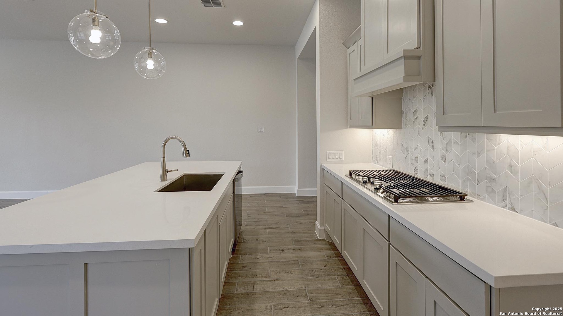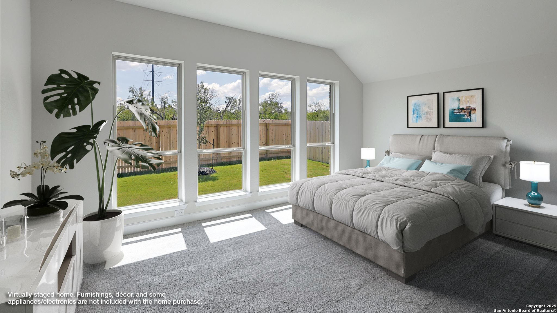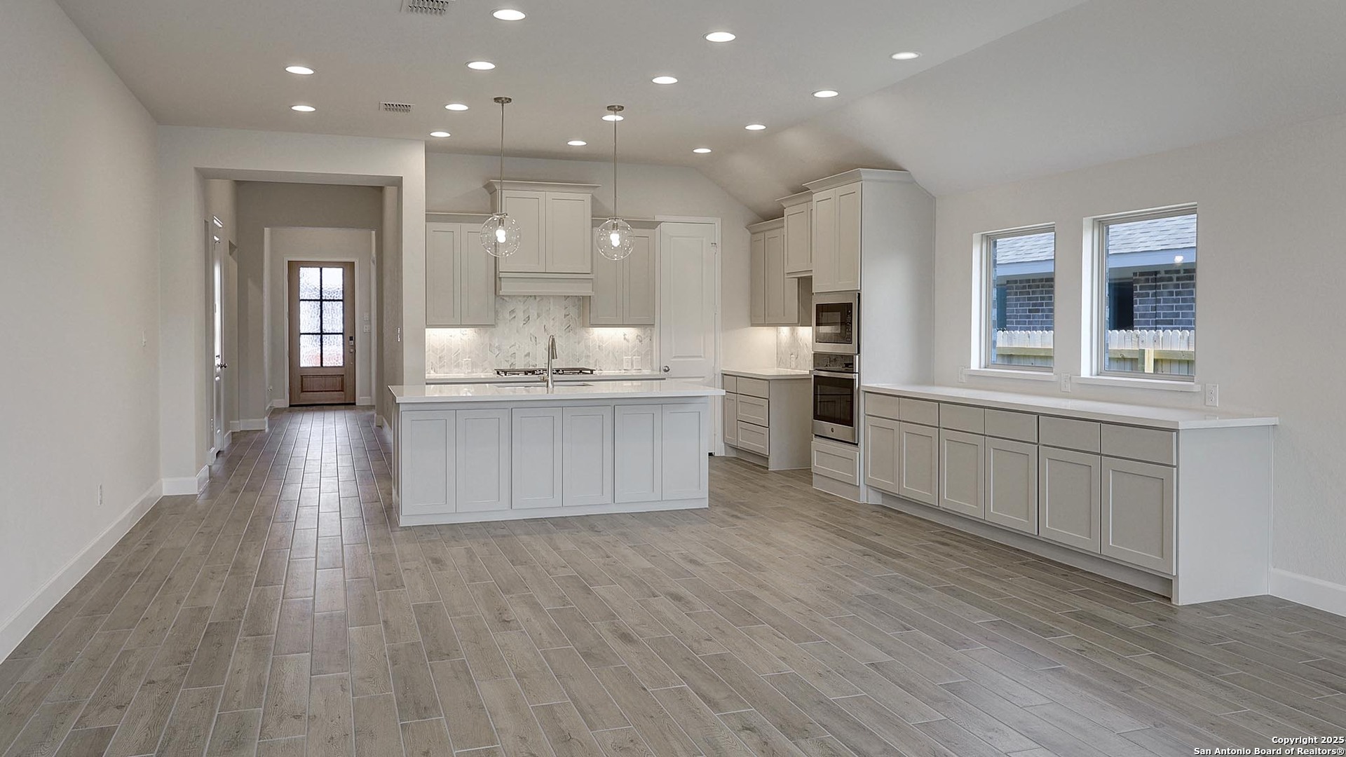 Extended entryway with 12-foot ceilings. Game room with French doors frame the entry. Spacious family room with a wall of windows. Open kitchen offers an island with built-in seating space, 5-burner gas cooktop and a corner walk-in pantry. Primary suite with a wall of windows. Dual vanities, garden tub, separate glass enclosed shower and two walk-in closets in the primary bath. Guest suite just off the extended entry with a full bathroom and walk-in closet. Secondary bedrooms with walk-in closets. Utility room with private access to the primary bathroom. Extended covered backyard patio and 5-zone sprinkler system. Mud room just off the two-car garage.
