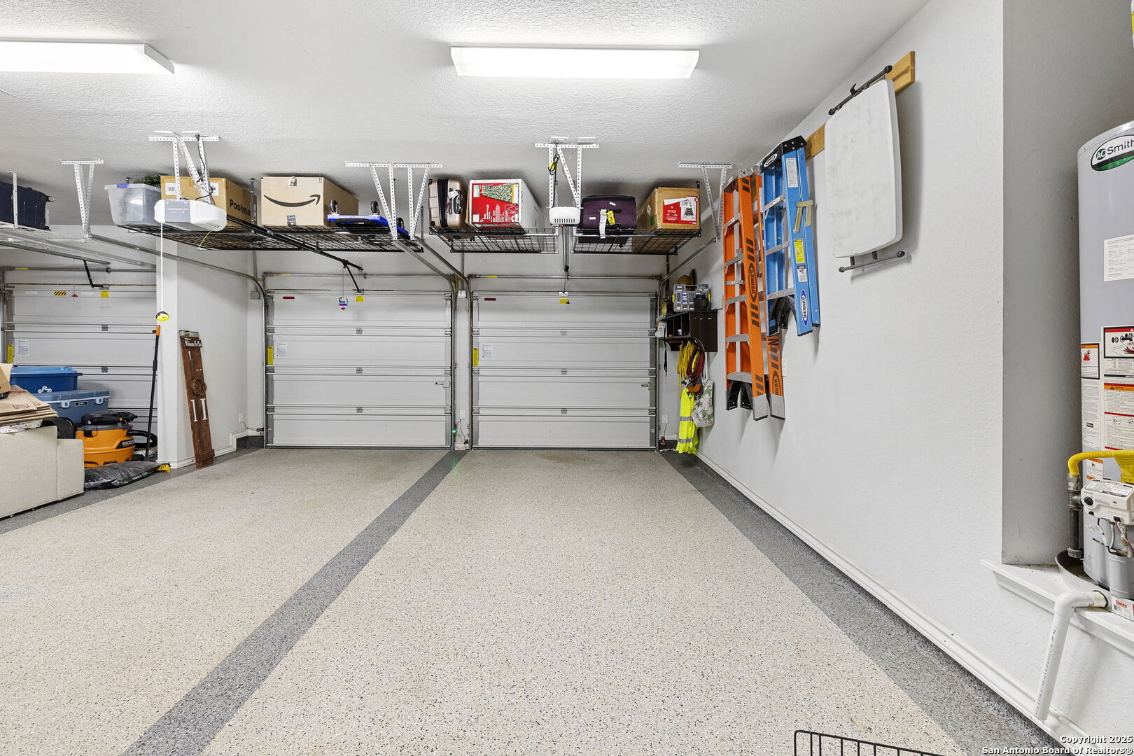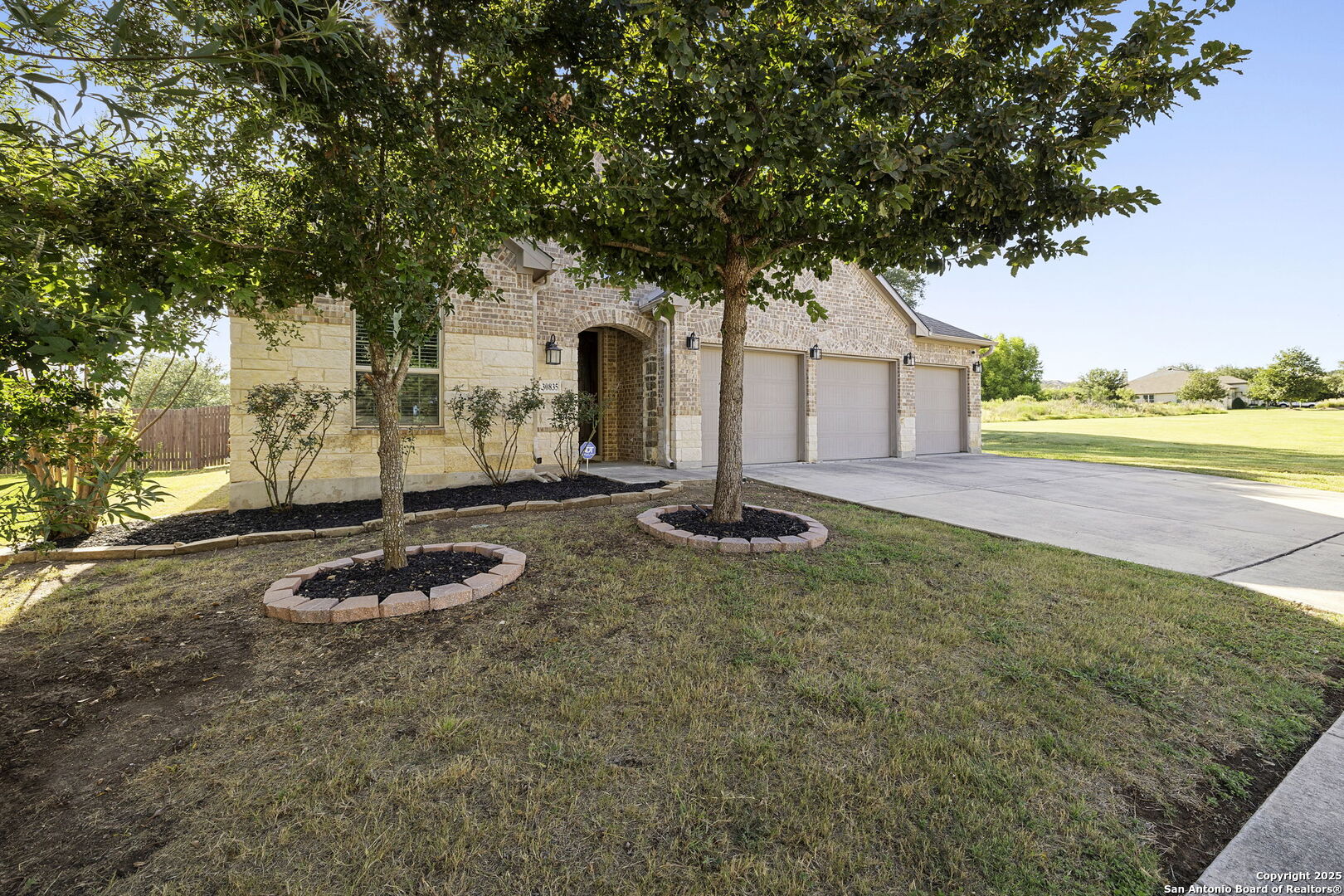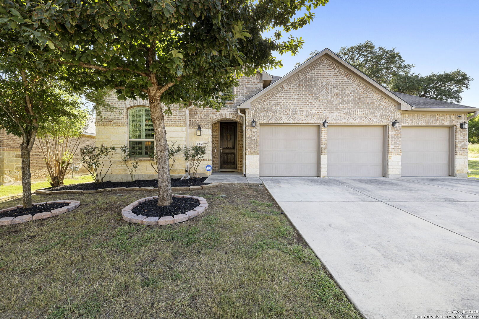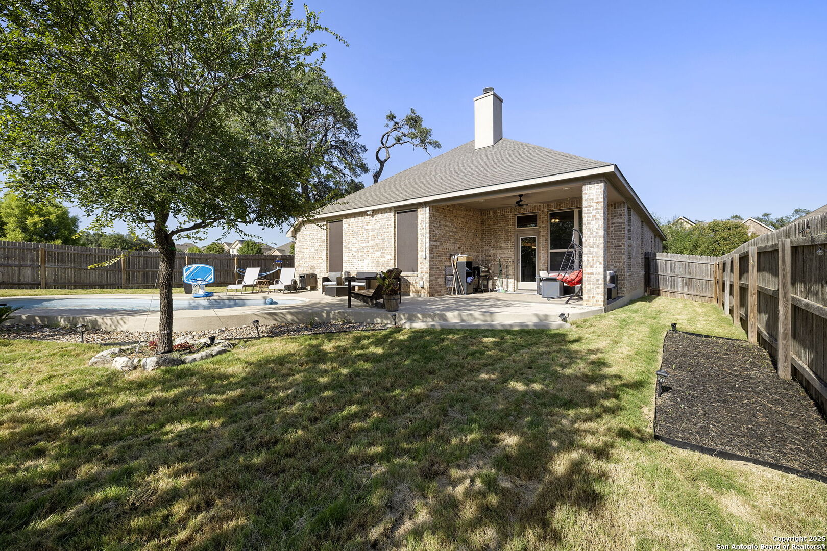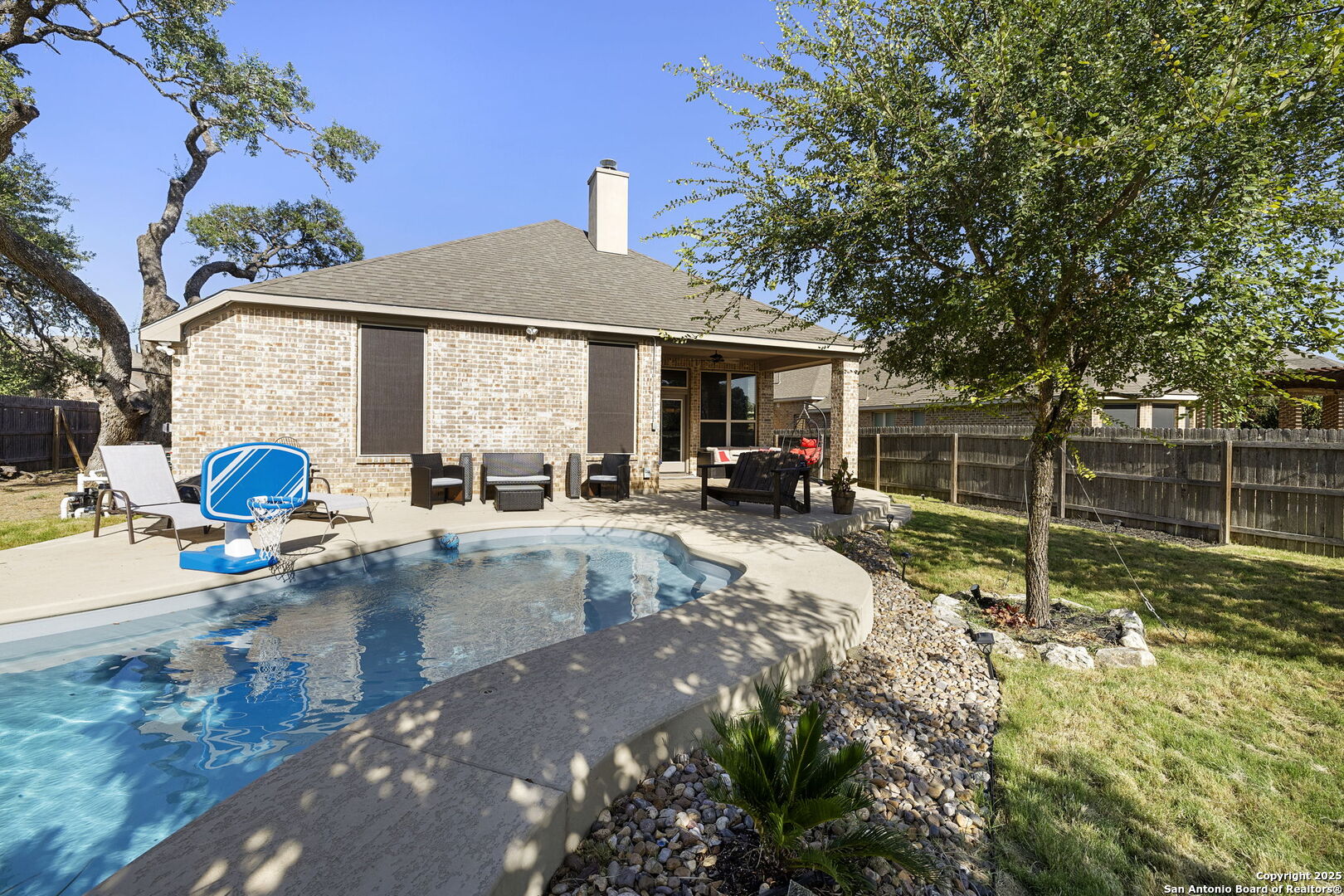 Tucked away on an oversized lot in a desirable gated section of Johnson Ranch, this beautifully maintained one-story home with soaring 12-foot ceilings throughout and 8-foot windows offers 3 bedrooms plus a dedicated office, or use it as a 4th bedroom to suit your needs. With 2.5 bathrooms and a thoughtfully designed layout, this home combines comfort, flexibility, and privacy. The backyard is a true retreat, featuring a practically brand-new in-ground pool with heater and chiller, epoxy-covered patio, lush surroundings, and greenbelt on two sides-providing rare seclusion and plenty of space to relax or entertain. Inside, enjoy spacious living areas, a well-appointed kitchen, and natural light throughout. Oversized three-car garage with epoxy floor is ready for the car enthusiasts. Beautiful walking trails behind this gorgeous property to enjoy relaxing evening strolls. Located just minutes from Hwy 281 with access to top-rated Comal ISD schools, this home offers the perfect blend of small-town charm and big-time convenience. Don't miss the opportunity to own in one of Bulverde's most sought-after neighborhoods!
