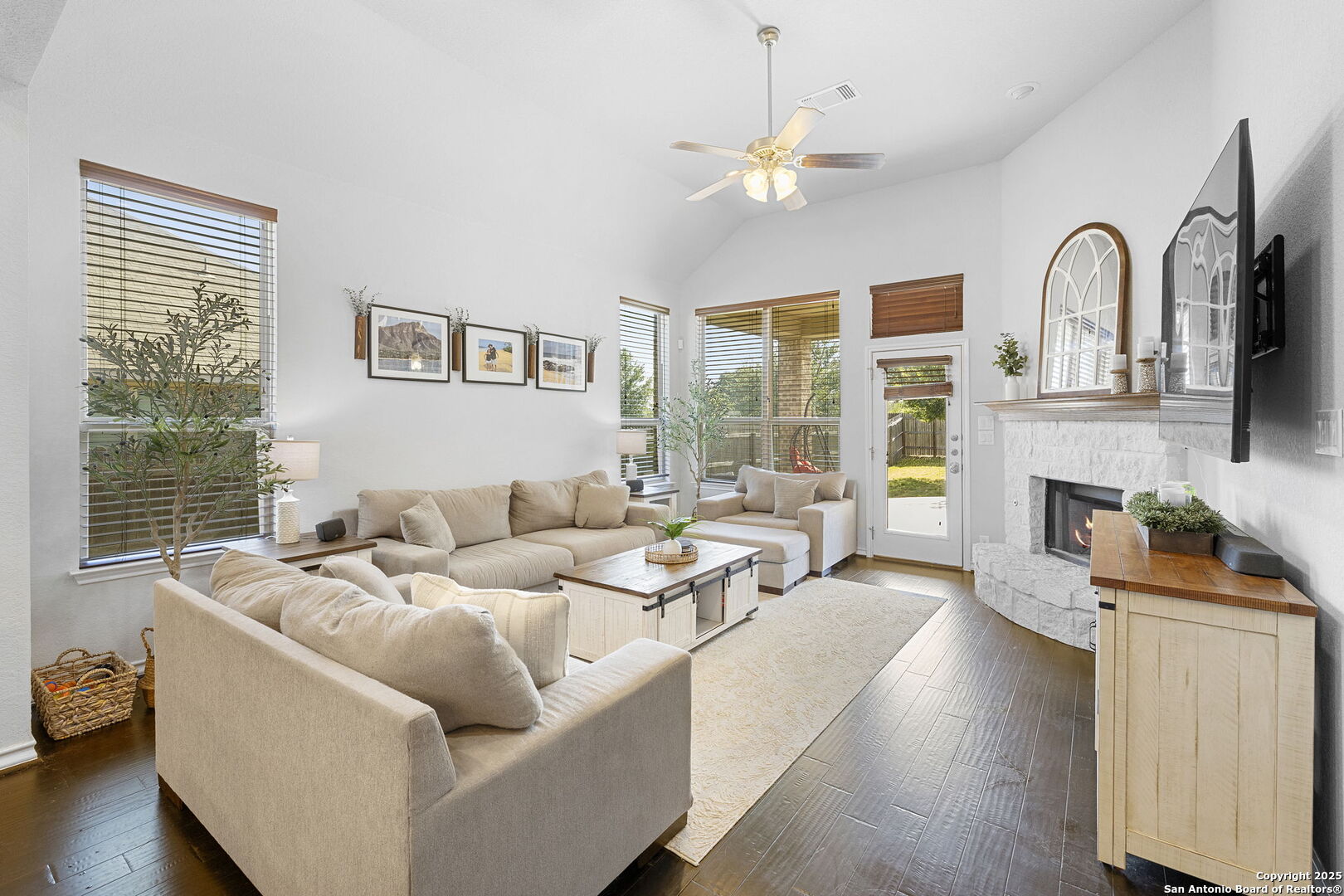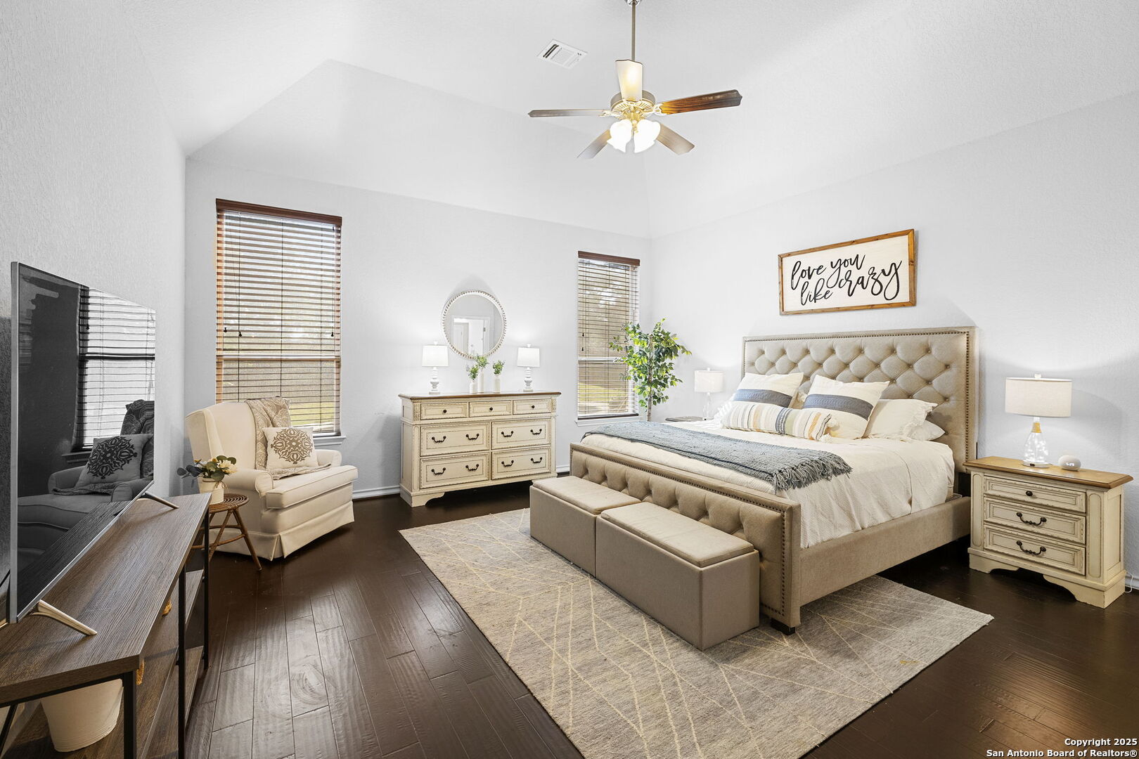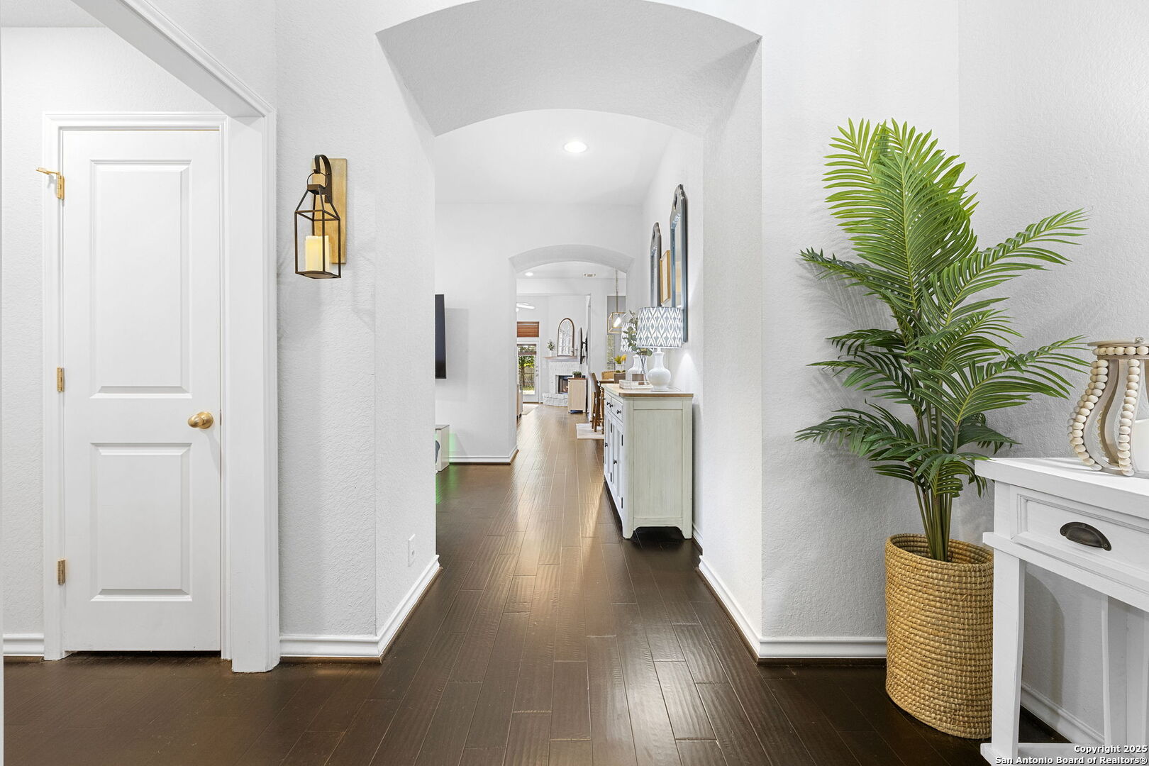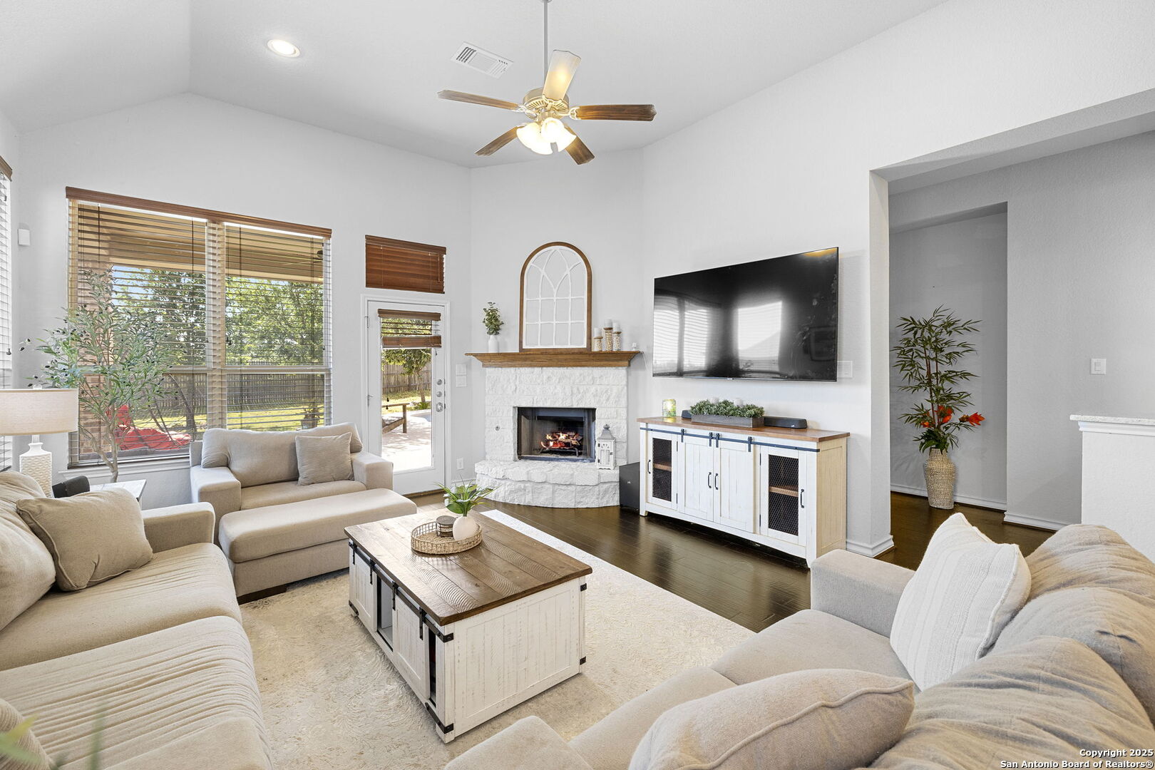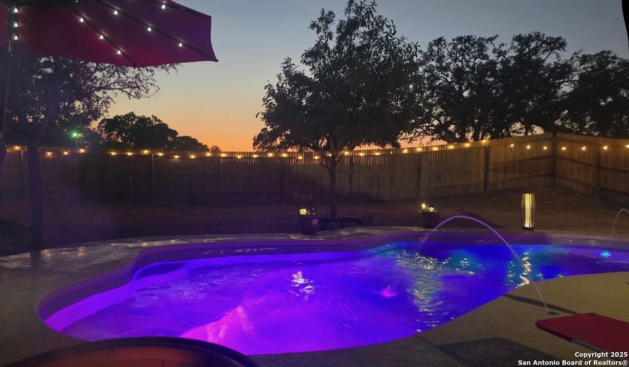 Tucked away on an oversized lot in a desirable gated section of Johnson Ranch, this beautifully maintained one-story home with soaring 12-foot ceilings throughout and 8-foot windows offers 3 bedrooms plus a dedicated office, or use it as a 4th bedroom to suit your needs. With 2.5 bathrooms and a thoughtfully designed layout, this home combines comfort, flexibility, and privacy. The backyard is a true retreat, featuring a practically brand-new in-ground pool with heater and chiller, epoxy-covered patio, lush surroundings, and greenbelt on two sides-providing rare seclusion and plenty of space to relax or entertain. Inside, enjoy spacious living areas, a well-appointed kitchen, and natural light throughout. Oversized three-car garage with epoxy floor is ready for the car enthusiasts. Beautiful walking trails behind this gorgeous property to enjoy relaxing evening strolls. Located just minutes from Hwy 281 with access to top-rated Comal ISD schools, this home offers the perfect blend of small-town charm and big-time convenience. Don't miss the opportunity to own in one of Bulverde's most sought-after neighborhoods!