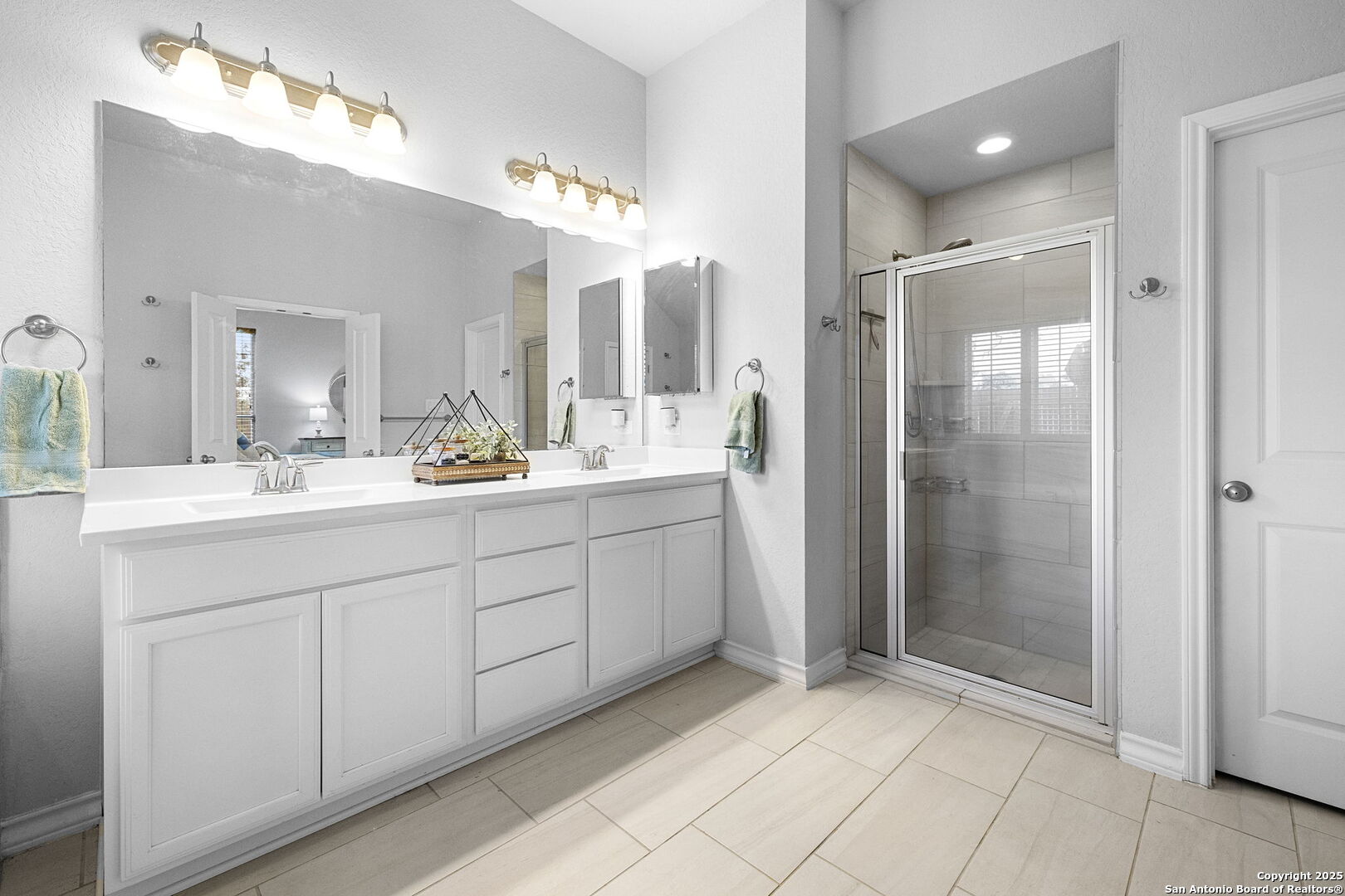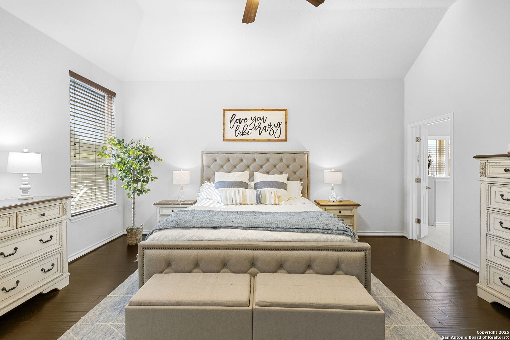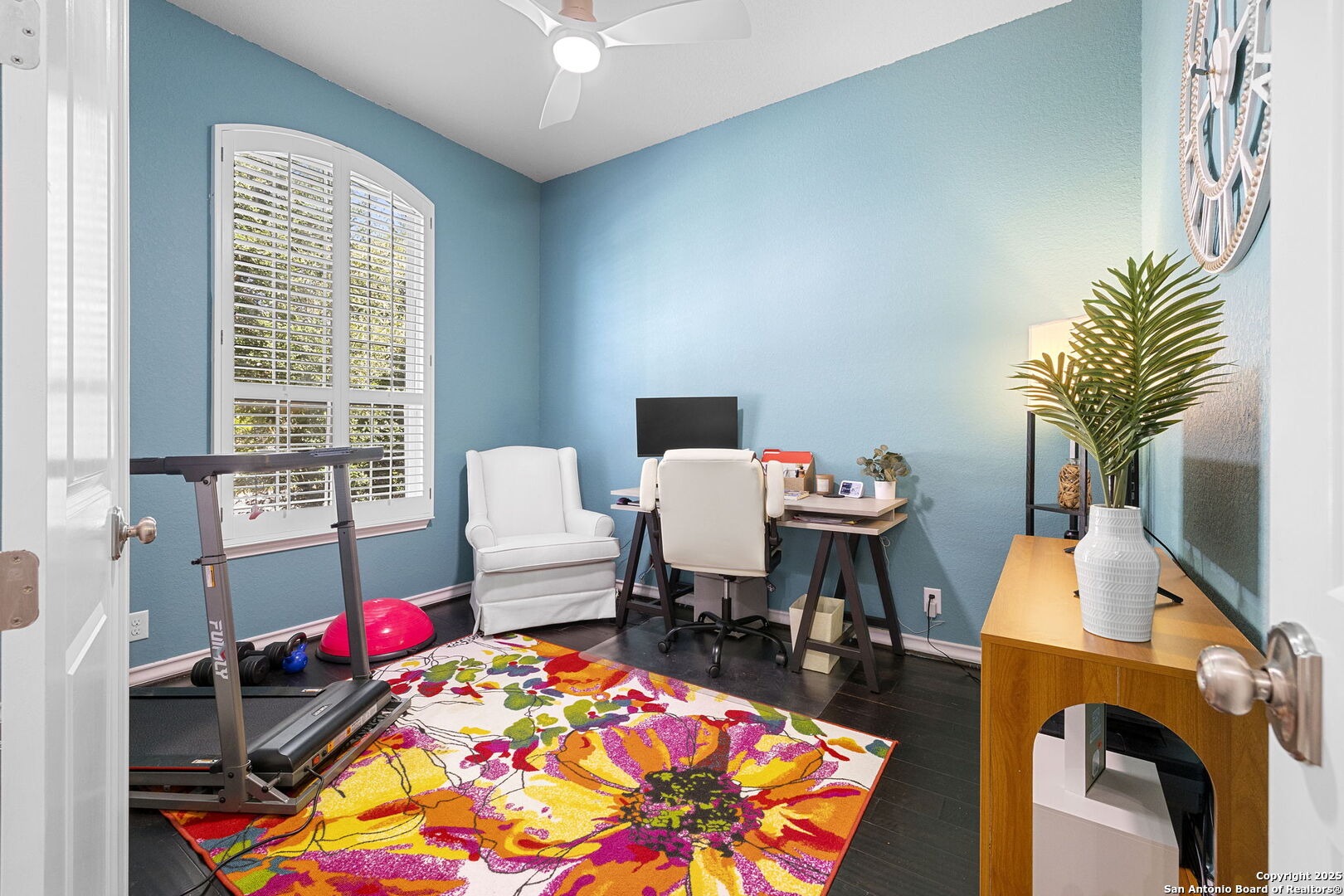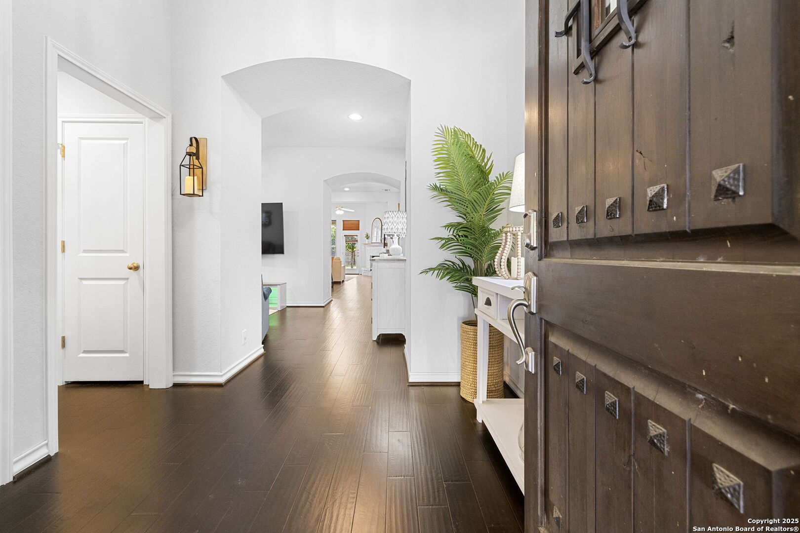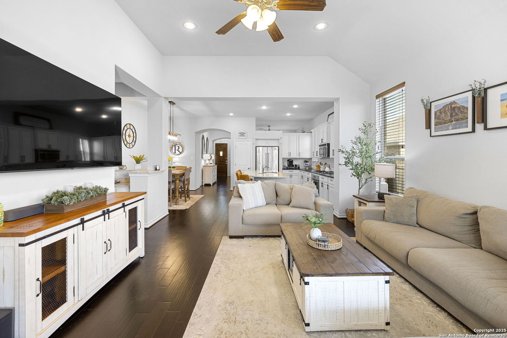 Tucked away on an oversized lot in a desirable gated section of Johnson Ranch, this beautifully maintained one-story home with soaring 12-foot ceilings throughout and 8-foot windows offers 3 bedrooms plus a dedicated office, or use it as a 4th bedroom to suit your needs. With 2.5 bathrooms and a thoughtfully designed layout, this home combines comfort, flexibility, and privacy. The backyard is a true retreat, featuring a practically brand-new in-ground pool with heater and chiller, epoxy-covered patio, lush surroundings, and greenbelt on two sides-providing rare seclusion and plenty of space to relax or entertain. Inside, enjoy spacious living areas, a well-appointed kitchen, and natural light throughout. Oversized three-car garage with epoxy floor is ready for the car enthusiasts. Beautiful walking trails behind this gorgeous property to enjoy relaxing evening strolls. Located just minutes from Hwy 281 with access to top-rated Comal ISD schools, this home offers the perfect blend of small-town charm and big-time convenience. Don't miss the opportunity to own in one of Bulverde's most sought-after neighborhoods!