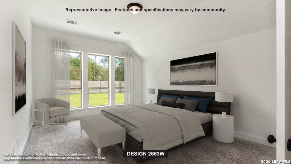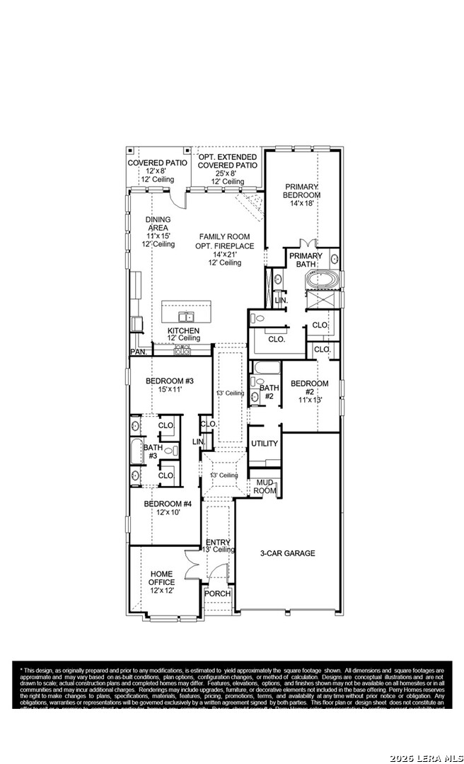 Welcoming porch extends to entry with home office at entry. Open family room with 12-foot ceiling, a wood mantel fireplace, and a large wall of windows. Dining area offers generous natural lighting with wall of windows. Island kitchen with built-in seating space, a 5-burner gas cooktop, and a corner walk-in pantry. Private primary suite features bedroom, double door entry to primary bathroom, dual vanities, garden tub, separate glass enclosed shower and two walk-in closets. Secondary bedrooms with walk-in closets, a utility room and a Hollywood bathroom completes this spacious design. Extended covered backyard patio. Mud room just off the three-car garage.