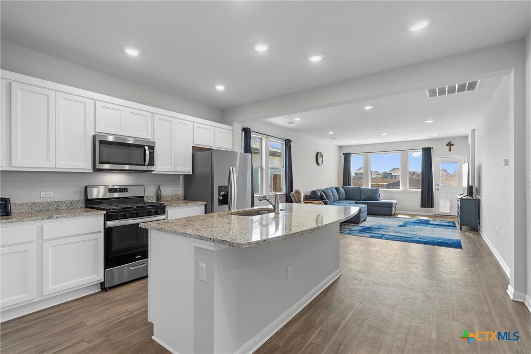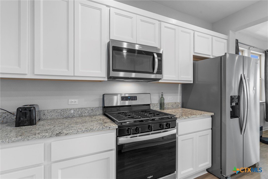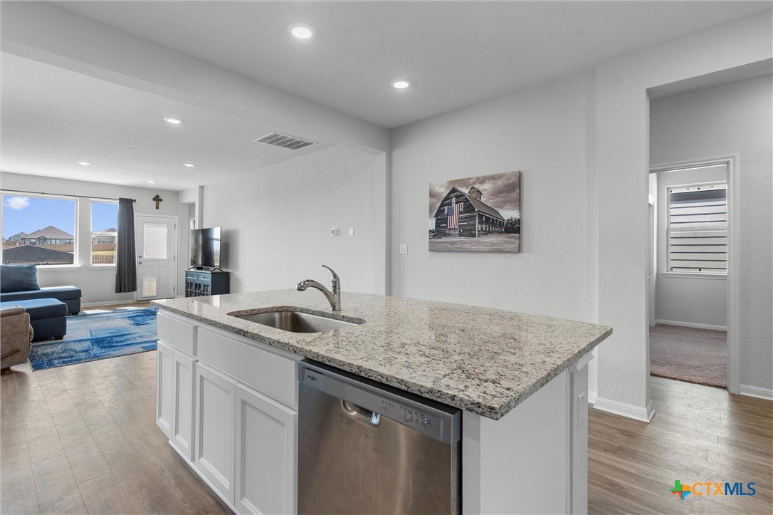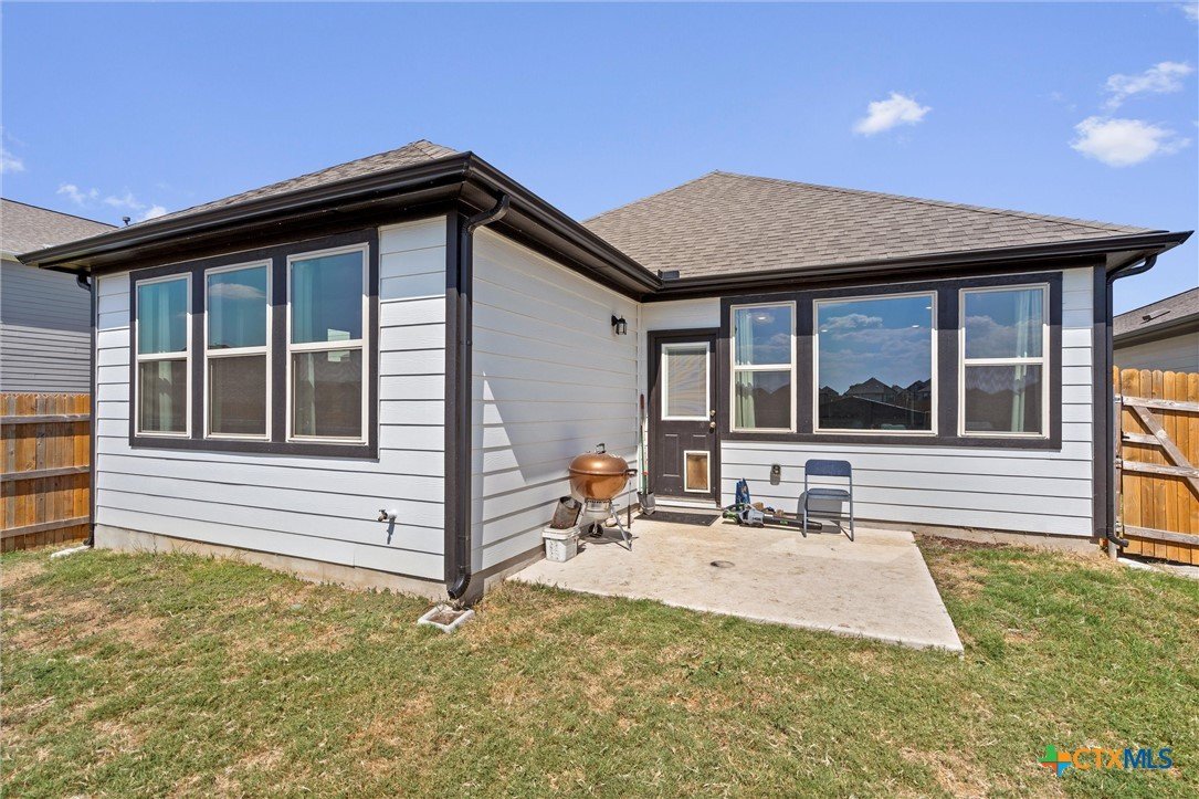 Welcome to this beautifully cared-for residence in the highly sought-after Trinity Ranch community. Backing to a serene greenbelt, this home offers privacy, modern finishes, and an inviting open floor plan designed for both everyday living and entertaining. Step inside to discover luxury vinyl plank flooring flowing through the main living areas, complemented by expansive windows that fill the home with natural light. The spacious living area showcases views of the backyard and seamlessly connects to the kitchen. Here you’ll enjoy granite countertops, an island with bar seating, white cabinetry with pullout drawers, stainless steel appliances, and a pantry—the perfect blend of style and function. A flex space at the front of the home provides the ideal spot for a home office or reading nook. The private primary suite features an ensuite bath with dual vanity, walk-in shower, and generous walk-in closet. Two additional bedrooms, each with its own closet, share a full bath, offering comfort and flexibility for family, guests, or hobbies. Outdoors, the fenced backyard with no rear neighbors invites relaxation, complete with a patio overlooking the greenbelt. Residents of Trinity Ranch enjoy a low HOA fee of only $50 per year while having access to exceptional amenities, including walking trails, a pool and splash pad, and sports courts. The location couldn’t be more convenient—walking distance to the new elementary school, minutes from dining, shopping, recreation, and everyday essentials such as HEB and Walmart, with easy access to Hwy 290 and TX 95 for effortless commuting. This home offers the perfect combination of comfort, community, and convenience.