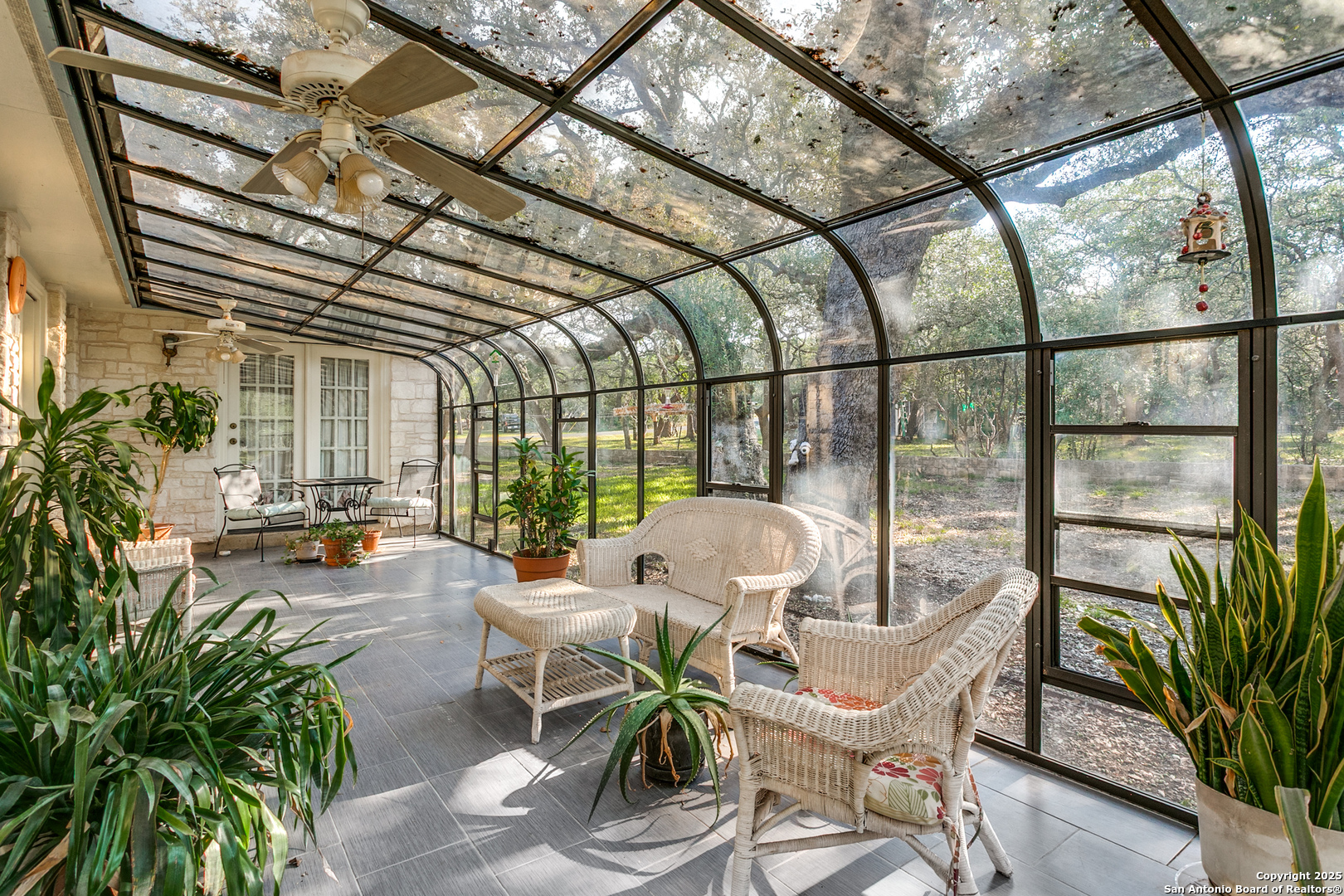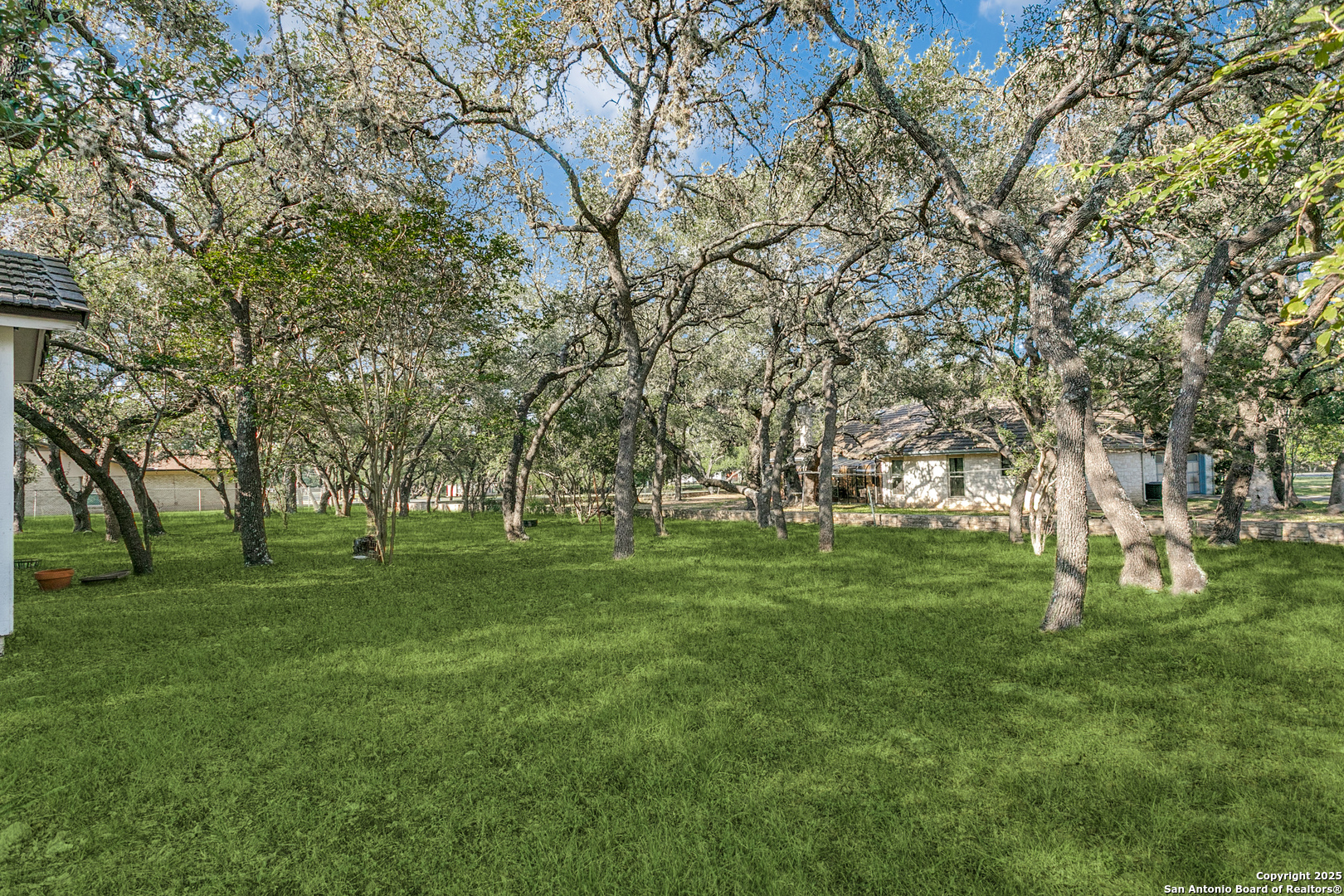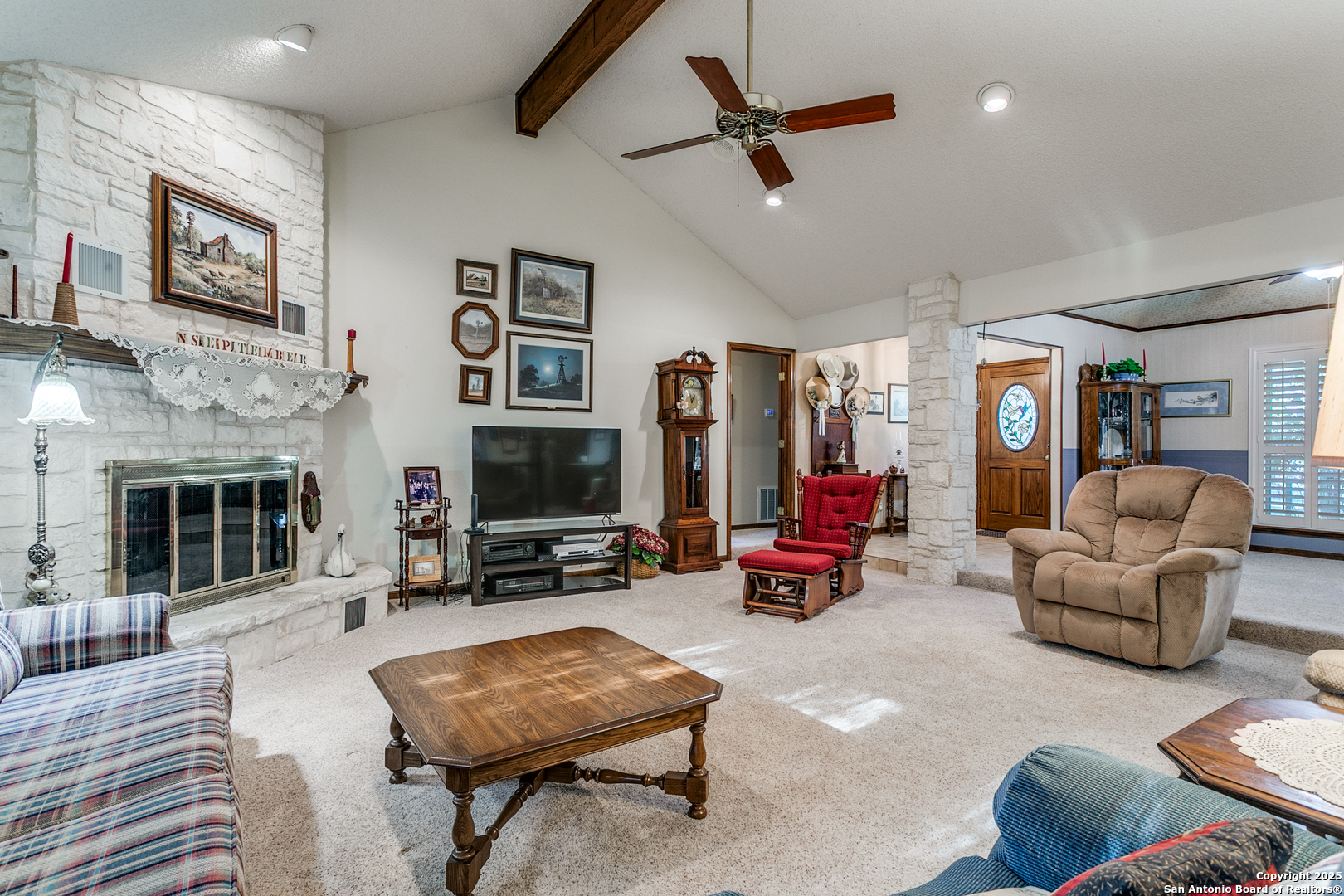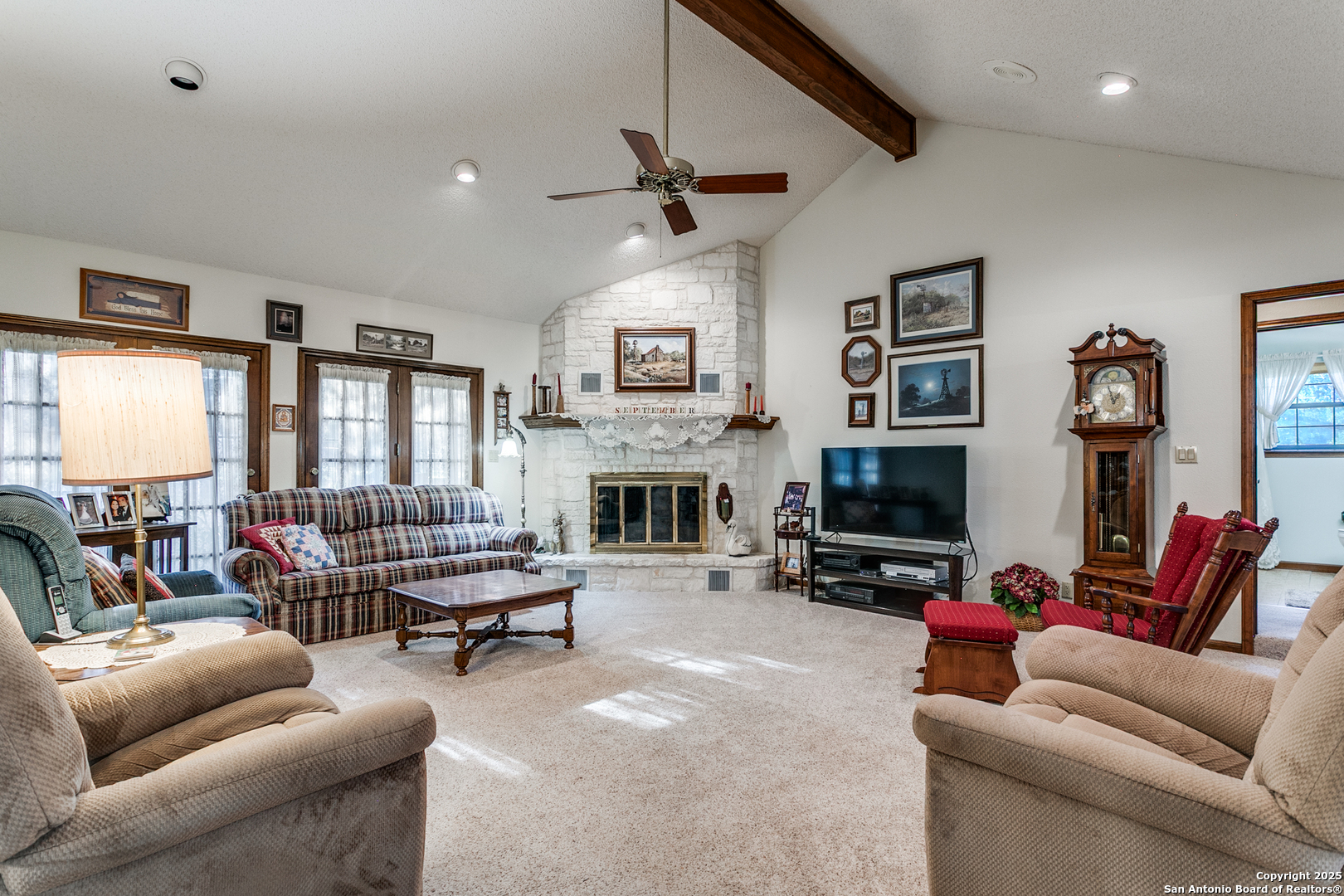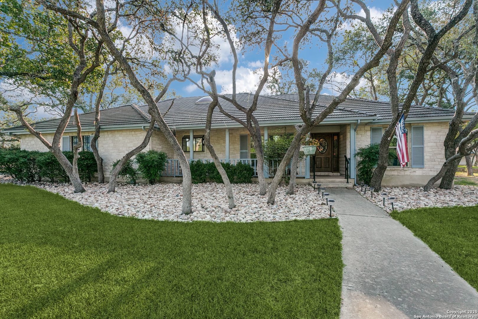 Nestled on a picturesque corner lot with winding mature oak trees, this classic stone one-story offers timeless curb appeal and peaceful surroundings. Featuring 3 bedrooms, 2 baths, plus a dedicated office, the home boasts a thoughtful split bedroom floor plan for privacy and functionality. This home has been lovingly maintained with newer HVAC units, windows, tile, carpet, cooktop, and water softener. The spacious living area showcases a vaulted ceiling and a beautiful stone fireplace. A large kitchen with island provides abundant cabinet storage and plenty of workspace, while the beautiful 330 sq ft atrium offers the perfect spot to relax and take in views of nature. Additional highlights include a 420 ft well for watering the yard and an epoxy-coated garage floor. Homes like this rarely come available in Oak Village North - don't miss your chance to make it yours.