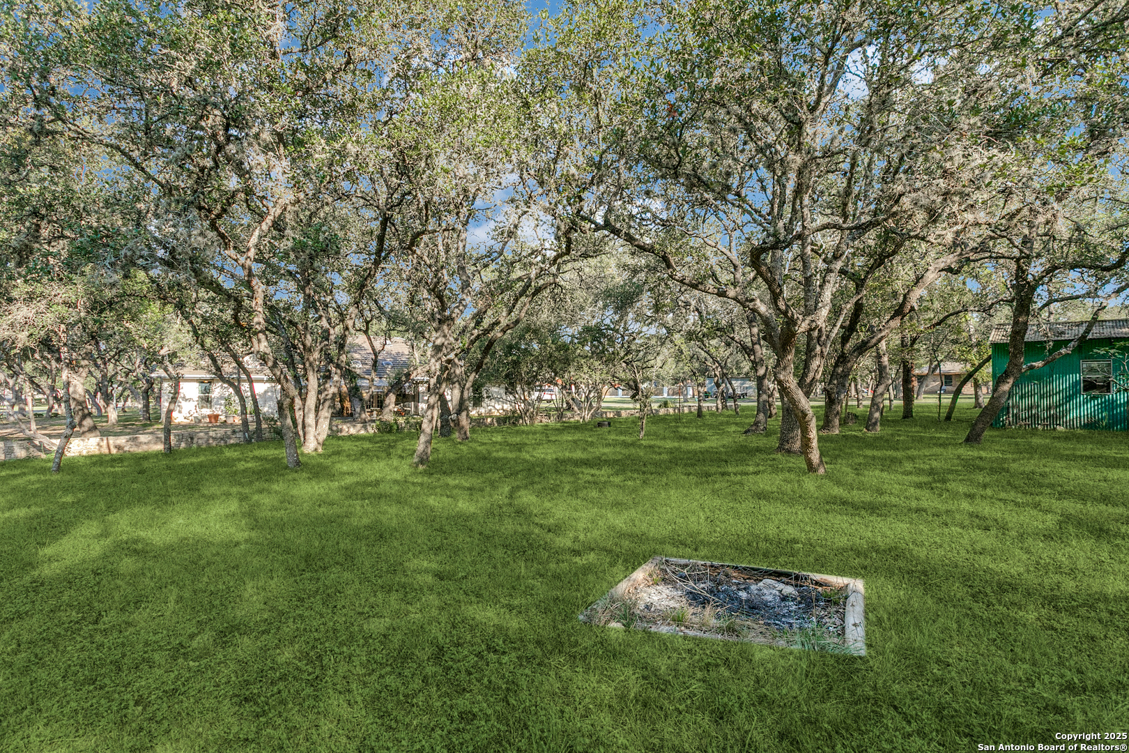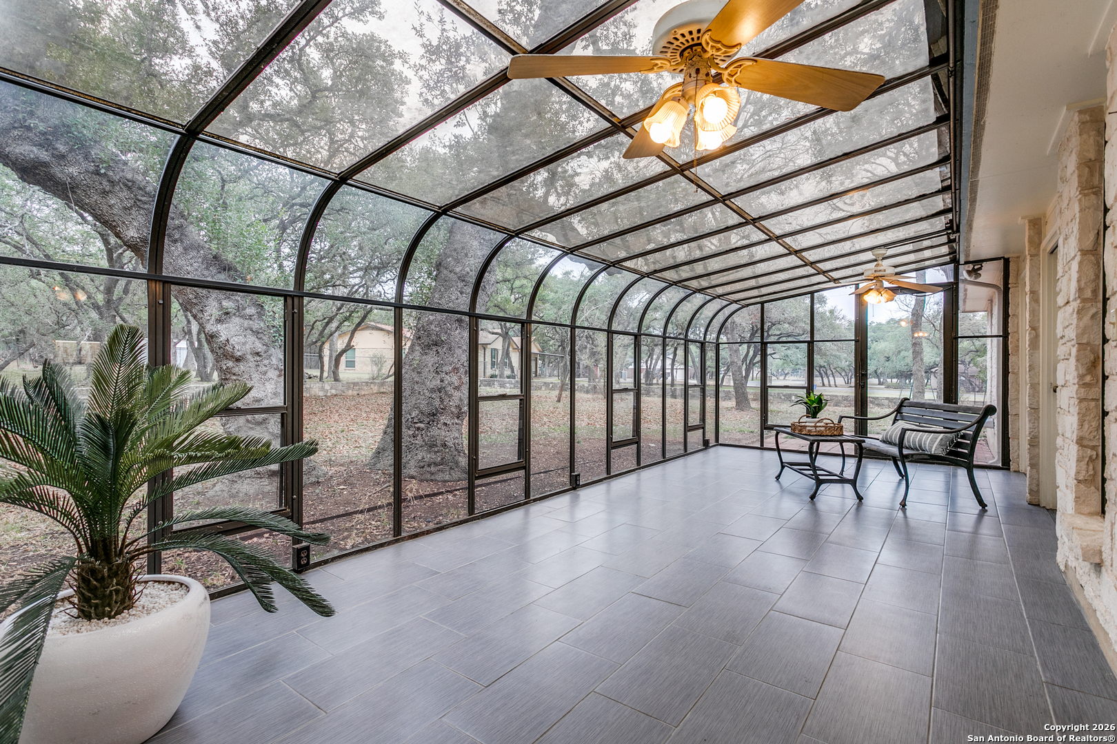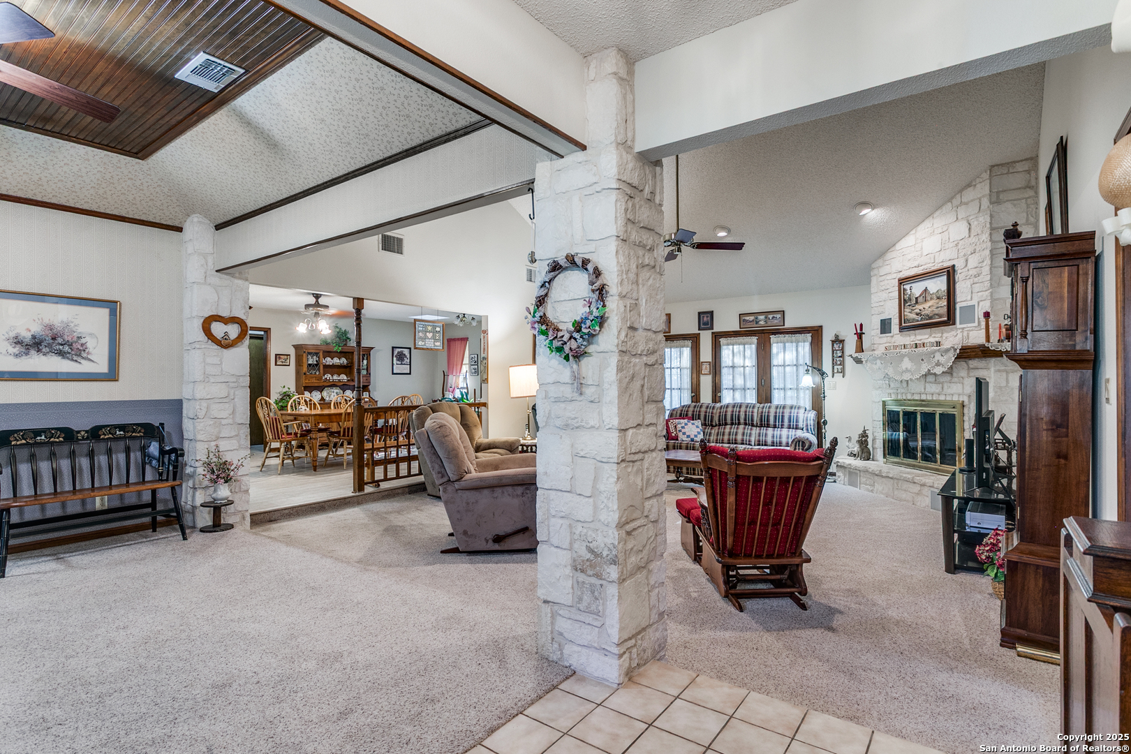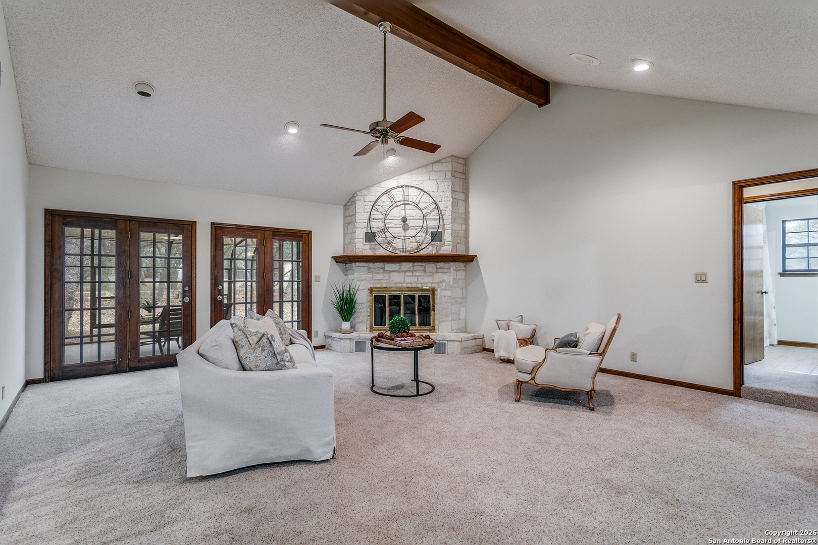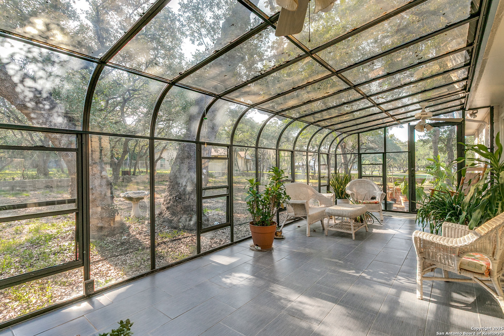 Nestled on a picturesque corner lot with winding mature oak trees, this classic stone one-story offers timeless curb appeal and peaceful surroundings. Featuring 3 bedrooms, 2 baths, plus a dedicated office, the home boasts a thoughtful split bedroom floor plan for privacy and functionality. This home has been lovingly maintained with newer HVAC units, windows, tile, carpet, cooktop, and water softener. The spacious living area showcases a vaulted ceiling and a beautiful stone fireplace. A large kitchen with island provides abundant cabinet storage and plenty of workspace, while the beautiful 330 sq ft atrium offers the perfect spot to relax and take in views of nature. Additional highlights include a 420 ft well for watering the yard and an epoxy-coated garage floor. Homes like this rarely come available in Oak Village North - don't miss your chance to make it yours.