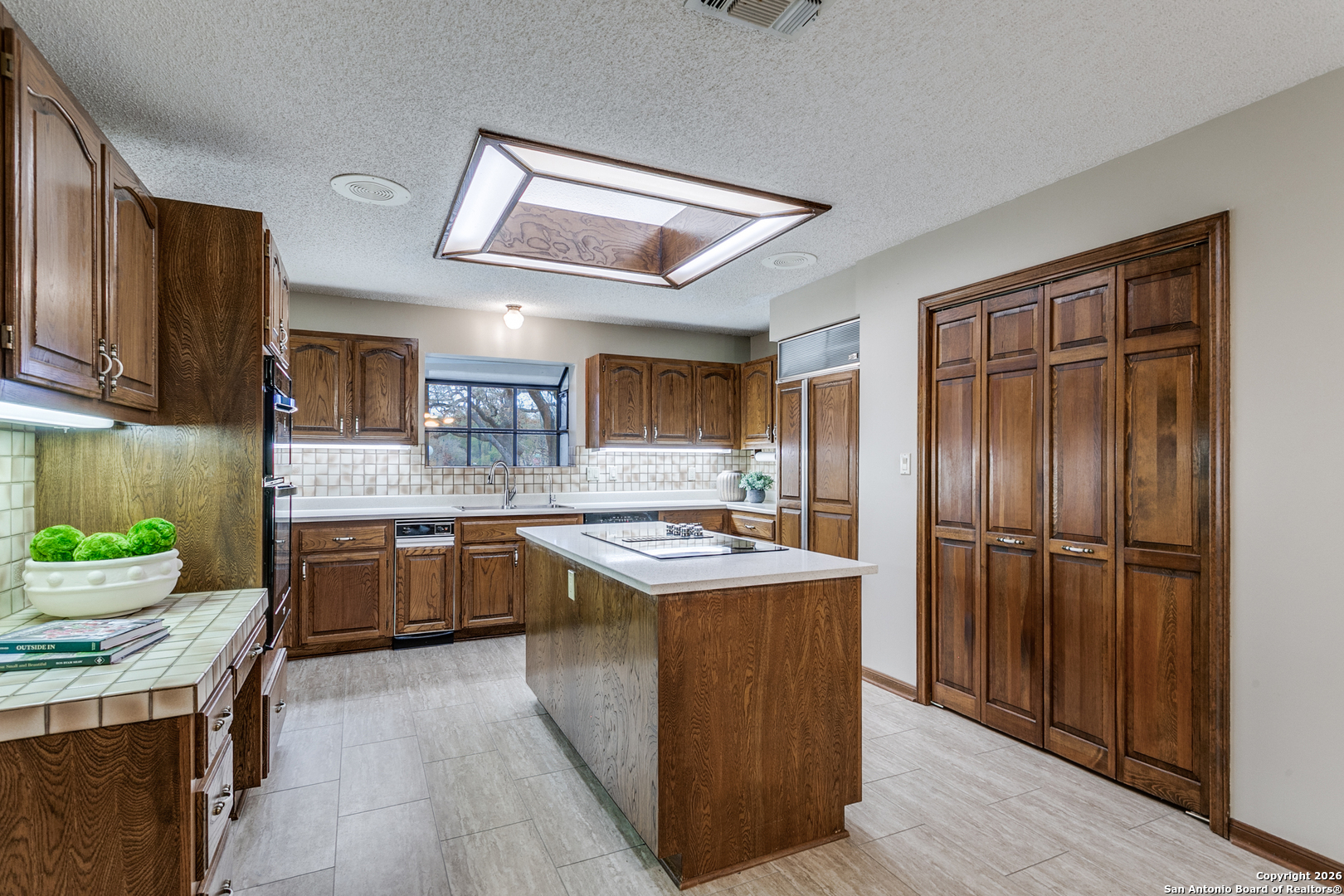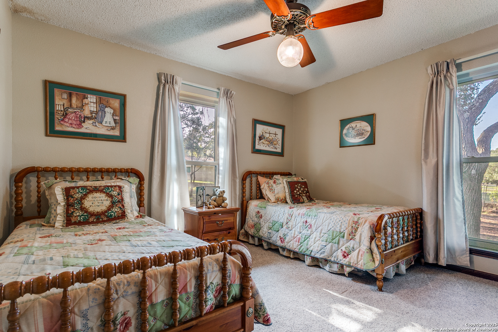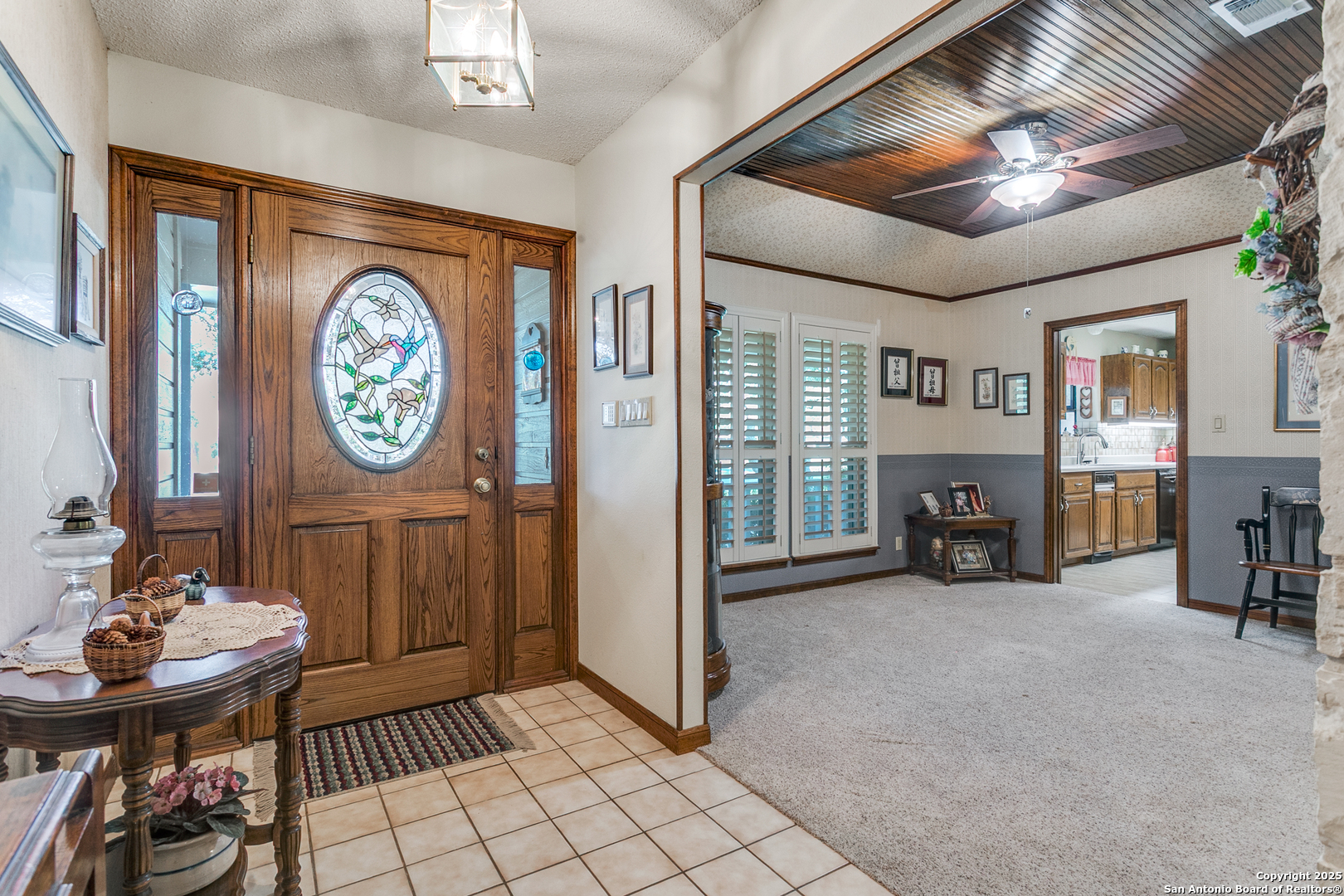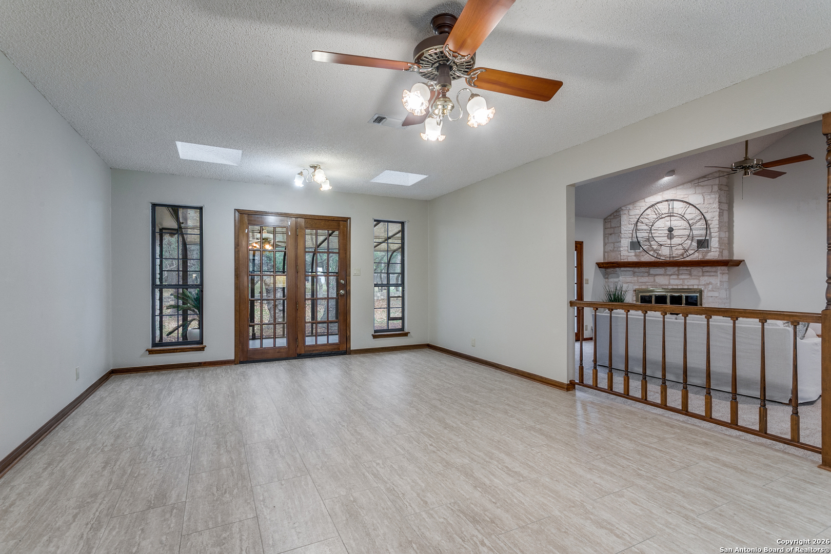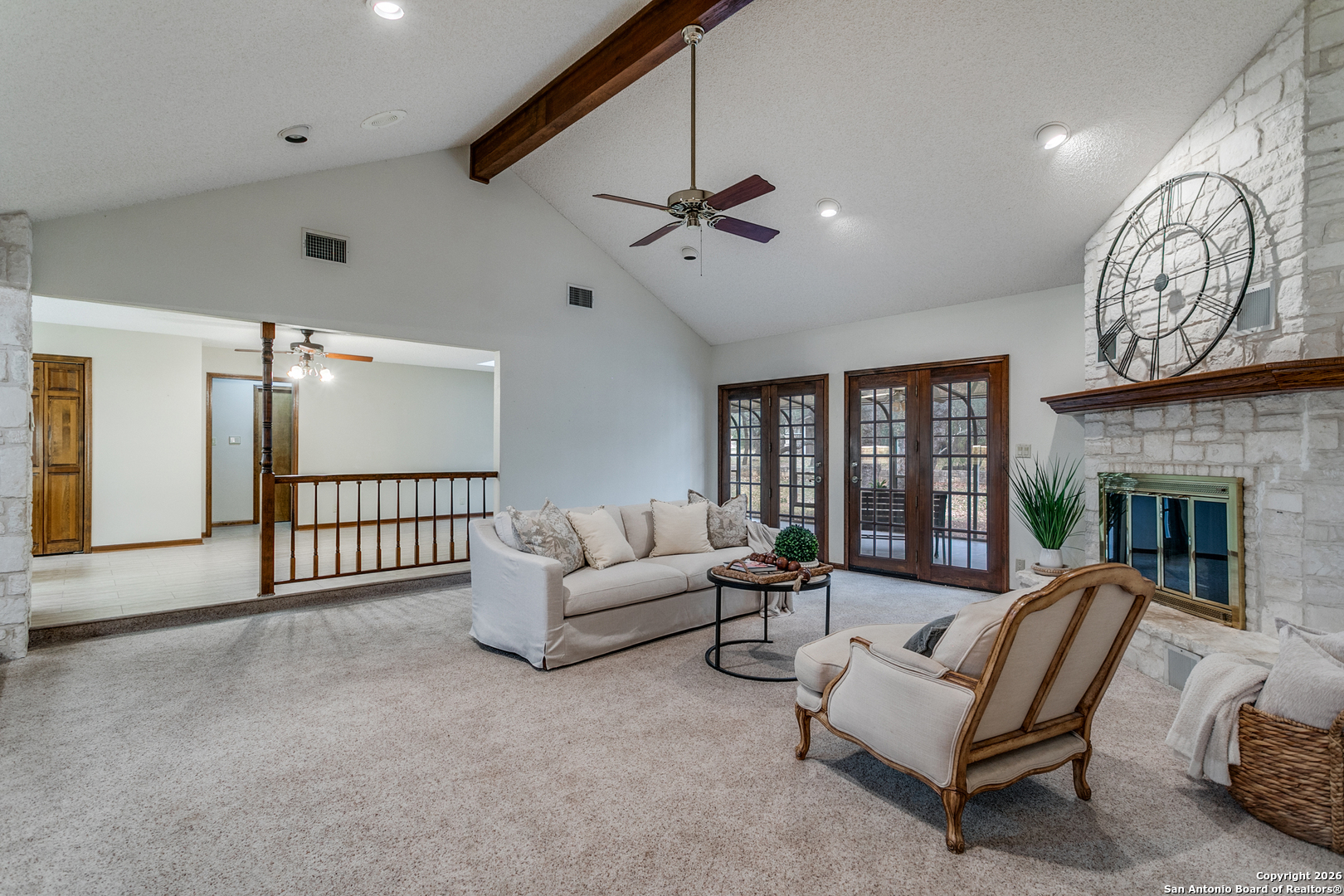 Nestled on a picturesque corner lot with winding mature oak trees, this classic stone one-story offers timeless curb appeal and peaceful surroundings. Featuring 3 bedrooms, 2 baths, plus a dedicated office, the home boasts a thoughtful split bedroom floor plan for privacy and functionality. This home has been lovingly maintained with newer HVAC units, windows, tile, carpet, cooktop, and water softener. The spacious living area showcases a vaulted ceiling and a beautiful stone fireplace. A large kitchen with island provides abundant cabinet storage and plenty of workspace, while the beautiful 330 sq ft atrium offers the perfect spot to relax and take in views of nature. Additional highlights include a 420 ft well for watering the yard and an epoxy-coated garage floor. Homes like this rarely come available in Oak Village North - don't miss your chance to make it yours.