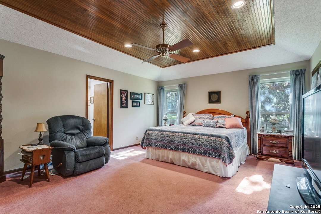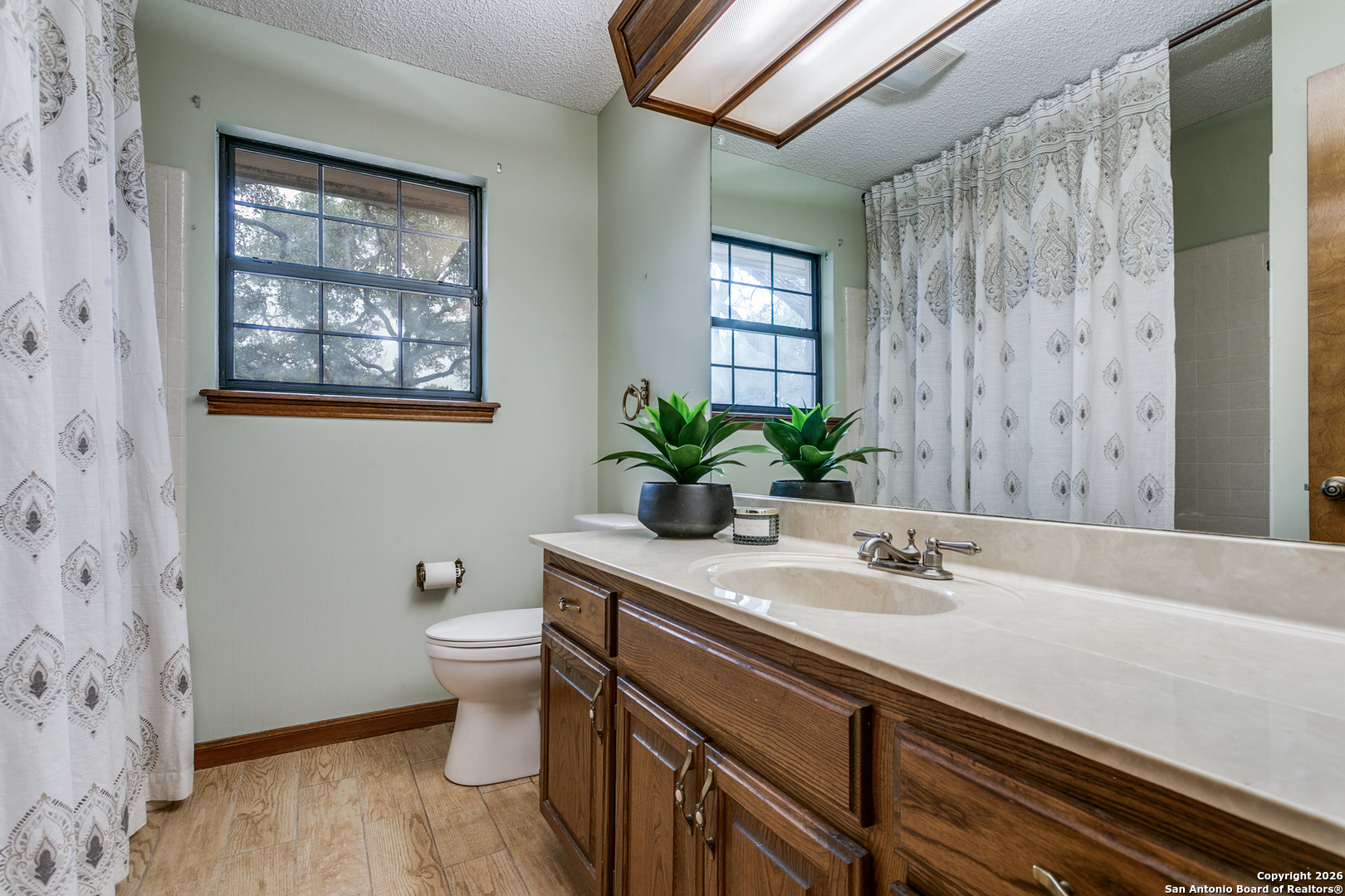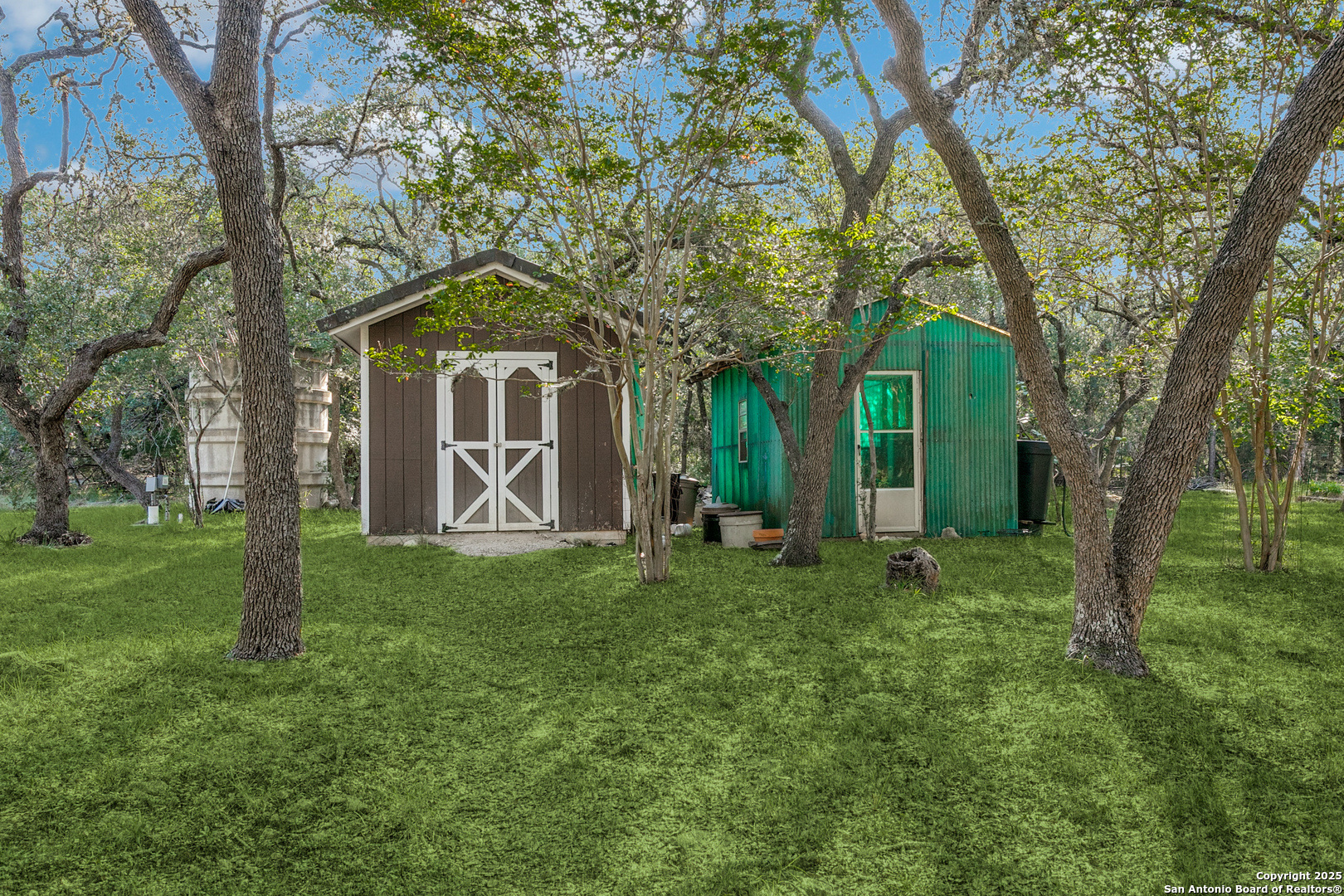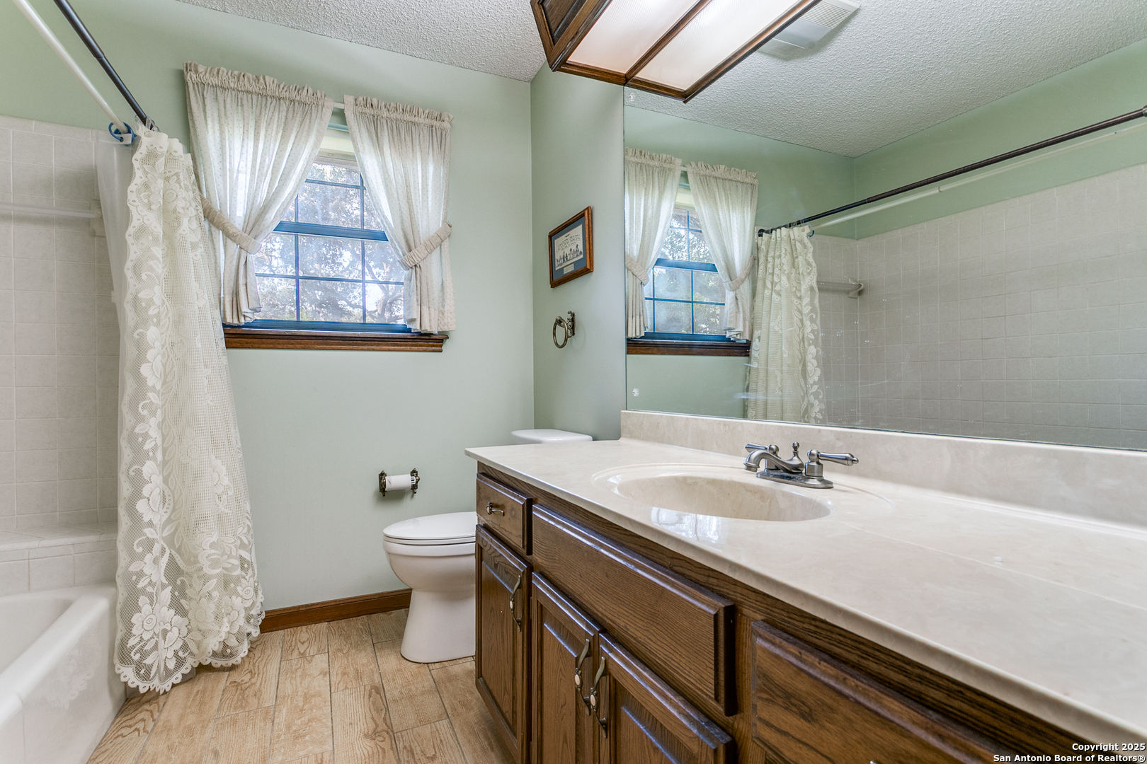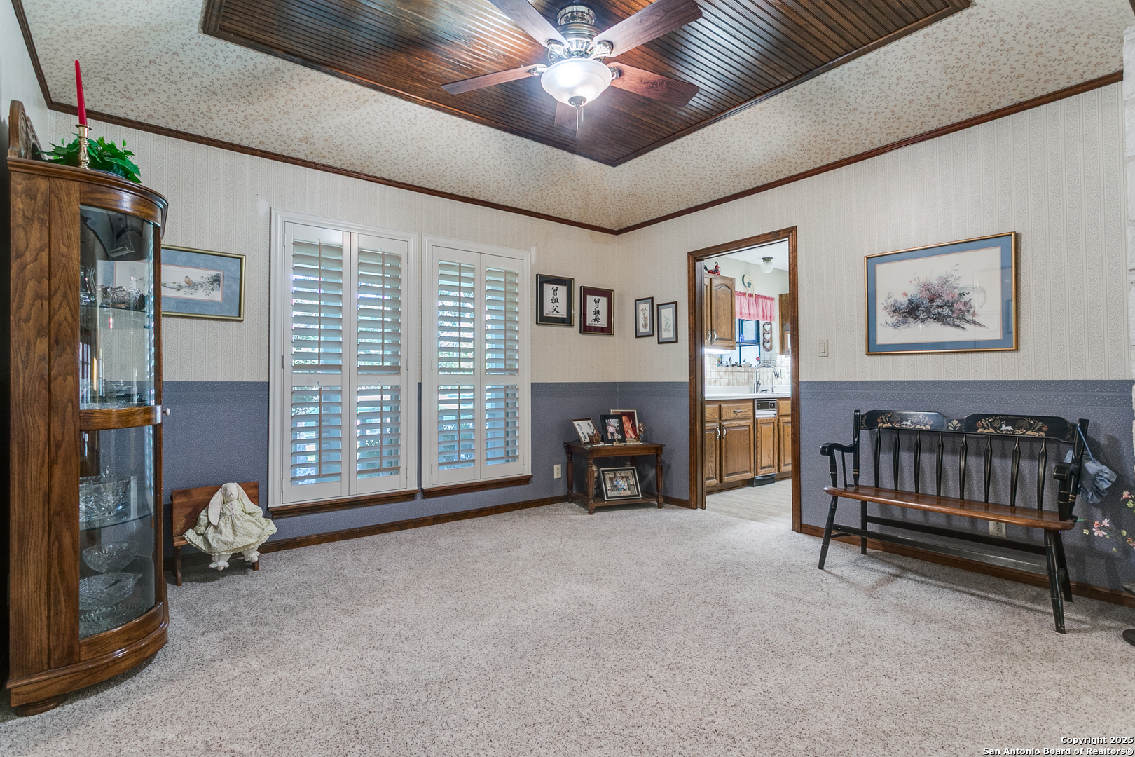 Nestled on a picturesque corner lot with winding mature oak trees, this classic stone one-story offers timeless curb appeal and peaceful surroundings. Featuring 3 bedrooms, 2 baths, plus a dedicated office, the home boasts a thoughtful split bedroom floor plan for privacy and functionality. This home has been lovingly maintained with newer HVAC units, windows, tile, carpet, cooktop, and water softener. The spacious living area showcases a vaulted ceiling and a beautiful stone fireplace. A large kitchen with island provides abundant cabinet storage and plenty of workspace, while the beautiful 330 sq ft atrium offers the perfect spot to relax and take in views of nature. Additional highlights include a 420 ft well for watering the yard and an epoxy-coated garage floor. Homes like this rarely come available in Oak Village North - don't miss your chance to make it yours.