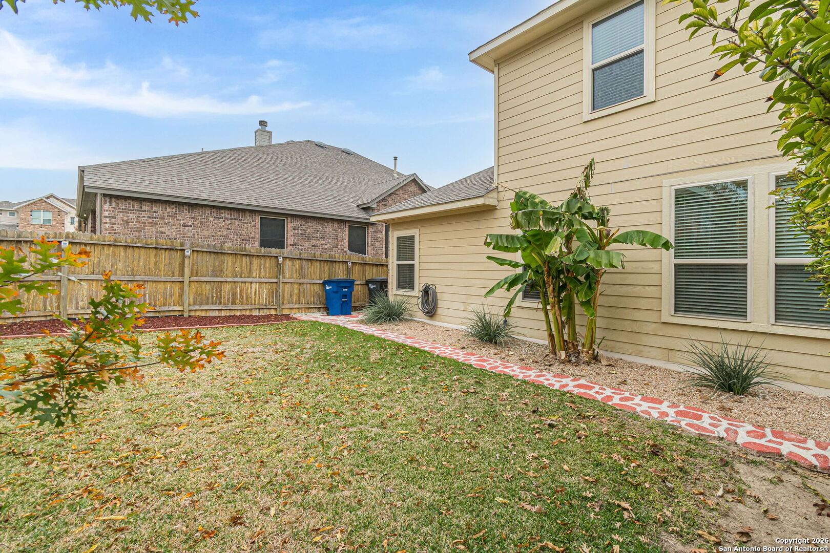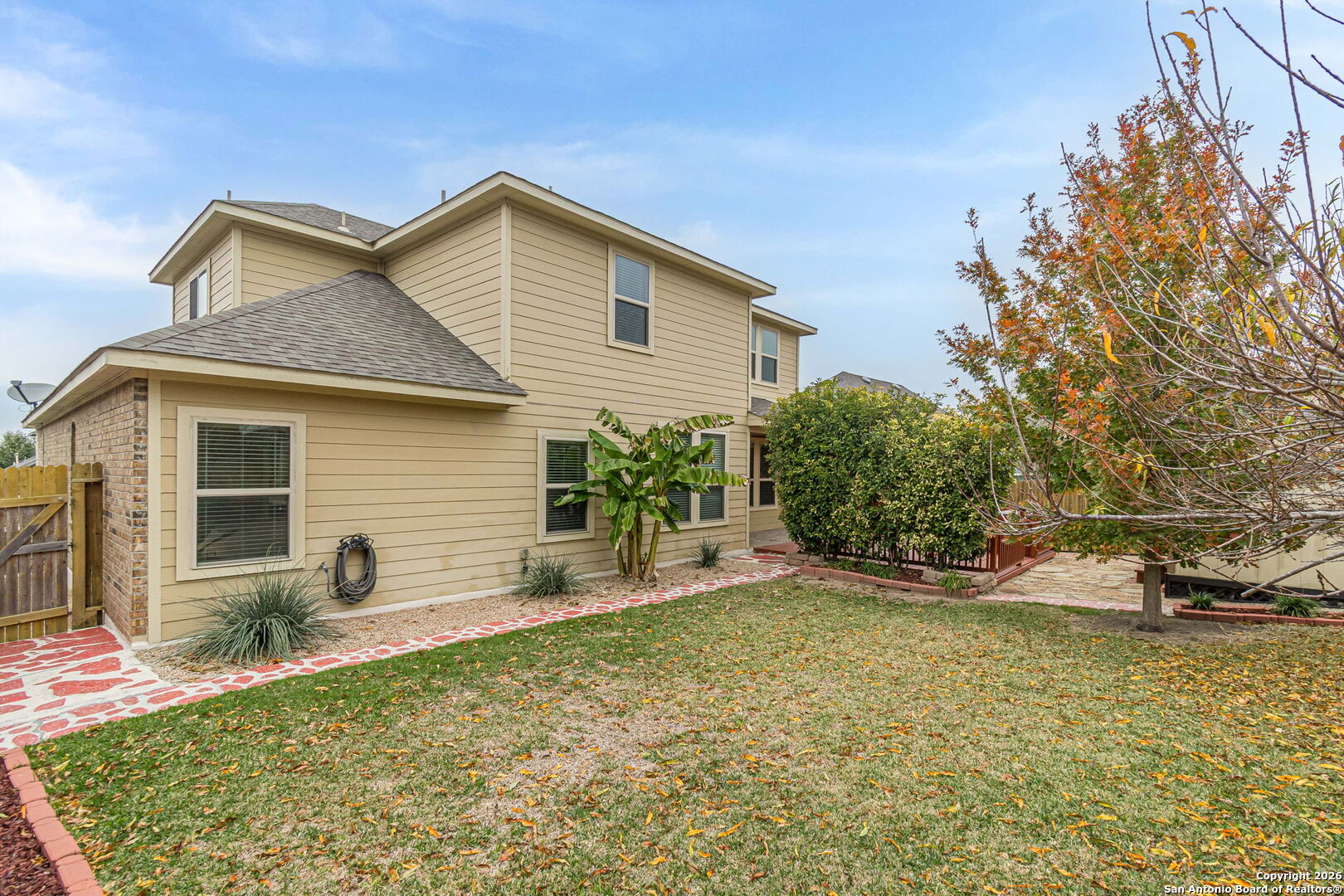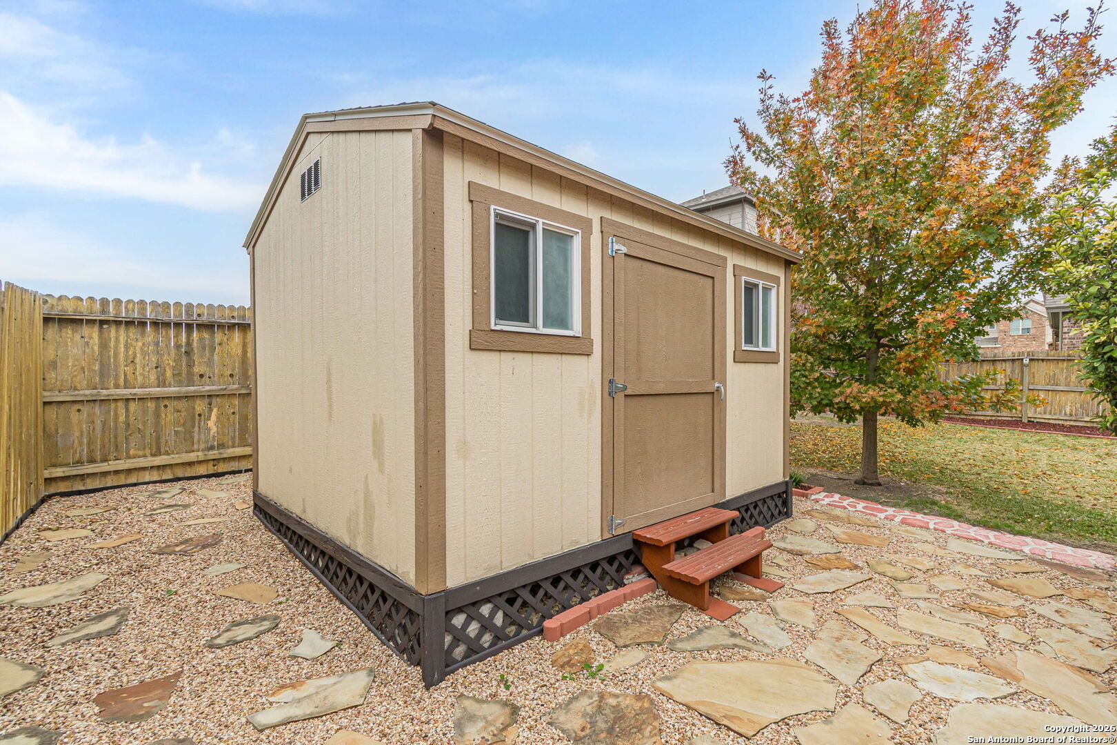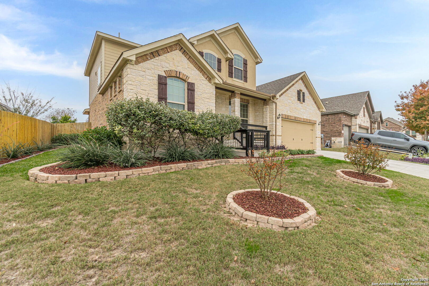 This stunning 4-bedroom, 3.5-bath home offers a flexible layout featuring a private office, formal dining room, and an upstairs game room with hardwood floors. A guest suite with its own full bath provides ideal privacy for visitors or multi-generational living. Immaculately maintained-with no shoes ever worn in the home-the pride of ownership is evident throughout. Hardwood floors span the main living areas, leading into a luxury kitchen equipped with granite countertops, a gas cooktop, double ovens, and a built-in microwave, perfect for both everyday living and entertaining. Step outside to a backyard with a storage building/workshop, adding extra functionality. Garage features epoxied floors. Enjoy a low tax rate of 1.79, excellent nearby schools, and Highland Grove neighborhood amenities including a pool, playground, and walking trails-all with quick access to I-35.