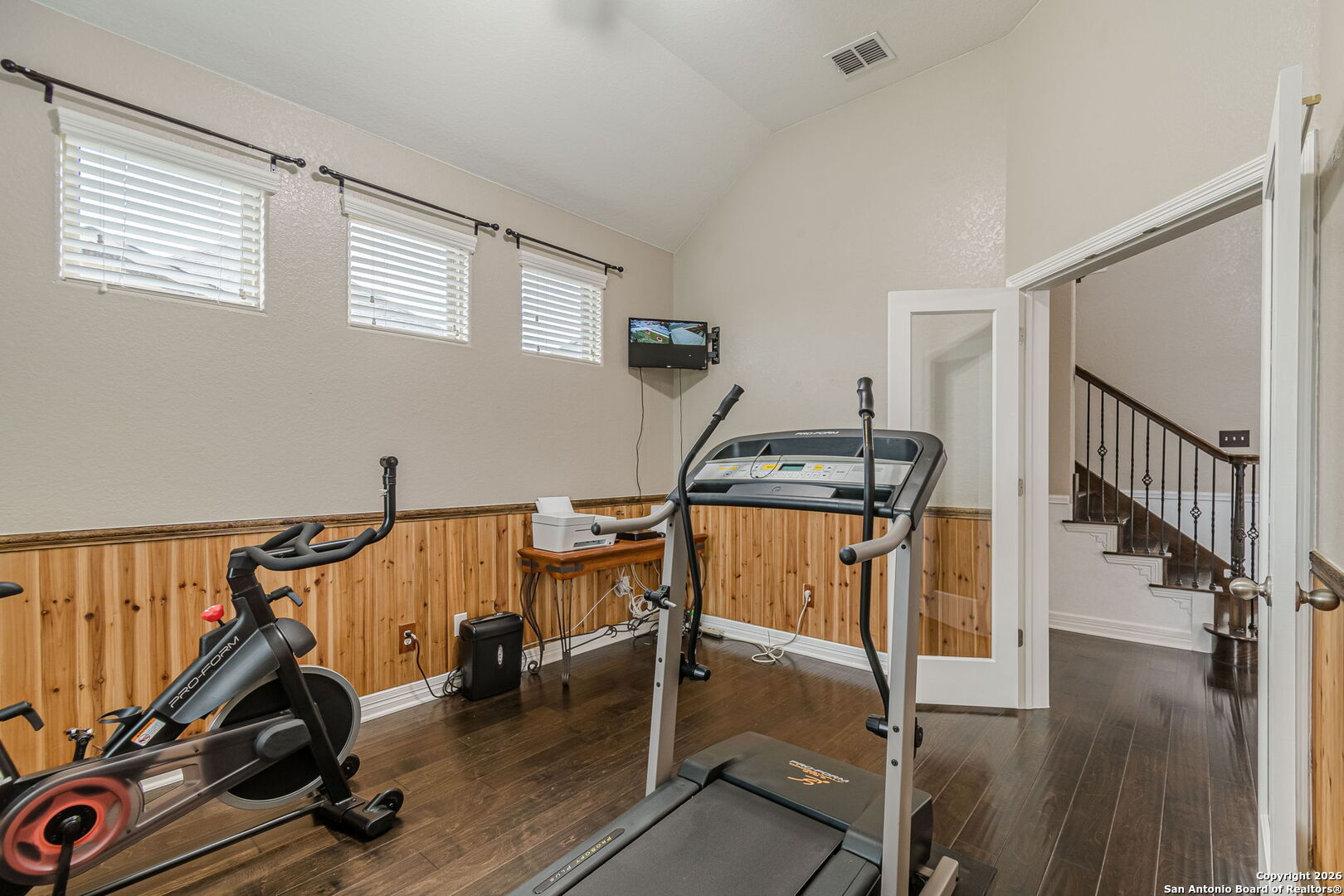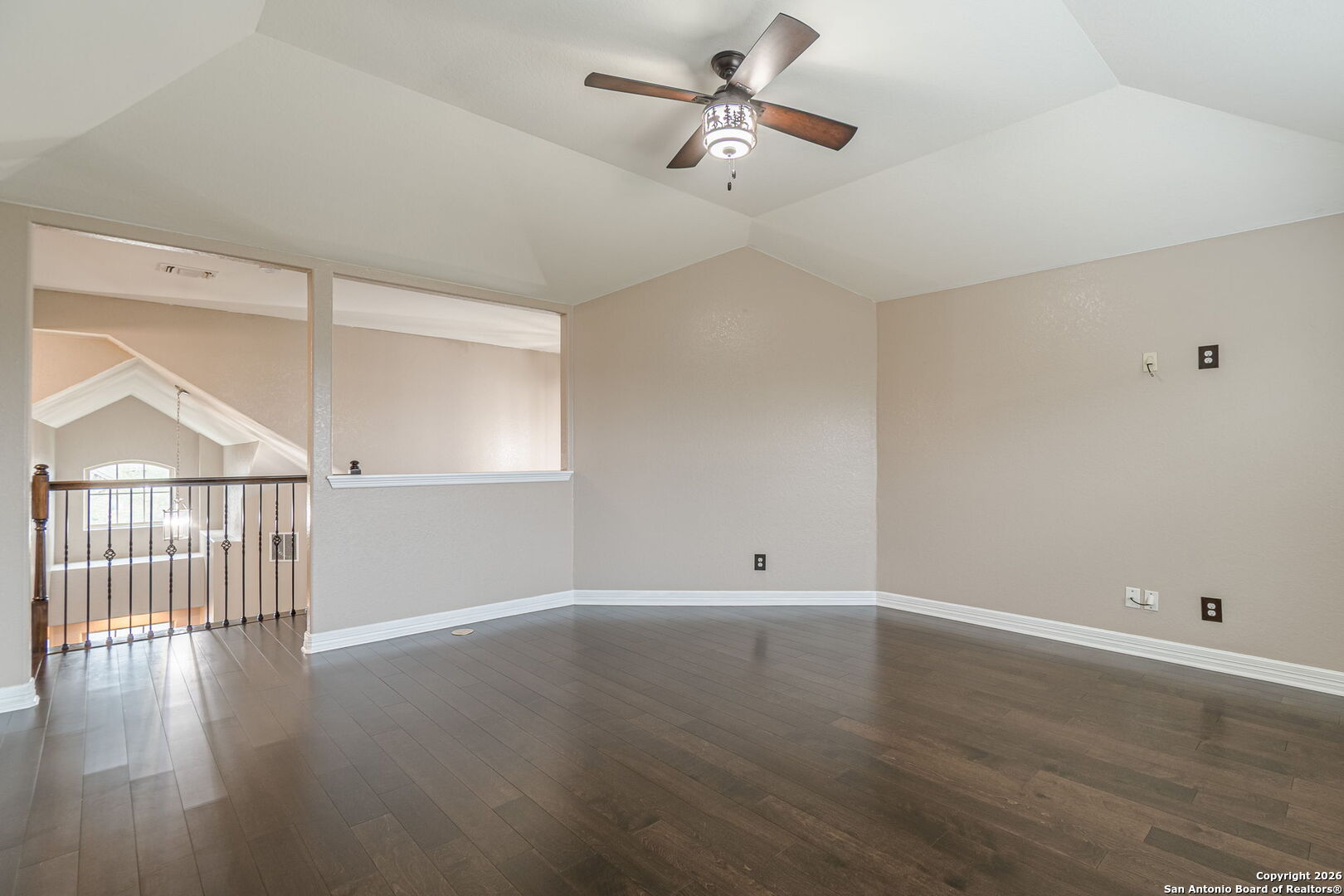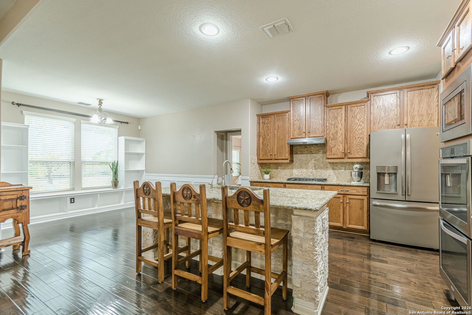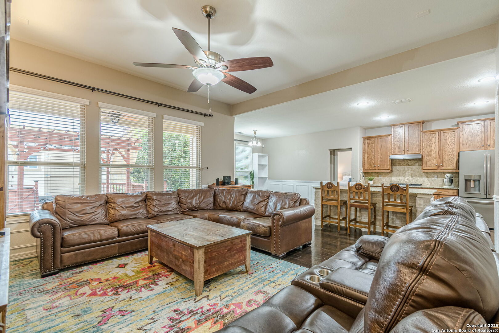 This stunning 4-bedroom, 3.5-bath home offers a flexible layout featuring a private office, formal dining room, and an upstairs game room with hardwood floors. A guest suite with its own full bath provides ideal privacy for visitors or multi-generational living. Immaculately maintained-with no shoes ever worn in the home-the pride of ownership is evident throughout. Hardwood floors span the main living areas, leading into a luxury kitchen equipped with granite countertops, a gas cooktop, double ovens, and a built-in microwave, perfect for both everyday living and entertaining. Step outside to a backyard with a storage building/workshop, adding extra functionality. Garage features epoxied floors. Enjoy a low tax rate of 1.79, excellent nearby schools, and Highland Grove neighborhood amenities including a pool, playground, and walking trails-all with quick access to I-35.
