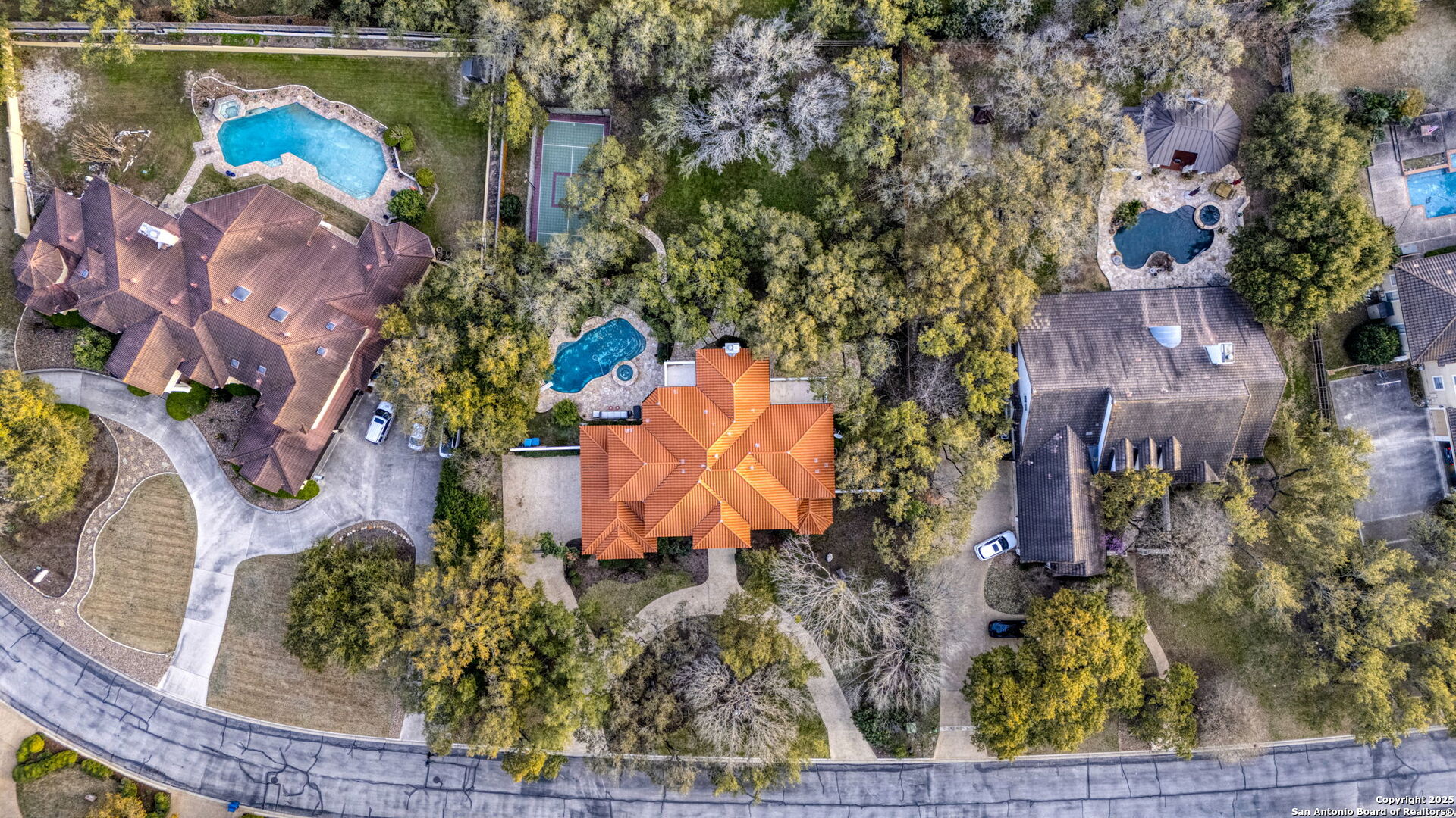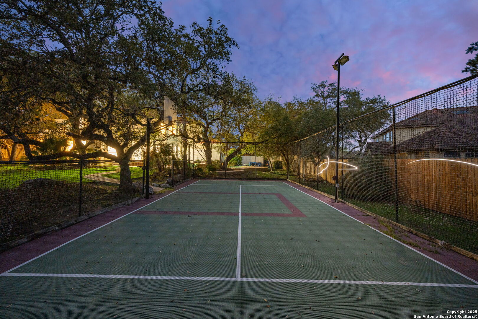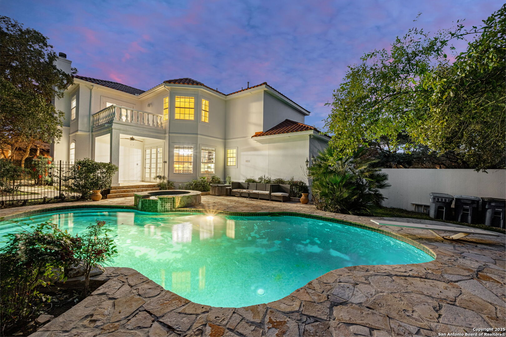 POOL & SPORT COURT! Nestled on a beautifully landscaped 3/4-acre lot in the prime Shavano Park neighborhood, this freshly painted 5-bed, 5.5-bath, +/-5,490 sqft home offers unparalleled entertainment spaces and luxurious living. Located just minutes from La Cantera and major highway intersections, this home provides easy access to shopping, dining, and top-rated amenities. The grand entry with a curved staircase leads to a cozy living room with a fireplace. The chef's kitchen features a granite island, double ovens, and a butler's pantry. Upstairs, the primary suite boasts a private balcony, fireplace, and a spa-like bath. Two additional primary bedrooms provide flexibility, including one on the main level. Step outside to the backyard oasis with an in-ground pool, sport court, two covered patios, and balconies overlooking the serene space. Northside ISD. Welcome home!