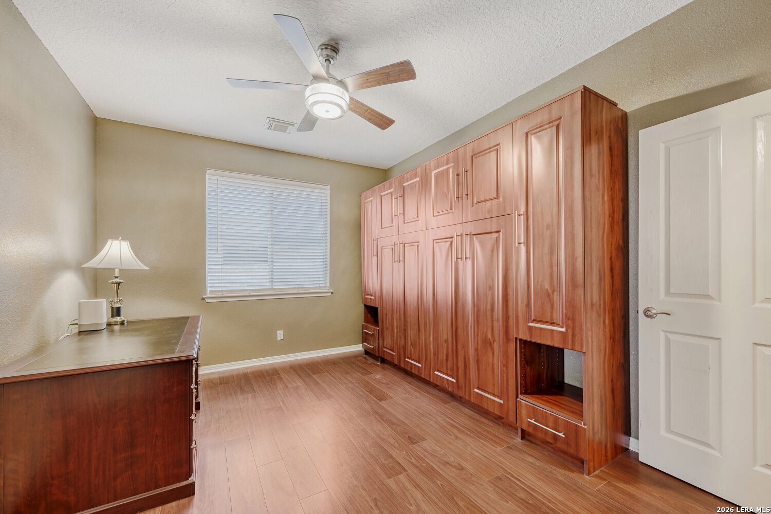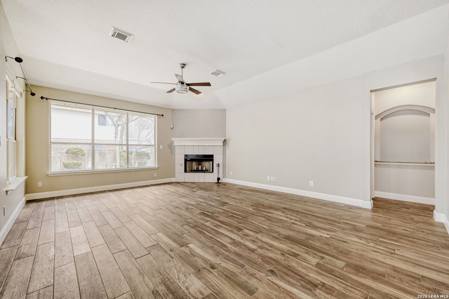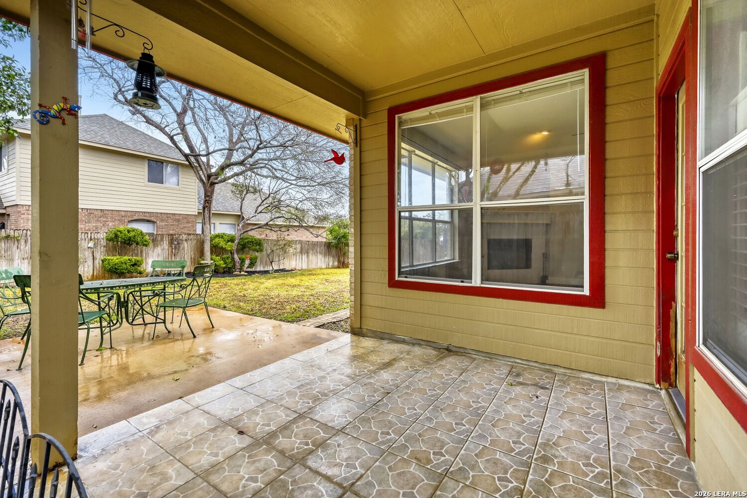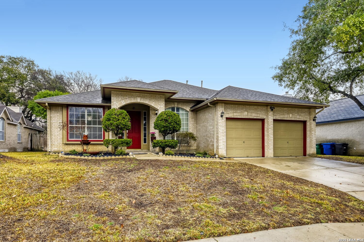 Welcome to this beautifully upgraded 4-bedroom, 2-bathroom home nestled in a quiet neighborhood with an unbeatable location. From the moment you walk in, you'll notice the soaring high ceilings, expansive windows that flood the space with natural light, and a spacious living room anchored by a stunning large fireplace, perfect for relaxing or entertaining. The thoughtfully designed floor plan offers two dining areas, providing flexibility for both formal gatherings and casual meals. The chef's kitchen is truly the heart of the home, featuring custom cabinetry with exceptional storage, granite countertops, a dramatic waterfall island, ceramic faux wood flooring, and eye-catching light fixtures. Cooking enthusiasts will appreciate the double ovens, gas stovetop with pot filler, large farmhouse sink, and the seamless functionality of the space. Both bathrooms have been tastefully upgraded and include modern walk-in showers, creating a spa-like retreat. Each bedroom offers comfort and versatility, ideal for families, guests, or a home office setup. Step outside to enjoy the covered patio surrounded by mature trees, an inviting space for outdoor dining or quiet evenings. The home also includes a 2-car garage complete with ample built-in storage cabinets. Energy-efficient, paid-off solar panels add tremendous value and help keep utility costs low. Easy access to Wurzbach Parkway and 281, as well as great shopping and eateries. This home truly combines style, comfort, and efficiency in a highly desirable setting. Don't miss the opportunity to make it yours. Schedule your showing today!