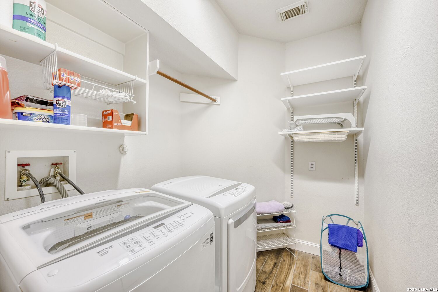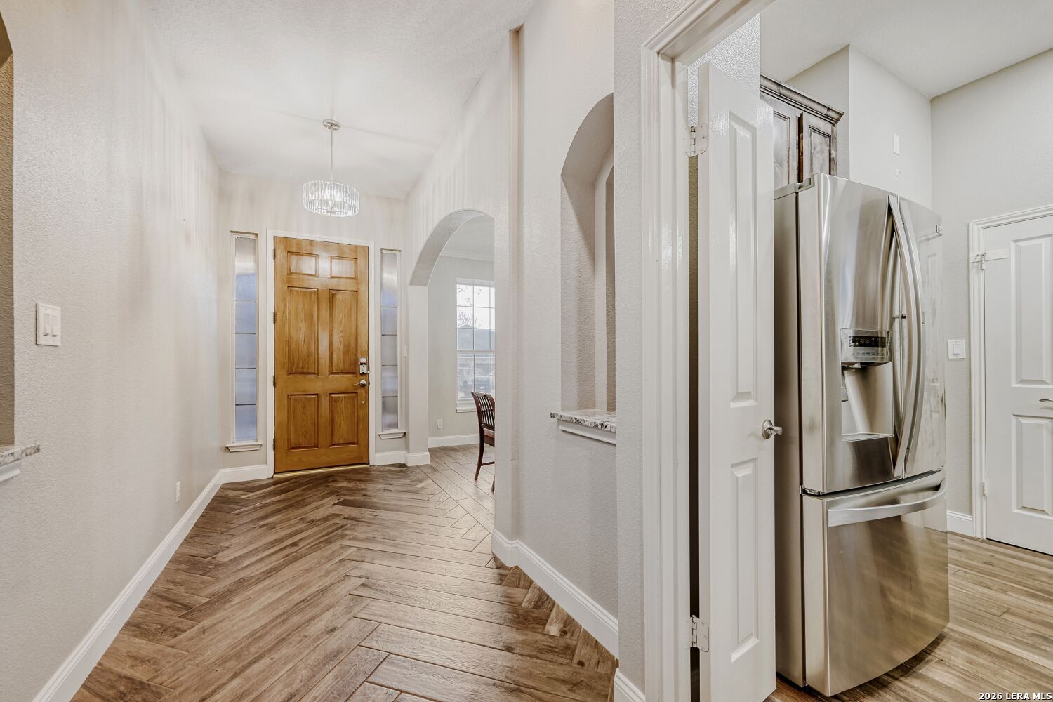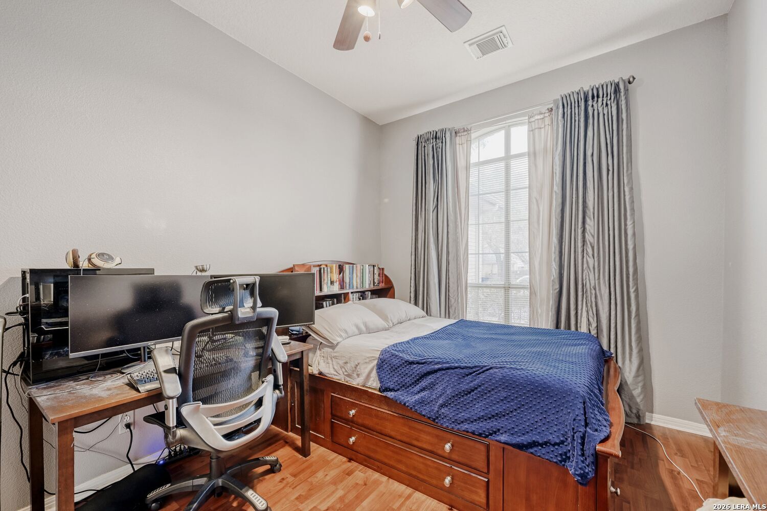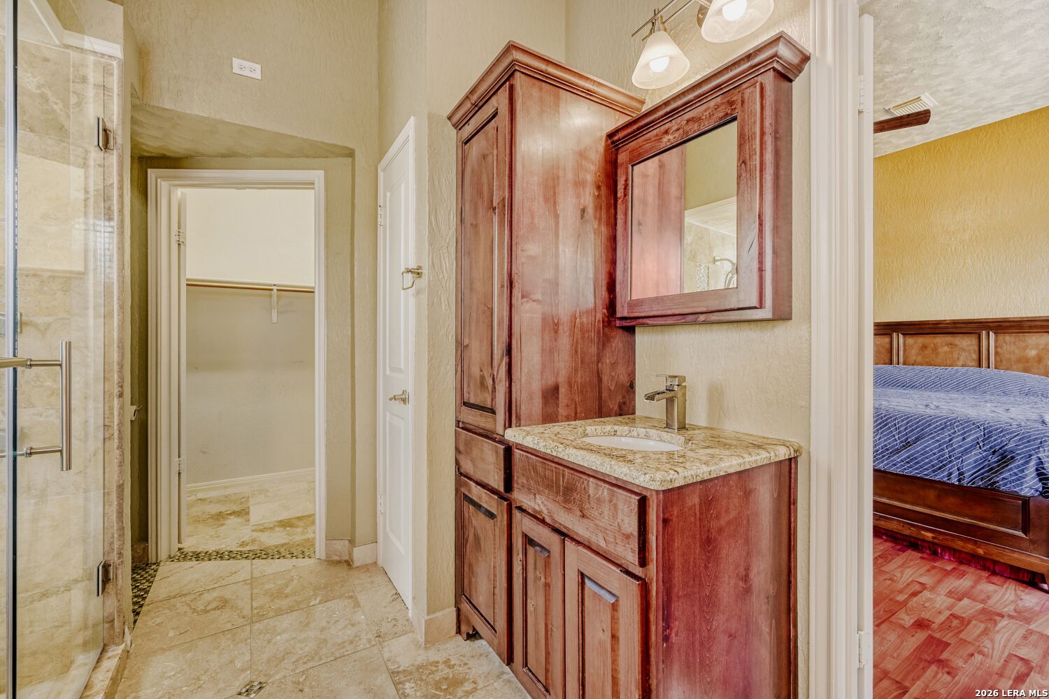 Welcome to this beautifully upgraded 4-bedroom, 2-bathroom home nestled in a quiet neighborhood with an unbeatable location. From the moment you walk in, you'll notice the soaring high ceilings, expansive windows that flood the space with natural light, and a spacious living room anchored by a stunning large fireplace, perfect for relaxing or entertaining. The thoughtfully designed floor plan offers two dining areas, providing flexibility for both formal gatherings and casual meals. The chef's kitchen is truly the heart of the home, featuring custom cabinetry with exceptional storage, granite countertops, a dramatic waterfall island, ceramic faux wood flooring, and eye-catching light fixtures. Cooking enthusiasts will appreciate the double ovens, gas stovetop with pot filler, large farmhouse sink, and the seamless functionality of the space. Both bathrooms have been tastefully upgraded and include modern walk-in showers, creating a spa-like retreat. Each bedroom offers comfort and versatility, ideal for families, guests, or a home office setup. Step outside to enjoy the covered patio surrounded by mature trees, an inviting space for outdoor dining or quiet evenings. The home also includes a 2-car garage complete with ample built-in storage cabinets. Energy-efficient, paid-off solar panels add tremendous value and help keep utility costs low. Easy access to Wurzbach Parkway and 281, as well as great shopping and eateries. This home truly combines style, comfort, and efficiency in a highly desirable setting. Don't miss the opportunity to make it yours. Schedule your showing today!