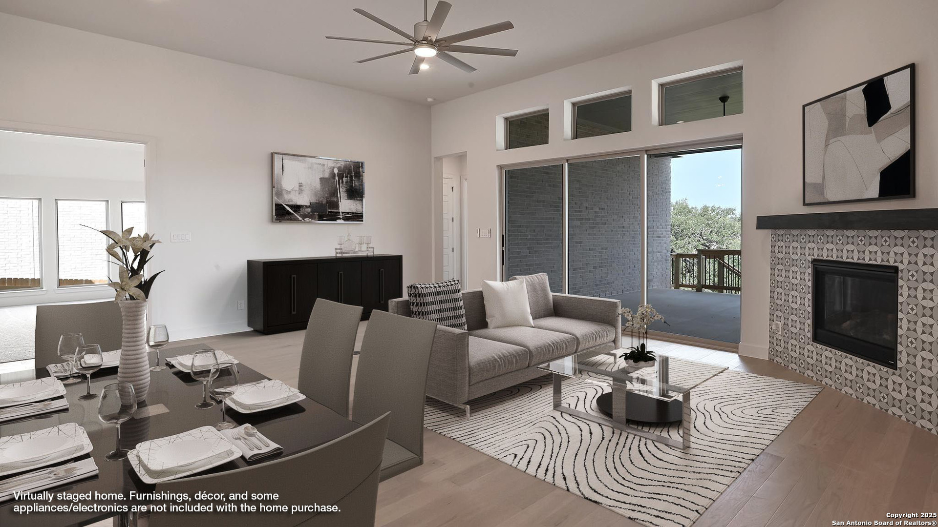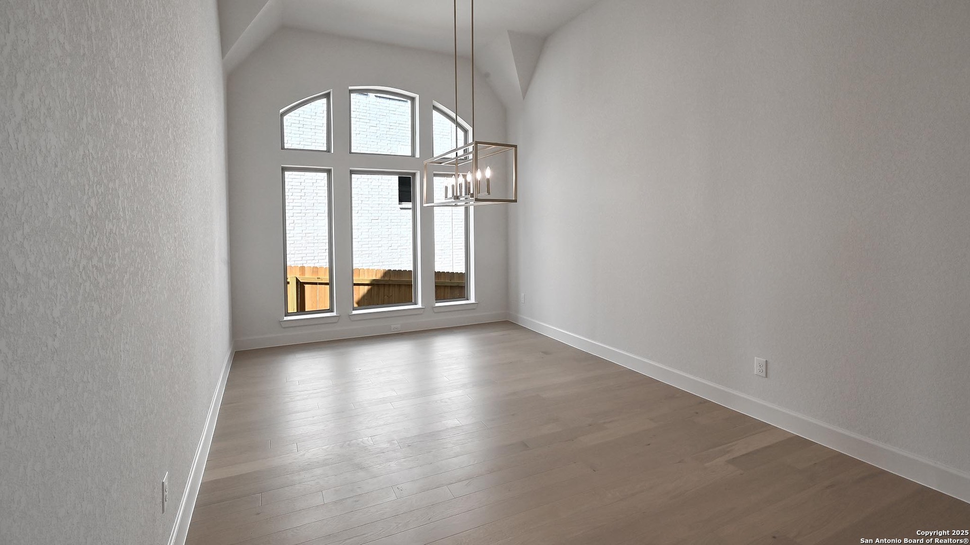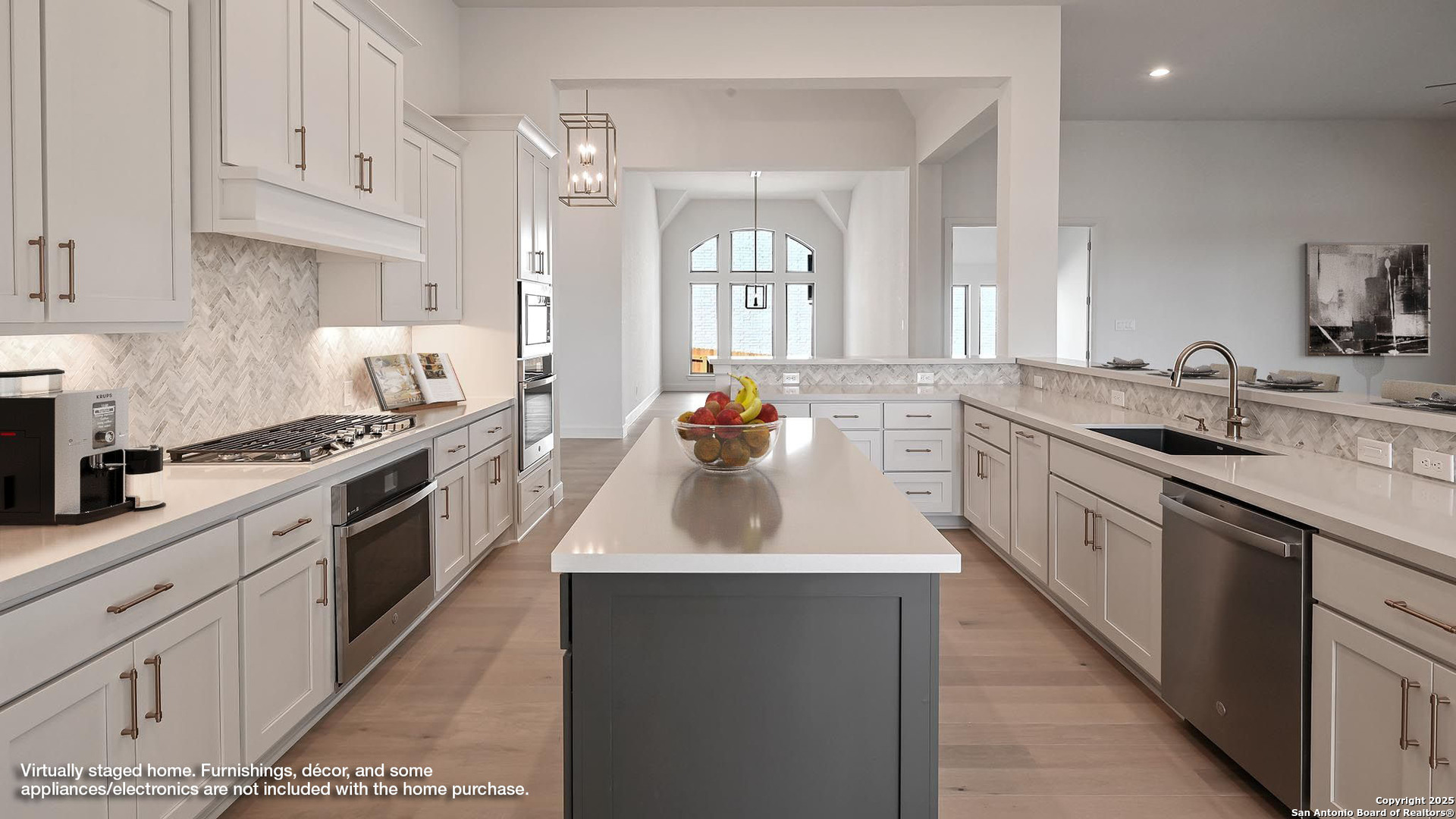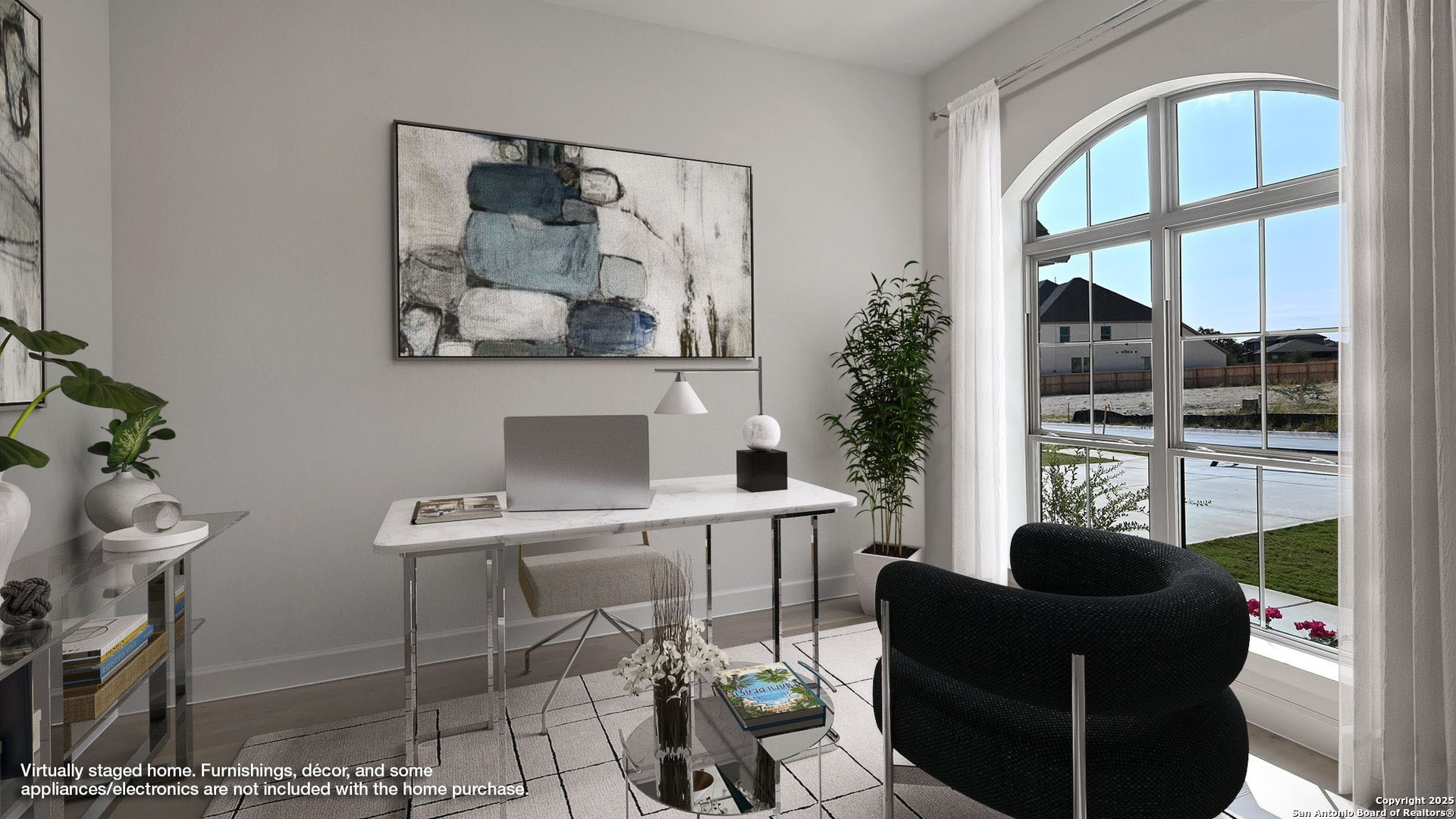 Home office with French doors set at entry. Hardwood floors throughout living areas. Extended entry leads past formal dining room to open family room with a sliding glass door and corner wood mantel fireplace. Open kitchen features center island, two wall ovens, 5-burner gas cooktop and walk-in pantry. Guest suite with private bath off morning area. Primary suite includes bedroom with wall of windows. Dual vanities, a freestanding tub, separate glass-enclosed shower and two walk-in closets in primary bath. High ceilings and walls of large windows add to this spacious four-bedroom design. Extended covered backyard patio. Mud room off three-car garage.