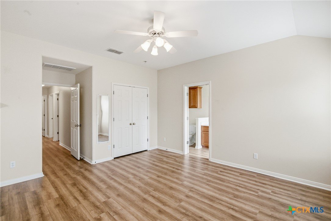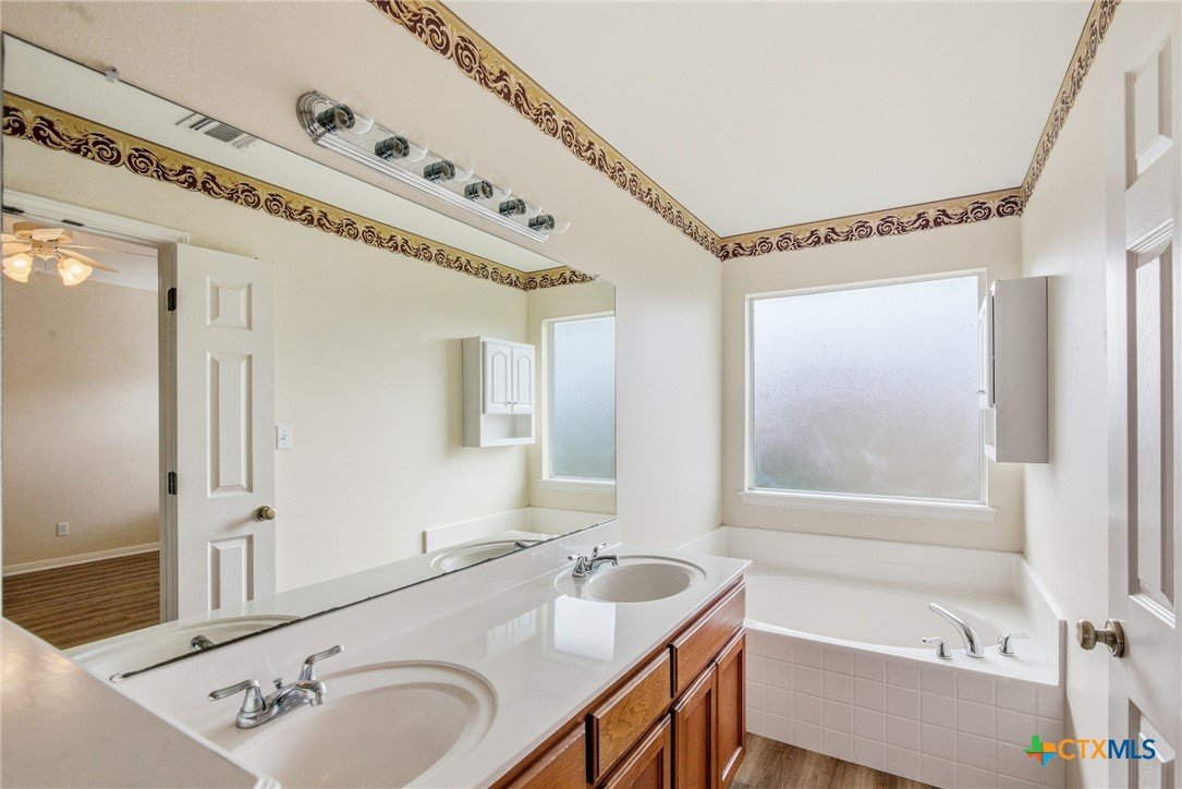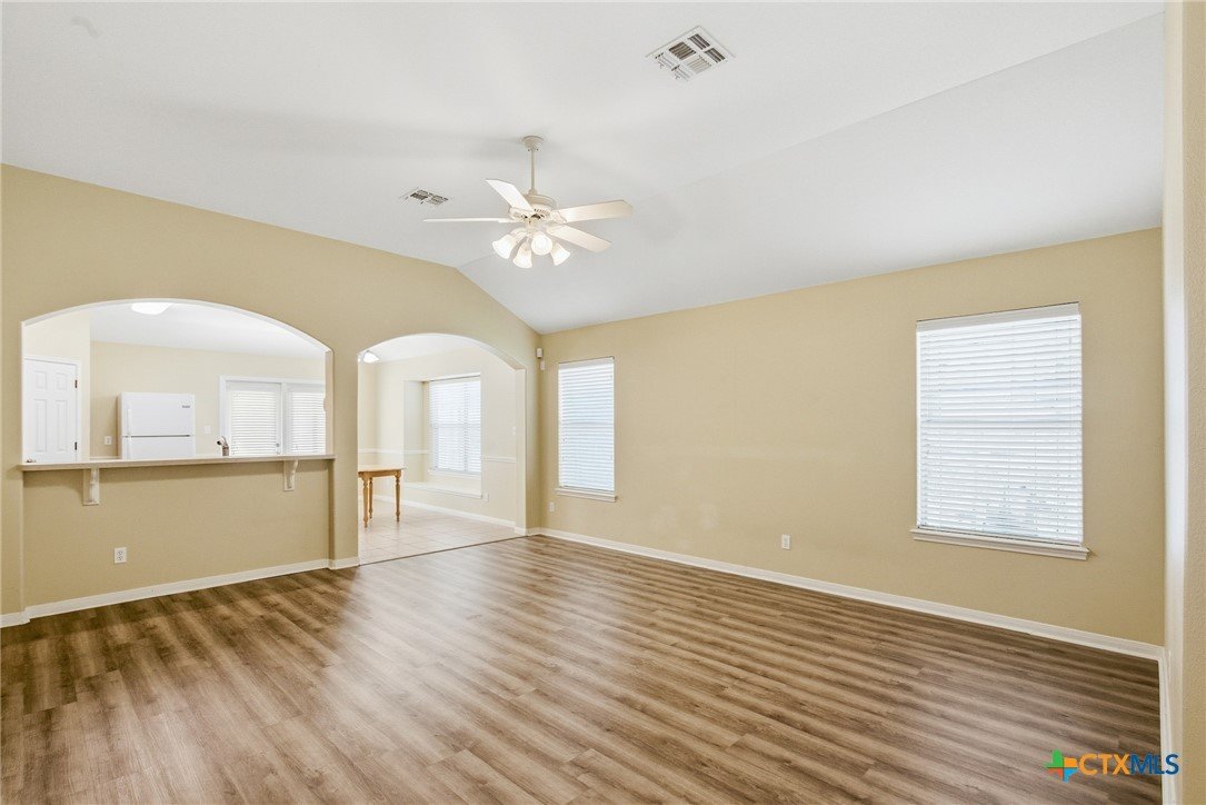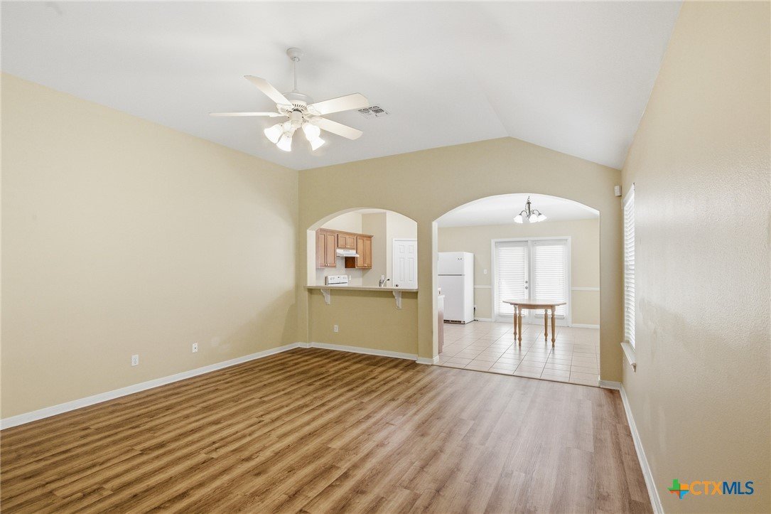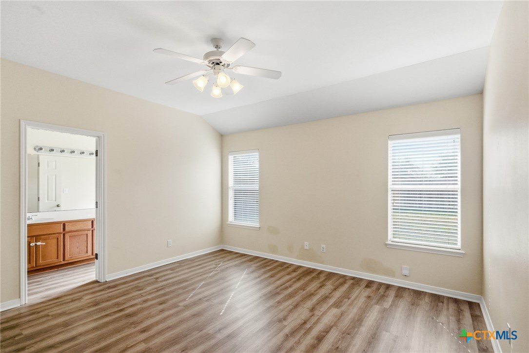 This spacious 4-bedroom, 2-bath Steve Klein home features a beautiful island kitchen with lots of countertop space. Ceramic tile flooring and many cabinets, top and bottom. There is also a generous pantry for storage. The hallway has a double door storage closet with shelves. There is also an indoor laundry room. Each bedroom has nice sized closets. The primary bedroom has a full walk-in closet as well as an additional closet. The primary bas has a double vanity and a separate soaking tub and shower. The living room is large and bright with high ceilings and natural light from the window. Outside you will find a covered patio and privacy fenced backyard.