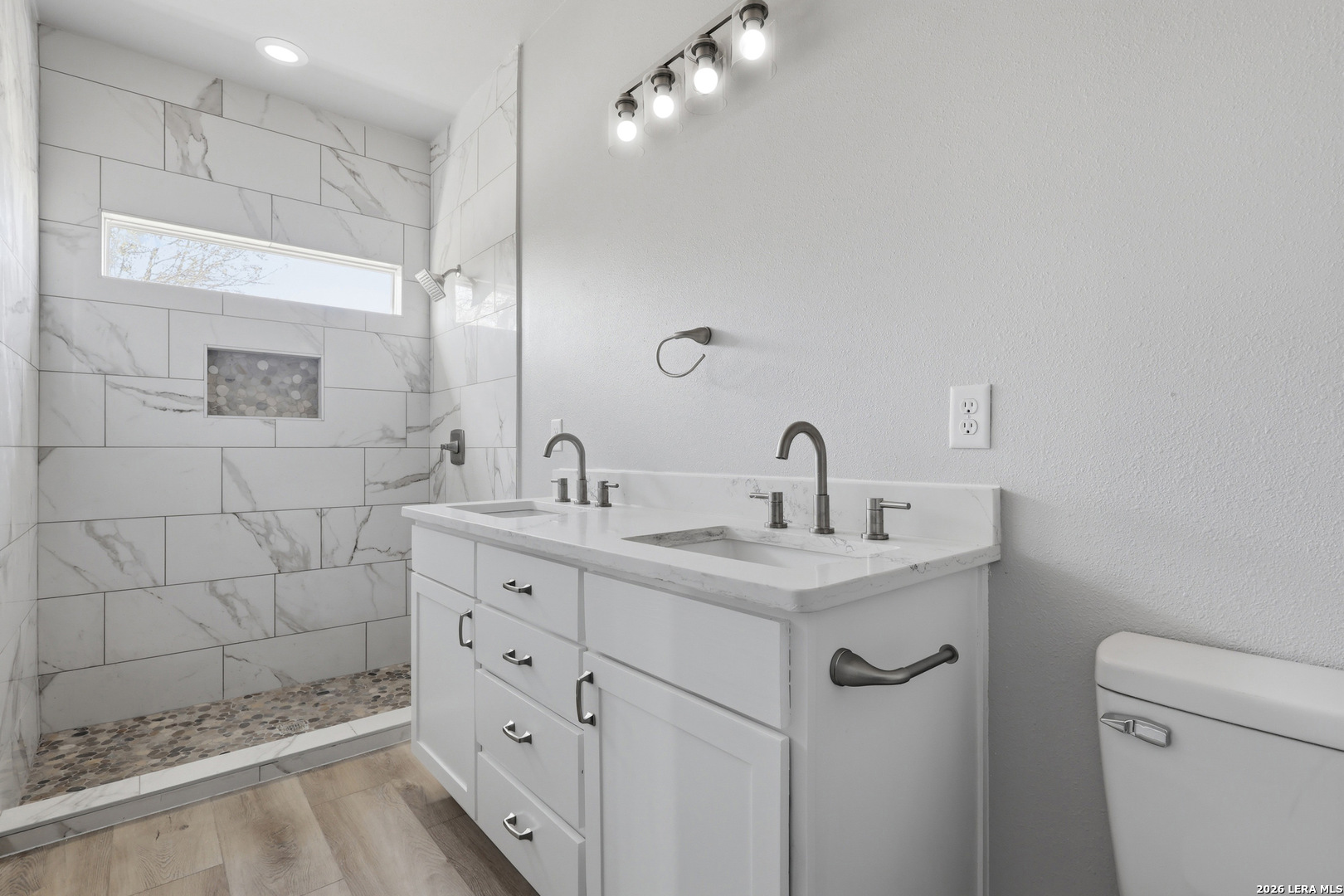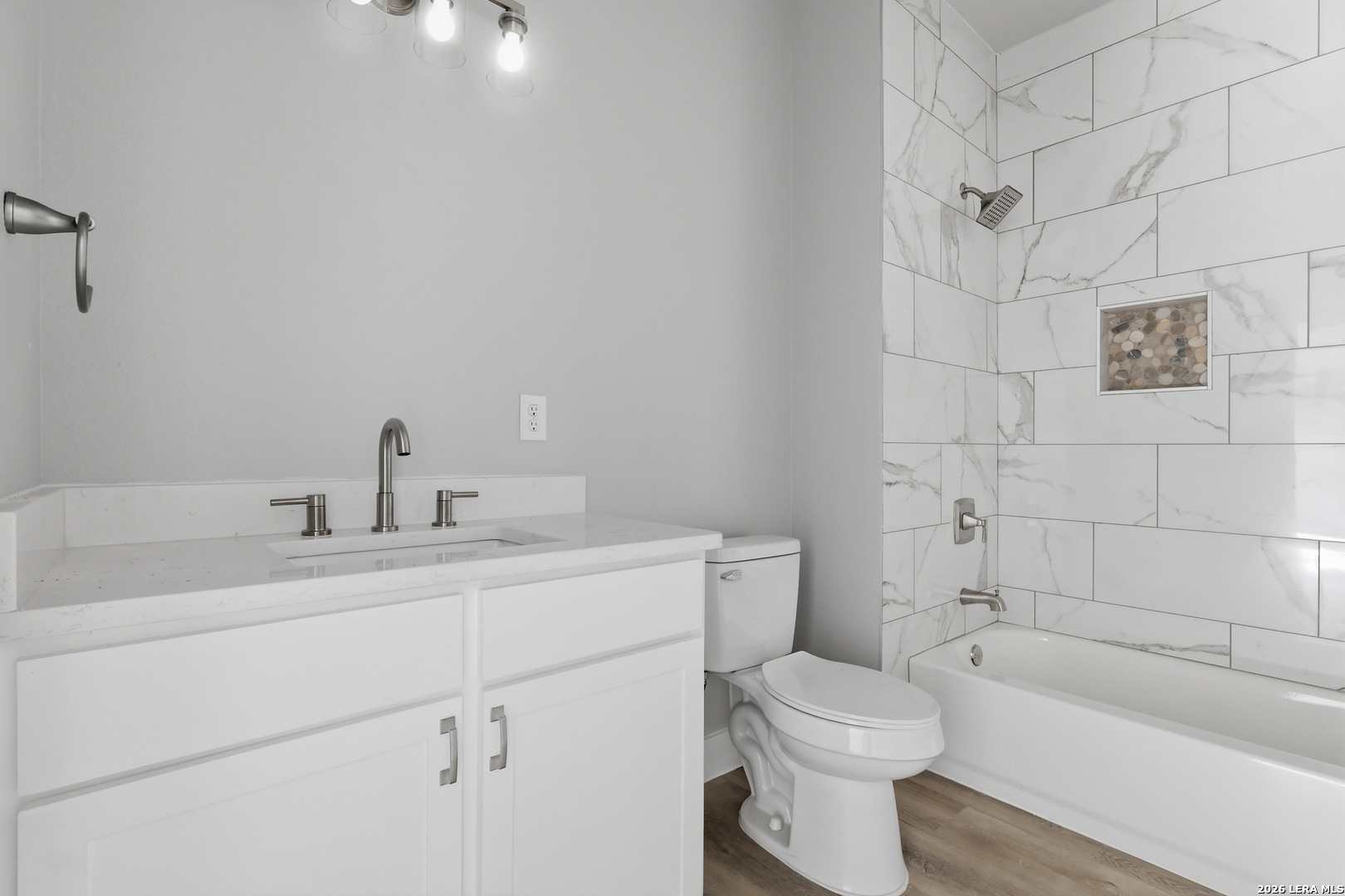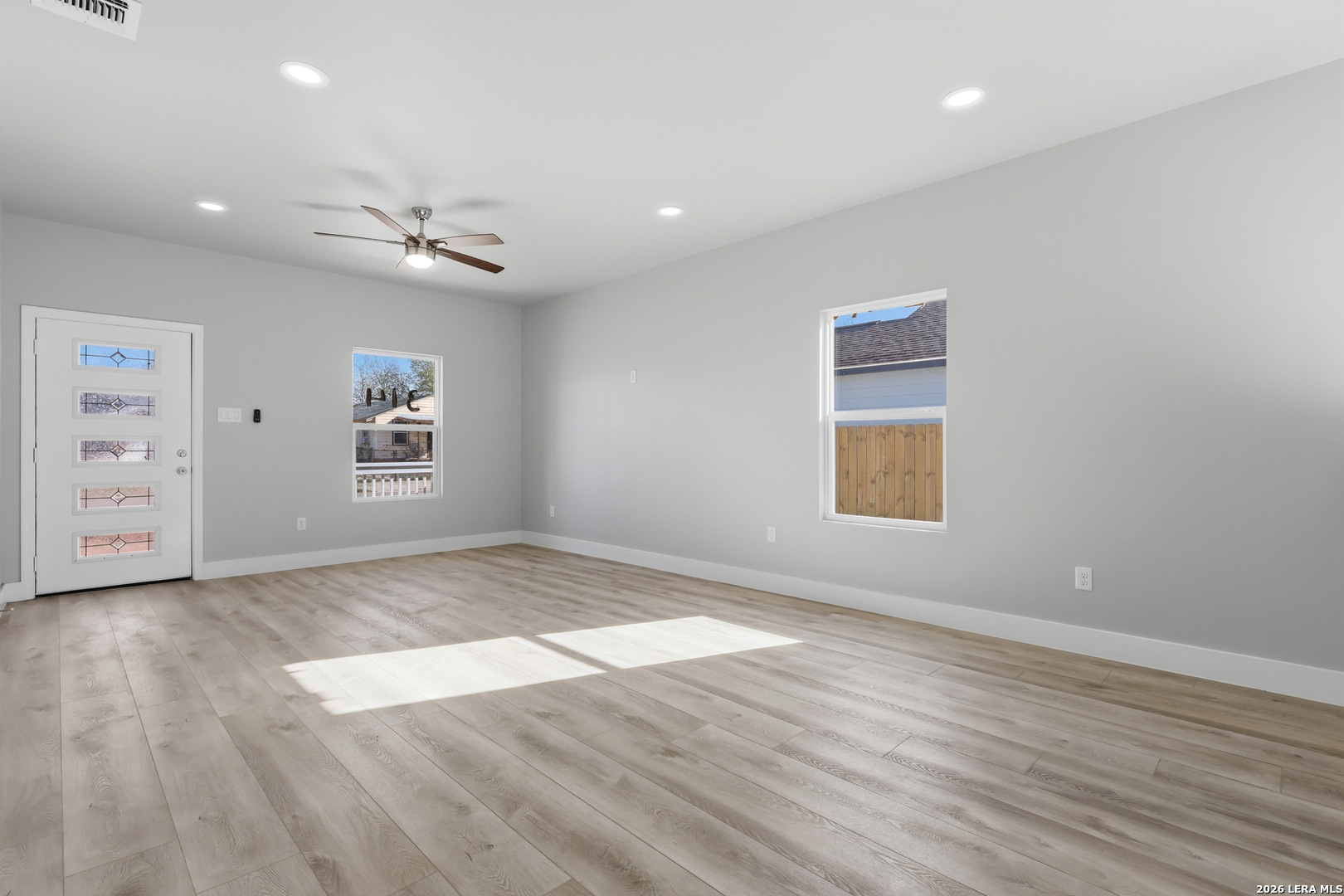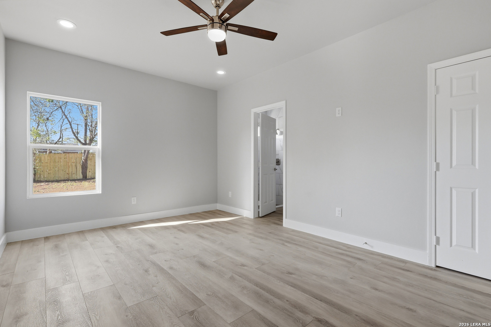 Welcome to this stunning new construction home located in the heart of San Antonio! This beautifully crafted 3-bedroom, 2-bath residence offers modern design and comfortable living with an inviting open-concept layout perfect for today's lifestyle. Step inside to find impressive high ceilings that create a bright and airy feel throughout, complemented by stylish luxury vinyl flooring that offers both durability and a sleek, contemporary look. Ceiling fans in living area and all the bedrooms. The custom kitchen is a true centerpiece, featuring elegant quartz countertops, a spacious breakfast bar, and ample cabinetry-ideal for entertaining or everyday living. Both bathrooms are thoughtfully designed with beautiful tile finishes, adding a touch of luxury and sophistication to your daily routine. Ideally located with easy access to major highways, this home offers a convenient commute to downtown San Antonio, local shopping, dining, and schools. Enjoy being just minutes from city amenities while still tucked into an established neighborhood-making it a perfect blend of comfort and accessibility. Don't miss the opportunity to own a brand-new home with modern upgrades in a convenient location-schedule your showing today! Home is 30-45 days from completion, it is still missing the driveway and privacy fence.