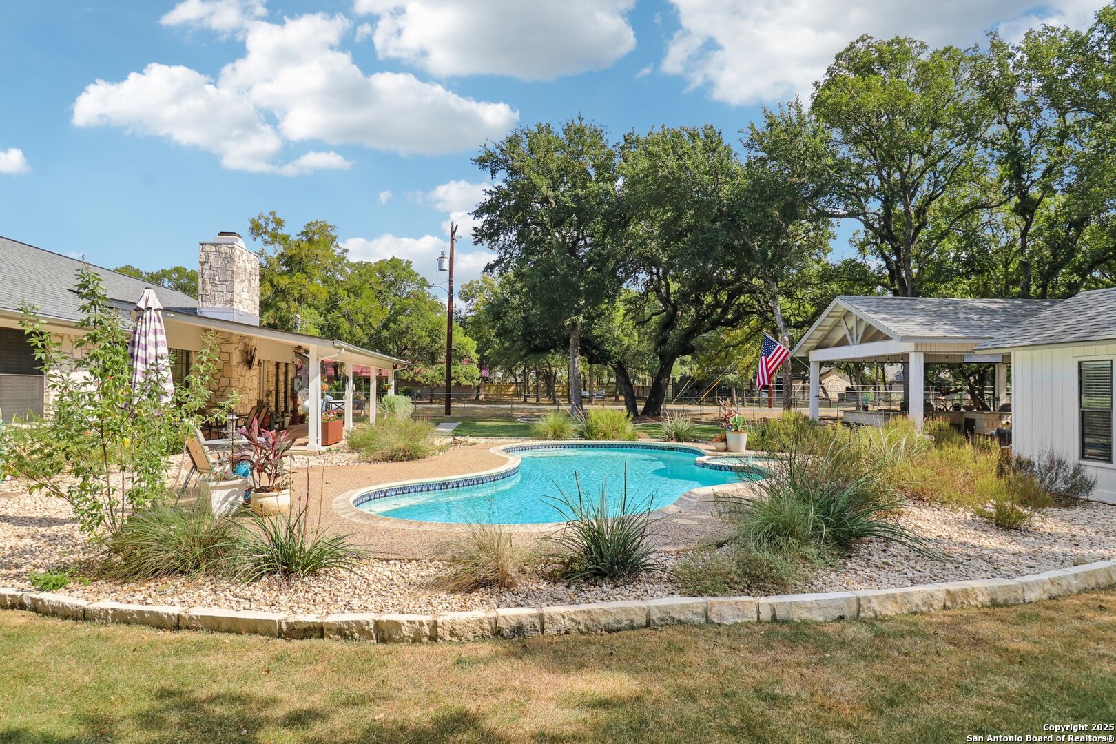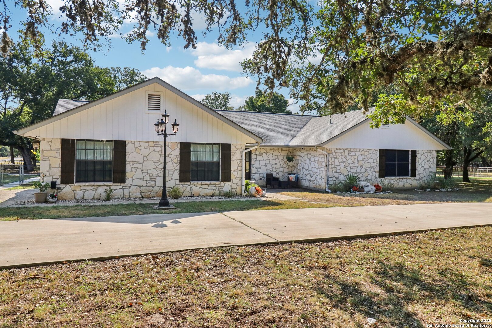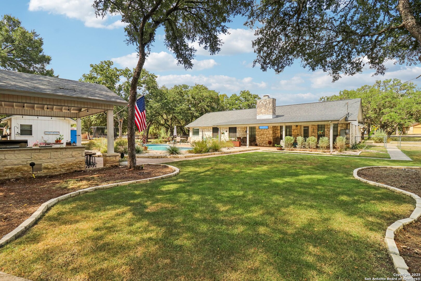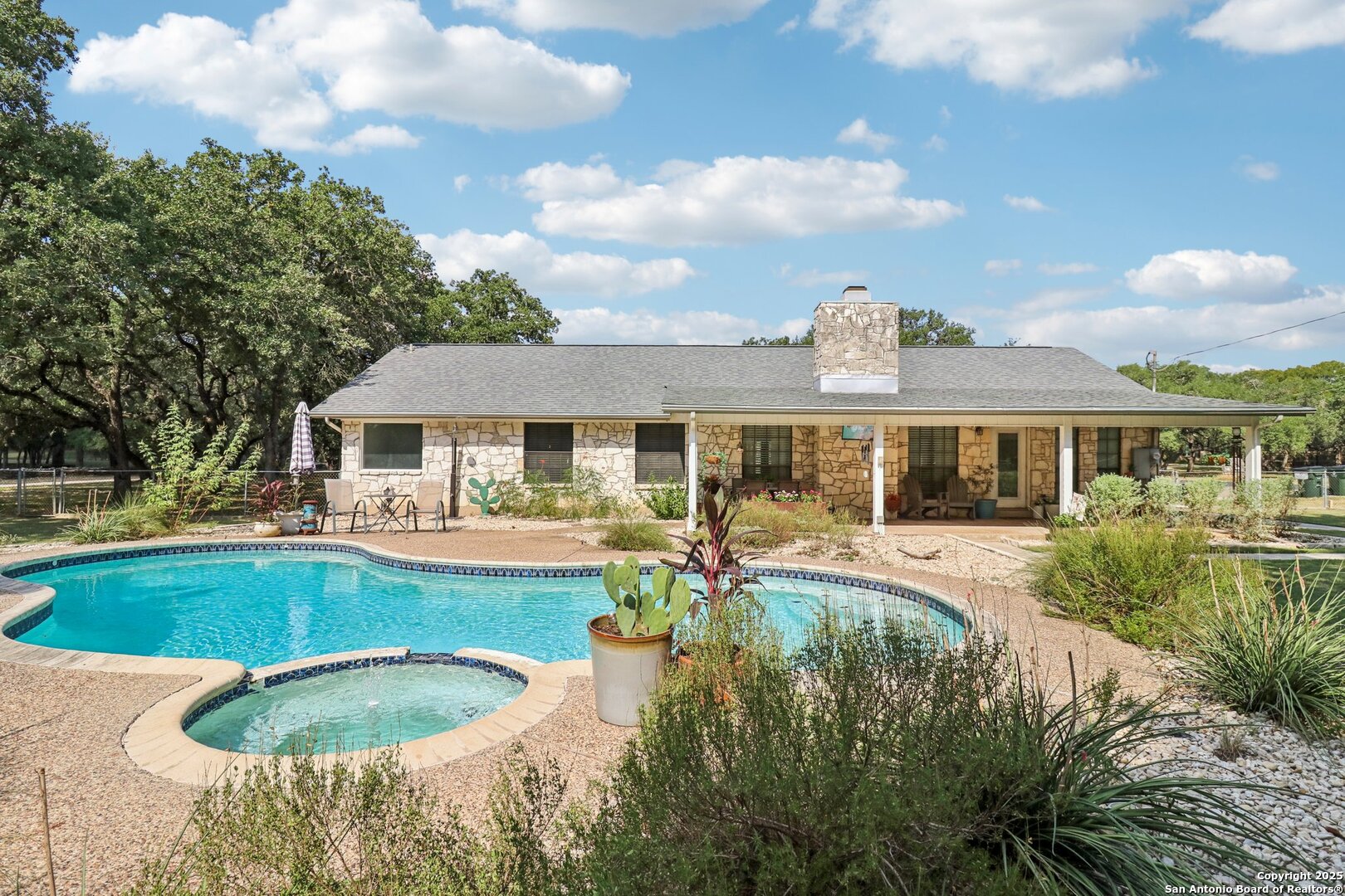 Welcome to elevated country living! Where timeless charm meets modern luxury, all nestled on a 1.23-acre corner lot with curb appeal that will stop you in your tracks. The circular drive speckled with mature trees and the warm stone exterior create a curb appeal that feels instantly welcoming and effortlessly timeless. Tucked away at the end of a quiet street with minimal traffic, the setting is peaceful and private, one of the many features that make this home so special. The recently updated interior is nothing short of breathtaking. Luxury vinyl plank floors flow seamlessly through the open-concept design, creating a cohesive and elevated feel. The spacious living room, anchored by a cozy wood-burning fireplace, invites you to curl up on cool Texas nights and enjoy the glow of the crackling fire. The living space opens directly into a stunning kitchen complete with custom cabinetry, an oversized island with breakfast bar seating, gas cooking, stainless steel appliances, and carefully chosen fixtures that balance a high-end look with a warm, lived-in feel. Just beyond, a stunning chandelier marks the dining space, while the walk-in pantry (truly the pantry of your dreams) doubles as a Butler's pantry with custom cabinetry and shelving for small appliances and storage. The primary suite is generous in size with his-and-hers closets (because one of you clearly deserves more space-don't worry, we won't say who). The ensuite bathroom has been completely transformed into a spa-worthy retreat featuring a dual-sink vanity and an oversized walk-in shower you have to see to believe. Two additional bedrooms and another fully renovated bathroom round out the interior. Step outside and you'll discover what can only be described as your very own Texas oasis. An extended covered patio with a porch swing overlooks the sparkling in-ground pool and spa. The covered outdoor kitchen is equipped with a built-in grill, sink, outdoor fridge, ceiling fan, and plenty of space for entertaining. A dedicated fire pit area and beautifully landscaped grounds with brick-lined flower beds create a setting perfect for gathering with friends and family. Beyond the pool sits a detached bonus room with electricity, ready to serve as a gym, office, studio, or whatever your lifestyle needs. The detached three-car garage and workshop is a standout feature-not just oversized, but purpose-built for cars, boats, or RVs. With dedicated power, internet, and two mini-split A/C units, this space is as functional as it is versatile. Whether you need a workshop, storage, or a hobby haven, this shop is a true highlight of the property. There's even a drive-through awning and a landscaped playscape area that will stay with the home. With a new roof and HVAC installed in 2021, permanent LED holiday lighting, and countless thoughtful upgrades, this property offers convenience with undeniable style. All of this is tucked into a community that offers a park, pickleball and basketball courts, a baseball field, and walking trails. Minutes from 281, you'll have easy access into town while enjoying the privacy and tranquility of country living. This is more than just a home-it's the lifestyle you've been waiting for.