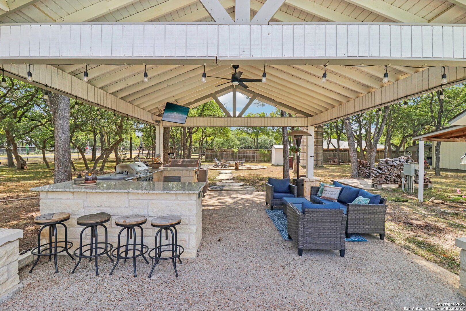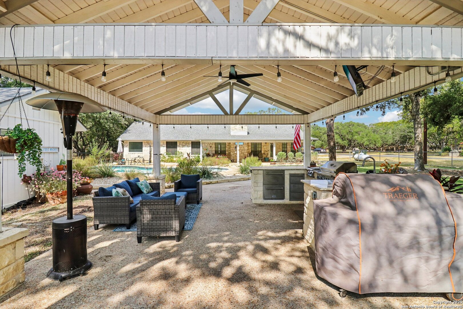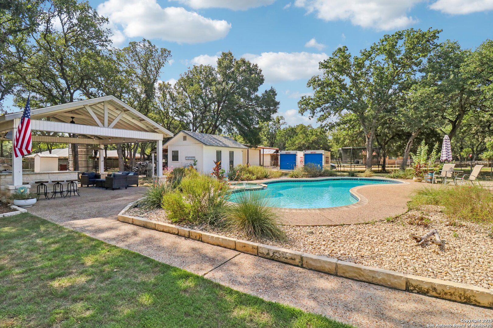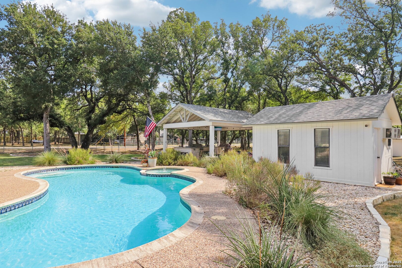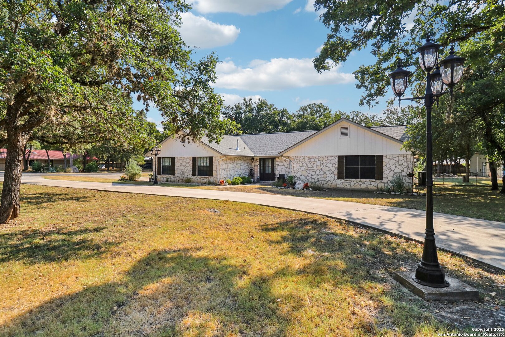 Welcome to elevated country living! Where timeless charm meets modern luxury, all nestled on a 1.23-acre corner lot with curb appeal that will stop you in your tracks. The circular drive speckled with mature trees and the warm stone exterior create a curb appeal that feels instantly welcoming and effortlessly timeless. Tucked away at the end of a quiet street with minimal traffic, the setting is peaceful and private, one of the many features that make this home so special. The recently updated interior is nothing short of breathtaking. Luxury vinyl plank floors flow seamlessly through the open-concept design, creating a cohesive and elevated feel. The spacious living room, anchored by a cozy wood-burning fireplace, invites you to curl up on cool Texas nights and enjoy the glow of the crackling fire. The living space opens directly into a stunning kitchen complete with custom cabinetry, an oversized island with breakfast bar seating, gas cooking, stainless steel appliances, and carefully chosen fixtures that balance a high-end look with a warm, lived-in feel. Just beyond, a stunning chandelier marks the dining space, while the walk-in pantry (truly the pantry of your dreams) doubles as a Butler's pantry with custom cabinetry and shelving for small appliances and storage. The primary suite is generous in size with his-and-hers closets (because one of you clearly deserves more space-don't worry, we won't say who). The ensuite bathroom has been completely transformed into a spa-worthy retreat featuring a dual-sink vanity and an oversized walk-in shower you have to see to believe. Two additional bedrooms and another fully renovated bathroom round out the interior. Step outside and you'll discover what can only be described as your very own Texas oasis. An extended covered patio with a porch swing overlooks the sparkling in-ground pool and spa. The covered outdoor kitchen is equipped with a built-in grill, sink, outdoor fridge, ceiling fan, and plenty of space for entertaining. A dedicated fire pit area and beautifully landscaped grounds with brick-lined flower beds create a setting perfect for gathering with friends and family. Beyond the pool sits a detached bonus room with electricity, ready to serve as a gym, office, studio, or whatever your lifestyle needs. The detached three-car garage and workshop is a standout feature-not just oversized, but purpose-built for cars, boats, or RVs. With dedicated power, internet, and two mini-split A/C units, this space is as functional as it is versatile. Whether you need a workshop, storage, or a hobby haven, this shop is a true highlight of the property. There's even a drive-through awning and a landscaped playscape area that will stay with the home. With a new roof and HVAC installed in 2021, permanent LED holiday lighting, and countless thoughtful upgrades, this property offers convenience with undeniable style. All of this is tucked into a community that offers a park, pickleball and basketball courts, a baseball field, and walking trails. Minutes from 281, you'll have easy access into town while enjoying the privacy and tranquility of country living. This is more than just a home-it's the lifestyle you've been waiting for.