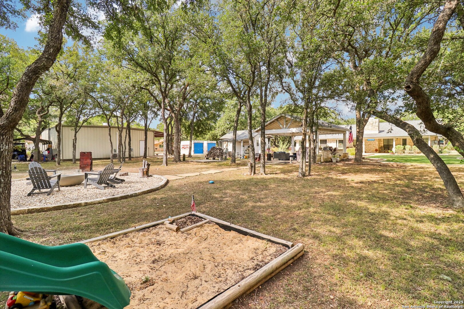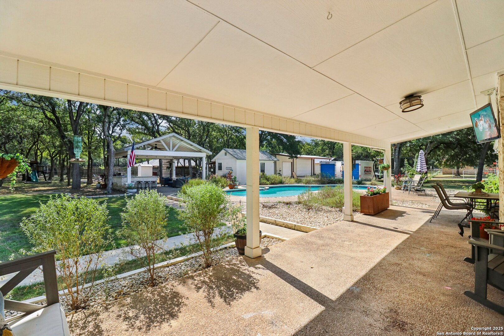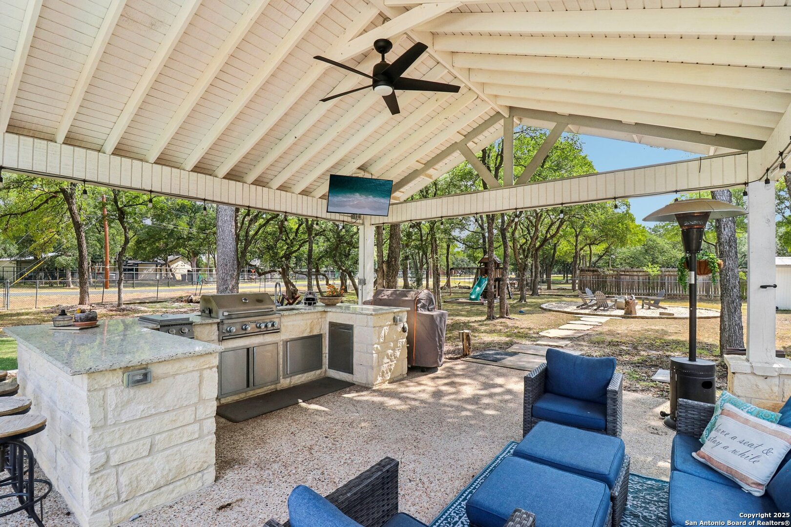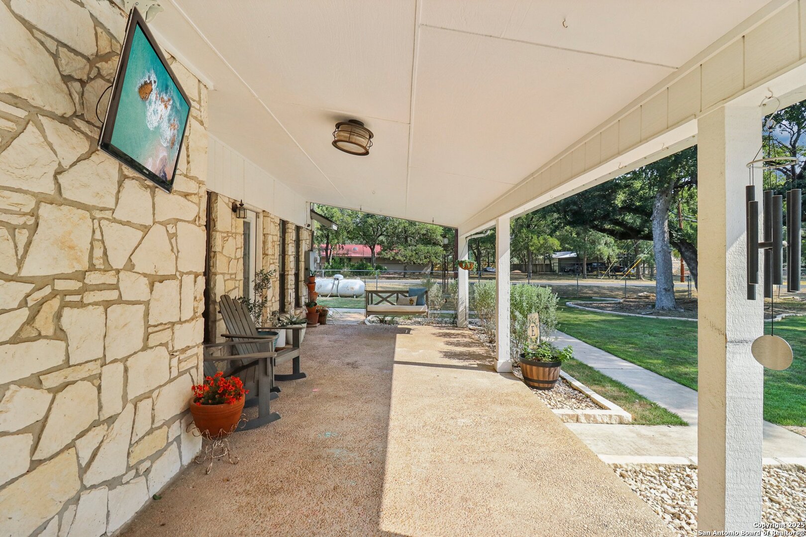 Welcome to elevated country living! Where timeless charm meets modern luxury, all nestled on a 1.23-acre corner lot with curb appeal that will stop you in your tracks. The circular drive speckled with mature trees and the warm stone exterior create a curb appeal that feels instantly welcoming and effortlessly timeless. Tucked away at the end of a quiet street with minimal traffic, the setting is peaceful and private, one of the many features that make this home so special. The recently updated interior is nothing short of breathtaking. Luxury vinyl plank floors flow seamlessly through the open-concept design, creating a cohesive and elevated feel. The spacious living room, anchored by a cozy wood-burning fireplace, invites you to curl up on cool Texas nights and enjoy the glow of the crackling fire. The living space opens directly into a stunning kitchen complete with custom cabinetry, an oversized island with breakfast bar seating, gas cooking, stainless steel appliances, and carefully chosen fixtures that balance a high-end look with a warm, lived-in feel. Just beyond, a stunning chandelier marks the dining space, while the walk-in pantry (truly the pantry of your dreams) doubles as a Butler's pantry with custom cabinetry and shelving for small appliances and storage. The primary suite is generous in size with his-and-hers closets (because one of you clearly deserves more space-don't worry, we won't say who). The ensuite bathroom has been completely transformed into a spa-worthy retreat featuring a dual-sink vanity and an oversized walk-in shower you have to see to believe. Two additional bedrooms and another fully renovated bathroom round out the interior. Step outside and you'll discover what can only be described as your very own Texas oasis. An extended covered patio with a porch swing overlooks the sparkling in-ground pool and spa. The covered outdoor kitchen is equipped with a built-in grill, sink, outdoor fridge, ceiling fan, and plenty of space for entertaining. A dedicated fire pit area and beautifully landscaped grounds with brick-lined flower beds create a setting perfect for gathering with friends and family. Beyond the pool sits a detached bonus room with electricity, ready to serve as a gym, office, studio, or whatever your lifestyle needs. The detached three-car garage and workshop is a standout feature-not just oversized, but purpose-built for cars, boats, or RVs. With dedicated power, internet, and two mini-split A/C units, this space is as functional as it is versatile. Whether you need a workshop, storage, or a hobby haven, this shop is a true highlight of the property. There's even a drive-through awning and a landscaped playscape area that will stay with the home. With a new roof and HVAC installed in 2021, permanent LED holiday lighting, and countless thoughtful upgrades, this property offers convenience with undeniable style. All of this is tucked into a community that offers a park, pickleball and basketball courts, a baseball field, and walking trails. Minutes from 281, you'll have easy access into town while enjoying the privacy and tranquility of country living. This is more than just a home-it's the lifestyle you've been waiting for.
