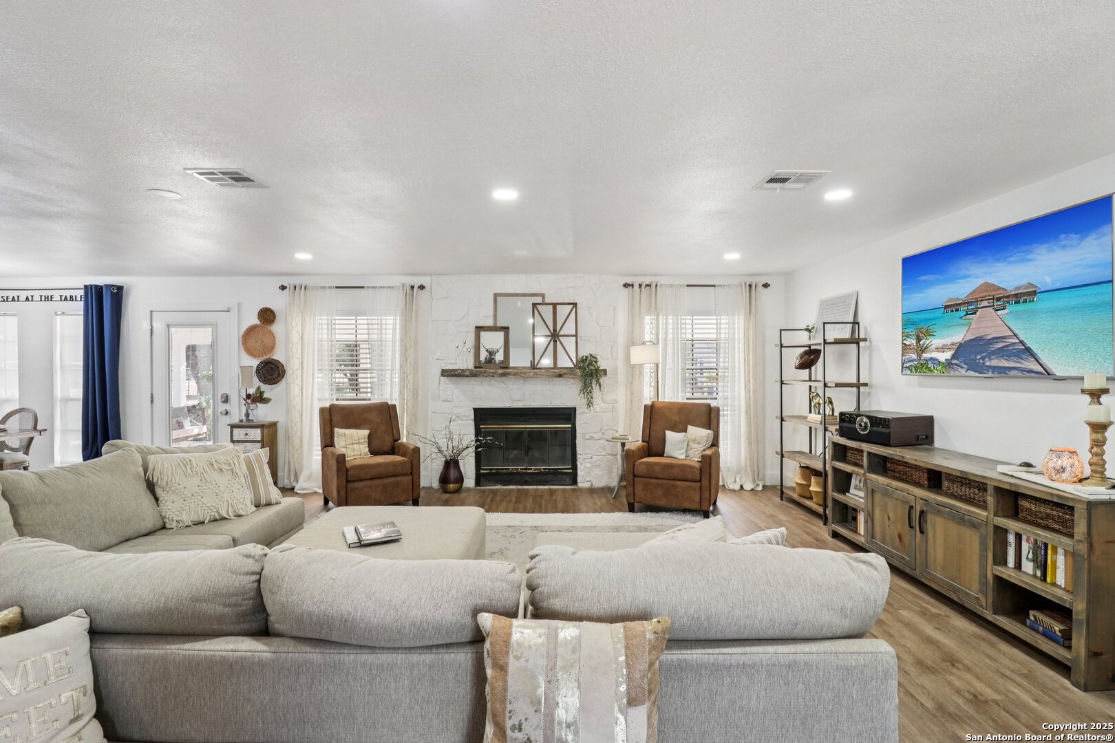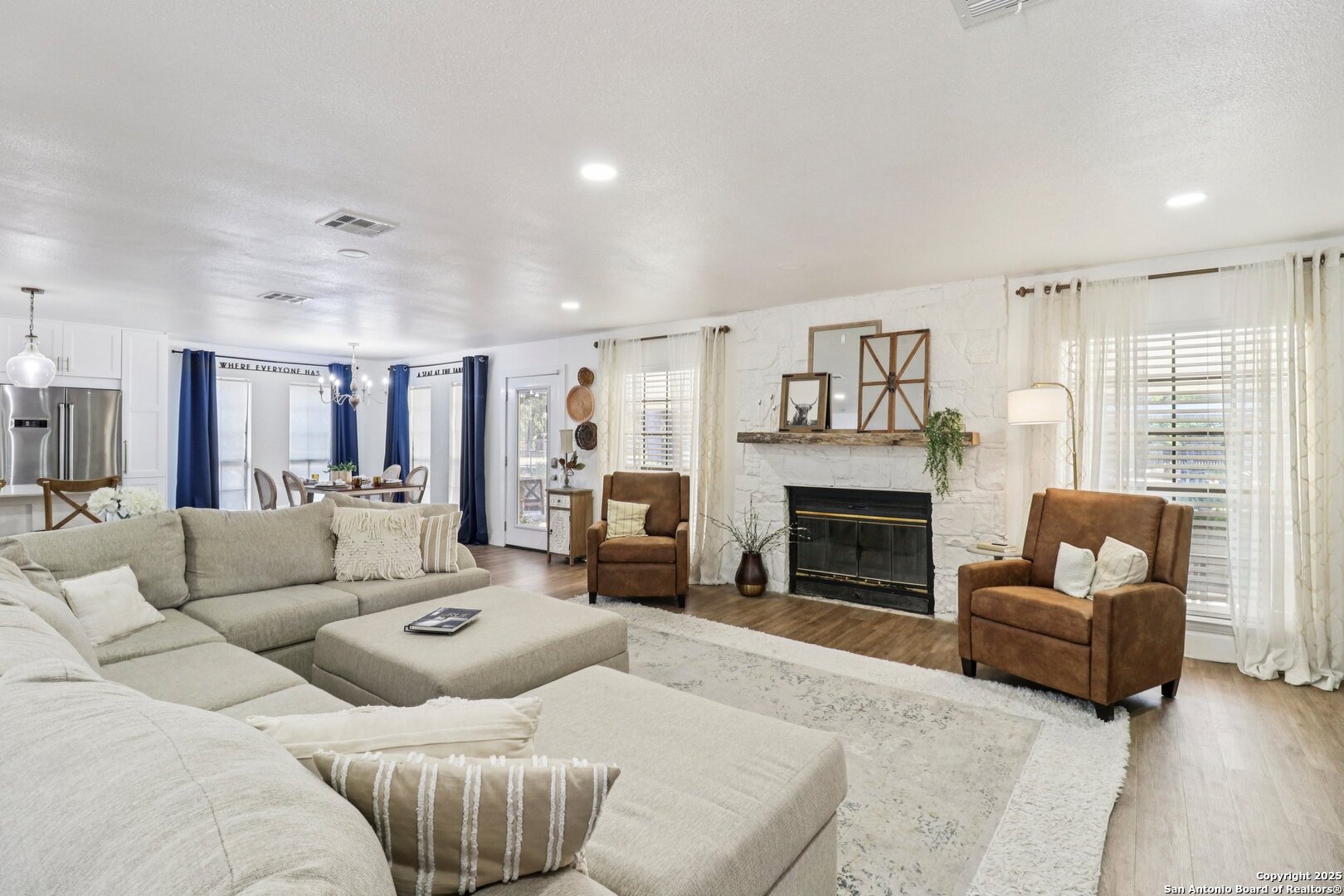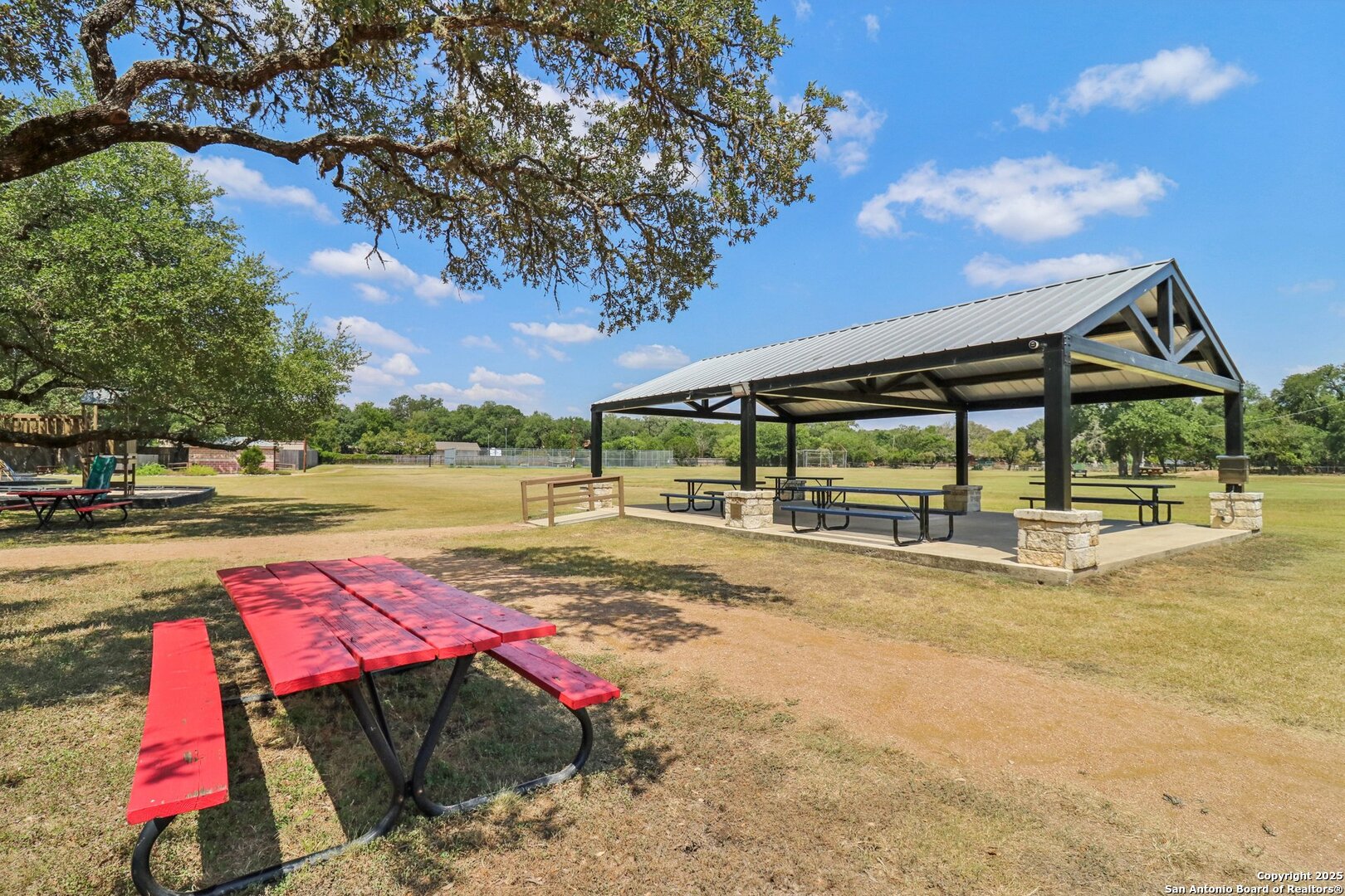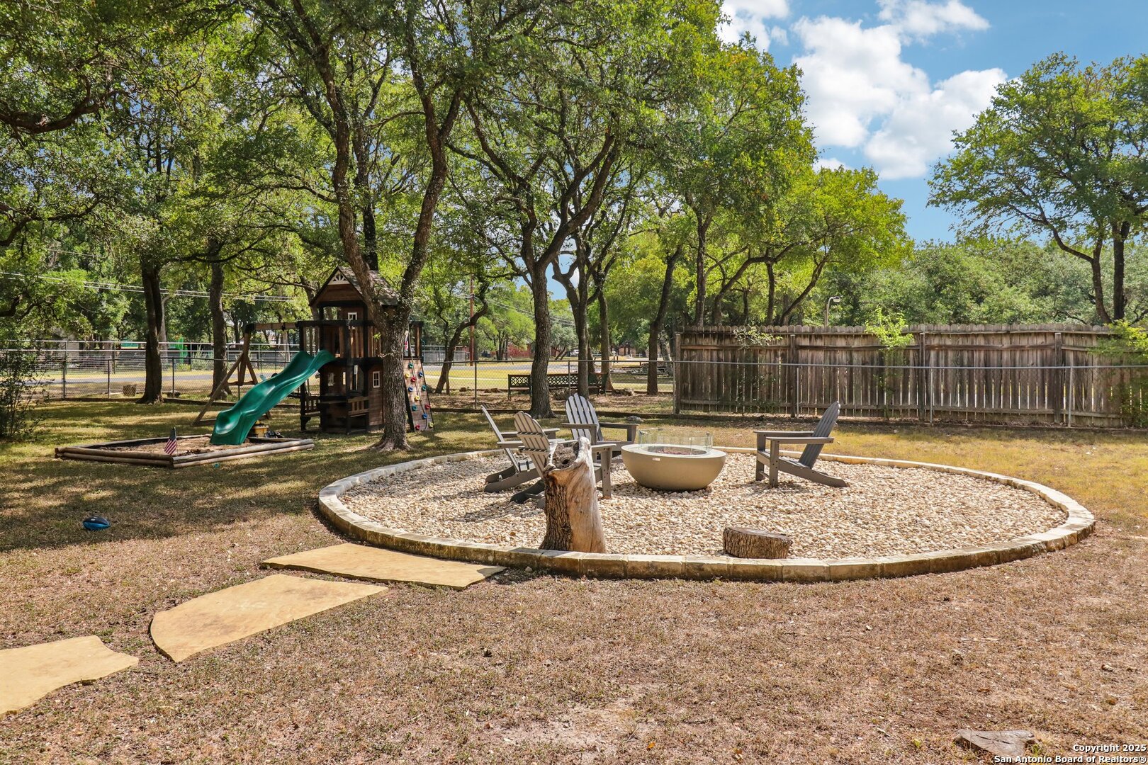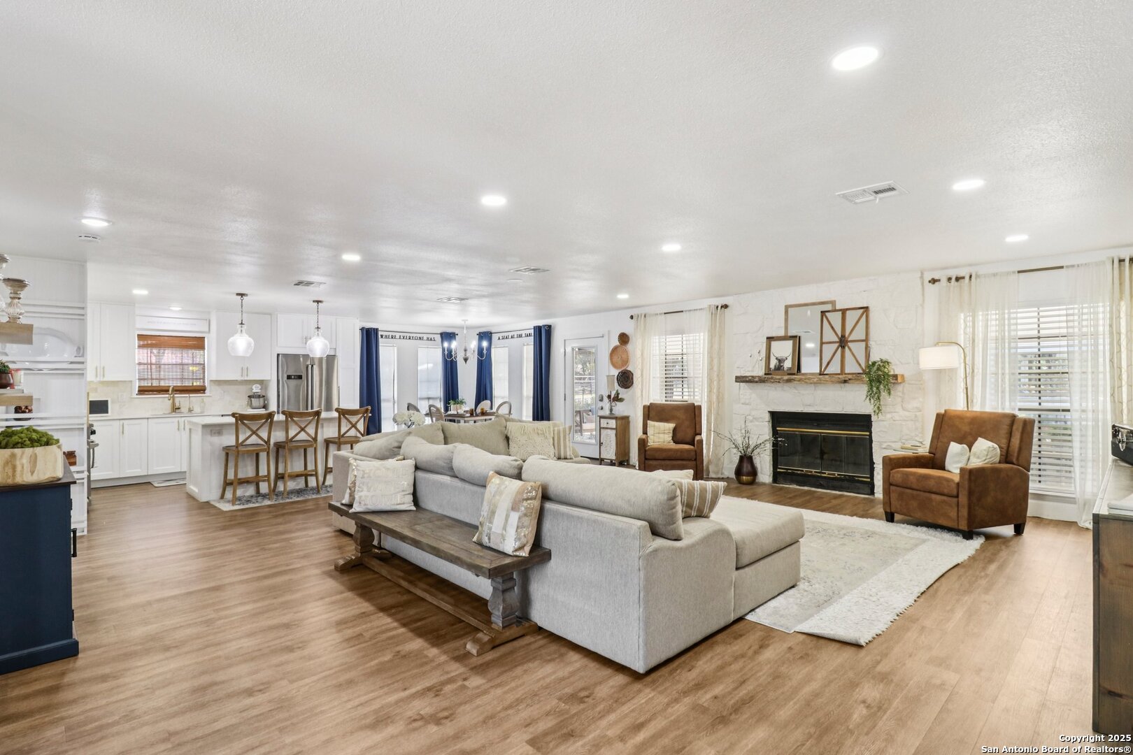 Welcome to elevated country living! Where timeless charm meets modern luxury, all nestled on a 1.23-acre corner lot with curb appeal that will stop you in your tracks. The circular drive speckled with mature trees and the warm stone exterior create a curb appeal that feels instantly welcoming and effortlessly timeless. Tucked away at the end of a quiet street with minimal traffic, the setting is peaceful and private, one of the many features that make this home so special. The recently updated interior is nothing short of breathtaking. Luxury vinyl plank floors flow seamlessly through the open-concept design, creating a cohesive and elevated feel. The spacious living room, anchored by a cozy wood-burning fireplace, invites you to curl up on cool Texas nights and enjoy the glow of the crackling fire. The living space opens directly into a stunning kitchen complete with custom cabinetry, an oversized island with breakfast bar seating, gas cooking, stainless steel appliances, and carefully chosen fixtures that balance a high-end look with a warm, lived-in feel. Just beyond, a stunning chandelier marks the dining space, while the walk-in pantry (truly the pantry of your dreams) doubles as a Butler's pantry with custom cabinetry and shelving for small appliances and storage. The primary suite is generous in size with his-and-hers closets (because one of you clearly deserves more space-don't worry, we won't say who). The ensuite bathroom has been completely transformed into a spa-worthy retreat featuring a dual-sink vanity and an oversized walk-in shower you have to see to believe. Two additional bedrooms and another fully renovated bathroom round out the interior. Step outside and you'll discover what can only be described as your very own Texas oasis. An extended covered patio with a porch swing overlooks the sparkling in-ground pool and spa. The covered outdoor kitchen is equipped with a built-in grill, sink, outdoor fridge, ceiling fan, and plenty of space for entertaining. A dedicated fire pit area and beautifully landscaped grounds with brick-lined flower beds create a setting perfect for gathering with friends and family. Beyond the pool sits a detached bonus room with electricity, ready to serve as a gym, office, studio, or whatever your lifestyle needs. The detached three-car garage and workshop is a standout feature-not just oversized, but purpose-built for cars, boats, or RVs. With dedicated power, internet, and two mini-split A/C units, this space is as functional as it is versatile. Whether you need a workshop, storage, or a hobby haven, this shop is a true highlight of the property. There's even a drive-through awning and a landscaped playscape area that will stay with the home. With a new roof and HVAC installed in 2021, permanent LED holiday lighting, and countless thoughtful upgrades, this property offers convenience with undeniable style. All of this is tucked into a community that offers a park, pickleball and basketball courts, a baseball field, and walking trails. Minutes from 281, you'll have easy access into town while enjoying the privacy and tranquility of country living. This is more than just a home-it's the lifestyle you've been waiting for.