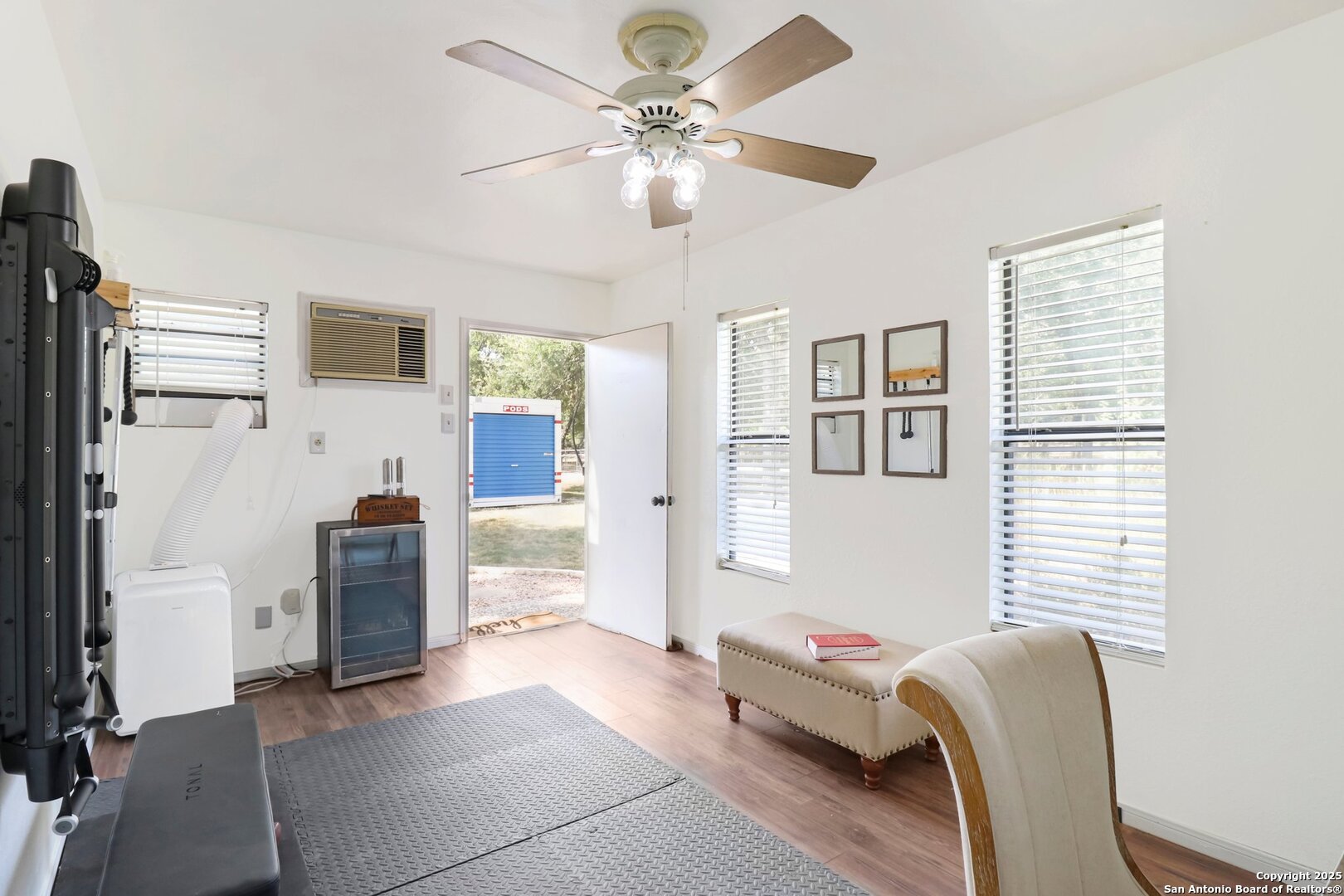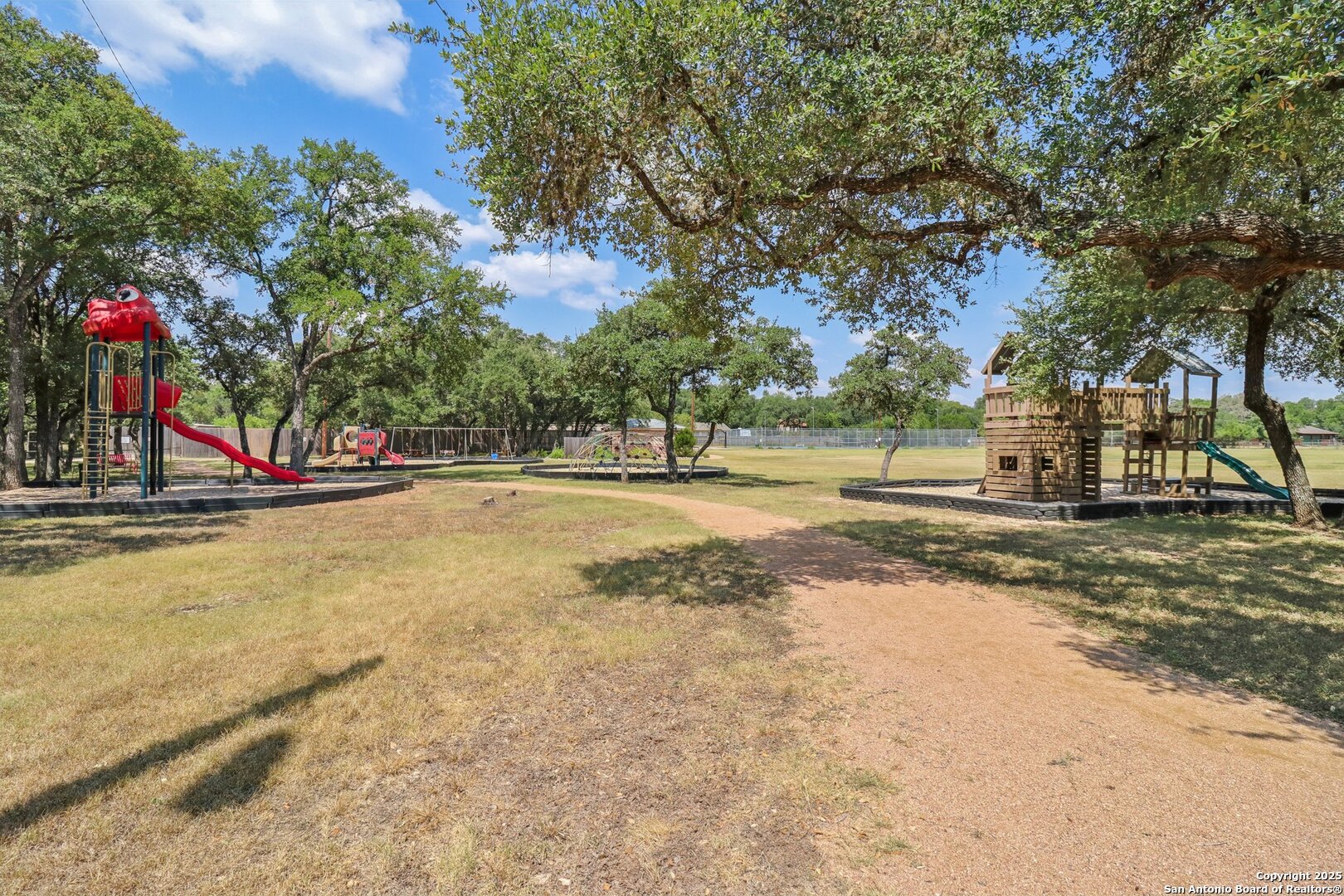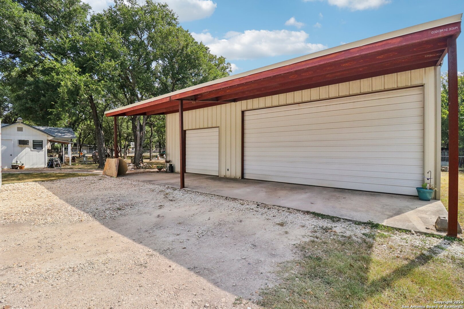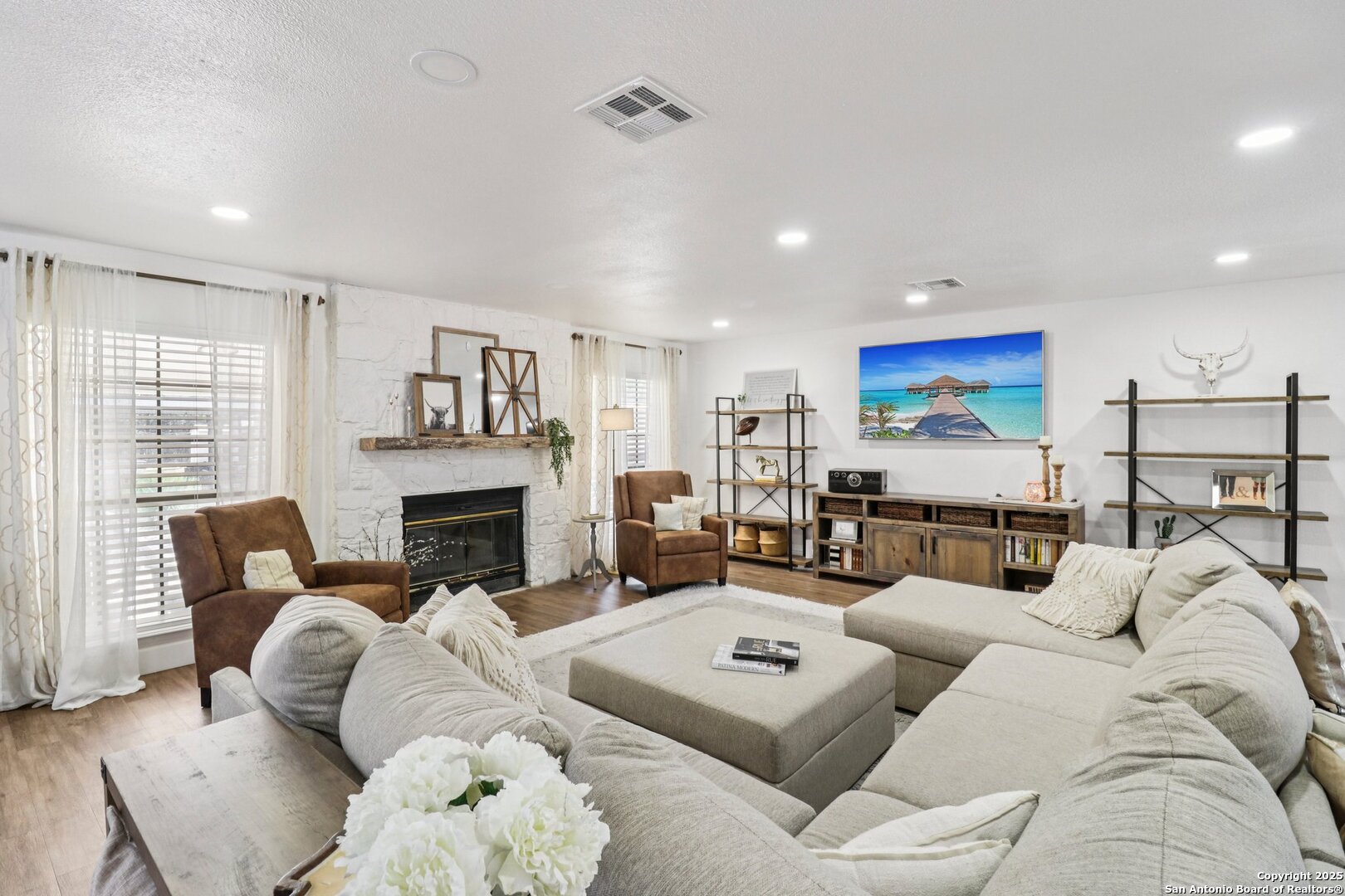 Welcome to elevated country living! Where timeless charm meets modern luxury, all nestled on a 1.23-acre corner lot with curb appeal that will stop you in your tracks. The circular drive speckled with mature trees and the warm stone exterior create a curb appeal that feels instantly welcoming and effortlessly timeless. Tucked away at the end of a quiet street with minimal traffic, the setting is peaceful and private, one of the many features that make this home so special. The recently updated interior is nothing short of breathtaking. Luxury vinyl plank floors flow seamlessly through the open-concept design, creating a cohesive and elevated feel. The spacious living room, anchored by a cozy wood-burning fireplace, invites you to curl up on cool Texas nights and enjoy the glow of the crackling fire. The living space opens directly into a stunning kitchen complete with custom cabinetry, an oversized island with breakfast bar seating, gas cooking, stainless steel appliances, and carefully chosen fixtures that balance a high-end look with a warm, lived-in feel. Just beyond, a stunning chandelier marks the dining space, while the walk-in pantry (truly the pantry of your dreams) doubles as a Butler's pantry with custom cabinetry and shelving for small appliances and storage. The primary suite is generous in size with his-and-hers closets (because one of you clearly deserves more space-don't worry, we won't say who). The ensuite bathroom has been completely transformed into a spa-worthy retreat featuring a dual-sink vanity and an oversized walk-in shower you have to see to believe. Two additional bedrooms and another fully renovated bathroom round out the interior. Step outside and you'll discover what can only be described as your very own Texas oasis. An extended covered patio with a porch swing overlooks the sparkling in-ground pool and spa. The covered outdoor kitchen is equipped with a built-in grill, sink, outdoor fridge, ceiling fan, and plenty of space for entertaining. A dedicated fire pit area and beautifully landscaped grounds with brick-lined flower beds create a setting perfect for gathering with friends and family. Beyond the pool sits a detached bonus room with electricity, ready to serve as a gym, office, studio, or whatever your lifestyle needs. The detached three-car garage and workshop is a standout feature-not just oversized, but purpose-built for cars, boats, or RVs. With dedicated power, internet, and two mini-split A/C units, this space is as functional as it is versatile. Whether you need a workshop, storage, or a hobby haven, this shop is a true highlight of the property. There's even a drive-through awning and a landscaped playscape area that will stay with the home. With a new roof and HVAC installed in 2021, permanent LED holiday lighting, and countless thoughtful upgrades, this property offers convenience with undeniable style. All of this is tucked into a community that offers a park, pickleball and basketball courts, a baseball field, and walking trails. Minutes from 281, you'll have easy access into town while enjoying the privacy and tranquility of country living. This is more than just a home-it's the lifestyle you've been waiting for.
