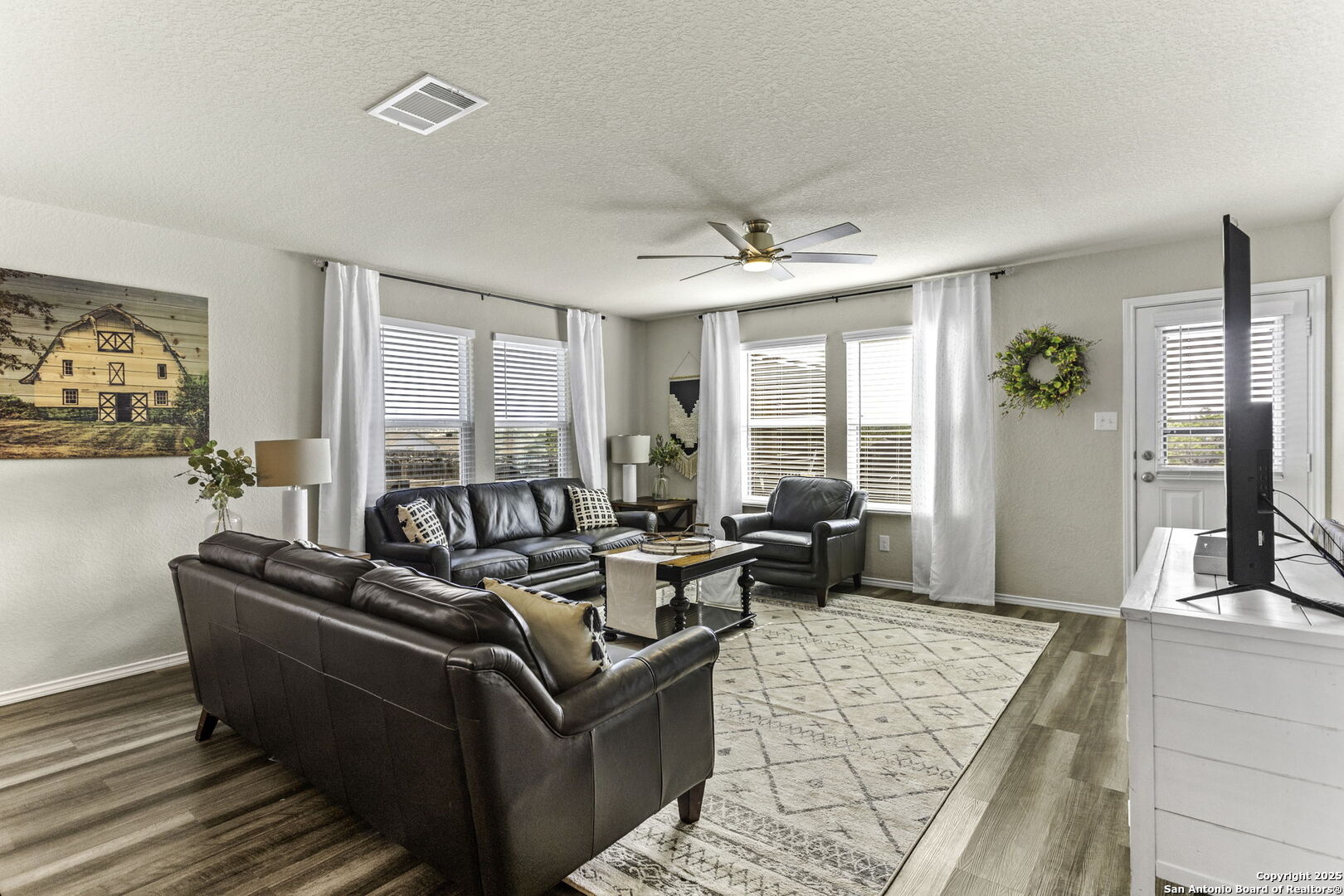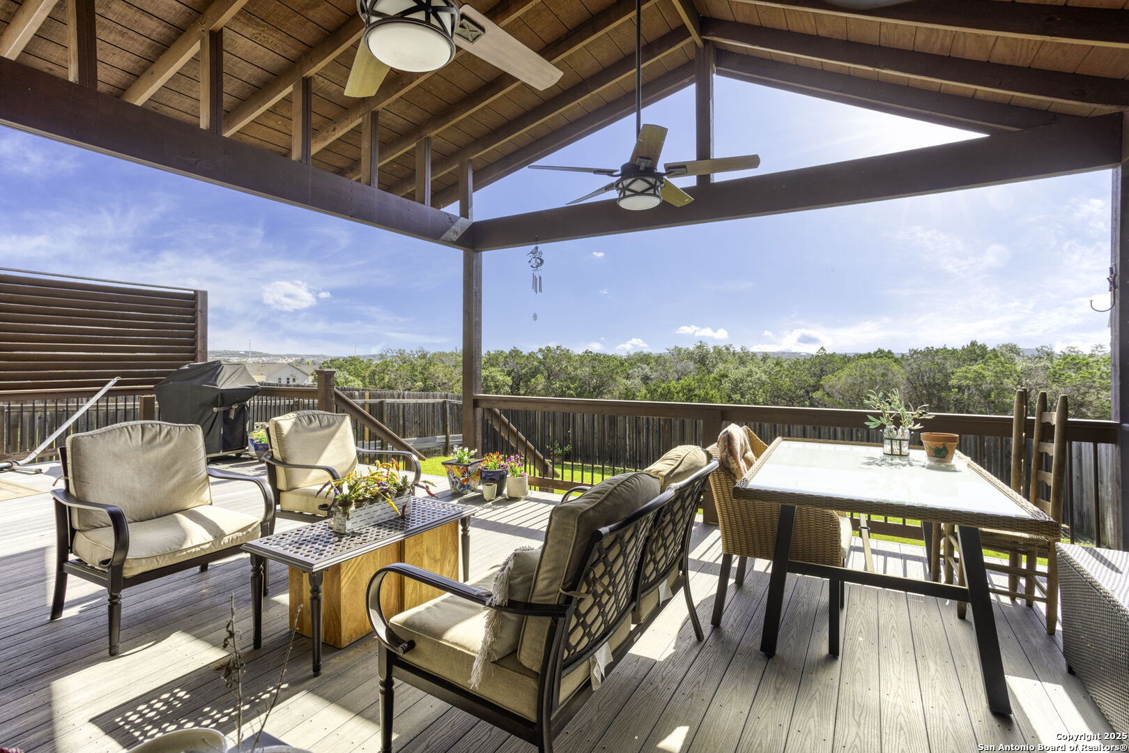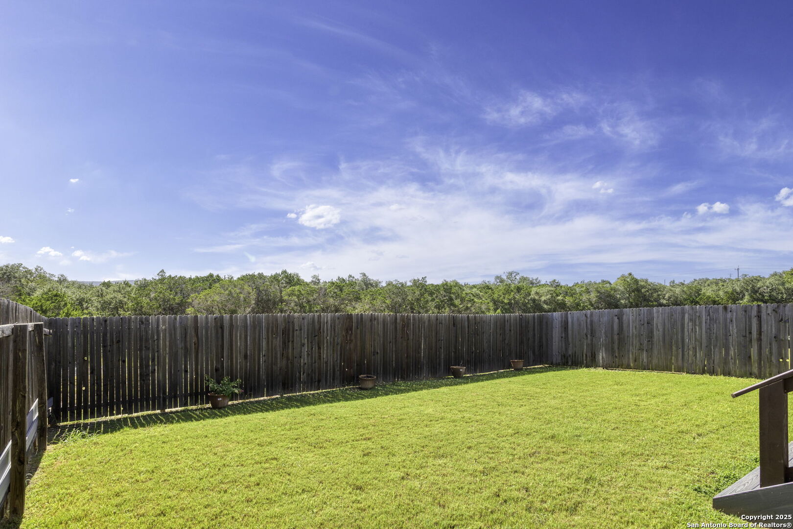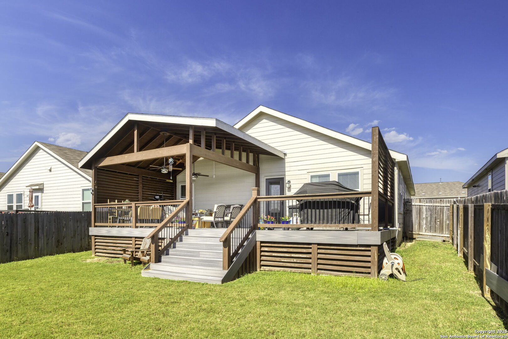 Located in the tranquil and desirable Hidden Trails community within Johnson Ranch, this impeccably maintained 3 bedroom, 2 bathroom home sits on a premium lot that backs up to a lush greenbelt. The stunning, expansive backyard deck consists of two walls on each side for ultimate privacy, and offers breathtaking views of the Hill Country. The deck is made from composite boards resistant to fading, staining, mold, and rot, and perfect for entertaining or unwinding after a busy day. Step inside to discover a spacious open-concept living area, modern kitchen featuring sleek countertops, stainless steel appliances, and gas cook top. The large built-in island flows effortlessly into the dining area and warm family room with views of your private, fully fenced backyard and green belt view. This Lennar home offers the Gannes floor plan featuring 2 full shower/tub combo bathrooms, 3 large bedrooms and a 2 car garage. Step outside to enjoy resort-style amenities, including: Splash pad for kids, Junior Olympic-sized lap pool, infinity pool and 24/7 gym, fitness center, community center and clubhouse. Additional amenities include Two playgrounds, one featuring a zip line, biking and walking trails, a dog-friendly park, BBQ areas, Basketball courts, and a Catch-and-release fishing pond.