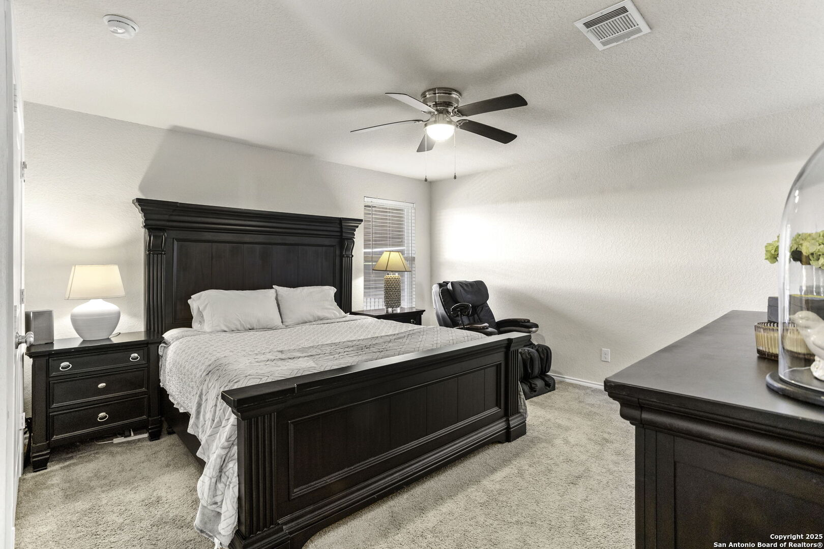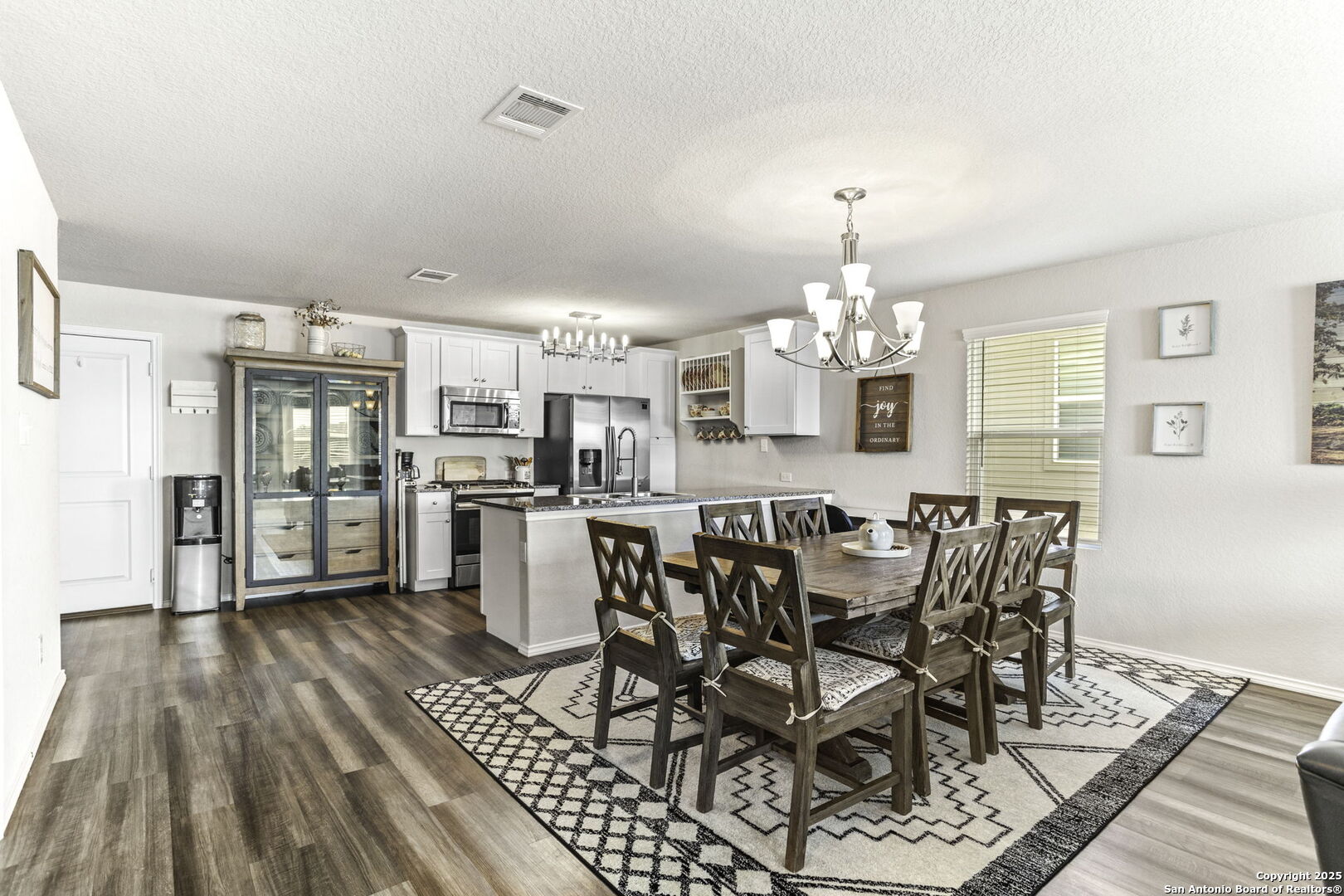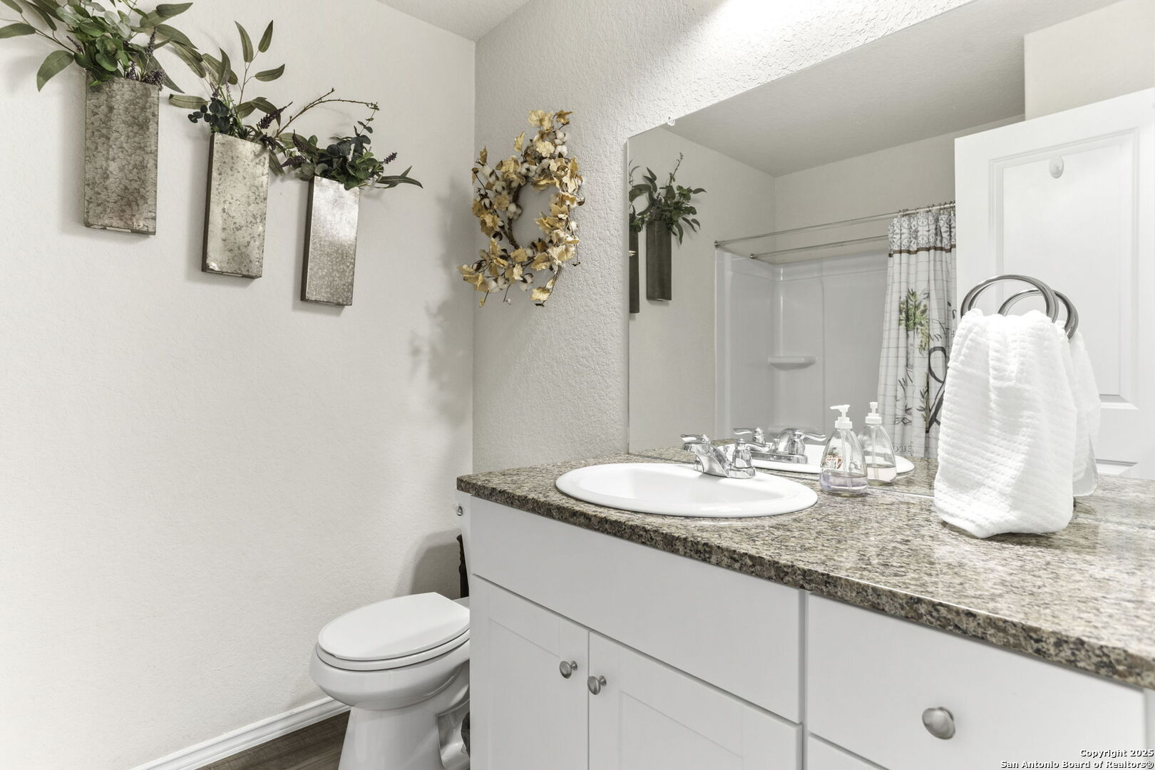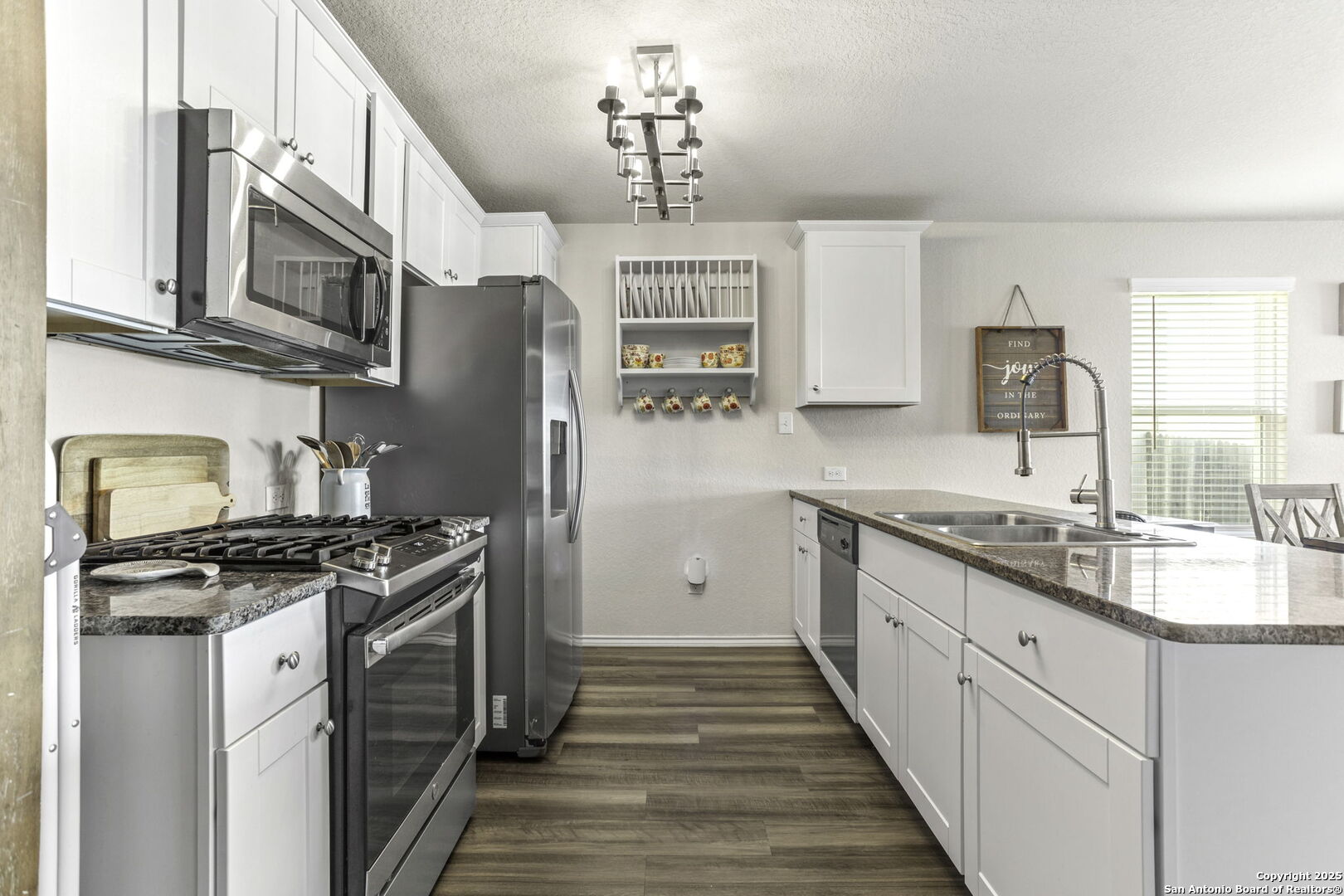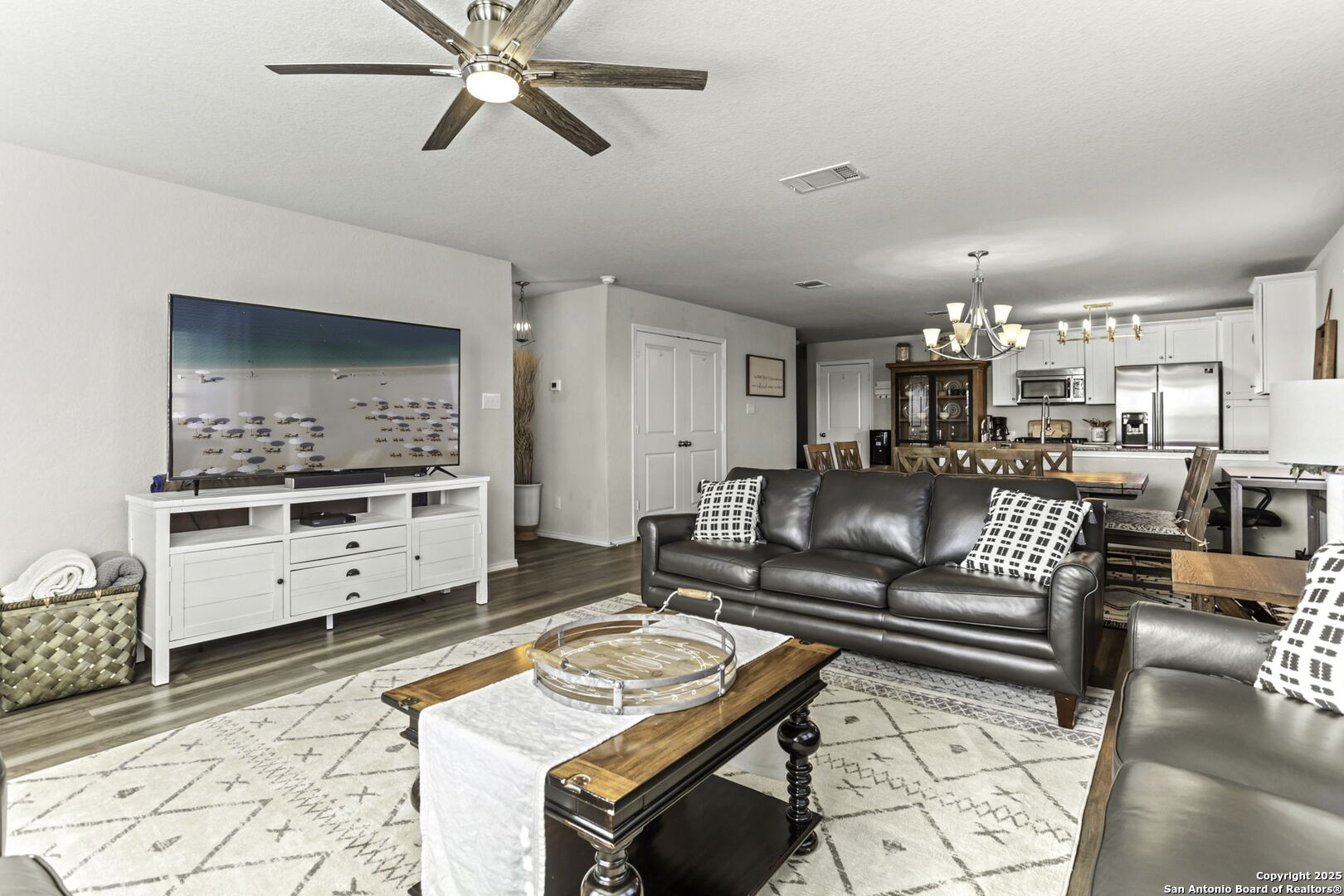Located in the tranquil and desirable Hidden Trails community within Johnson Ranch, this impeccably maintained 3 bedroom, 2 bathroom home sits on a premium lot that backs up to a lush greenbelt. The stunning, expansive backyard deck consists of two walls on each side for ultimate privacy, and offers breathtaking views of the Hill Country. The deck is made from composite boards resistant to fading, staining, mold, and rot, and perfect for entertaining or unwinding after a busy day. Step inside to discover a spacious open-concept living area, modern kitchen featuring sleek countertops, stainless steel appliances, and gas cook top. The large built-in island flows effortlessly into the dining area and warm family room with views of your private, fully fenced backyard and green belt view. This Lennar home offers the Gannes floor plan featuring 2 full shower/tub combo bathrooms, 3 large bedrooms and a 2 car garage. Step outside to enjoy resort-style amenities, including: Splash pad for kids, Junior Olympic-sized lap pool, infinity pool and 24/7 gym, fitness center, community center and clubhouse. Additional amenities include Two playgrounds, one featuring a zip line, biking and walking trails, a dog-friendly park, BBQ areas, Basketball courts, and a Catch-and-release fishing pond.
