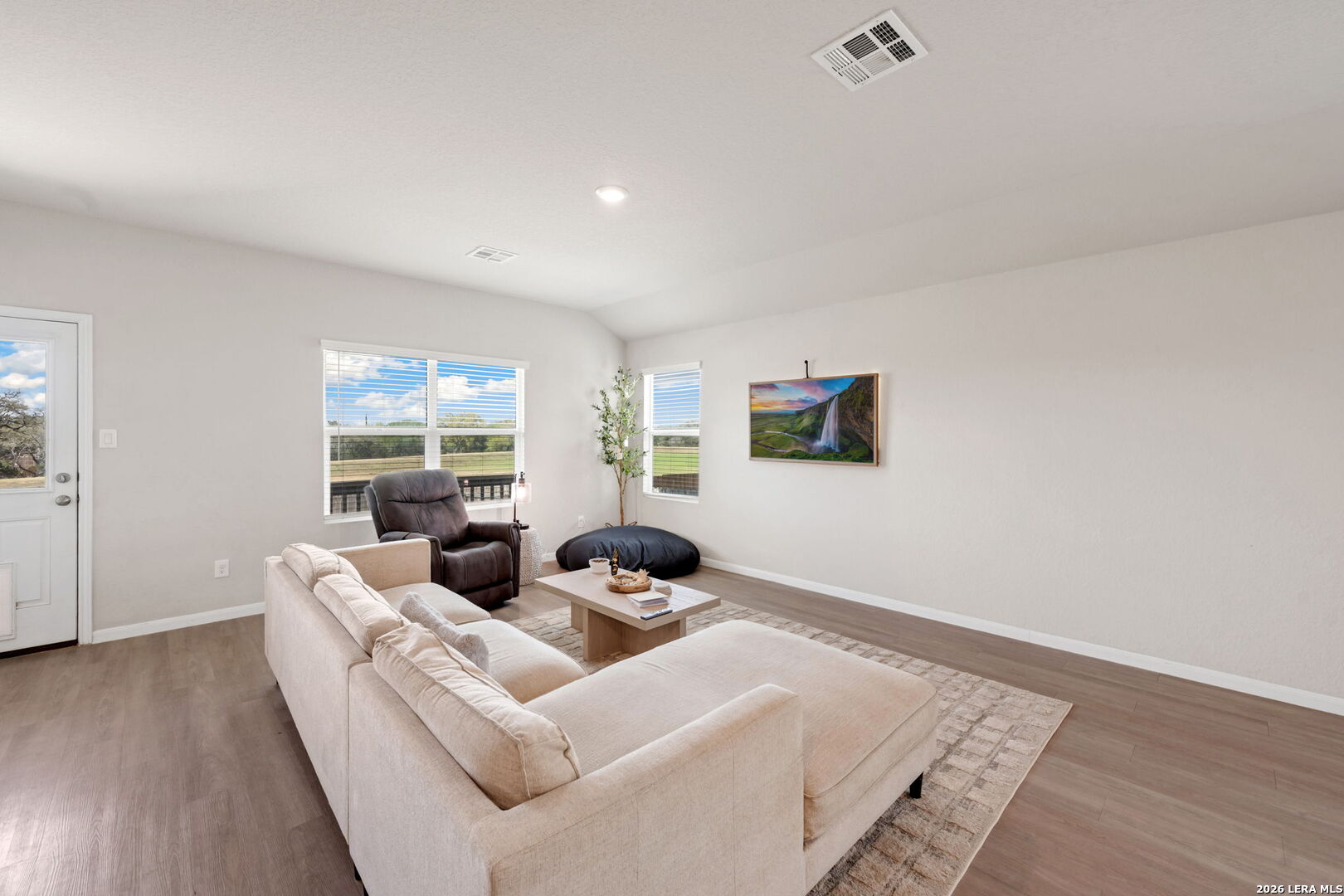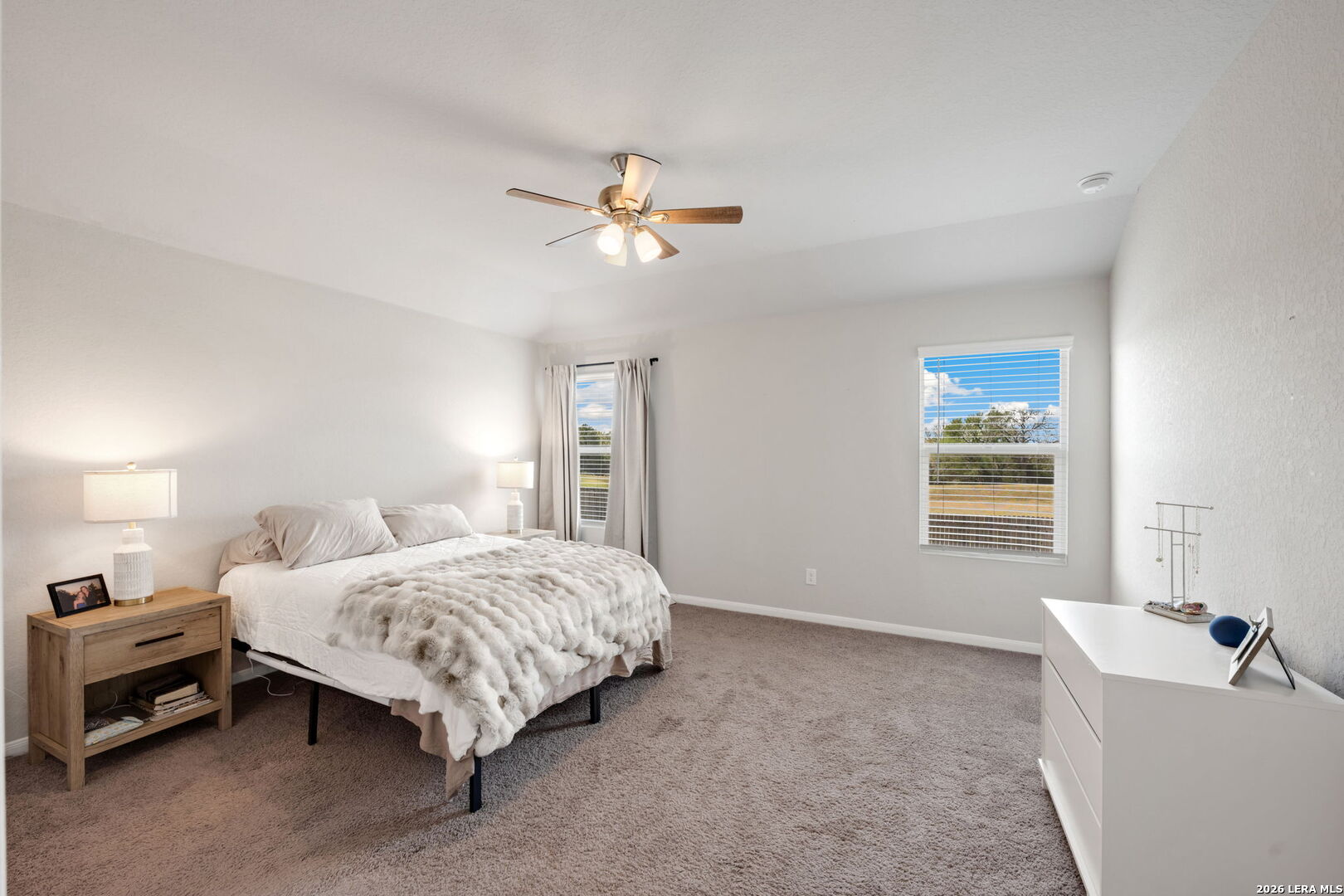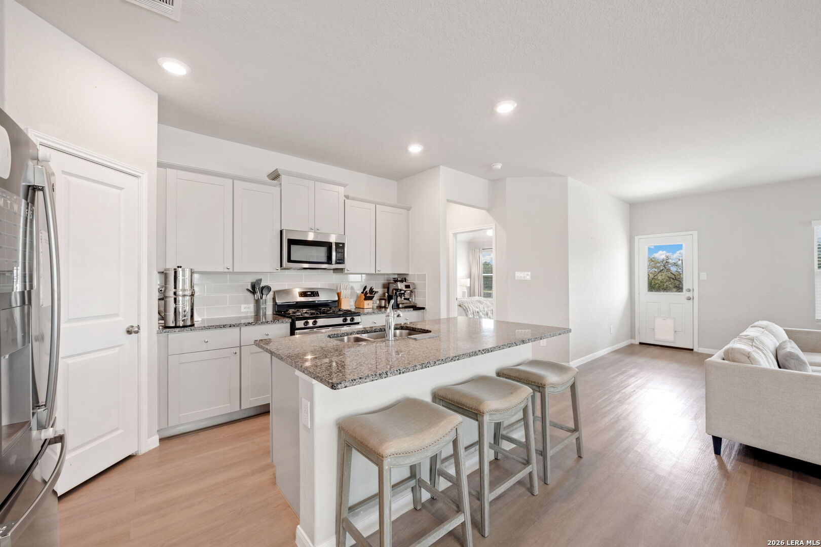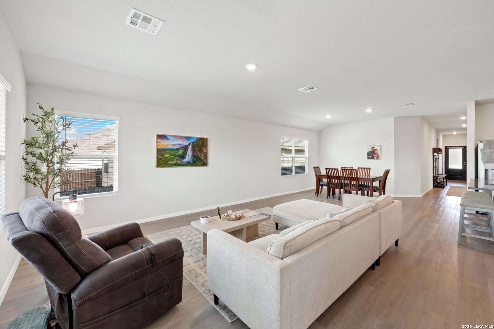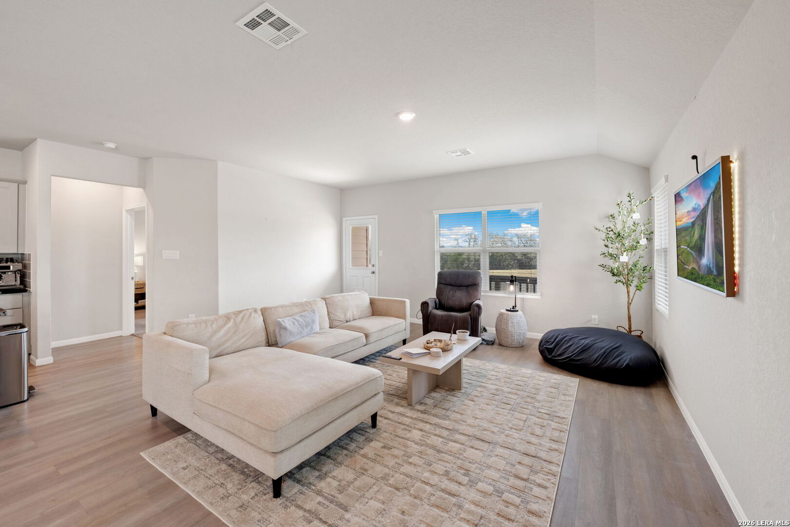Enjoy breathtaking views of the Texas Hill Country in this beautiful, move-in-ready home in Hidden Trails. The home features a fantastic open-concept floor plan with 4 bedrooms and 2 full baths, elegant kitchen cabinetry, a spacious kitchen pantry, a luxurious walk-in shower, and a HUGE custom master closet. The spacious kitchen has granite countertops, a massive island and sitting bar, abundant cabinetry, and energy-efficient appliances, opening seamlessly to the living and dining areas-ideal for everyday living and entertaining. Step outside and enjoy the incredile view overlooking a lucious, private greenbelt with a private gate for direct access. The covered patio with an upgraded 12x20 slab and full fenced backyard provide plenty of opportunity for your backyard fun. A full sprinkler system makes maintenance easy. The private primary suite is tucked at the back of the home and includes a double vanity, oversized walk-in shower, and large walk-in closet. Additional features include blinds, water softener, programmable thermostat, Ring camera, and a fully decked attic for extra storage. Enjoy resort-style living in Hidden Trails with top-rated Comal ISD schools. Amenities include an infinity pool, Junior Olympic pool, clubhouse, fitness center, trails, playgrounds, basketball courts, fishing pond, and frequent community events. Conveniently located off Hwy 281-just minutes to shopping, dining, and medical, 30 minutes to San Antonio Airport, and 20 minutes to Canyon Lake.