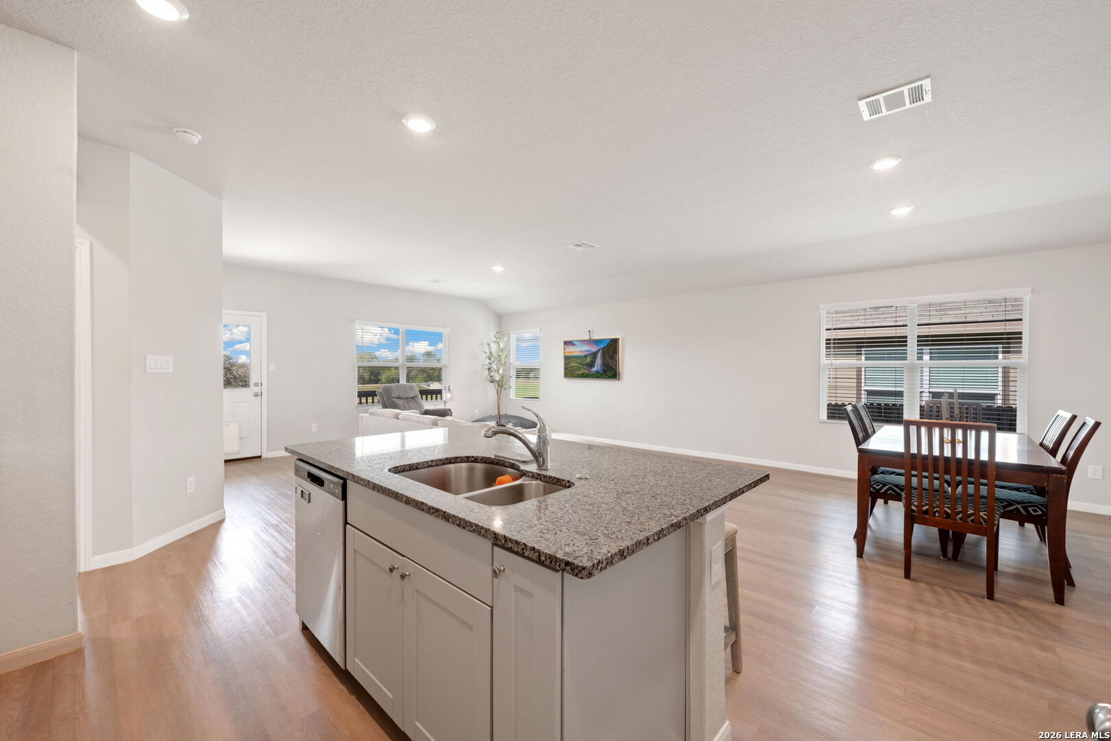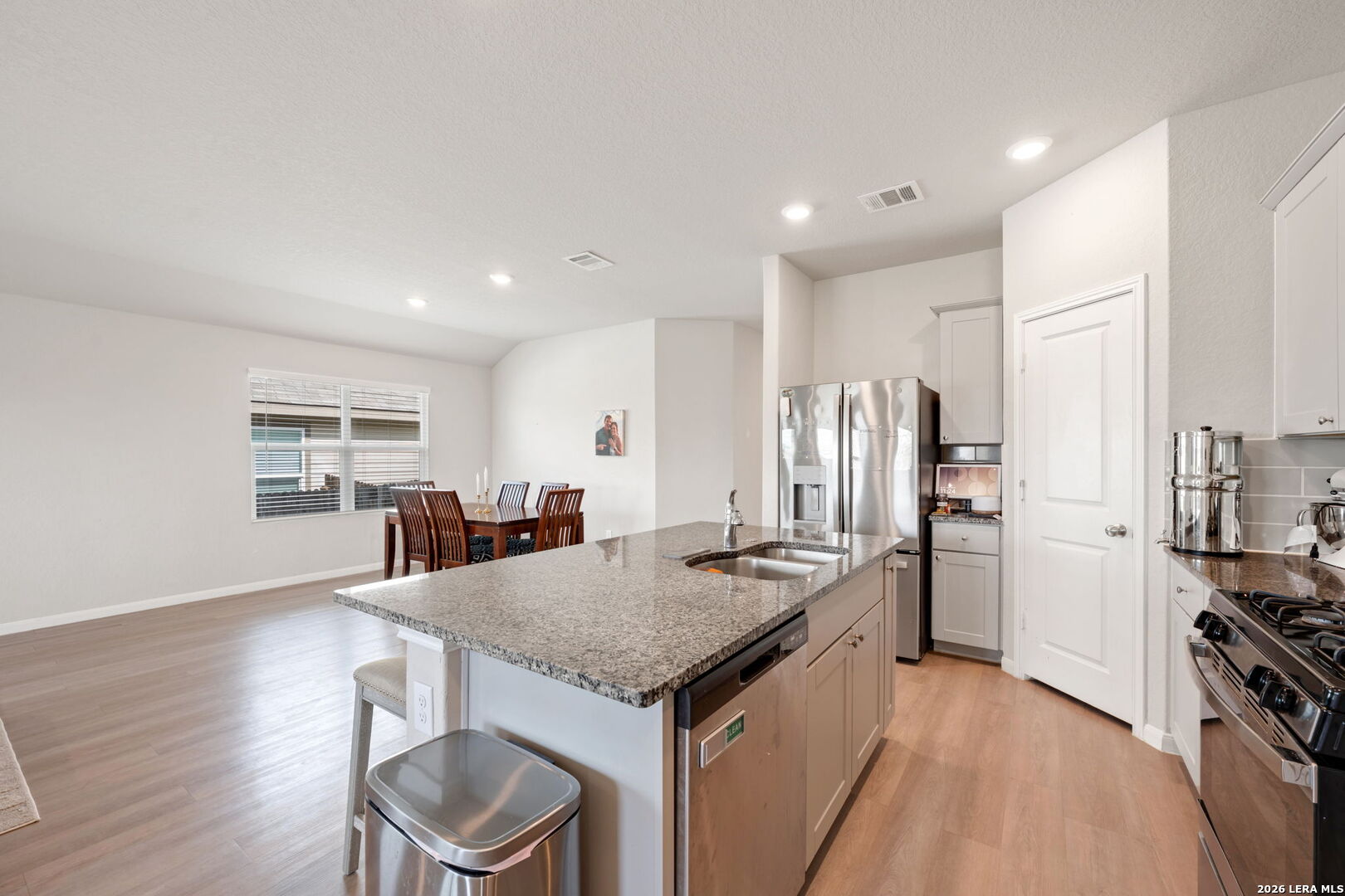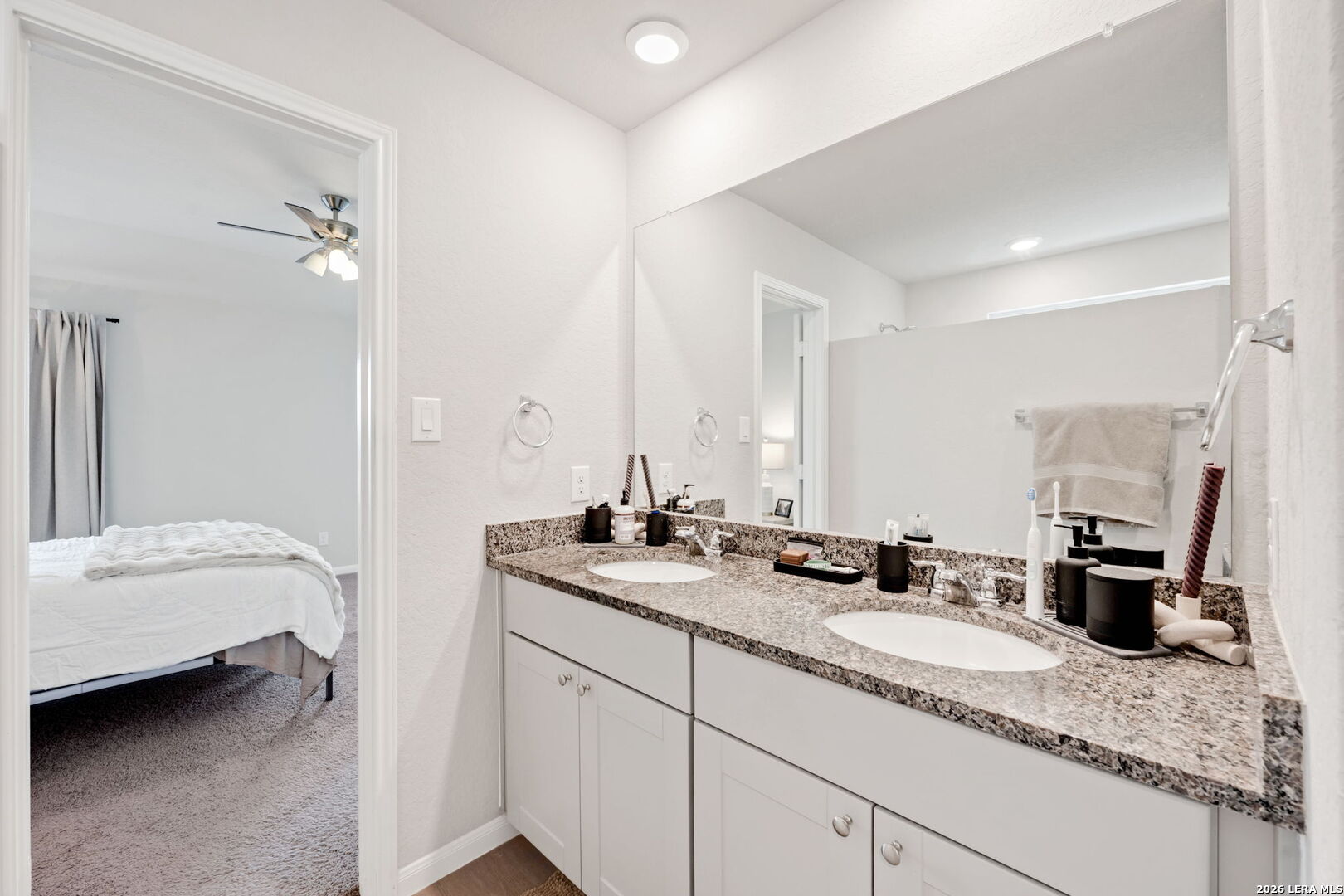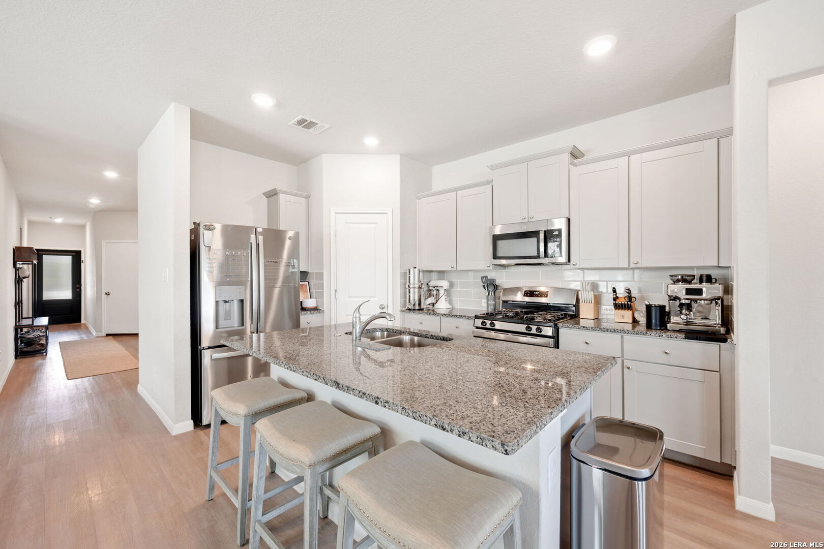Enjoy breathtaking views of the Texas Hill Country in this beautiful, move-in-ready home in Hidden Trails. The home features a fantastic open-concept floor plan with 4 bedrooms and 2 full baths, elegant kitchen cabinetry, a spacious kitchen pantry, a luxurious walk-in shower, and a HUGE custom master closet. The spacious kitchen has granite countertops, a massive island and sitting bar, abundant cabinetry, and energy-efficient appliances, opening seamlessly to the living and dining areas-ideal for everyday living and entertaining. Step outside and enjoy the incredile view overlooking a lucious, private greenbelt with a private gate for direct access. The covered patio with an upgraded 12x20 slab and full fenced backyard provide plenty of opportunity for your backyard fun. A full sprinkler system makes maintenance easy. The private primary suite is tucked at the back of the home and includes a double vanity, oversized walk-in shower, and large walk-in closet. Additional features include blinds, water softener, programmable thermostat, Ring camera, and a fully decked attic for extra storage. Enjoy resort-style living in Hidden Trails with top-rated Comal ISD schools. Amenities include an infinity pool, Junior Olympic pool, clubhouse, fitness center, trails, playgrounds, basketball courts, fishing pond, and frequent community events. Conveniently located off Hwy 281-just minutes to shopping, dining, and medical, 30 minutes to San Antonio Airport, and 20 minutes to Canyon Lake.