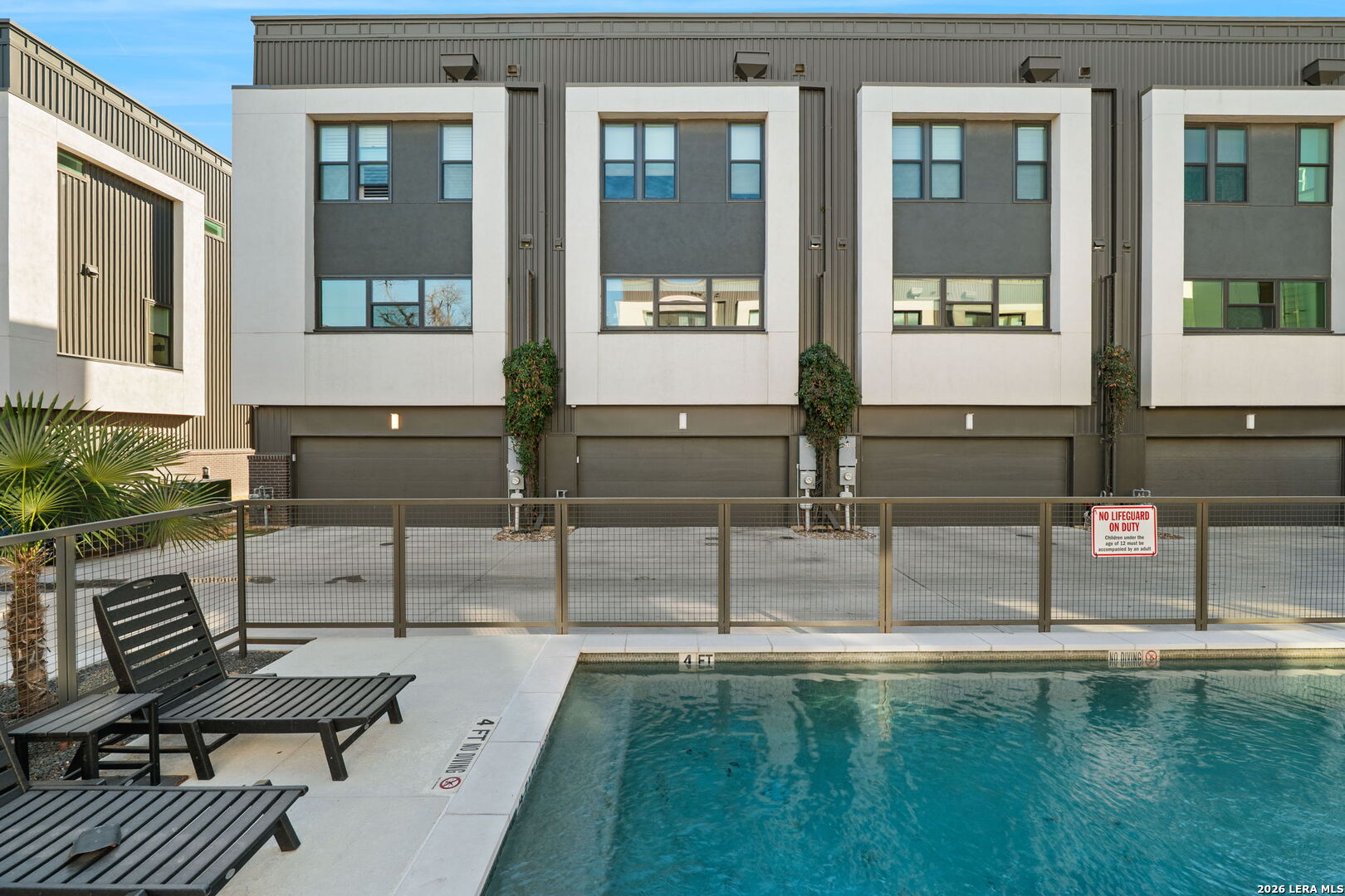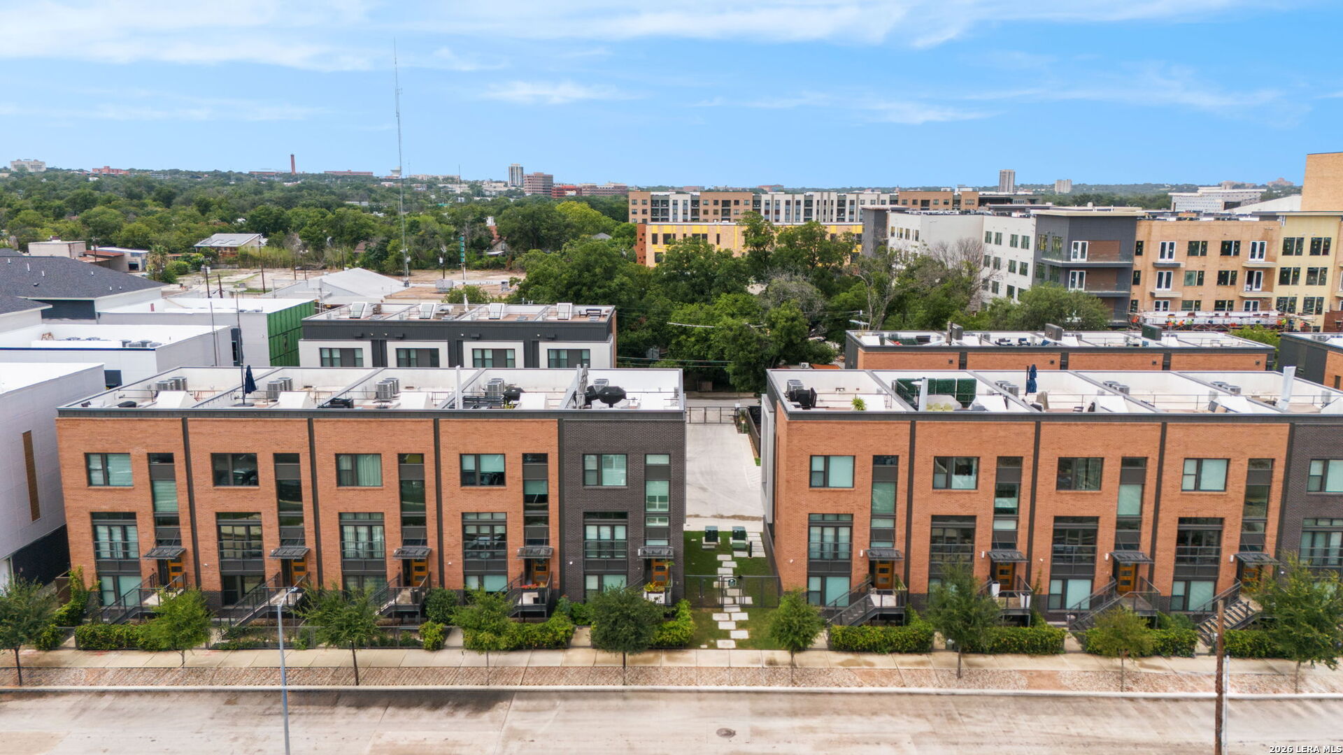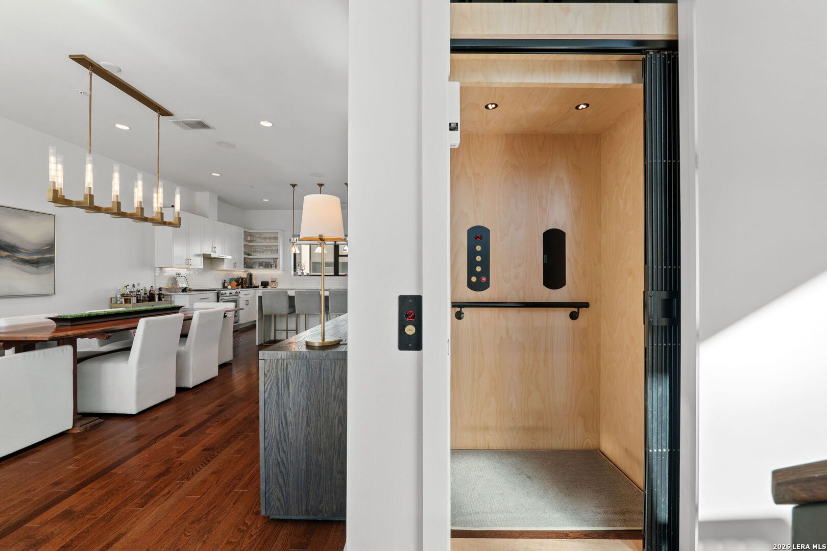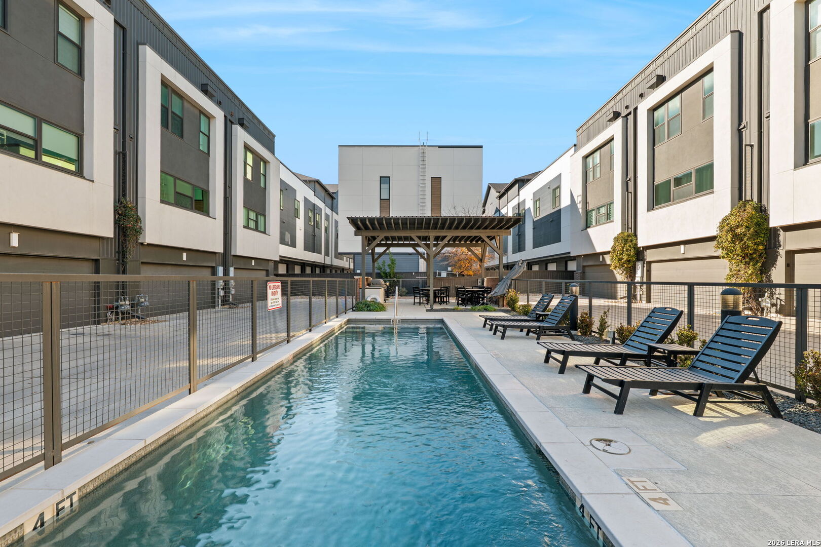 Offering signature styled relaxed luxury, this SOJO Commons urban brownstone in the beloved Pearl District offers abundantly spectacular upgrades and design enhancements classically curated to create the ultimate lock and leave lifestyle. Culinary performance kitchen features custom Arabescato quartz counters, stunning island with waterfall edge counter, KitchenAid appliances including gas cooking, separate beverage refrigerator, wine storage and custom built-in pantry shelving. Stunning primary retreat with pendant lighting, soothing spa quality bath with slate flooring, upgraded quartz counters with dual vanities, glass shelving/bench in the large walk-in shower and custom designed concept closet. Brilliant guest bathroom updates feature high quality cabinetry and custom closets and high-end marble countertops. Restoration Hardware contemporary fixtures, hardware and lighting. Smart home technology including app enabled door lock capability with camera, voice activated controls for lighting and window treatments. Residential elevator with enhanced cab detail and commercial style metal door. Unit amenities include an intimate rooftop deck with 360-degree city views, fire pit and extensive outdoor seating, a 2-car attached garage with 220V EV charger and epoxy flooring. SOJO Commons provides two gated vehicular entrances, personal pedestrian access gates and private swimming pool with outdoor cabana and grilling station. Celebrate living moments from The Historic Pearl and famed San Antonio Riverwalk - a cultural mecca offering entertainment, hospitality, shopping and restaurants.