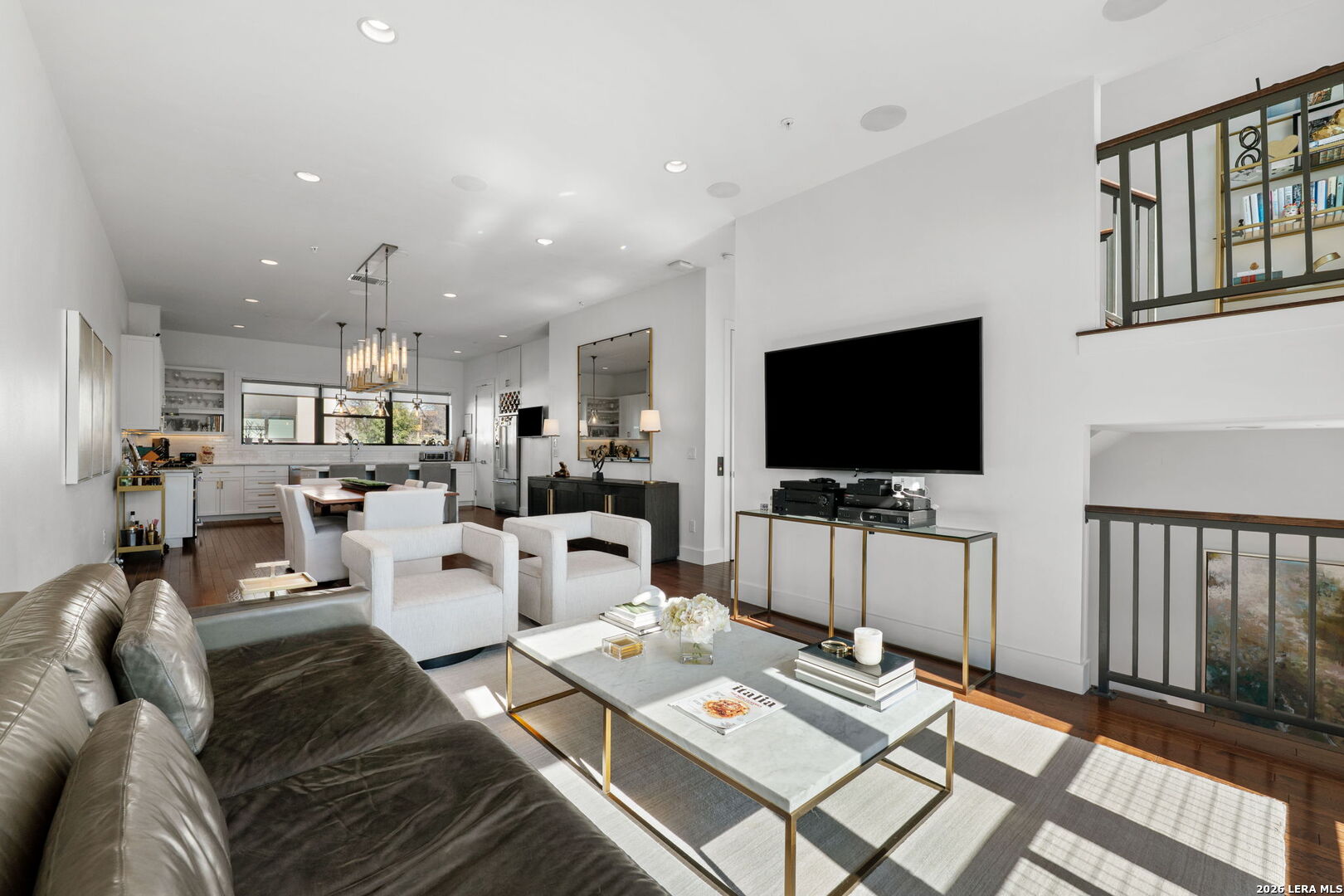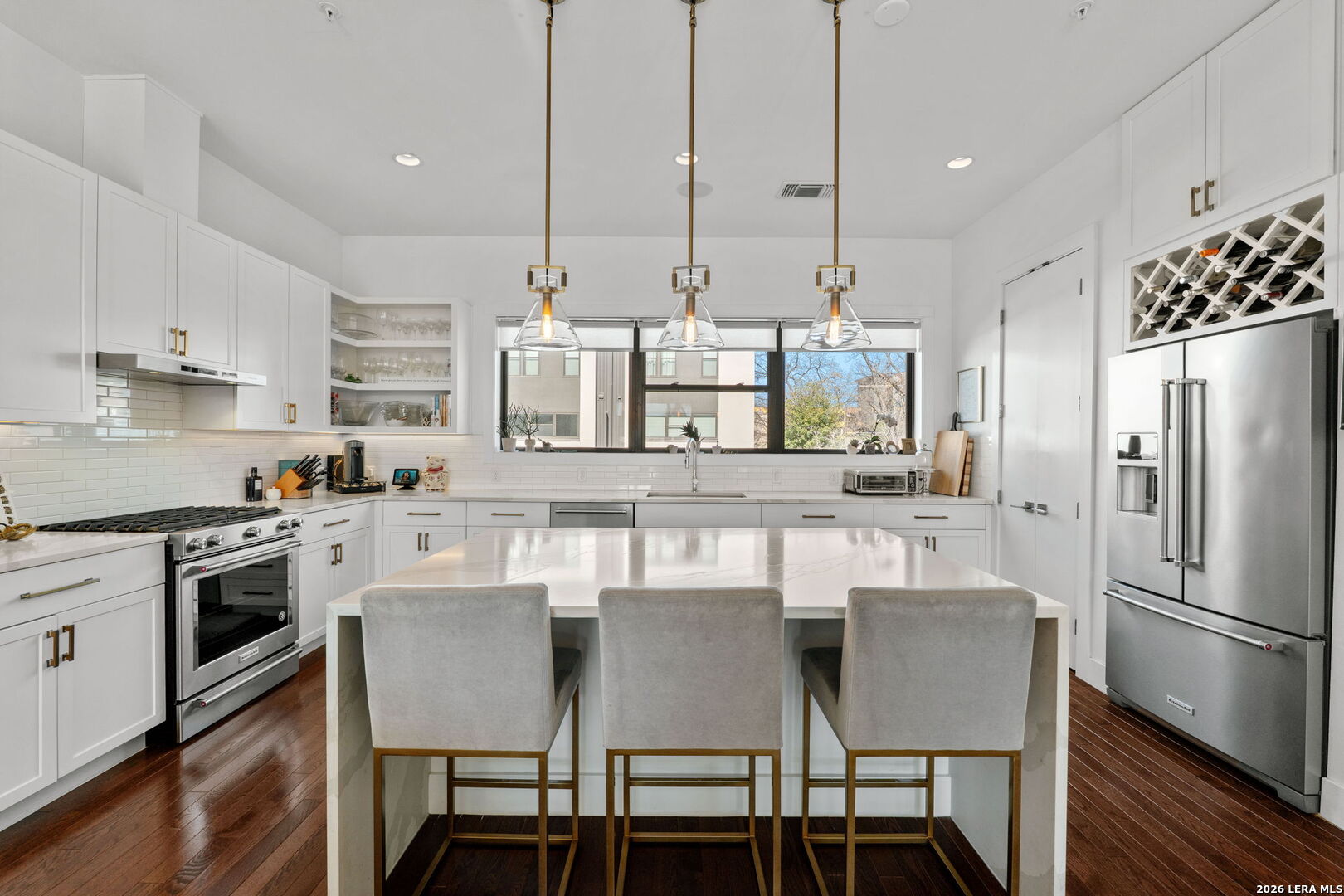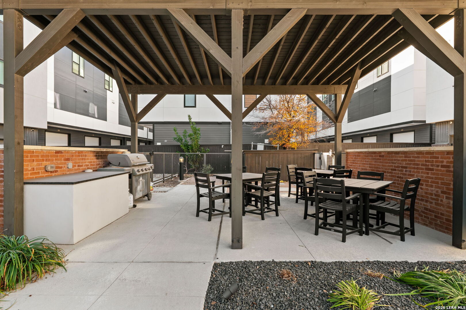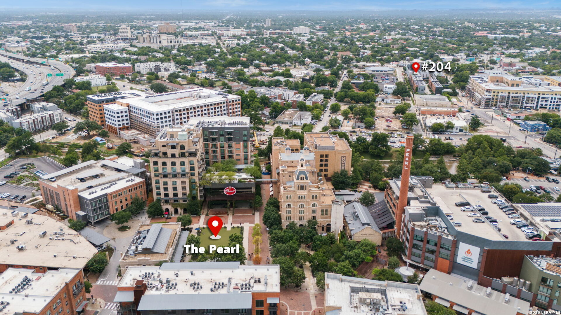 Offering signature styled relaxed luxury, this SOJO Commons urban brownstone in the beloved Pearl District offers abundantly spectacular upgrades and design enhancements classically curated to create the ultimate lock and leave lifestyle. Culinary performance kitchen features custom Arabescato quartz counters, stunning island with waterfall edge counter, KitchenAid appliances including gas cooking, separate beverage refrigerator, wine storage and custom built-in pantry shelving. Stunning primary retreat with pendant lighting, soothing spa quality bath with slate flooring, upgraded quartz counters with dual vanities, glass shelving/bench in the large walk-in shower and custom designed concept closet. Brilliant guest bathroom updates feature high quality cabinetry and custom closets and high-end marble countertops. Restoration Hardware contemporary fixtures, hardware and lighting. Smart home technology including app enabled door lock capability with camera, voice activated controls for lighting and window treatments. Residential elevator with enhanced cab detail and commercial style metal door. Unit amenities include an intimate rooftop deck with 360-degree city views, fire pit and extensive outdoor seating, a 2-car attached garage with 220V EV charger and epoxy flooring. SOJO Commons provides two gated vehicular entrances, personal pedestrian access gates and private swimming pool with outdoor cabana and grilling station. Celebrate living moments from The Historic Pearl and famed San Antonio Riverwalk - a cultural mecca offering entertainment, hospitality, shopping and restaurants.