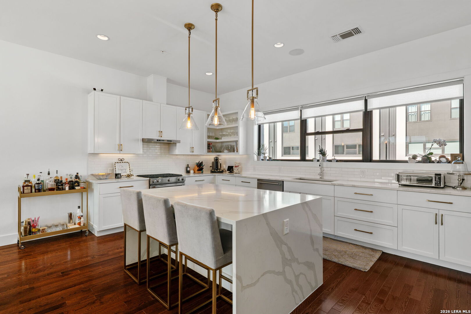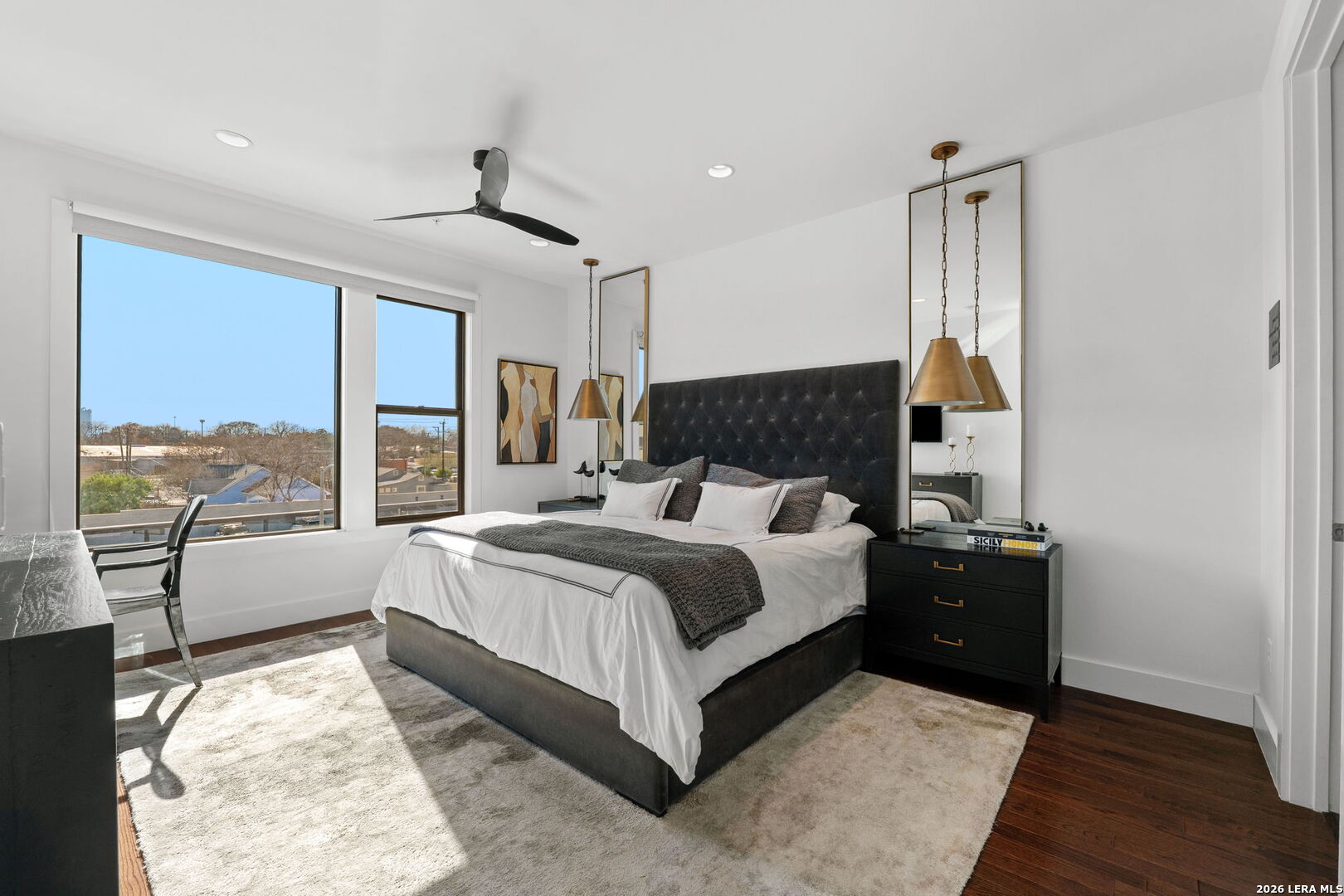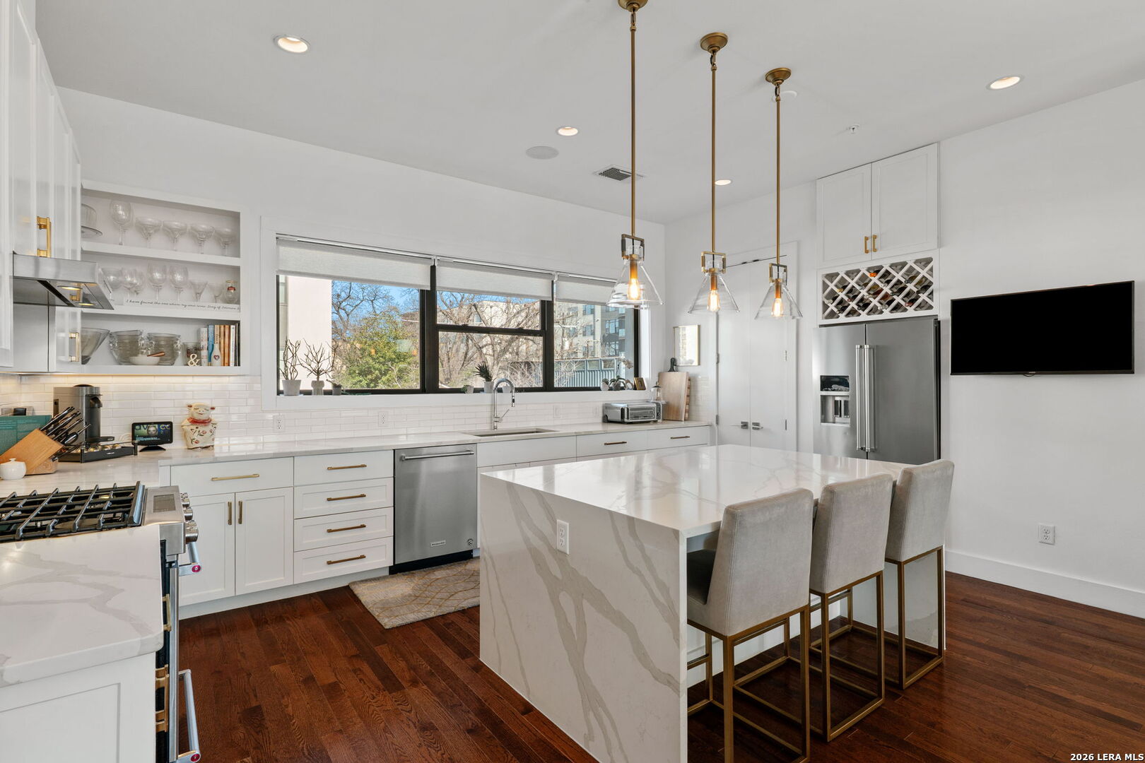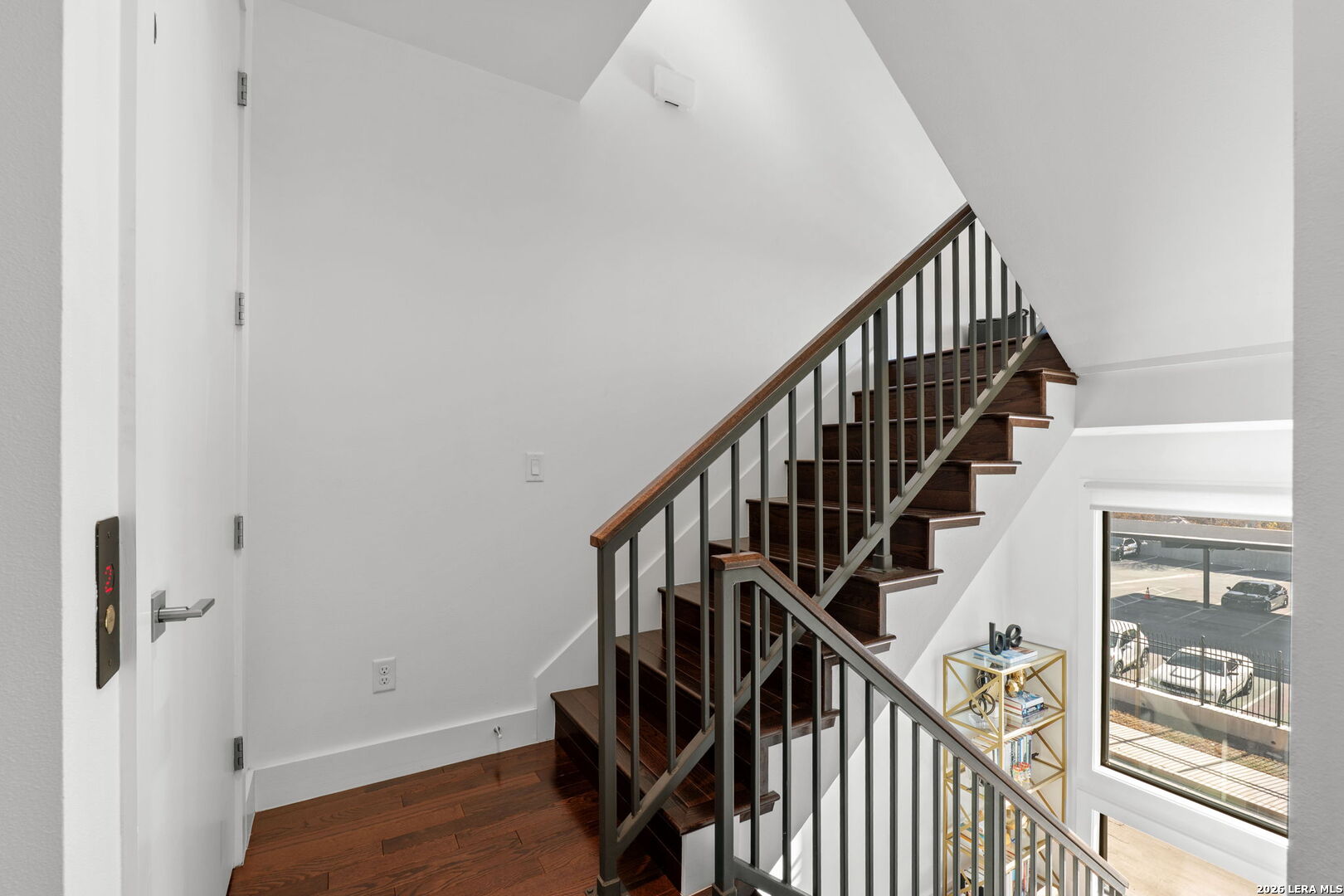 Offering signature styled relaxed luxury, this SOJO Commons urban brownstone in the beloved Pearl District offers abundantly spectacular upgrades and design enhancements classically curated to create the ultimate lock and leave lifestyle. Culinary performance kitchen features custom Arabescato quartz counters, stunning island with waterfall edge counter, KitchenAid appliances including gas cooking, separate beverage refrigerator, wine storage and custom built-in pantry shelving. Stunning primary retreat with pendant lighting, soothing spa quality bath with slate flooring, upgraded quartz counters with dual vanities, glass shelving/bench in the large walk-in shower and custom designed concept closet. Brilliant guest bathroom updates feature high quality cabinetry and custom closets and high-end marble countertops. Restoration Hardware contemporary fixtures, hardware and lighting. Smart home technology including app enabled door lock capability with camera, voice activated controls for lighting and window treatments. Residential elevator with enhanced cab detail and commercial style metal door. Unit amenities include an intimate rooftop deck with 360-degree city views, fire pit and extensive outdoor seating, a 2-car attached garage with 220V EV charger and epoxy flooring. SOJO Commons provides two gated vehicular entrances, personal pedestrian access gates and private swimming pool with outdoor cabana and grilling station. Celebrate living moments from The Historic Pearl and famed San Antonio Riverwalk - a cultural mecca offering entertainment, hospitality, shopping and restaurants.