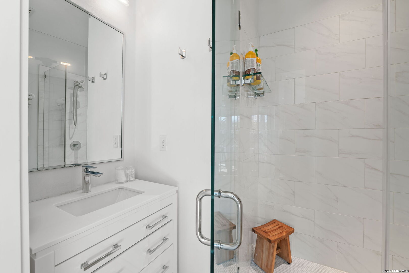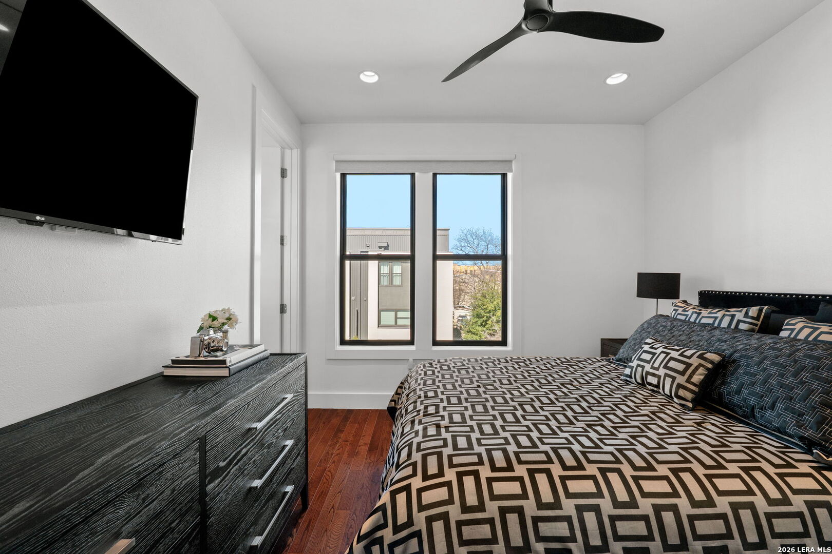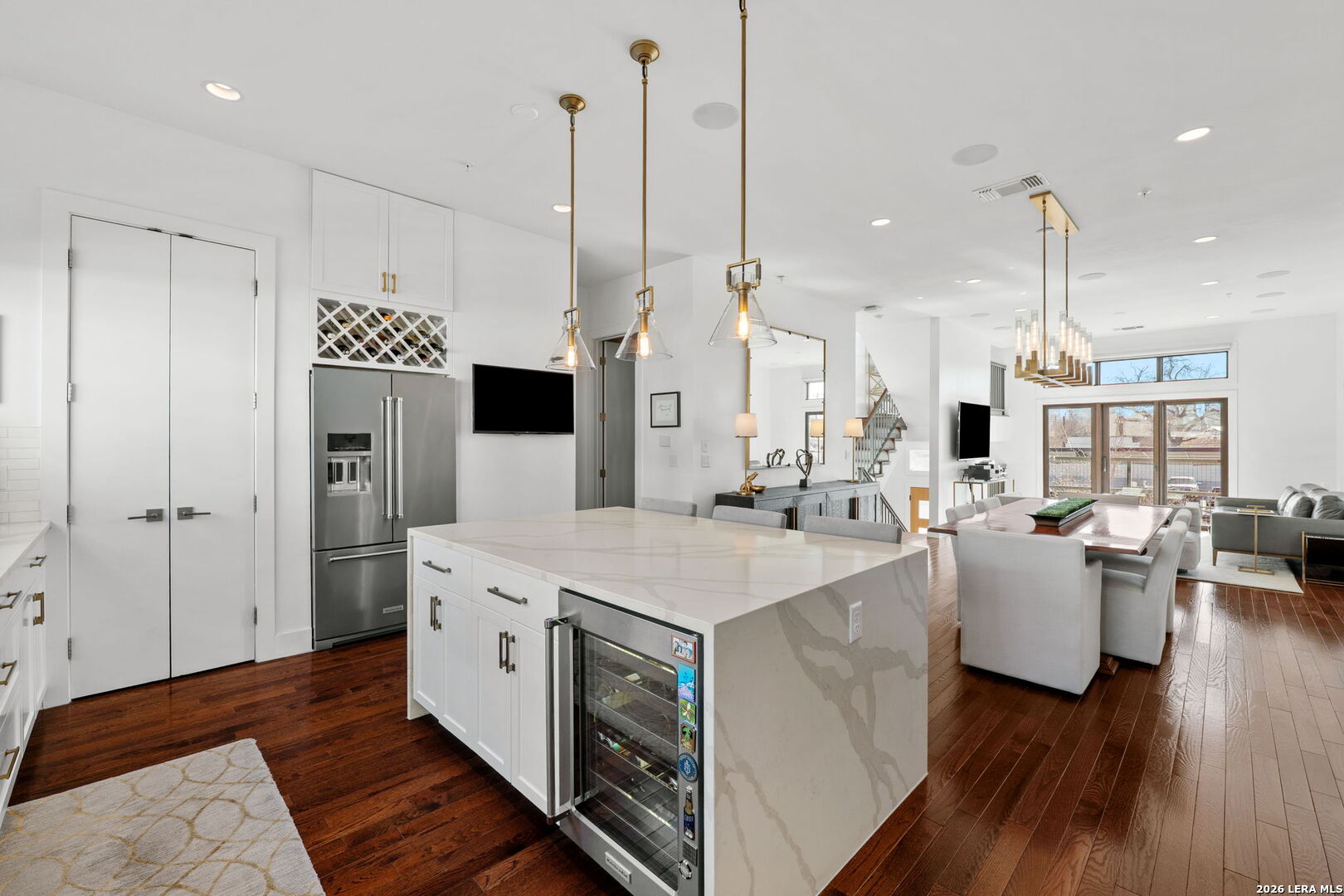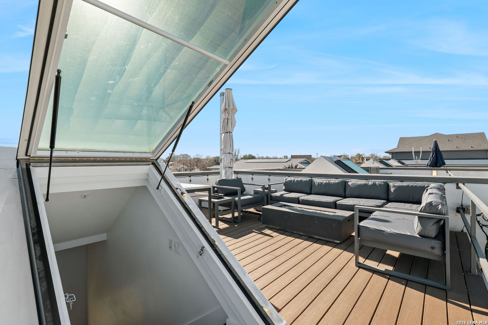 Offering signature styled relaxed luxury, this SOJO Commons urban brownstone in the beloved Pearl District offers abundantly spectacular upgrades and design enhancements classically curated to create the ultimate lock and leave lifestyle. Culinary performance kitchen features custom Arabescato quartz counters, stunning island with waterfall edge counter, KitchenAid appliances including gas cooking, separate beverage refrigerator, wine storage and custom built-in pantry shelving. Stunning primary retreat with pendant lighting, soothing spa quality bath with slate flooring, upgraded quartz counters with dual vanities, glass shelving/bench in the large walk-in shower and custom designed concept closet. Brilliant guest bathroom updates feature high quality cabinetry and custom closets and high-end marble countertops. Restoration Hardware contemporary fixtures, hardware and lighting. Smart home technology including app enabled door lock capability with camera, voice activated controls for lighting and window treatments. Residential elevator with enhanced cab detail and commercial style metal door. Unit amenities include an intimate rooftop deck with 360-degree city views, fire pit and extensive outdoor seating, a 2-car attached garage with 220V EV charger and epoxy flooring. SOJO Commons provides two gated vehicular entrances, personal pedestrian access gates and private swimming pool with outdoor cabana and grilling station. Celebrate living moments from The Historic Pearl and famed San Antonio Riverwalk - a cultural mecca offering entertainment, hospitality, shopping and restaurants.