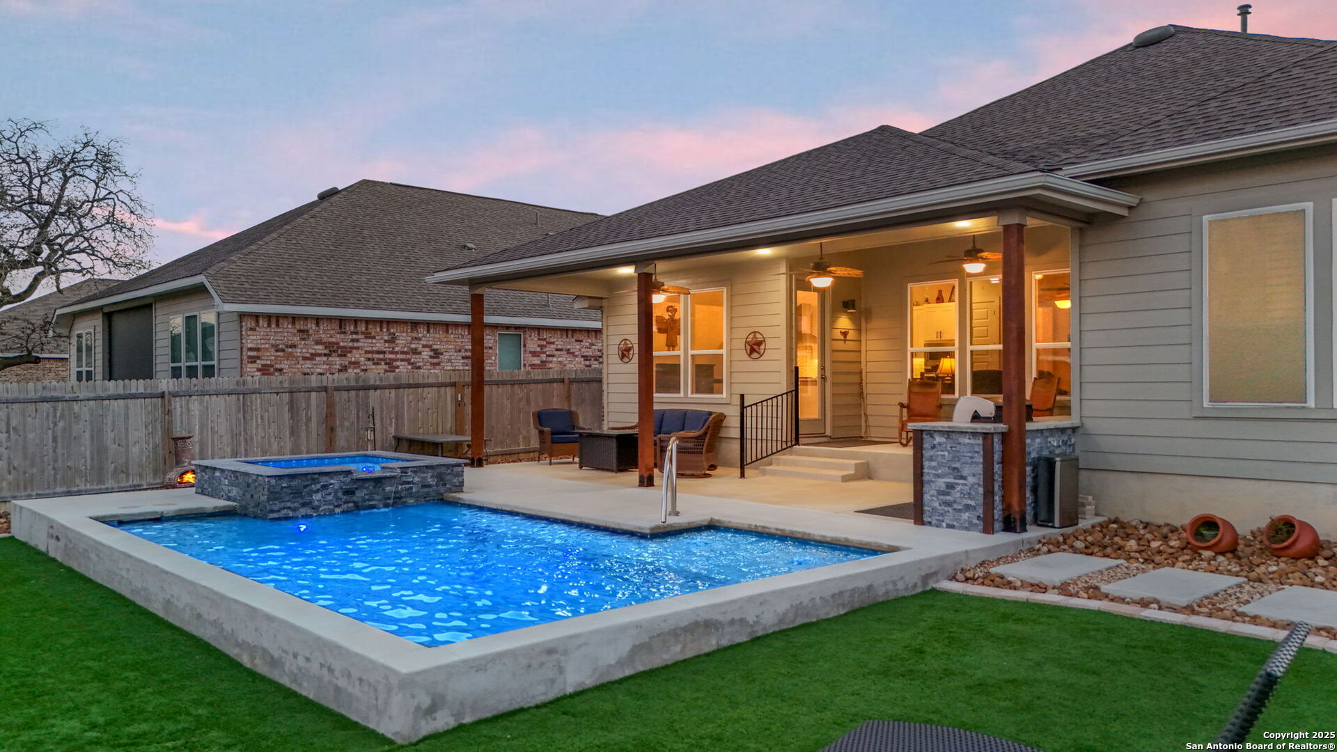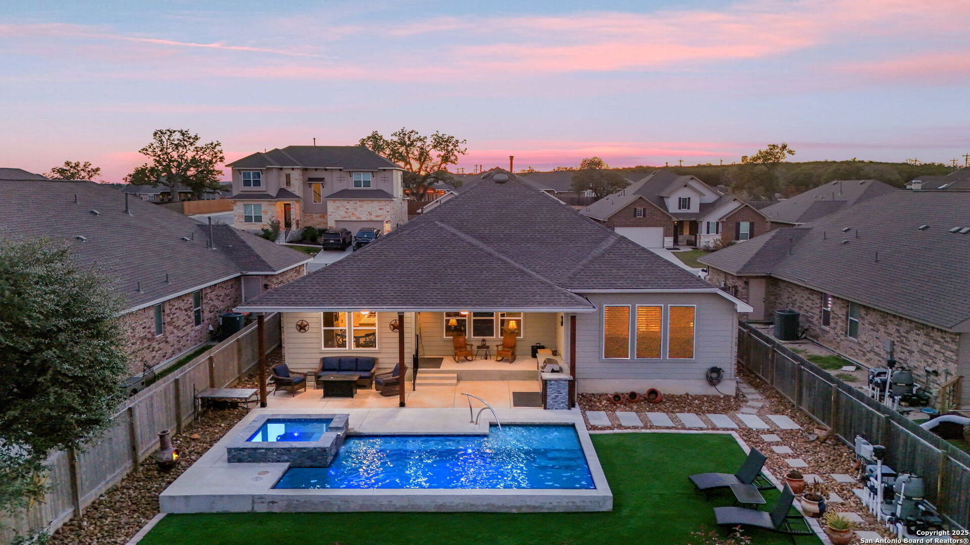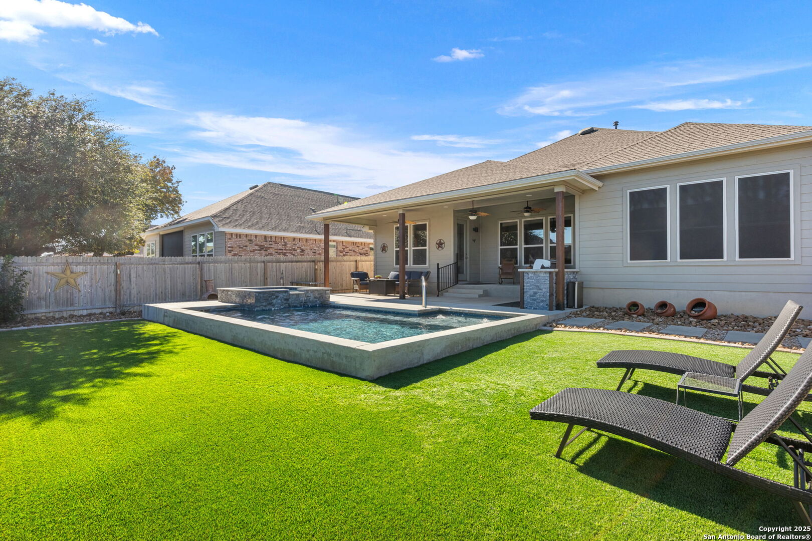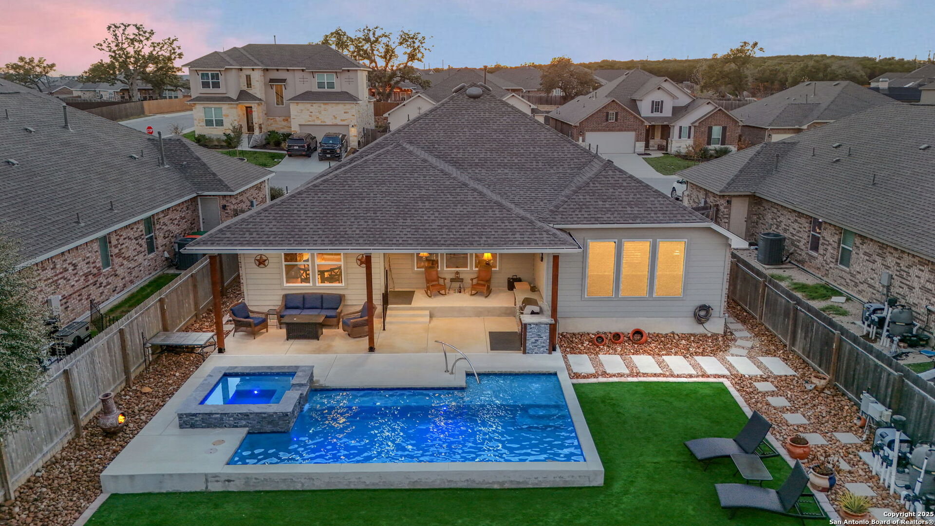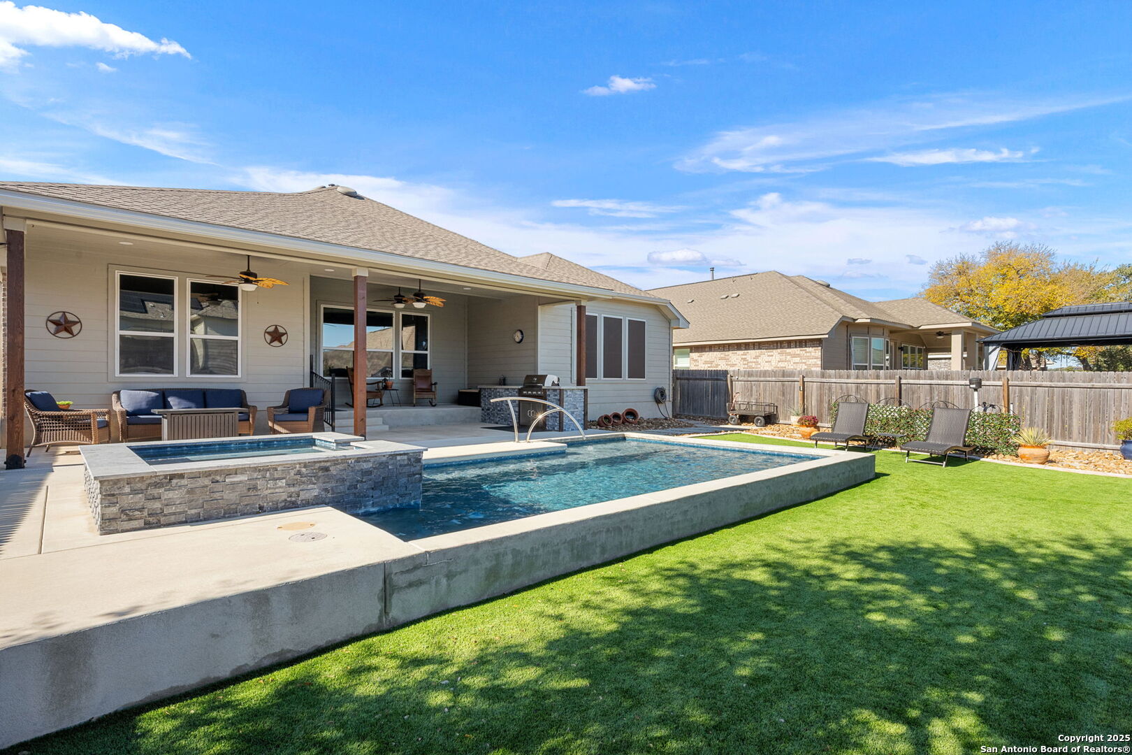 THIS IS THE VALUE YOU'VE BEEN LOOKING FOR! PRICED **BELOW** JAN 2026 APPRAISAL (by a licensed Texas-appraiser); COME AND BUY EQUITY! And once you've struck the best deal of your life, enjoy the incredible backyard of this Scott Felder masterpiece. A heated pool with cascading spa, gentle bubblers, and a wide stretch of lush turf create the ultimate private retreat, perfect for relaxing, entertaining, or letting kids and pets play freely. The extended covered patio with built-in outdoor cooking makes outdoor living effortless year-round. Inside, this thoughtfully designed 3-bedroom, 2.5-bath home includes a dedicated study/flex room, an open yet split floor plan for privacy, and tasteful upgrades throughout: no carpet, stunning quartz countertops, gas cooking, stainless steel appliances, and a water softener. The spacious primary suite overlooks the backyard and features DUAL walk-in closets and a spa-like ensuite bath. Secondary bedrooms are tucked away in their own private wing. Meticulously maintained by the original owners, this home blends comfort, function, and style inside and out. Don't forget to wander around the sprawling amenities that Hidden Trails and Johnson Ranch have to offer!
