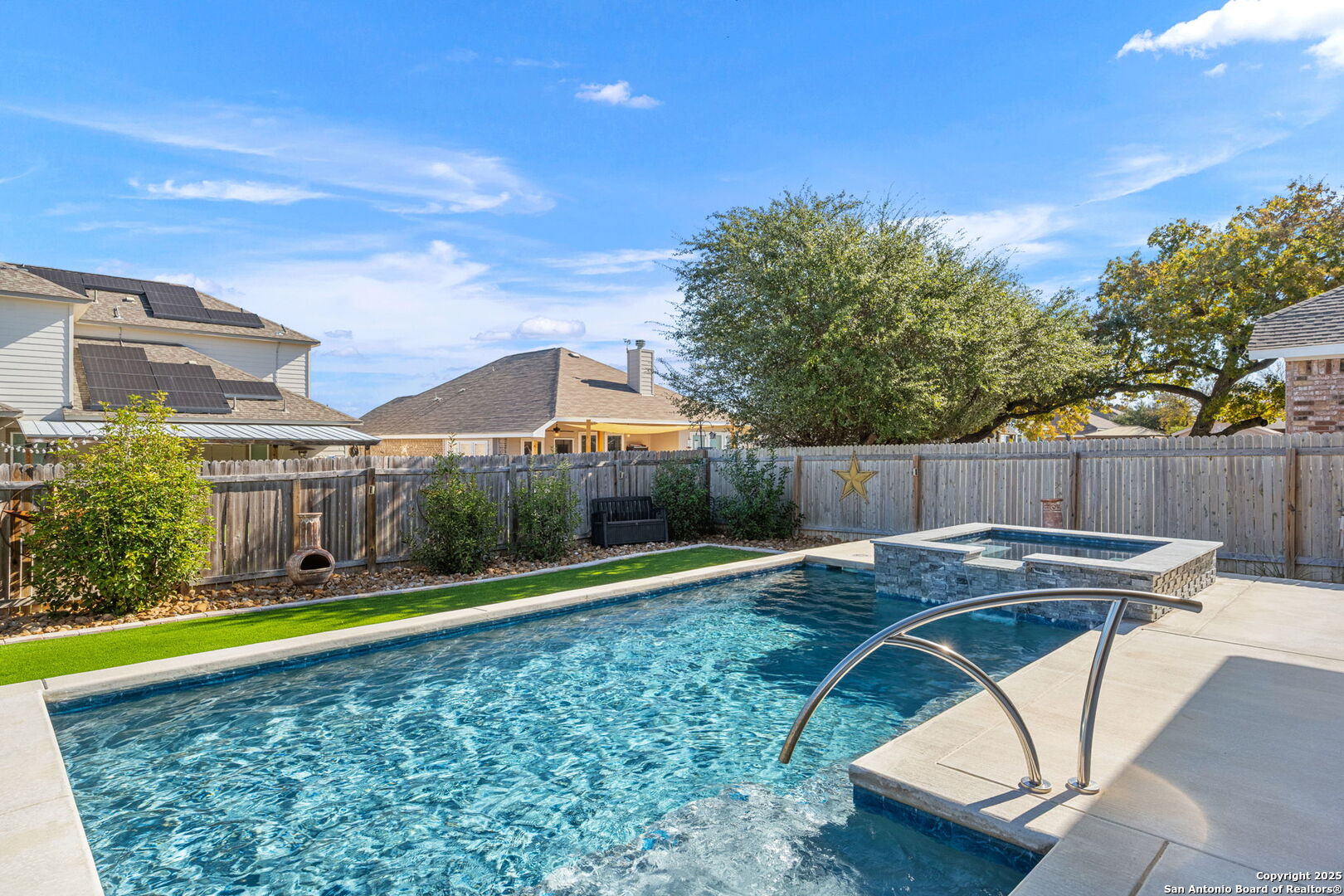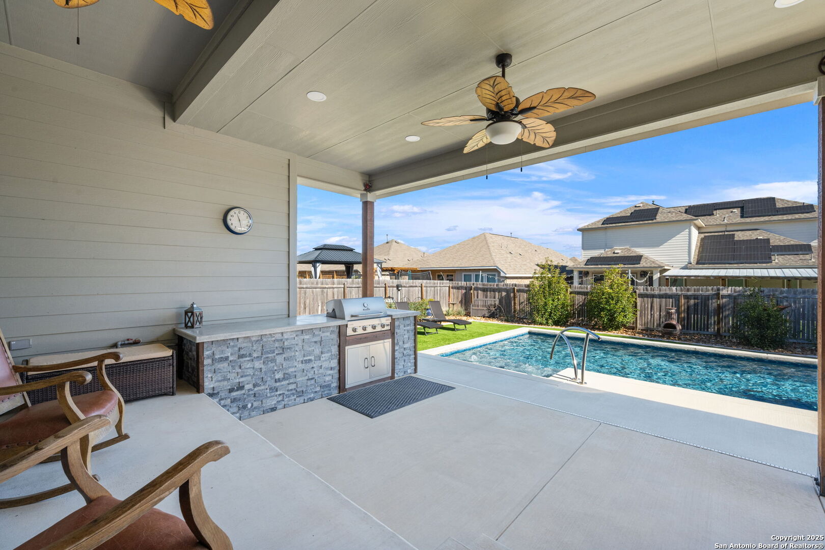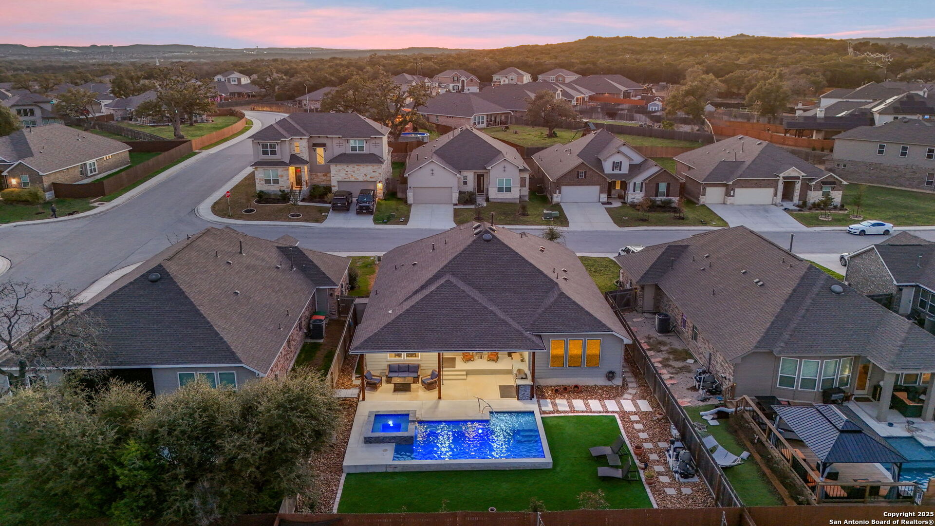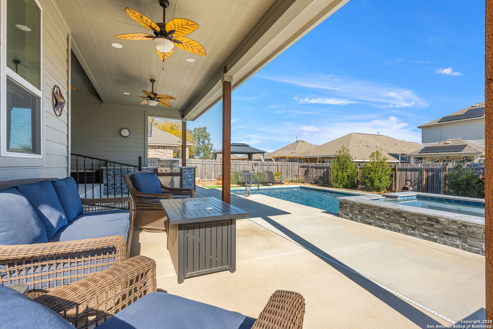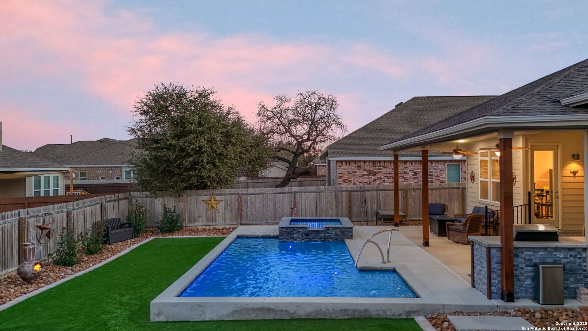 THIS IS THE VALUE YOU'VE BEEN LOOKING FOR! PRICED **BELOW** JAN 2026 APPRAISAL (by a licensed Texas-appraiser); COME AND BUY EQUITY! And once you've struck the best deal of your life, enjoy the incredible backyard of this Scott Felder masterpiece. A heated pool with cascading spa, gentle bubblers, and a wide stretch of lush turf create the ultimate private retreat, perfect for relaxing, entertaining, or letting kids and pets play freely. The extended covered patio with built-in outdoor cooking makes outdoor living effortless year-round. Inside, this thoughtfully designed 3-bedroom, 2.5-bath home includes a dedicated study/flex room, an open yet split floor plan for privacy, and tasteful upgrades throughout: no carpet, stunning quartz countertops, gas cooking, stainless steel appliances, and a water softener. The spacious primary suite overlooks the backyard and features DUAL walk-in closets and a spa-like ensuite bath. Secondary bedrooms are tucked away in their own private wing. Meticulously maintained by the original owners, this home blends comfort, function, and style inside and out. Don't forget to wander around the sprawling amenities that Hidden Trails and Johnson Ranch have to offer!