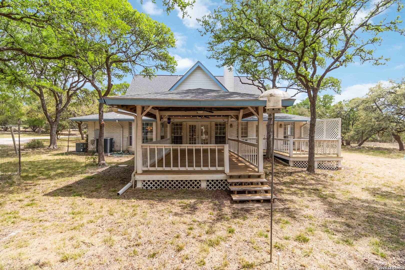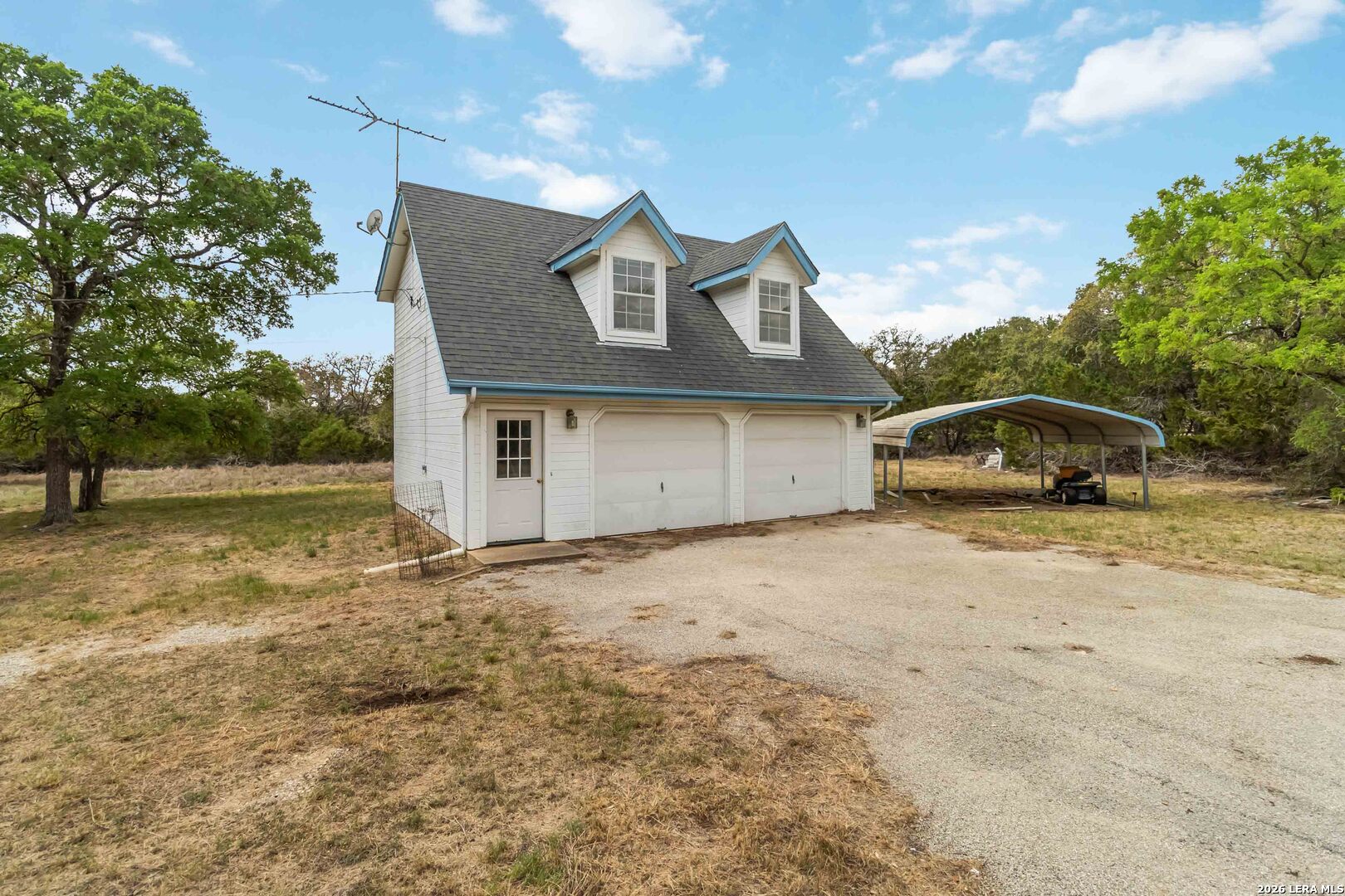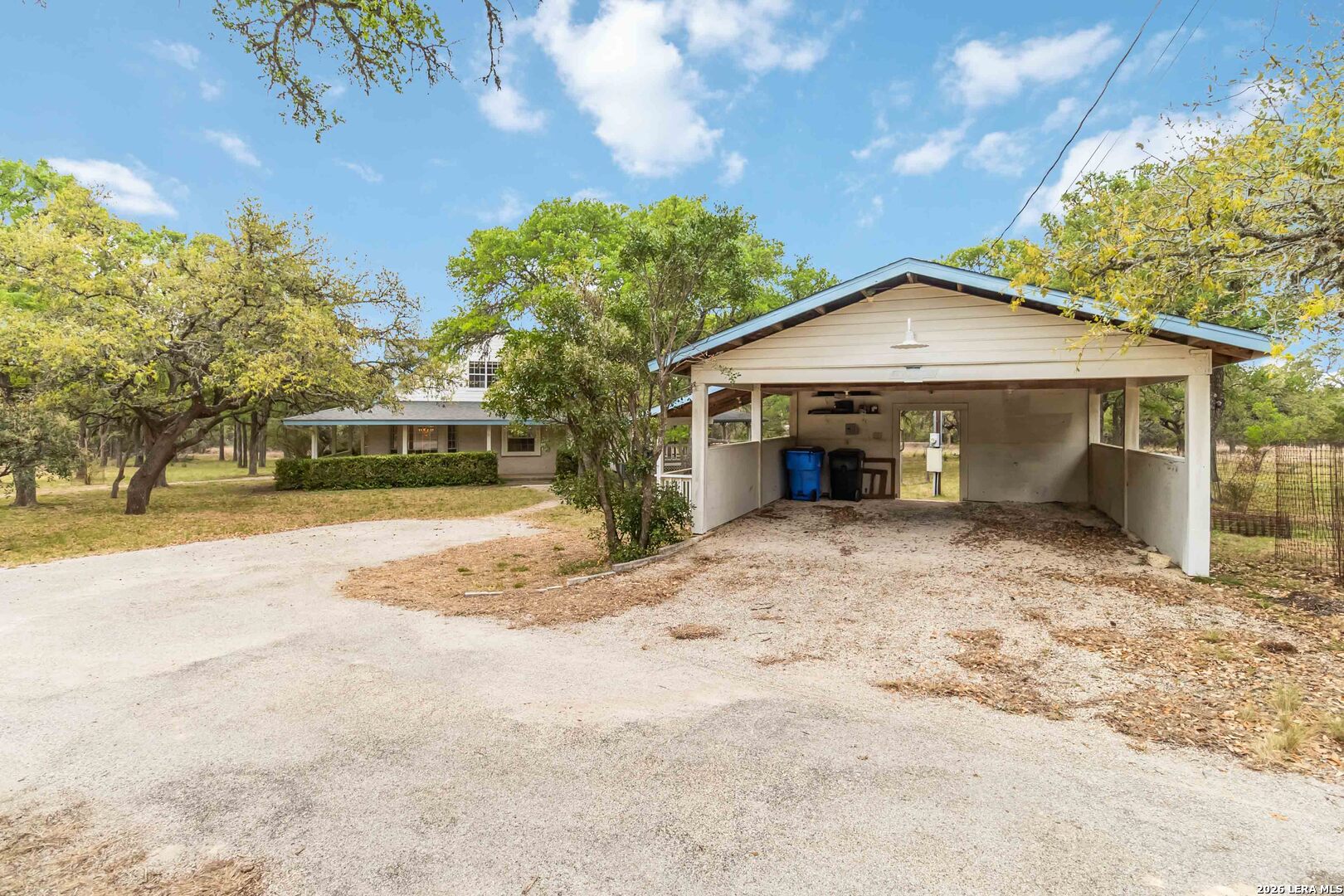 Situated on 7.79 acres, this private, tree-filled property offers endless possibilities-including room to build an additional home. Horses allowed, ideal for those seeking a peaceful Hill Country lifestyle with flexibility. This lovely home features a charming wraparound front porch, cozy fireplace, formal dining room, and a large covered deck perfect for entertaining or relaxing outdoors. Detached garage includes an efficiency apartment with full kitchen & bath (approx. 650 sf) ideal for guests, rental income, or multigenerational living. Two double carports provide ample covered parking. Conveniently located just 25 miles (approx. 30 minutes) to San Antonio International Airport, 18 miles to UTSA, with easy access to Boerne and the Texas Hill Country. This property listing includes two separate county accounts.