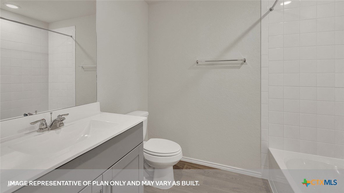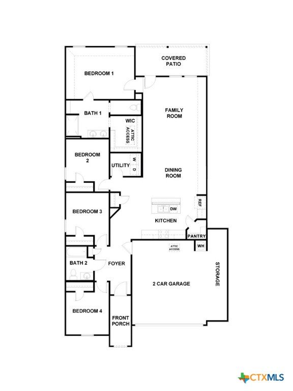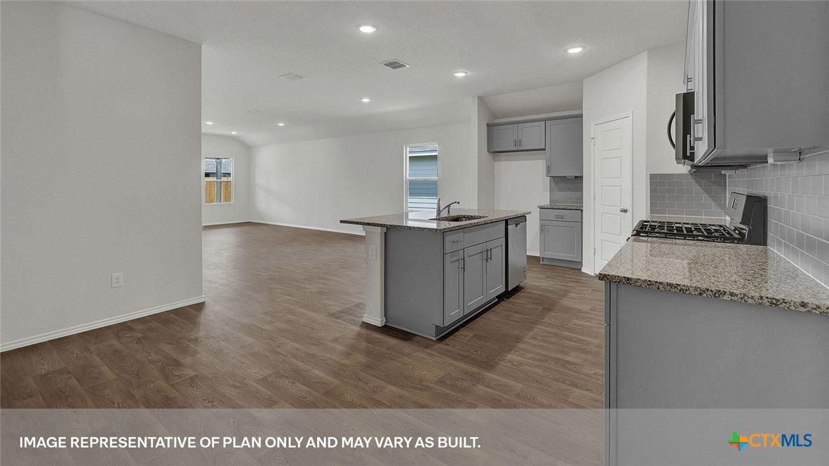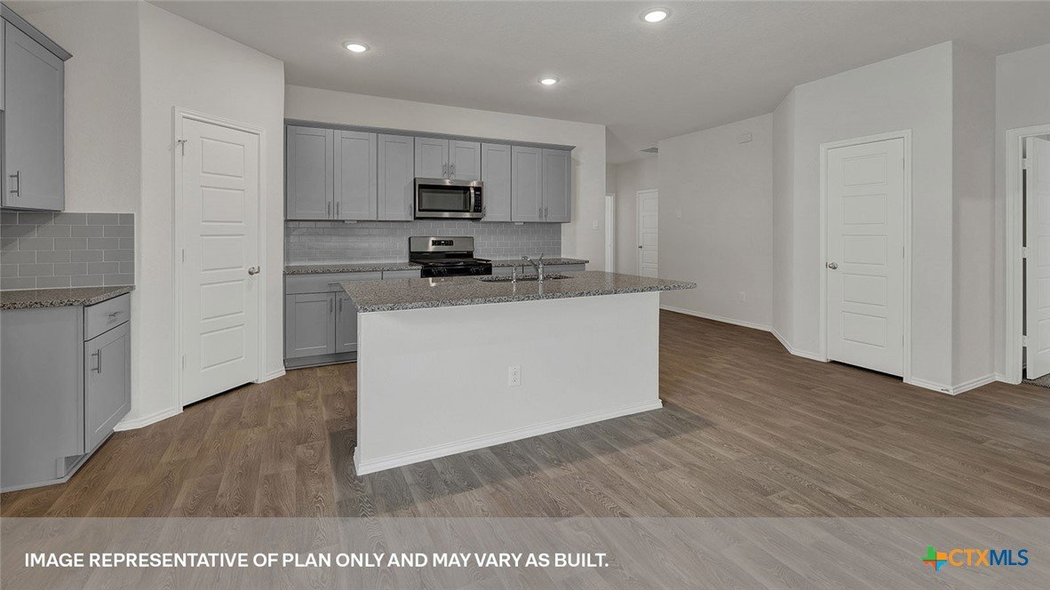 SEPTEMBER ESTIMATED COMPLETION DATE. The Gaven is one of our one-story homes featured in our Paramount community in Kyle, Texas. This efficient floorplan offers 1,772 square feet of living space across 4 bedrooms, 2 bathrooms and a 2 car garage. Our homes in Paramount feature our modern farmhouse exterior. Stepping inside the home from the covered entryway, you will find two secondary bedrooms and a full bathroom off the foyer. The secondary bathroom includes a shower/tub combination, and the bedrooms feature a closet with shelving. Moving further into the home, you will find the kitchen, which includes an island with an undermount sink, stainless steel appliances, quartz countertops and 36” upper cabinets. The dining room and family room flow easily from the kitchen and you’re sure to make many memories in this beautiful space. The utility room and bedroom 2 are off the kitchen. With the utility room at the center of the home, your laundry chores will be an easy task to complete. The primary bedroom is tucked off the family room at the back of the home. Featuring its own attached bathroom with a walk-in shower, marble countertops with dual vanity, and separate toilet area with a door, enjoy this relaxing space during your bedtime routine. A walk-in closet is connected to the bathroom, with plenty of room for your accessories and prized possessions. The Gaven includes vinyl flooring throughout the common areas of the home and carpet in the bedrooms. All our new homes at Paramount feature extra storage space in the garage, a covered back patio, full sod, and an irrigation system in the front and back yard. This home comes with our America’s Smart Home base package, which includes Video Front Door Bell, Front Door Deadbolt Lock, Home Hub, Thermostat, and Deako® Smart Switches.