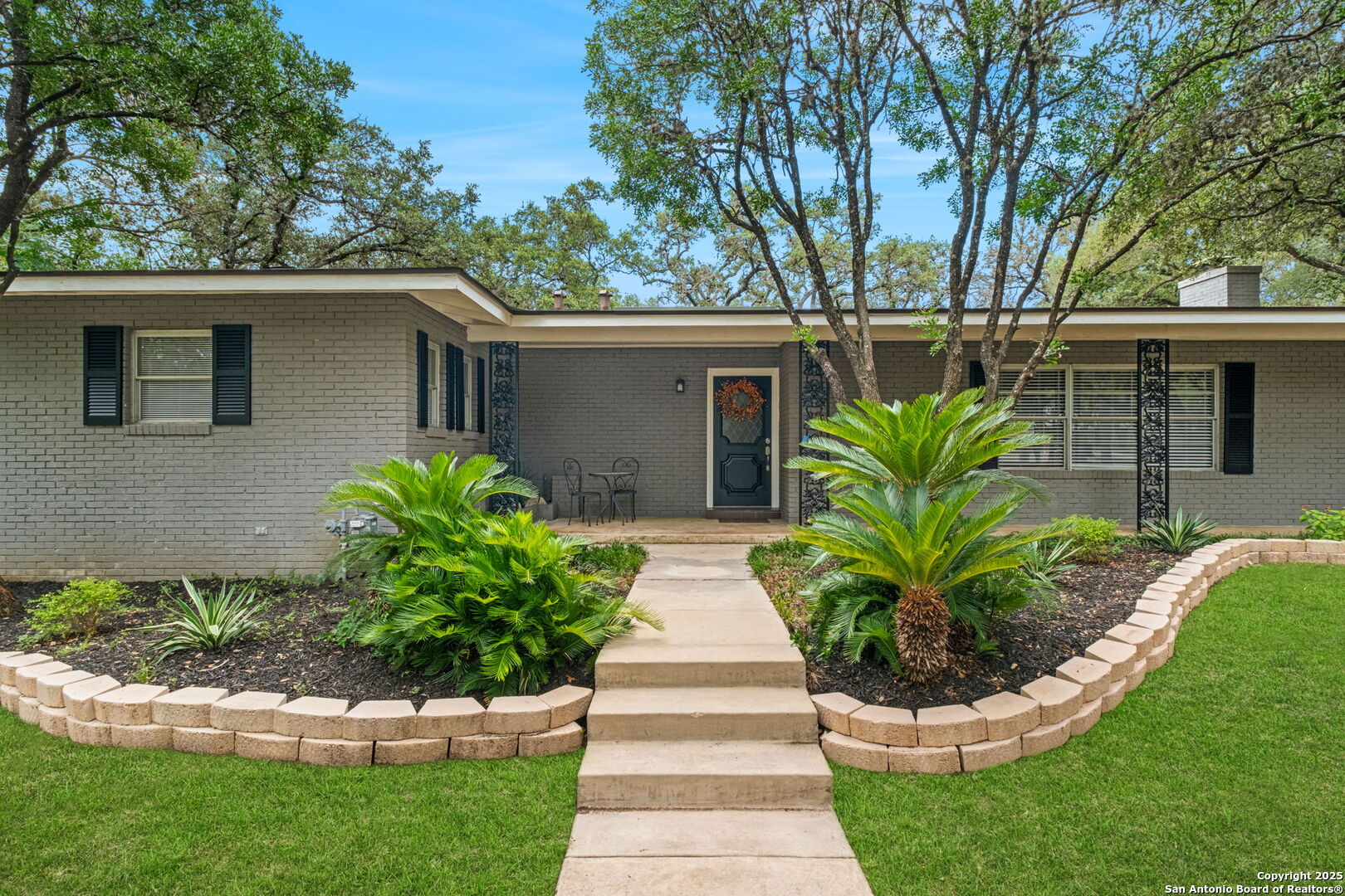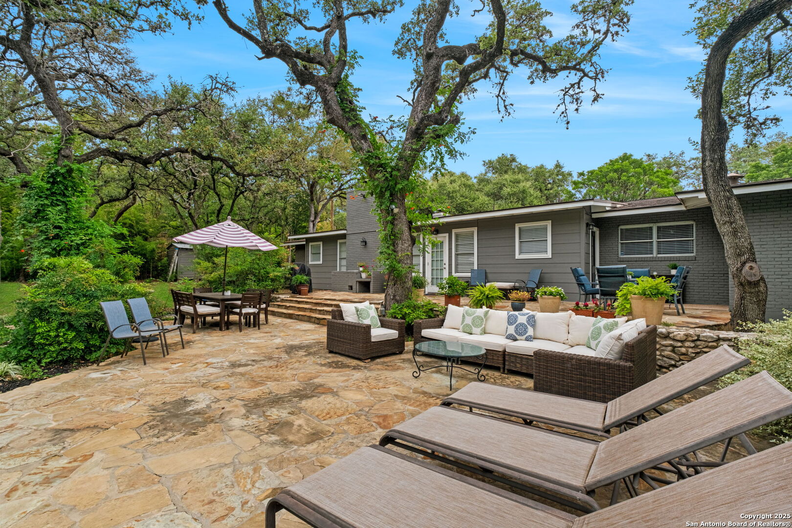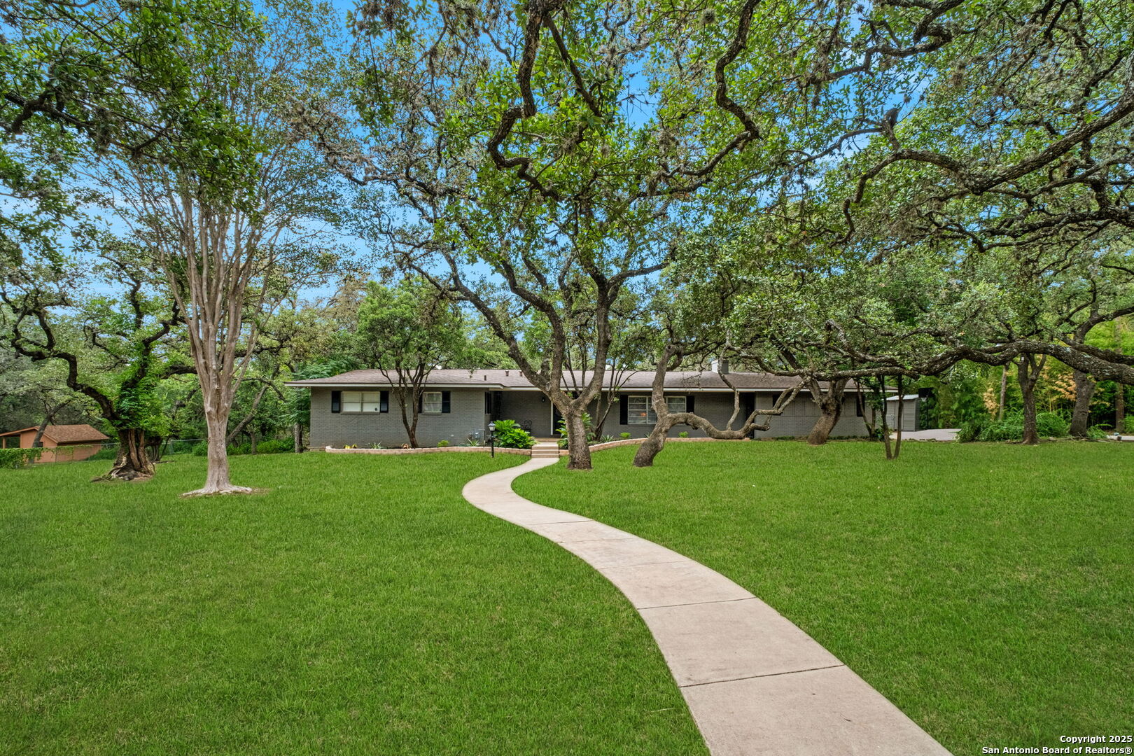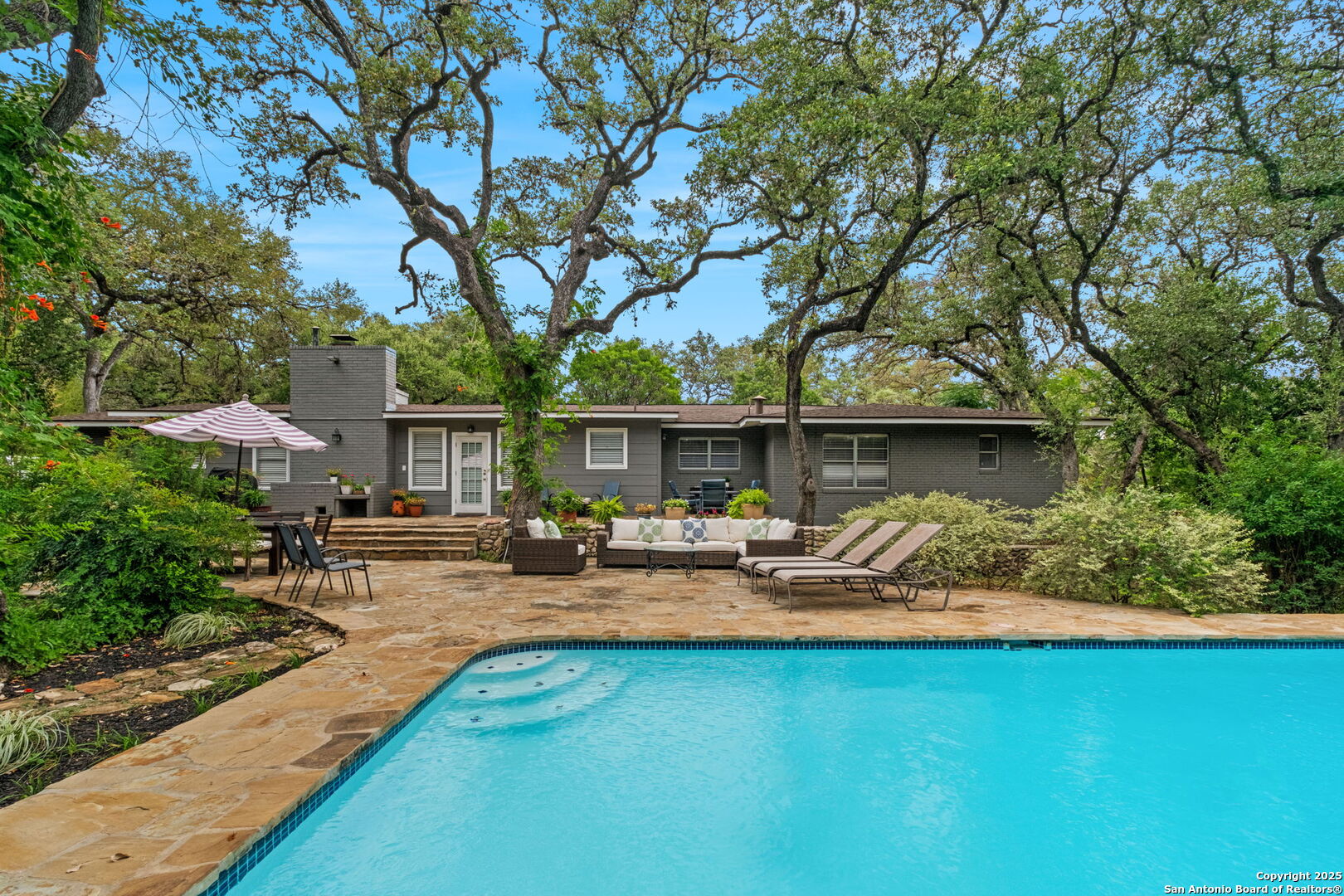 Discover this Mid-Century Modern gem nestled on more than an acre in the serene, secluded enclave of Forest Oaks Estates. This thoughtfully updated single-story home offers 3 bedrooms, 2.5 baths, a generous study, and expansive living and dining areas designed with both comfort and entertaining in mind. The study offers access to the half bath and could become a 4th bedroom. The heart of the home is a chef's kitchen outfitted for culinary enthusiasts, while the open-concept living spaces impress with beamed ceilings, two fireplaces, custom built-in cabinetry, and a stylish serving bar-ideal for gatherings large or small. Walls of windows invite in natural light and offer beautiful views of the lush, oak-studded grounds. Unwind in the tranquil primary suite featuring an updated bath and generous walk-in closets. Step outside to enjoy a spectacular backyard with a sparkling pool, sprawling flagstone patio, and the shade of 100+ majestic oak trees-creating a private, resort-like setting. Located just minutes from Loop 410, Hwy 281, The Pearl, and San Antonio International Airport, with convenient access to Salado Creek Greenway and St. Mary's Hall. Nearby Alamo Heights ISD offers limited tuition opportunities, subject to availability. Opportunities to own in this beautiful neighborhood are few and far between-don't miss your chance to make this peaceful retreat your forever home.