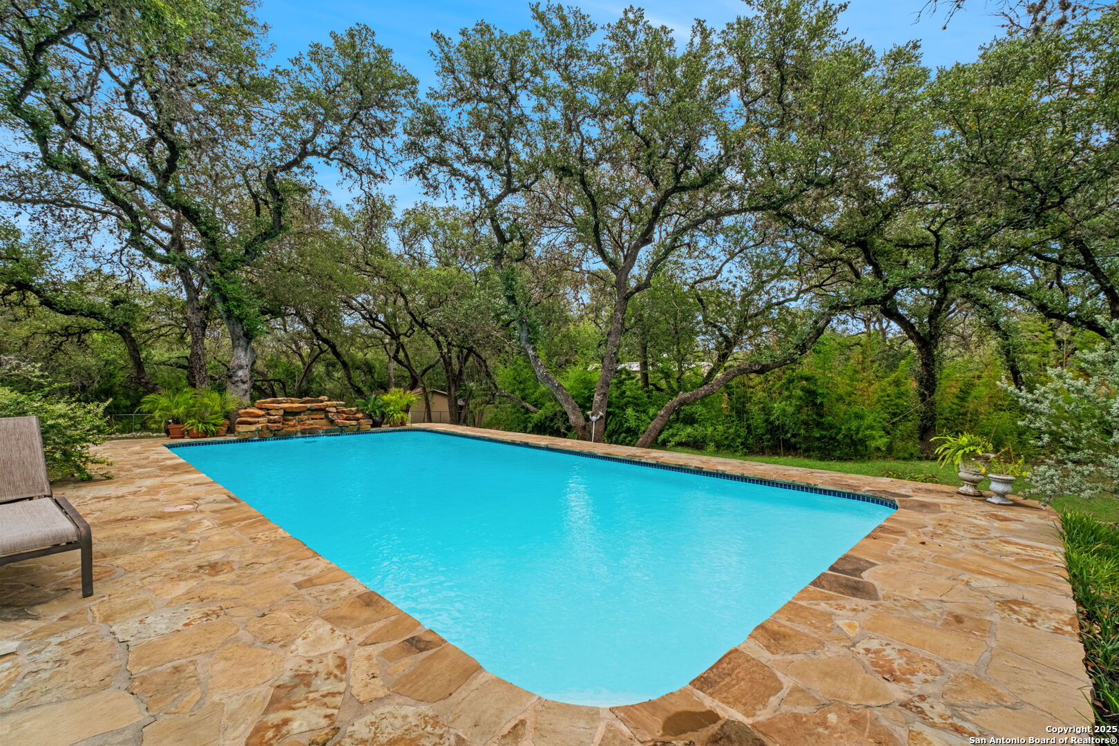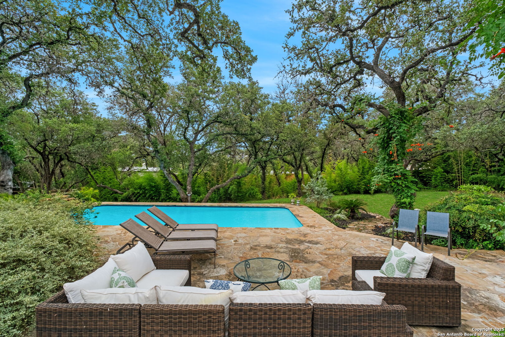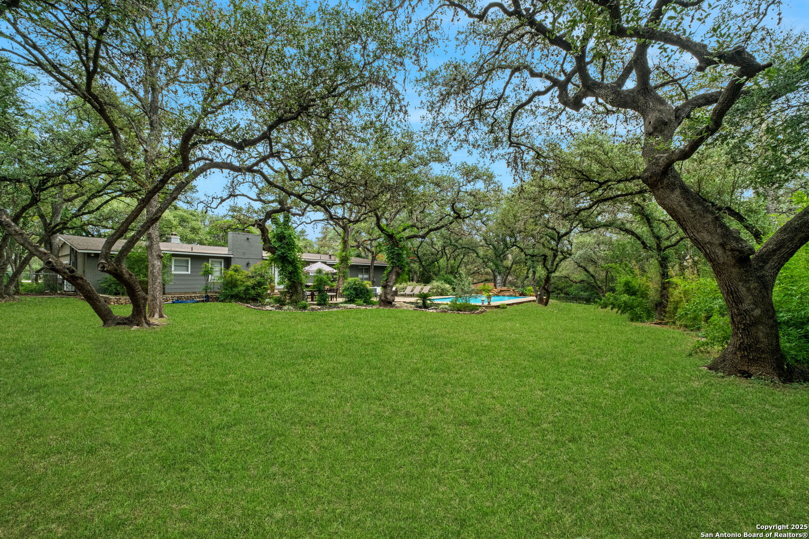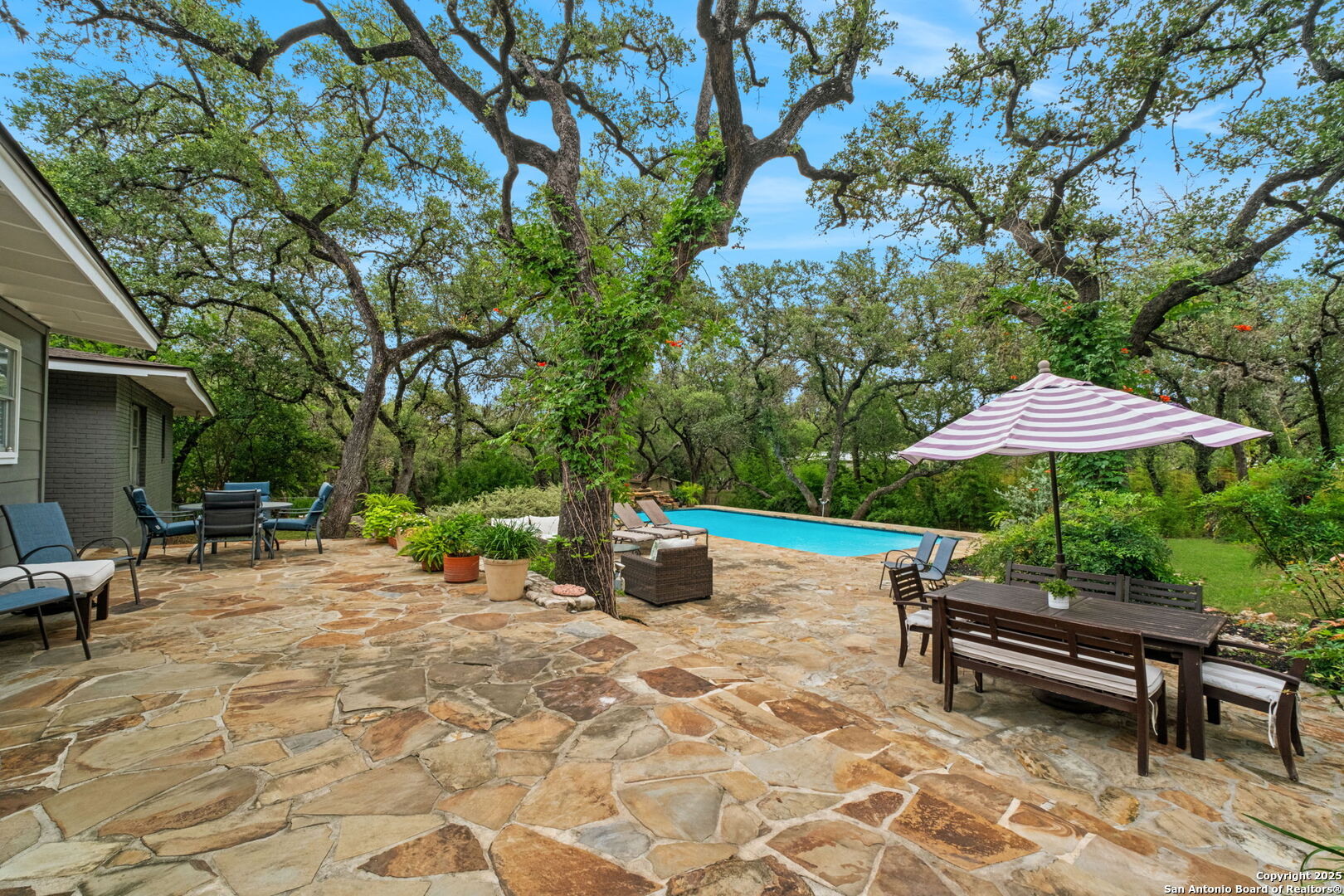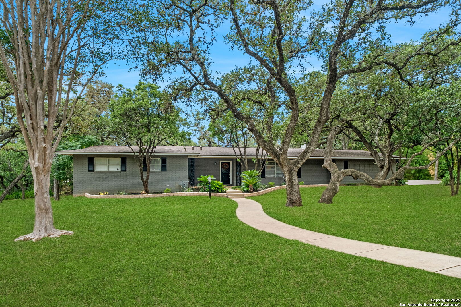 Discover this Mid-Century Modern gem nestled on more than an acre in the serene, secluded enclave of Forest Oaks Estates. This thoughtfully updated single-story home offers 3 bedrooms, 2.5 baths, a generous study, and expansive living and dining areas designed with both comfort and entertaining in mind. The study offers access to the half bath and could become a 4th bedroom. The heart of the home is a chef's kitchen outfitted for culinary enthusiasts, while the open-concept living spaces impress with beamed ceilings, two fireplaces, custom built-in cabinetry, and a stylish serving bar-ideal for gatherings large or small. Walls of windows invite in natural light and offer beautiful views of the lush, oak-studded grounds. Unwind in the tranquil primary suite featuring an updated bath and generous walk-in closets. Step outside to enjoy a spectacular backyard with a sparkling pool, sprawling flagstone patio, and the shade of 100+ majestic oak trees-creating a private, resort-like setting. Located just minutes from Loop 410, Hwy 281, The Pearl, and San Antonio International Airport, with convenient access to Salado Creek Greenway and St. Mary's Hall. Nearby Alamo Heights ISD offers limited tuition opportunities, subject to availability. Opportunities to own in this beautiful neighborhood are few and far between-don't miss your chance to make this peaceful retreat your forever home.